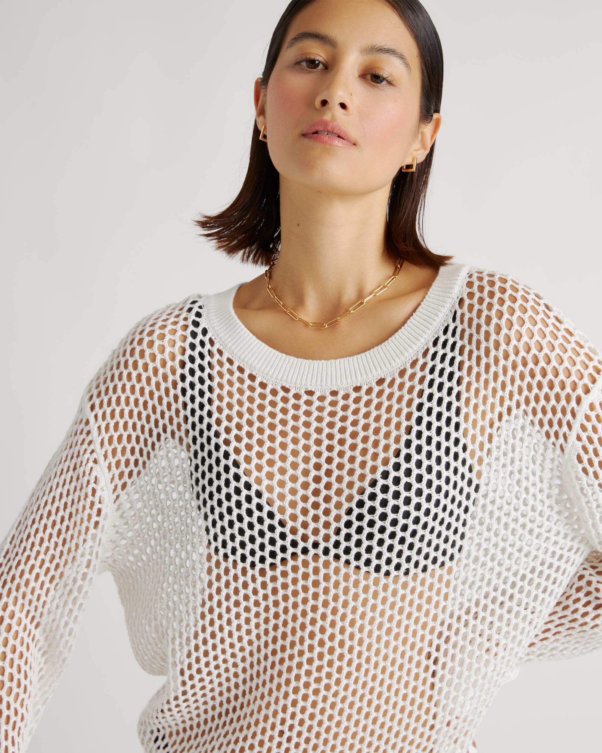 Meet your new travel must-have. Our breezy open-knit sweater—made with supple 100% organic cotton—is versatile enough to be thrown over a swimsuit or paired with a tank and shorts for a day of sightseeing. With a nice drape and a relaxed fit, you’ll want to wear it long after your vacation glow has faded. | Quince | Women's Open-Knit Cover-Up Crew Neck Alpaca Sweater in White, Size Medium, Organic Cotton