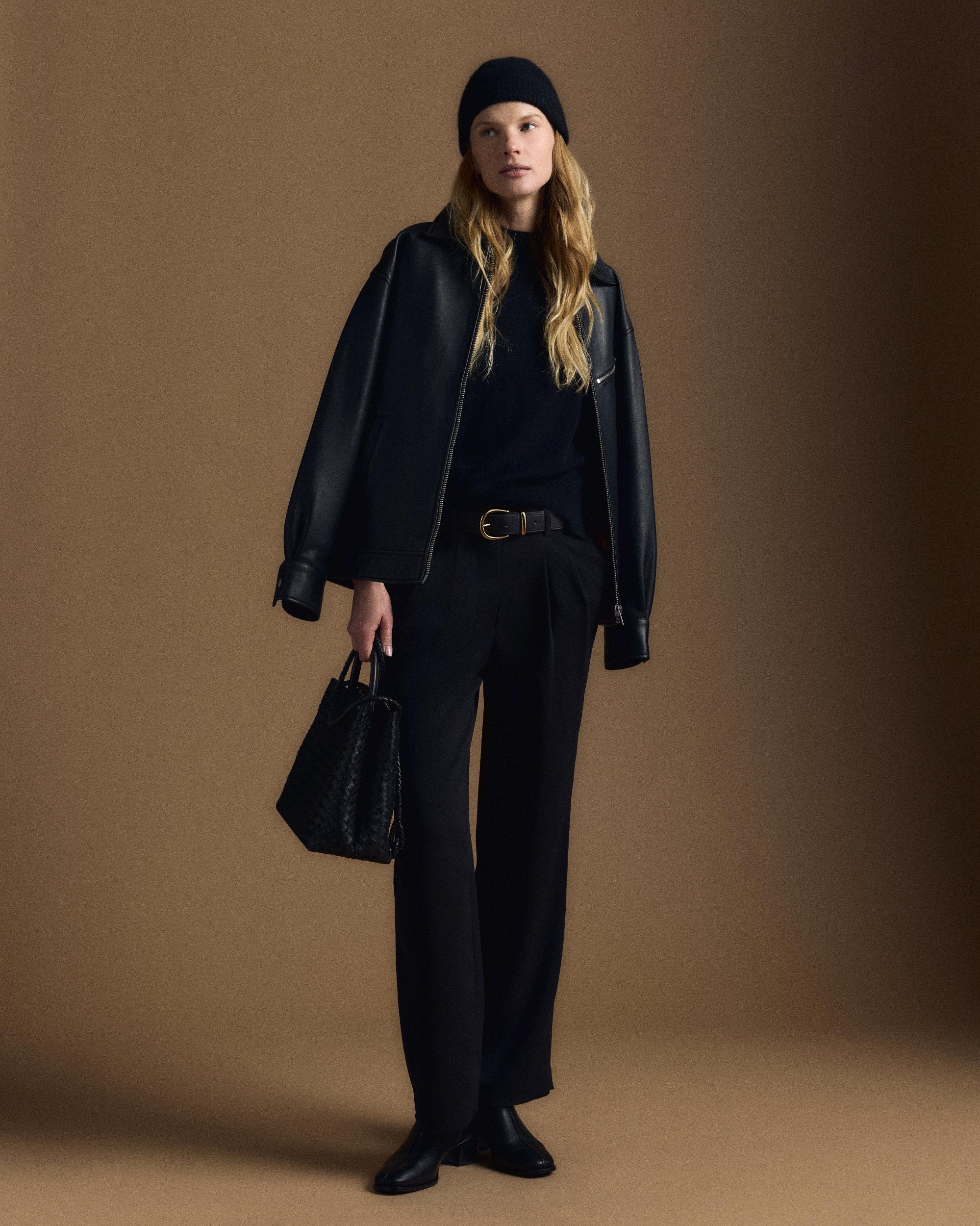 Look effortlessly cool and timeless with our 100% Leather Oversized Bomber Jacket. The oversized silhouette offers a laid-back vibe, making it an effortless layering option for cooler weather. Crafted from top-grain sheep leather, this jacket is made to last with durable hardware and thoughtfully placed pockets. Read more about what makes our leather special in our Leather 101 guide. | Quince | Women's OverSized Bomber Jacket in Black, Size Medium, Leather