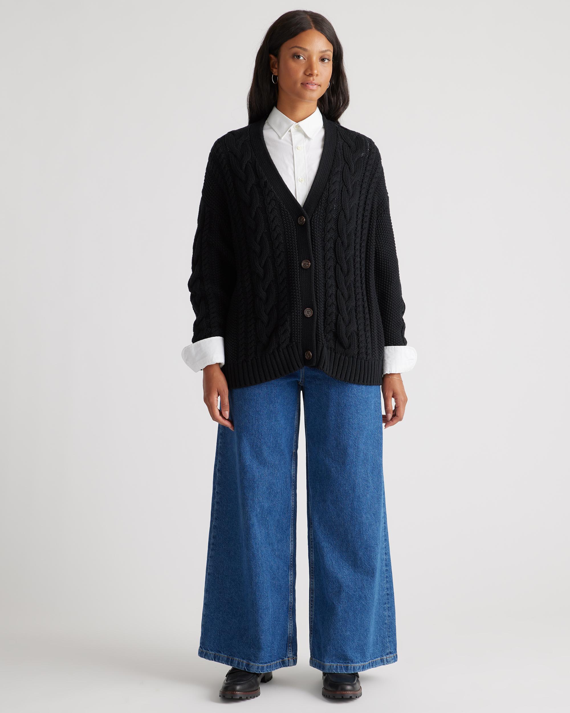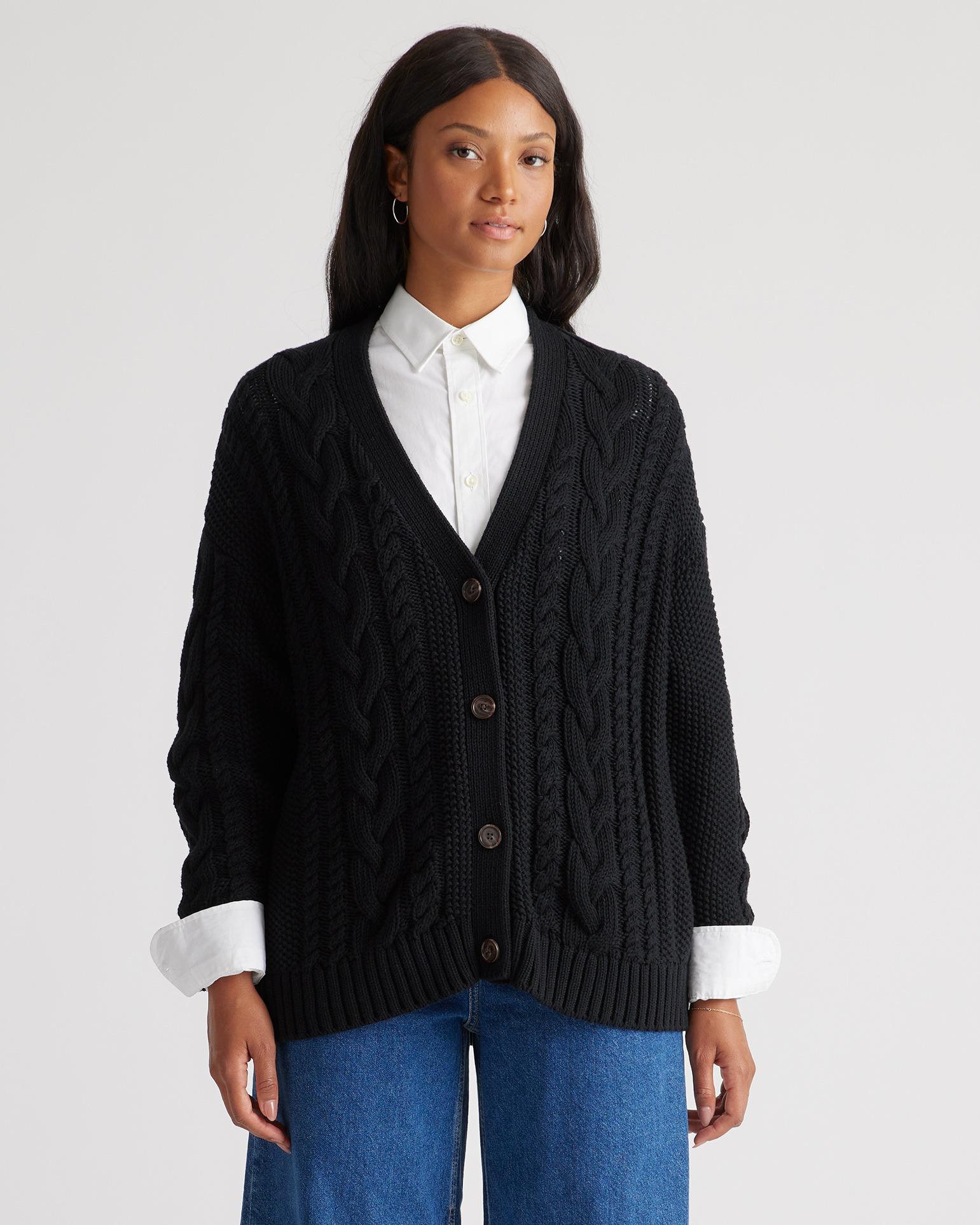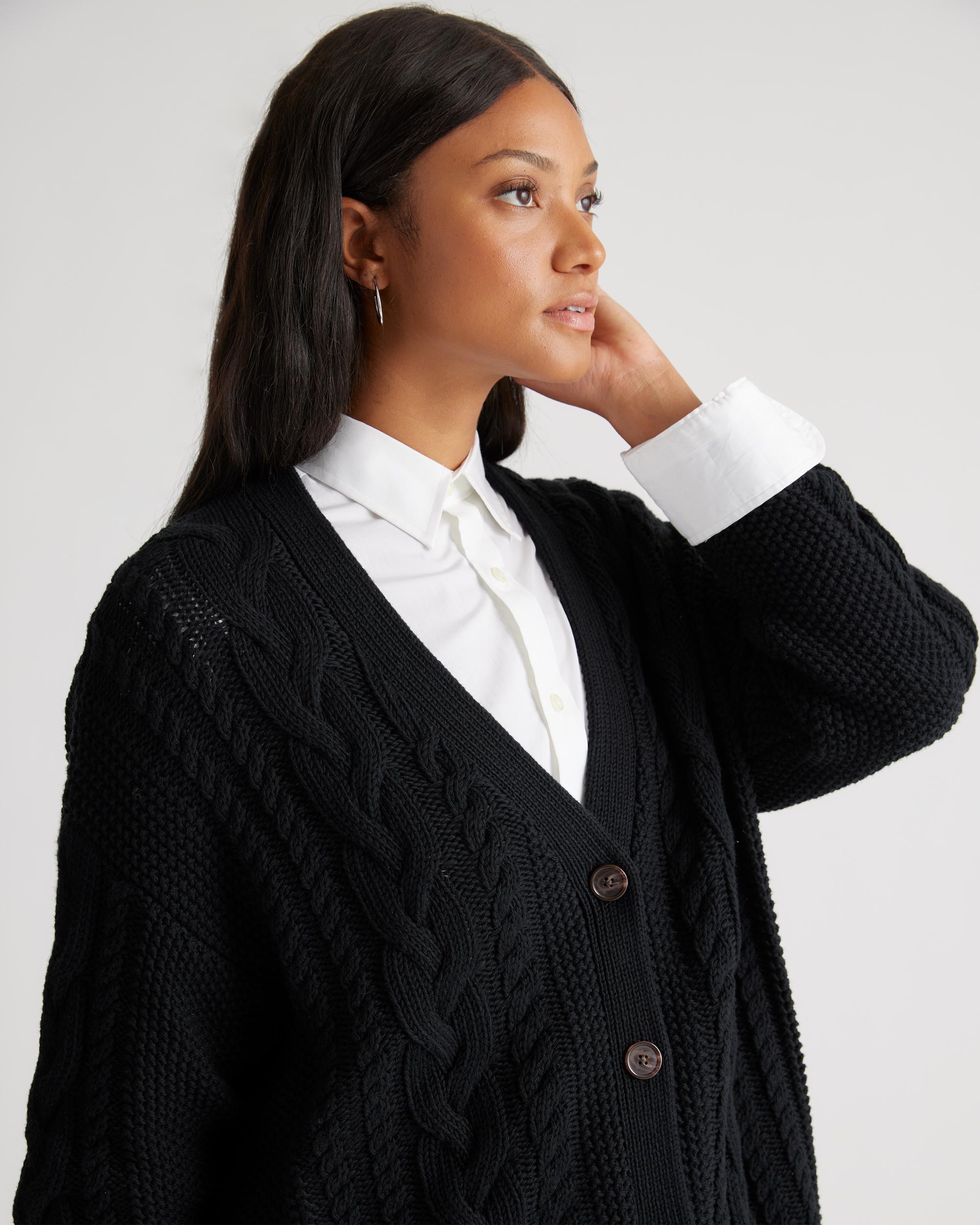 This coastal-chic sweater is everything: chunky yet breathable, airy yet warm, classic yet modern. The oversized shape feels so right now, and the midweight, cable-knit organic cotton is perfect for year-round wear. | Quince | Women's OverSized Cable Cardigan Sweater in Black, Size Large, Organic Cotton