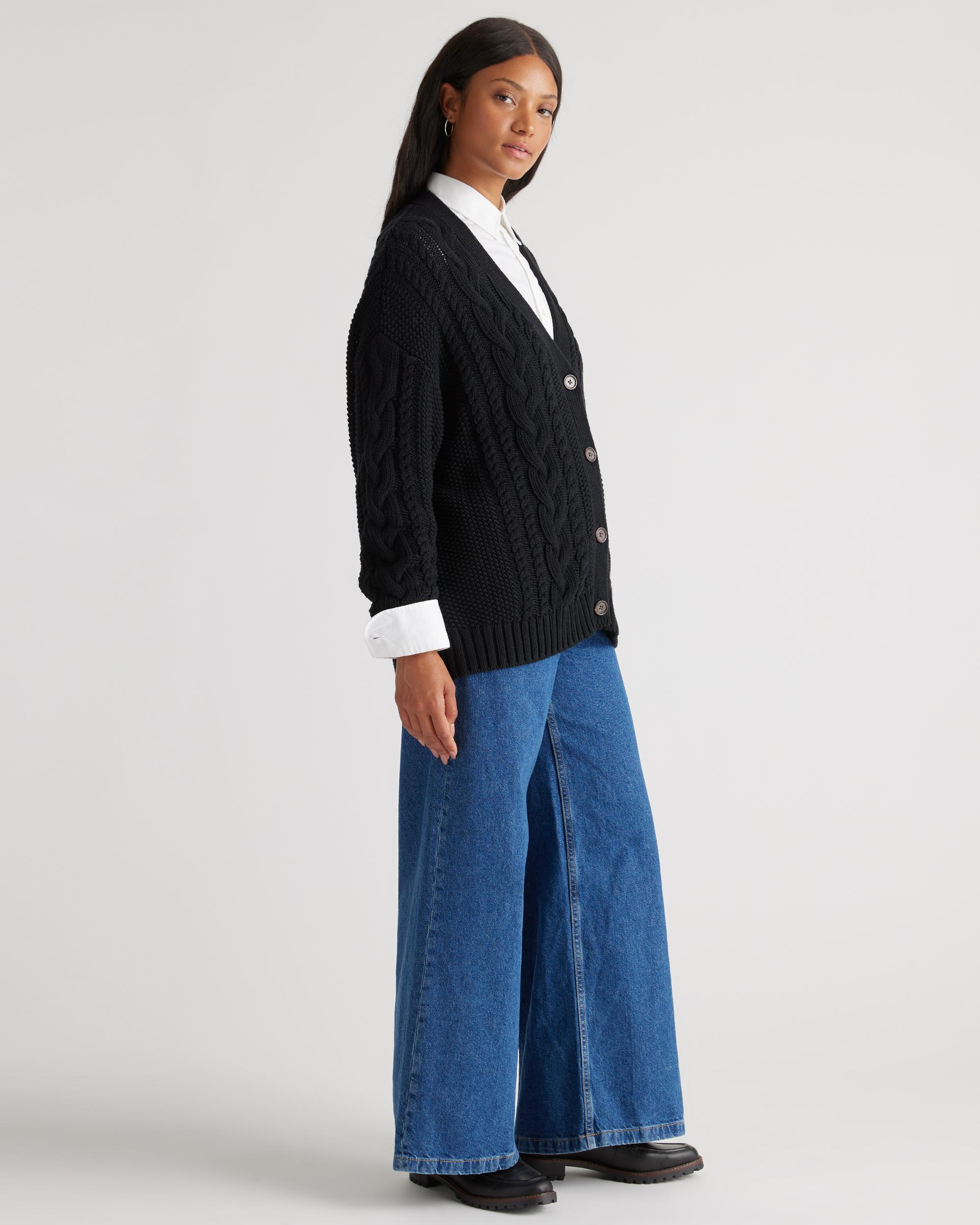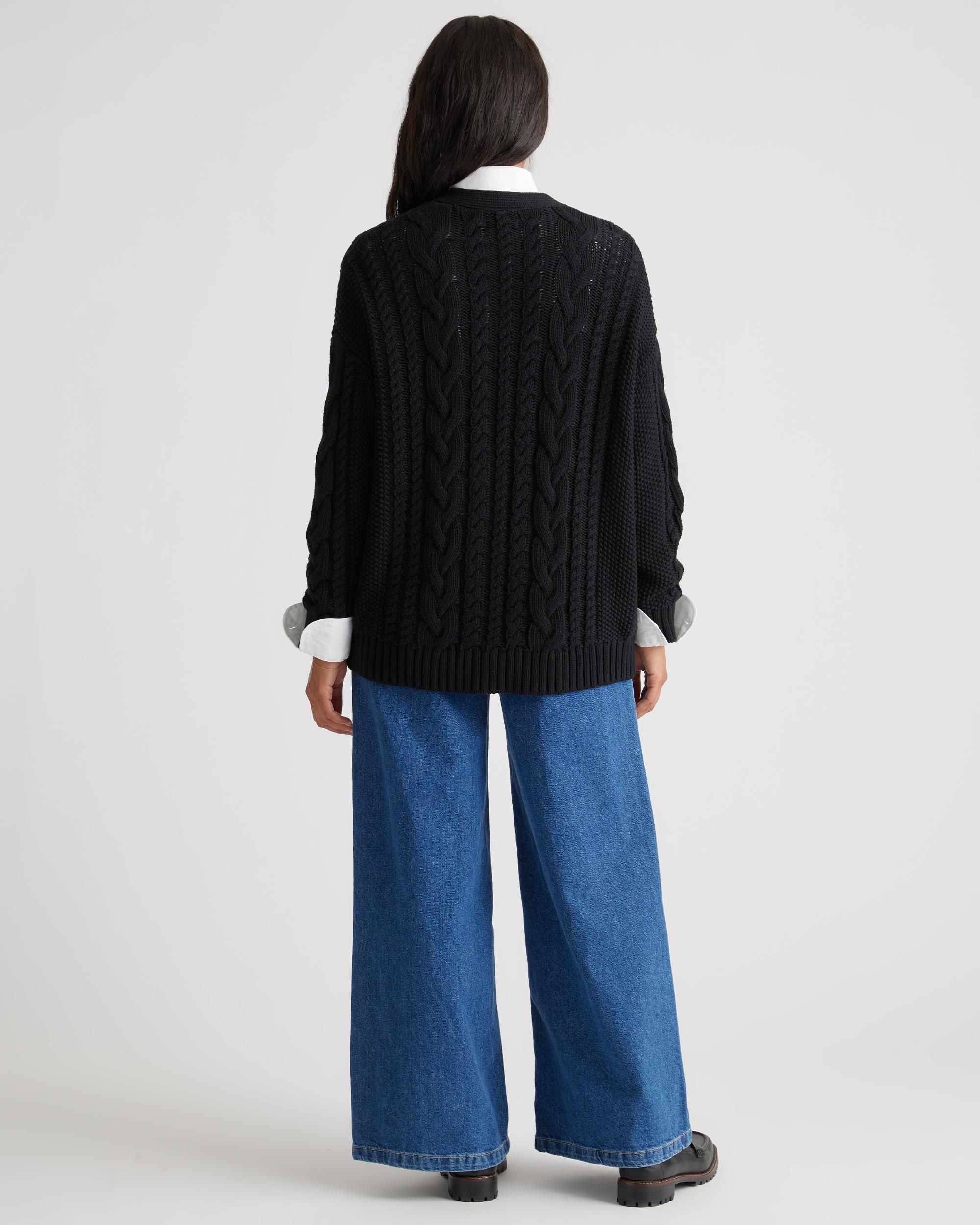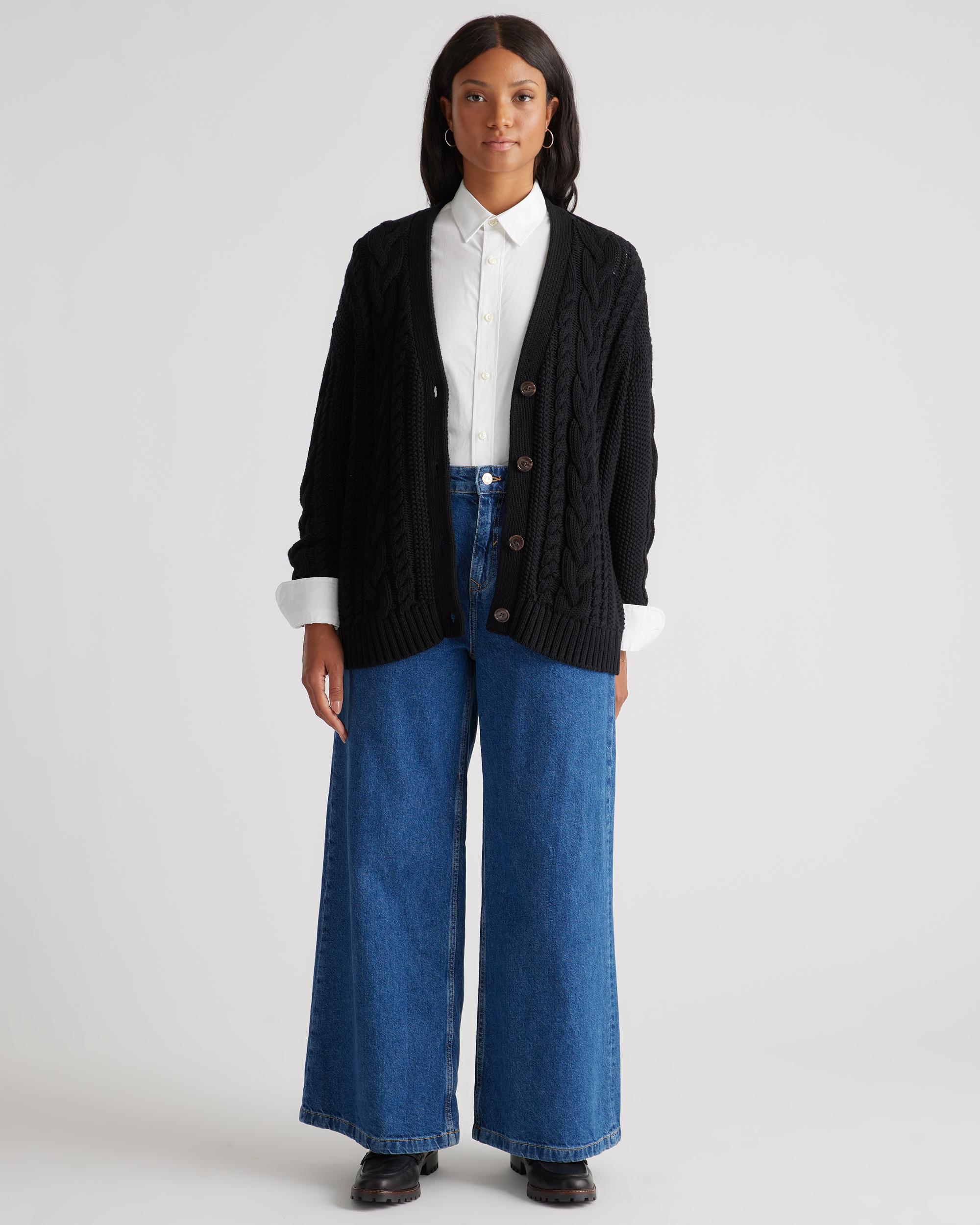This coastal-chic sweater is everything: chunky yet breathable, airy yet warm, classic yet modern. The oversized shape feels so right now, and the midweight, cable-knit organic cotton is perfect for year-round wear. | Quince | Women's OverSized Cable Cardigan Sweater in Black, Size Large, Organic Cotton