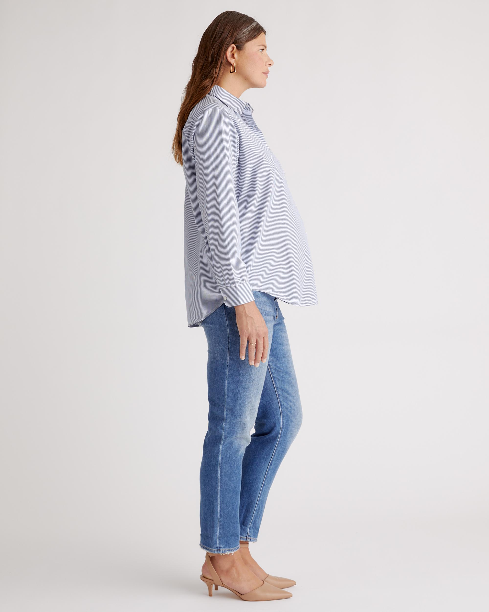 A classic button-down shirt made just for expectant and nursing mothers. Crafted from high-quality organic cotton poplin, the 100% Organic Cotton Poplin Maternity Long Sleeve Shirt feels soft and comfortable against the skin. Designed with functionality in mind, this shirt features a button-down front that allows for easy nursing access. Whether you're heading to the office, running errands, or enjoying a casual day out, this chic yet utilitarian shirt is a true essential for a new mom's wardrobe. | Quince | Women's Poplin Maternity Long Sleeve Shirt in Light Blue Stripe, Size Medium, Organic Cotton