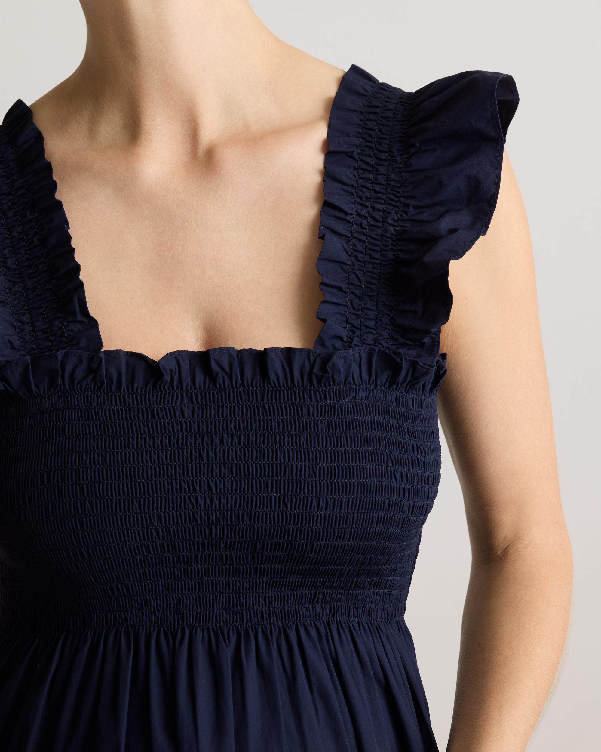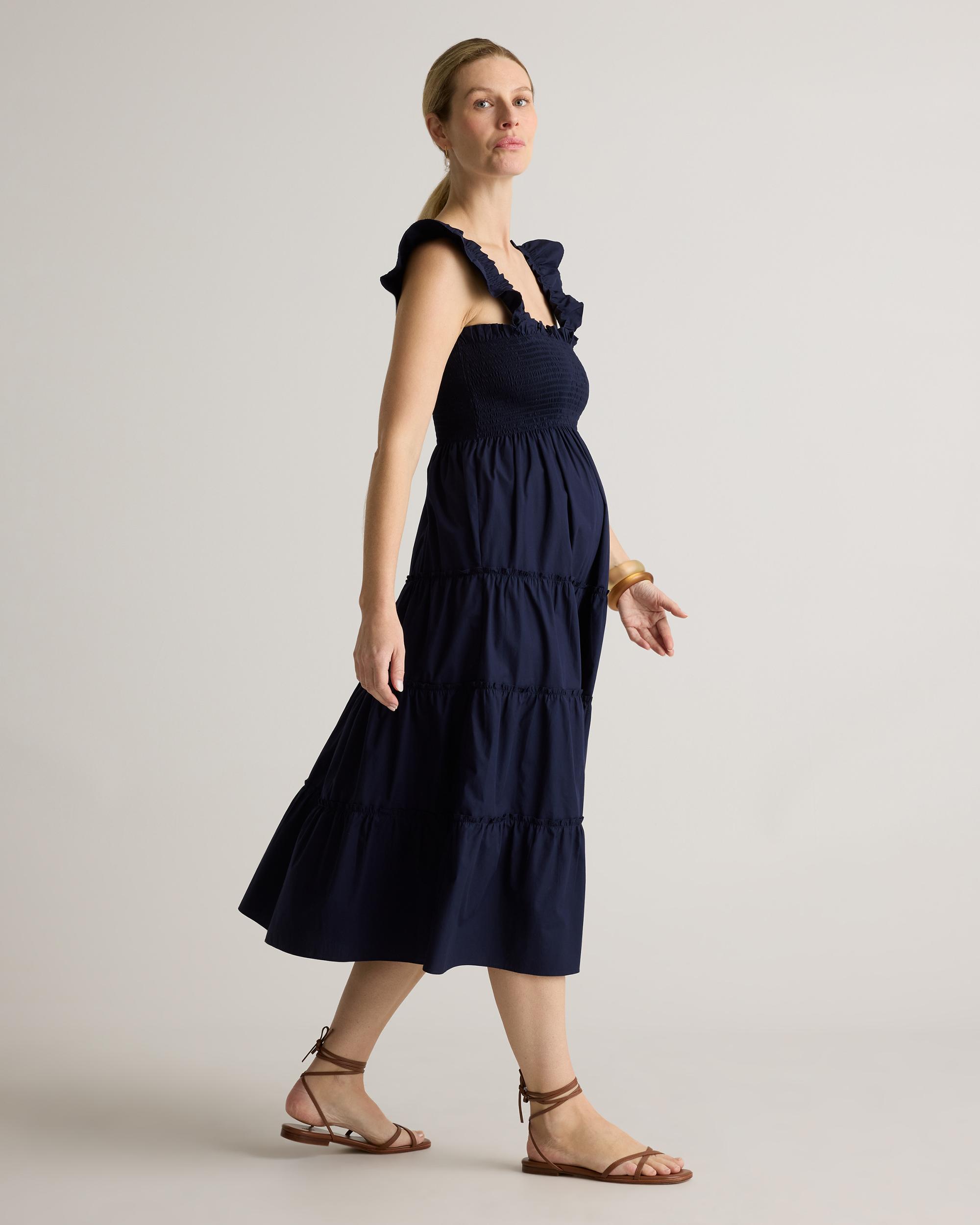 Our flirty midi dress is not only flattering, but comfortable too! This sleeveless style is crafted with ruffle detailing at the sleeves, a smocked elasticated top and tiered skirt. Made from breathable and lightweight organic cotton poplin, so soft, you will want to live in this through pregnancy and beyond. | Quince | Women's Poplin Maternity Smocked Midi Dress in Navy, Size Large, Organic Cotton