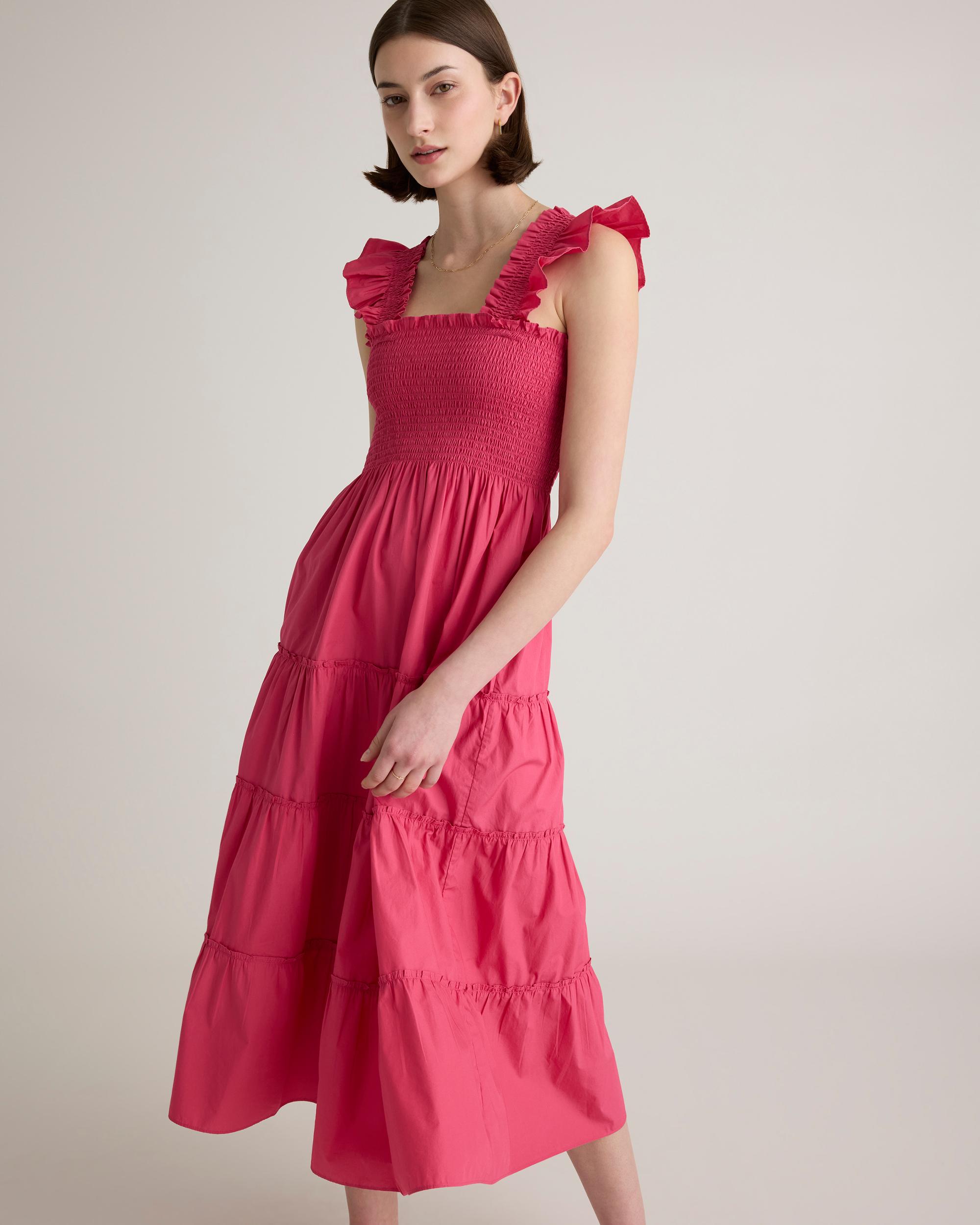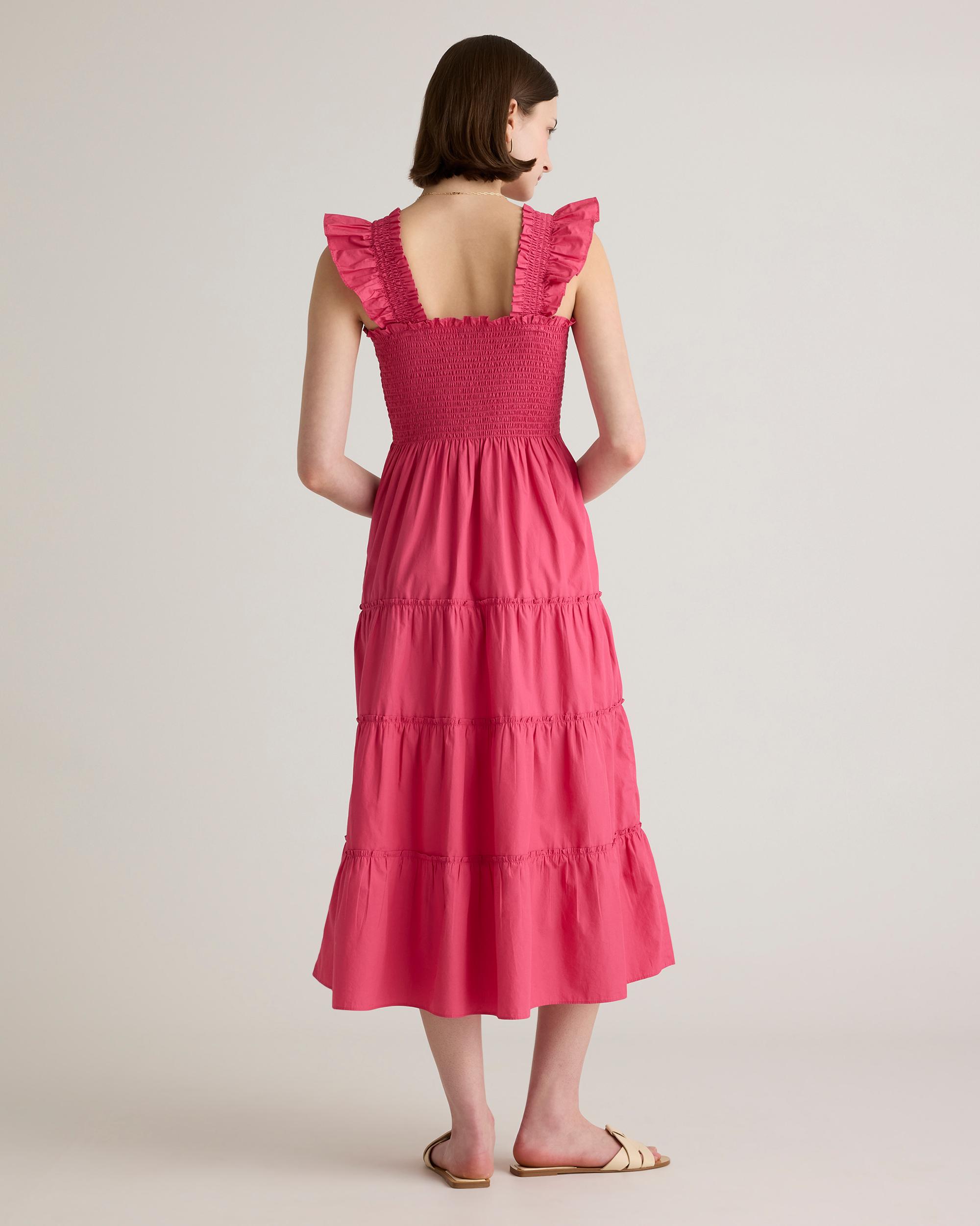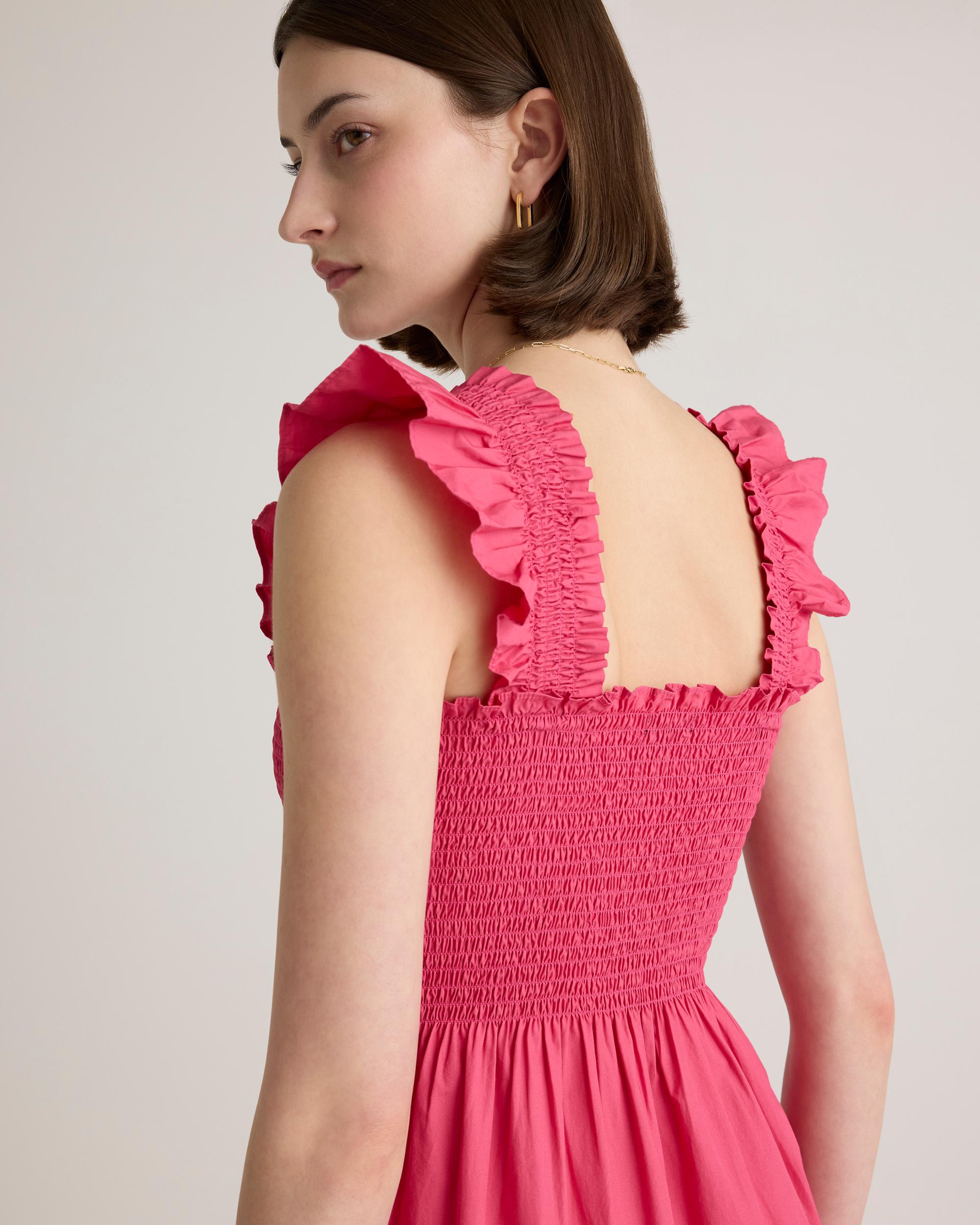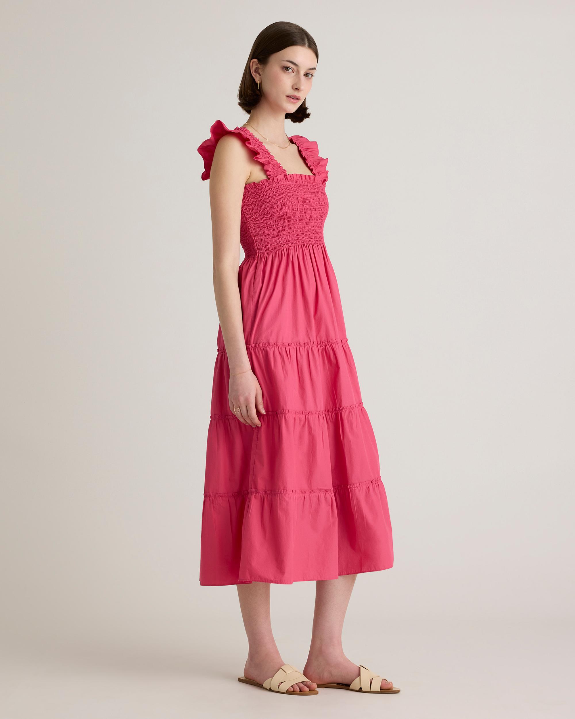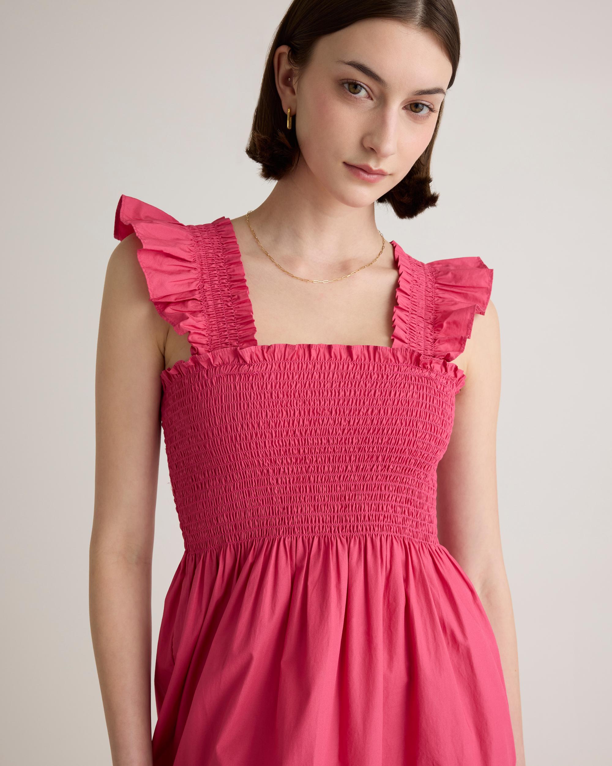 This floaty, flirty, light dress is about to become your fave for summer. Flattering A-line cut, smocked elasticated top, tiered poplin skirt. The sleeveless style has ruffle detailing and all in breathable, natural 100% organic cotton poplin. It's soft, comfy, and the midi-length has the potential to be dressed up or down. Also offered in maternity. | Quince | Women's Poplin Smocked Midi Dress in Lipstick Pink, Size Small, Organic Cotton