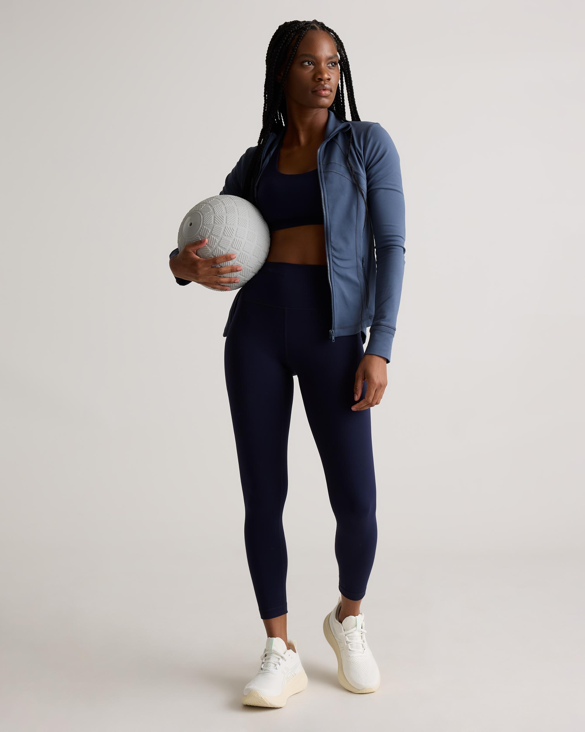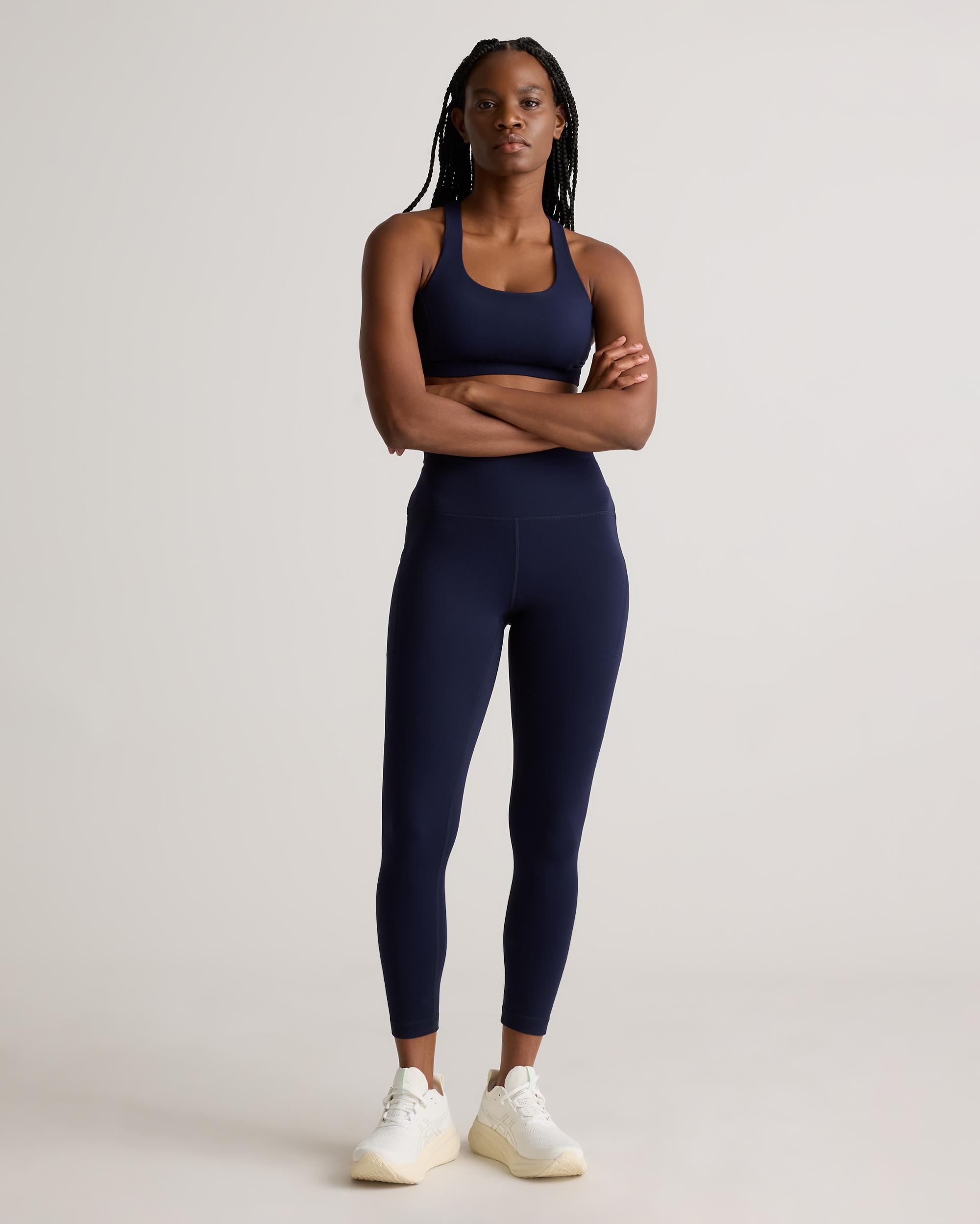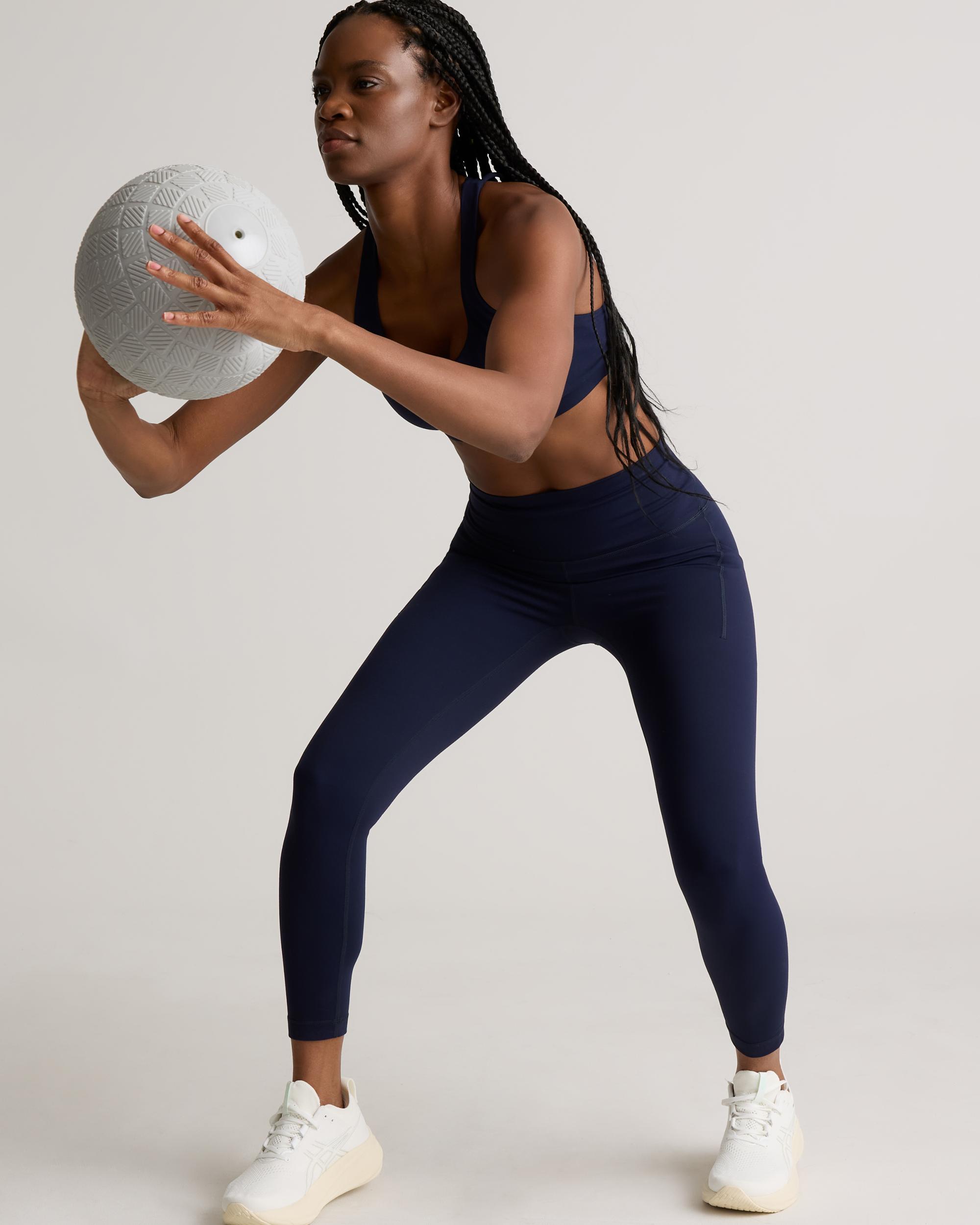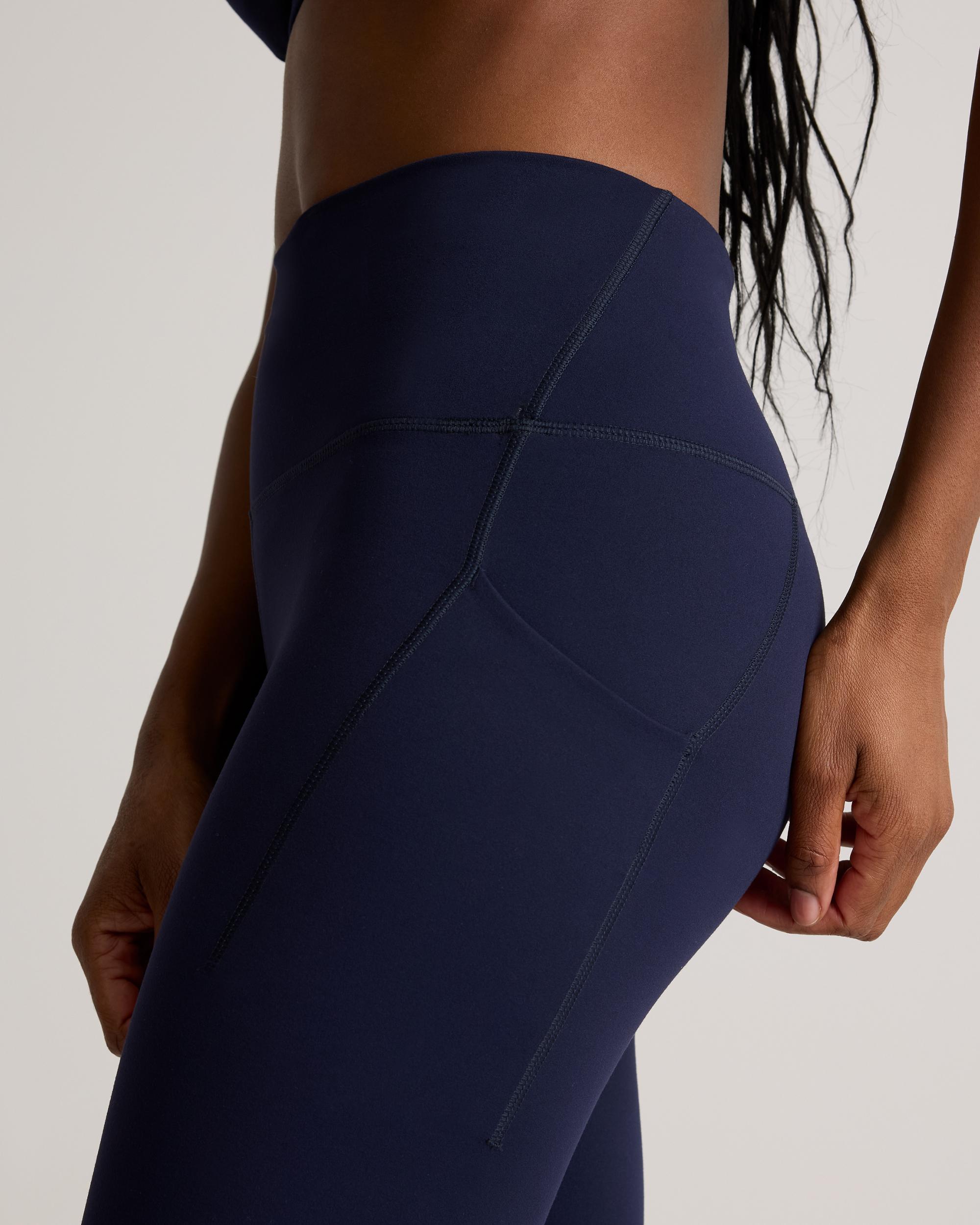 Meet the Power-Up High-Rise Training Pocket Legging, a comfy & durable layer designed for your most intense training sessions. The quick-drying, moisture-wicking, and anti-microbial Power-Up fabric makes it perfect for sweaty workouts and the 4-way stretch allows for full range of motion (think: squats, jumps, and weight lifting). Our favorite details? The drop-in waistband pocket that provides convenient storage and the internal adjustable waistband that ensures a secure and comfortable fit. If you prefer clean lines and no pockets, try our Power-Up High-Rise Training Legging. | Quince | Women's Power-Up High-Rise Training Pocket Legging in Deep Navy, Size Medium, Nylon/Spandex