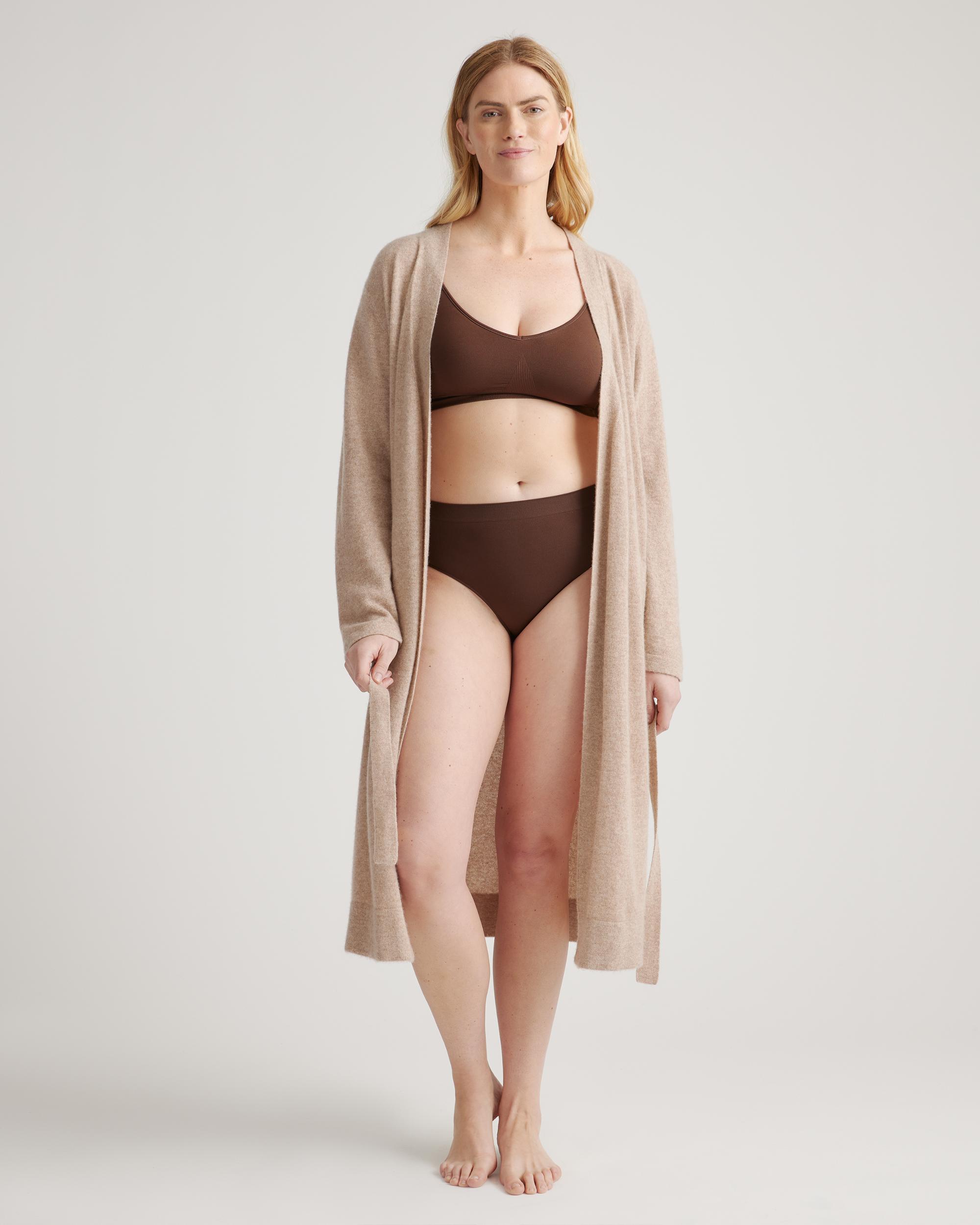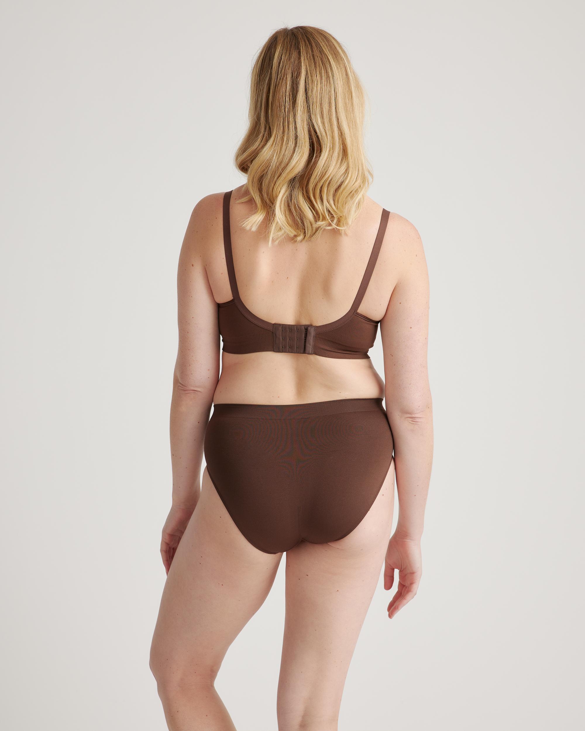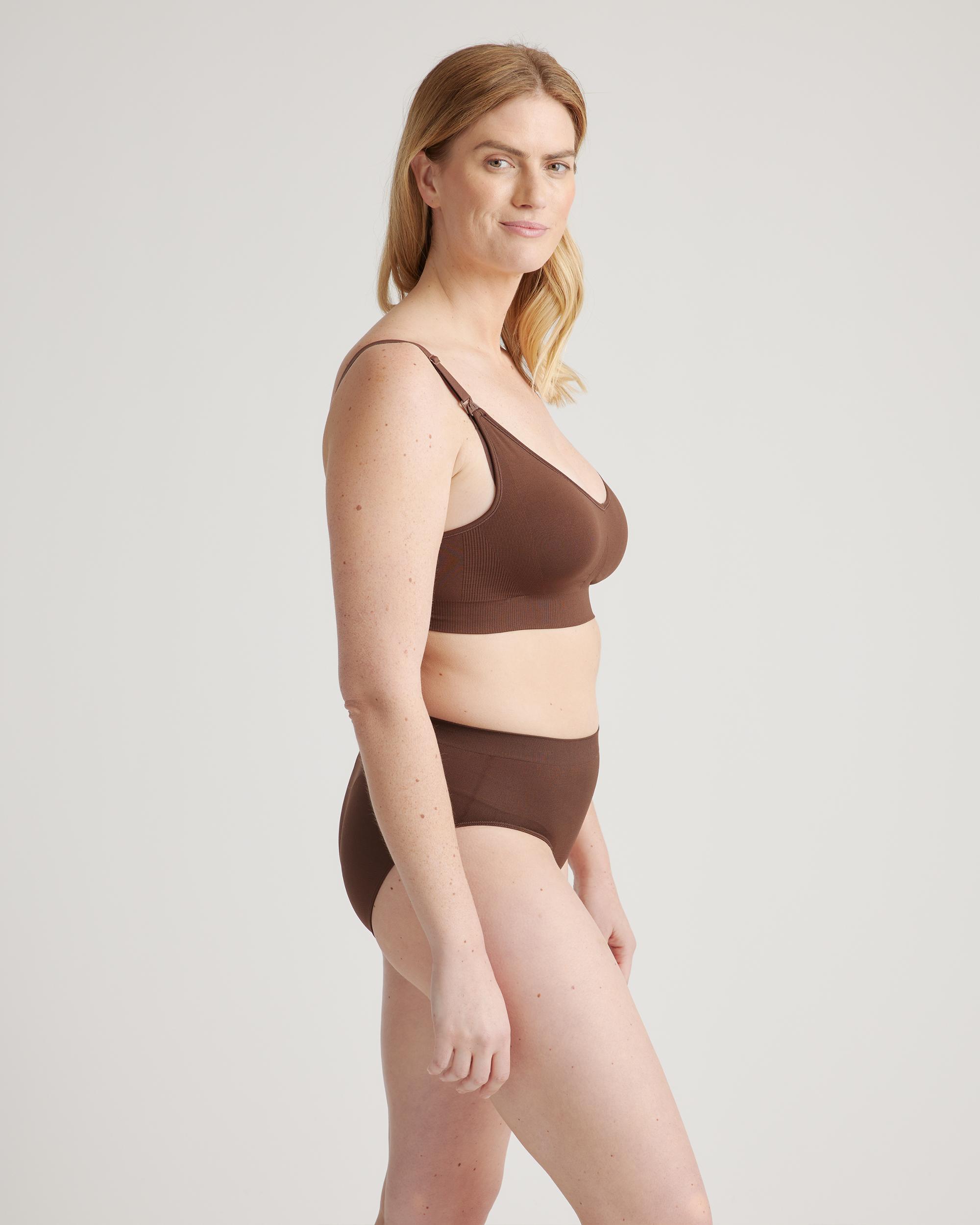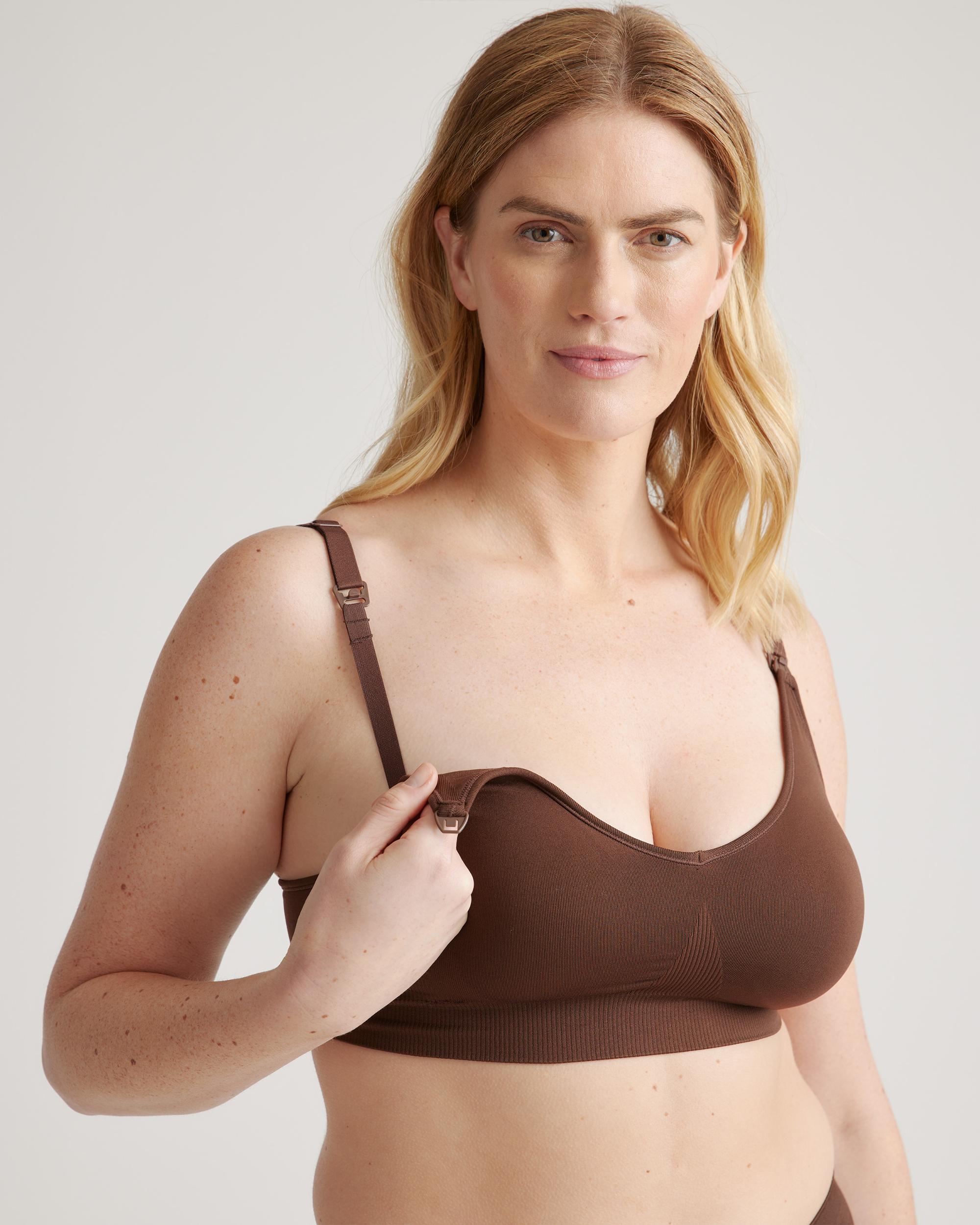 Why yes, it is possible to love your nursing bra this much. Made with a blend of recycled nylon and spandex, our Seamless Nursing Bra provides full coverage and support with knit-in support zones. Designed with nursing clips, removable pads, adjustable straps and an included bra extender, this is guaranteed to be a staple piece in our breastfeeding journey. | Quince | Women's Seamless Nursing Bra in Cocoa, Size Medium, Nylon/Spandex
