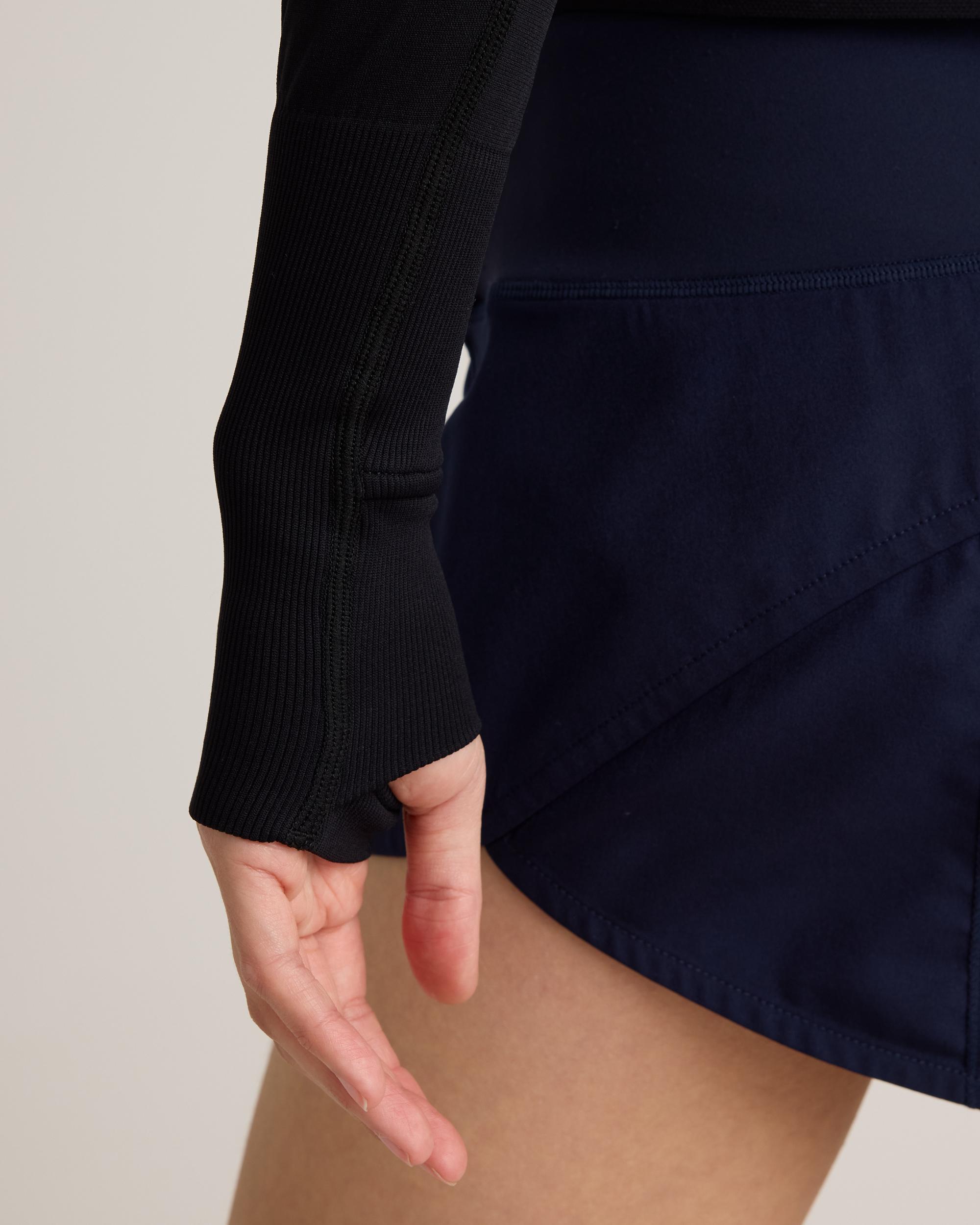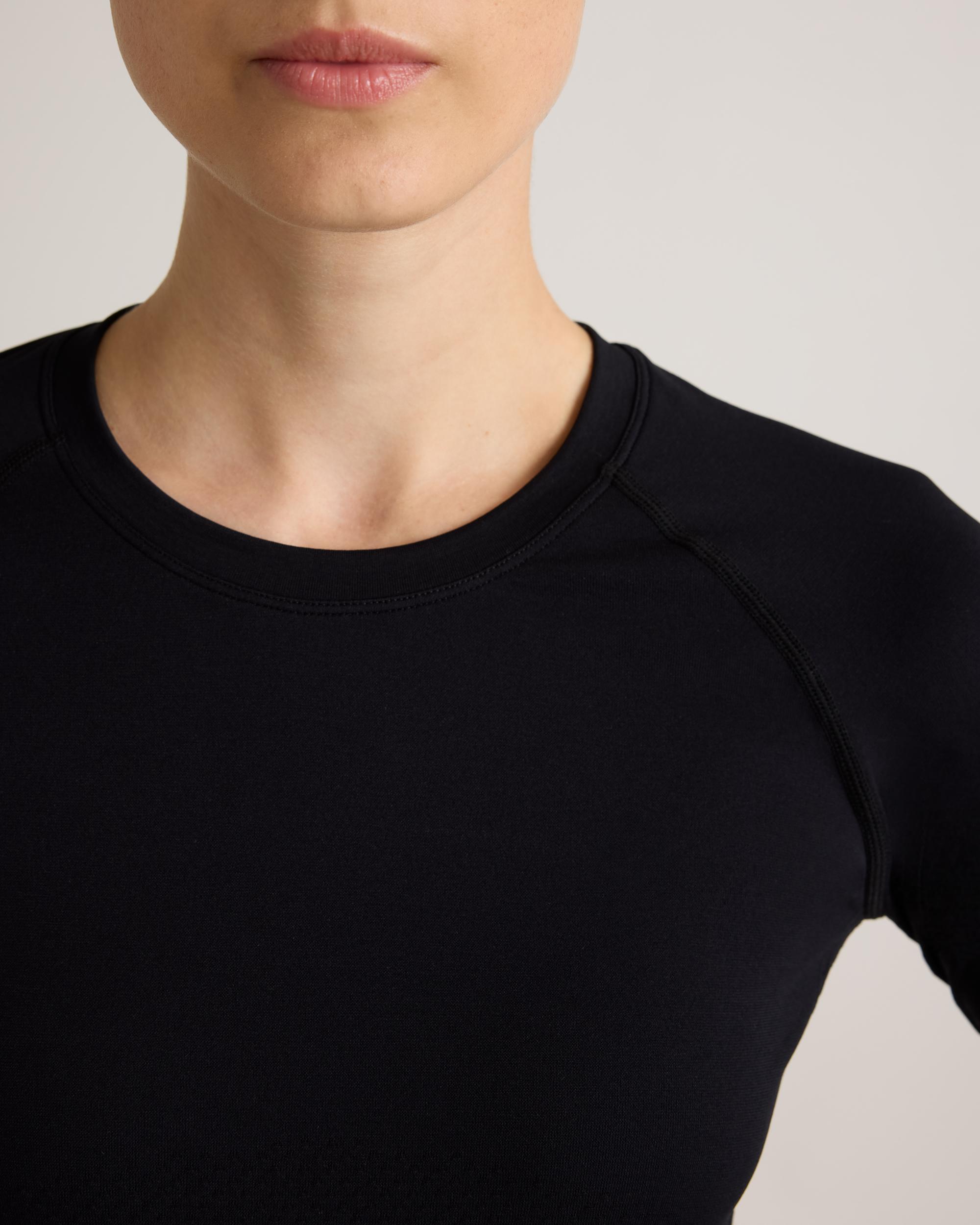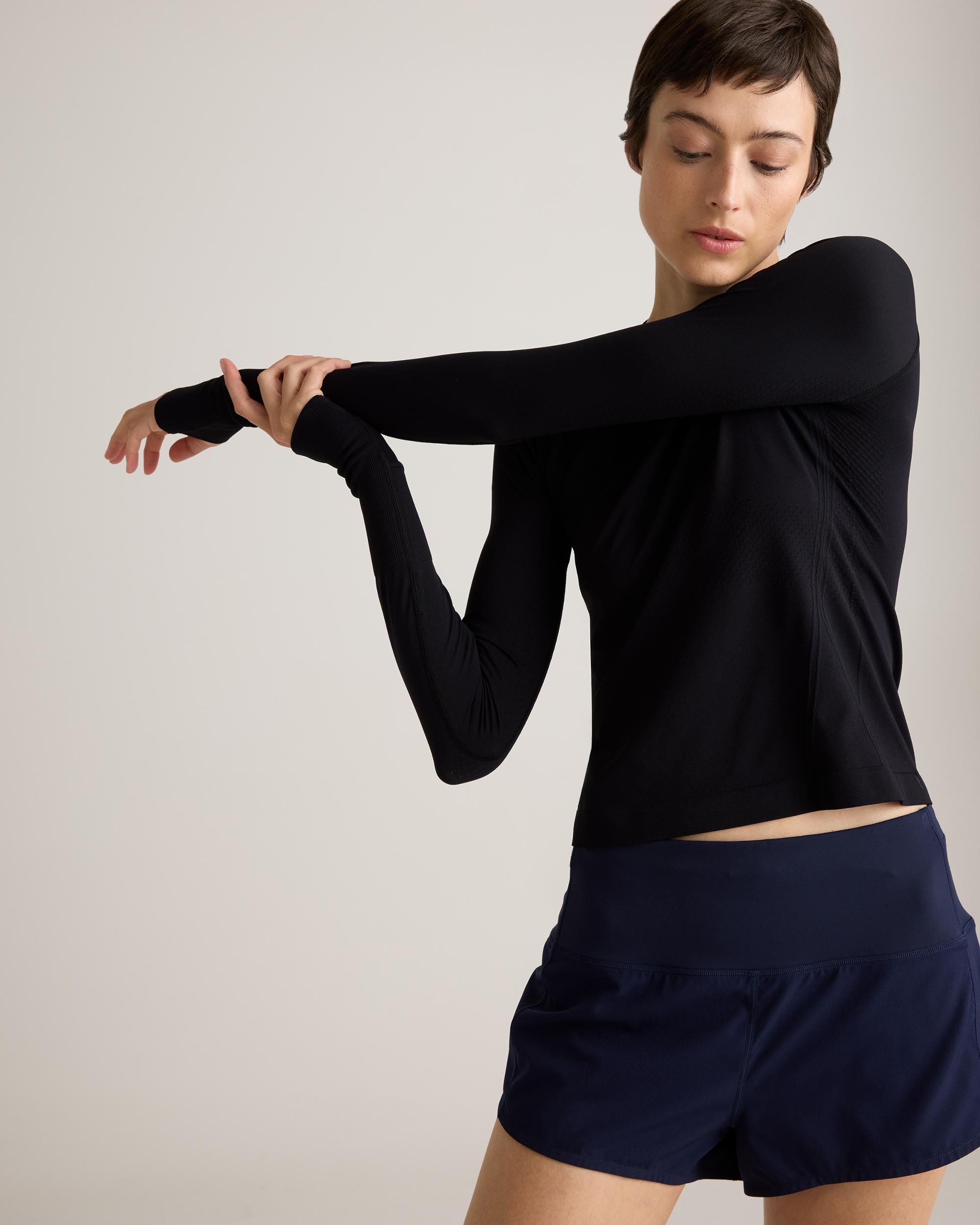 The Waist-Length Long Sleeve Top is designed for high-performance runs and intense workouts. With a cropped fit that hits at the waist, this shirt provides a sleek, chafe-free design for full mobility during every stride. Ribbed cuffs with thumbholes keep sleeves in place, while grips inside the hemline ensure the shirt stays secure through your most dynamic moves. Crafted with breathable, moisture-wicking fabric, it keeps you cool and focused, whether you're running, lifting, or pushing through high-intensity training. | Quince | Women's Seamless Waist-Length Long Sleeve Top in Black, Size Medium, Nylon