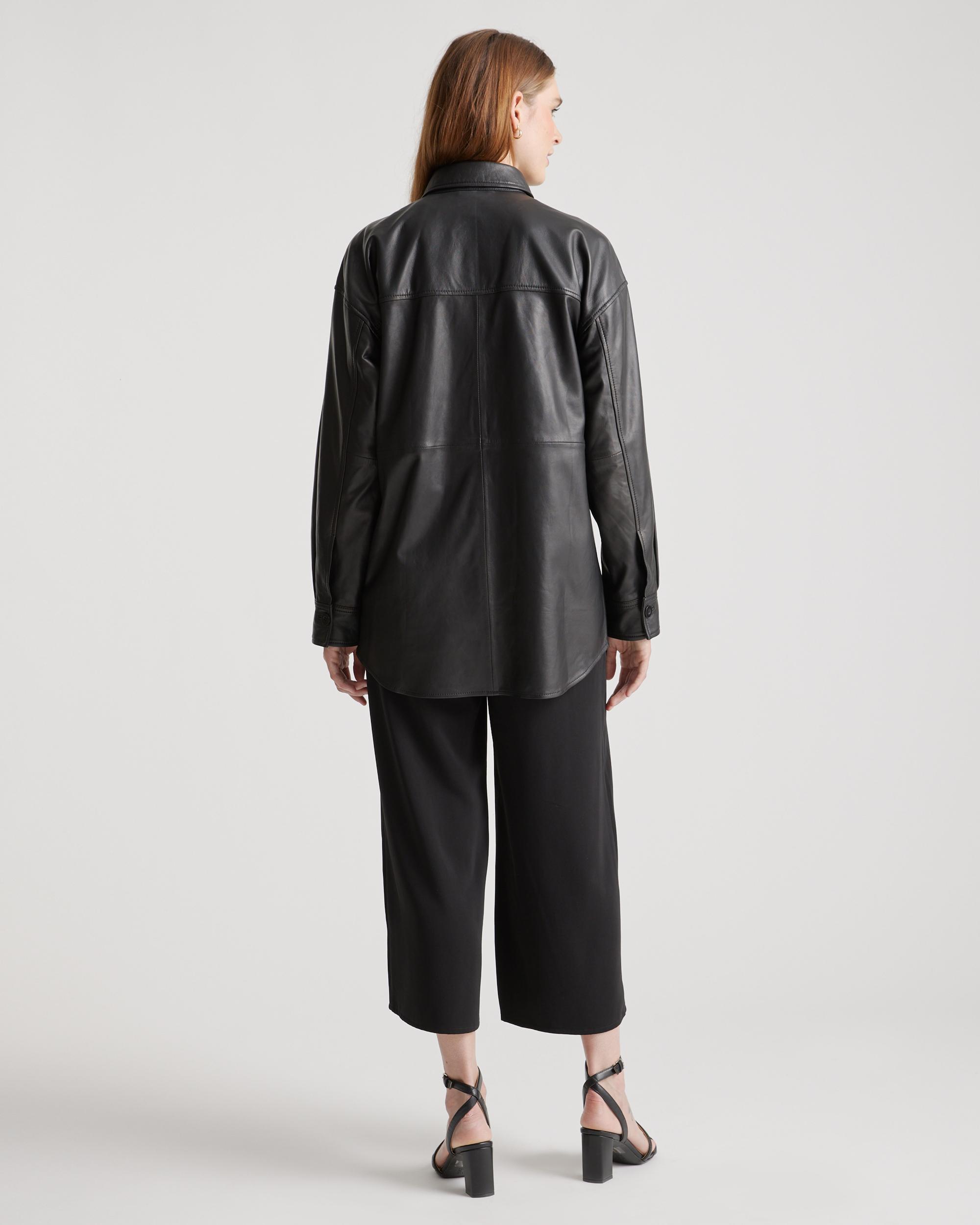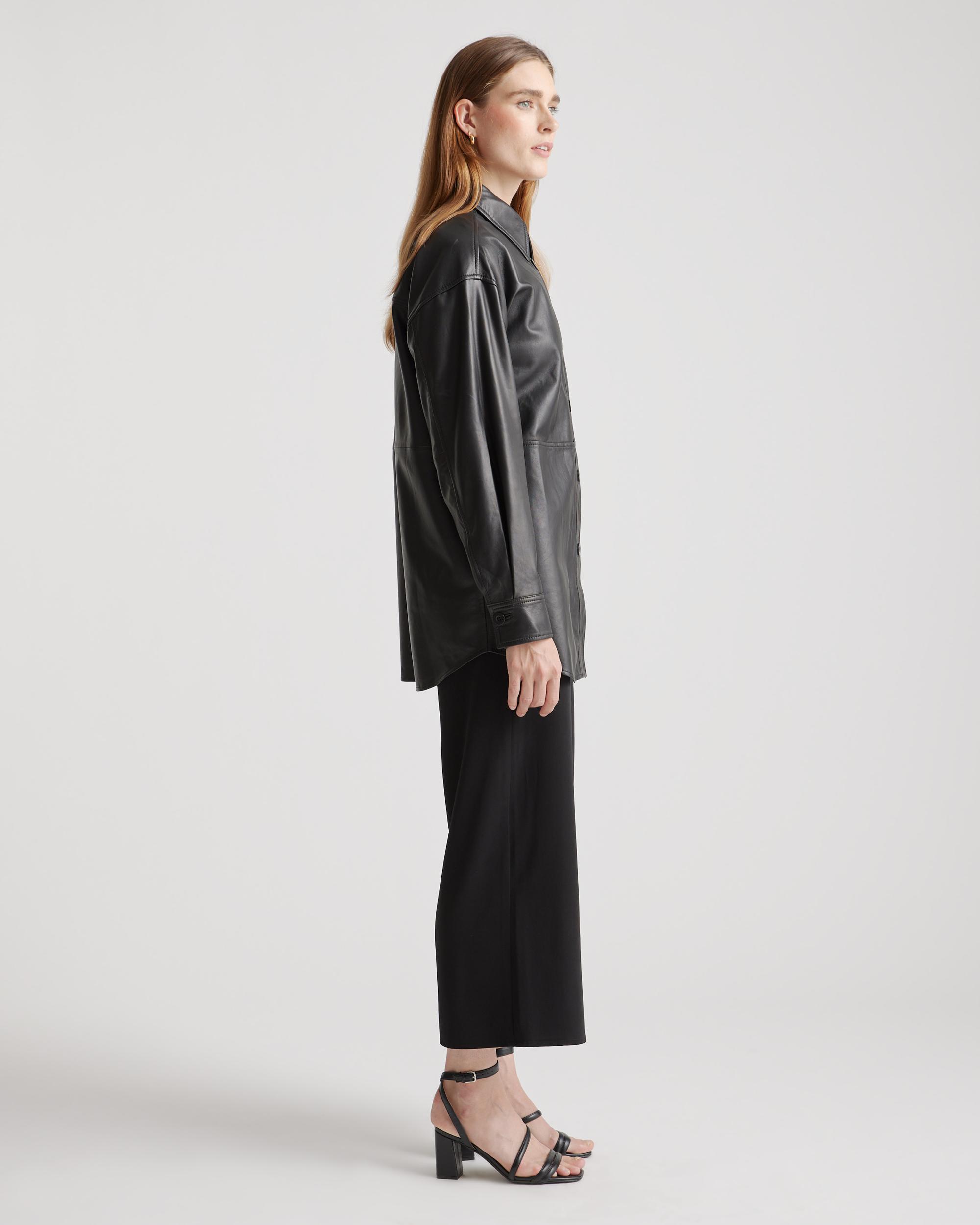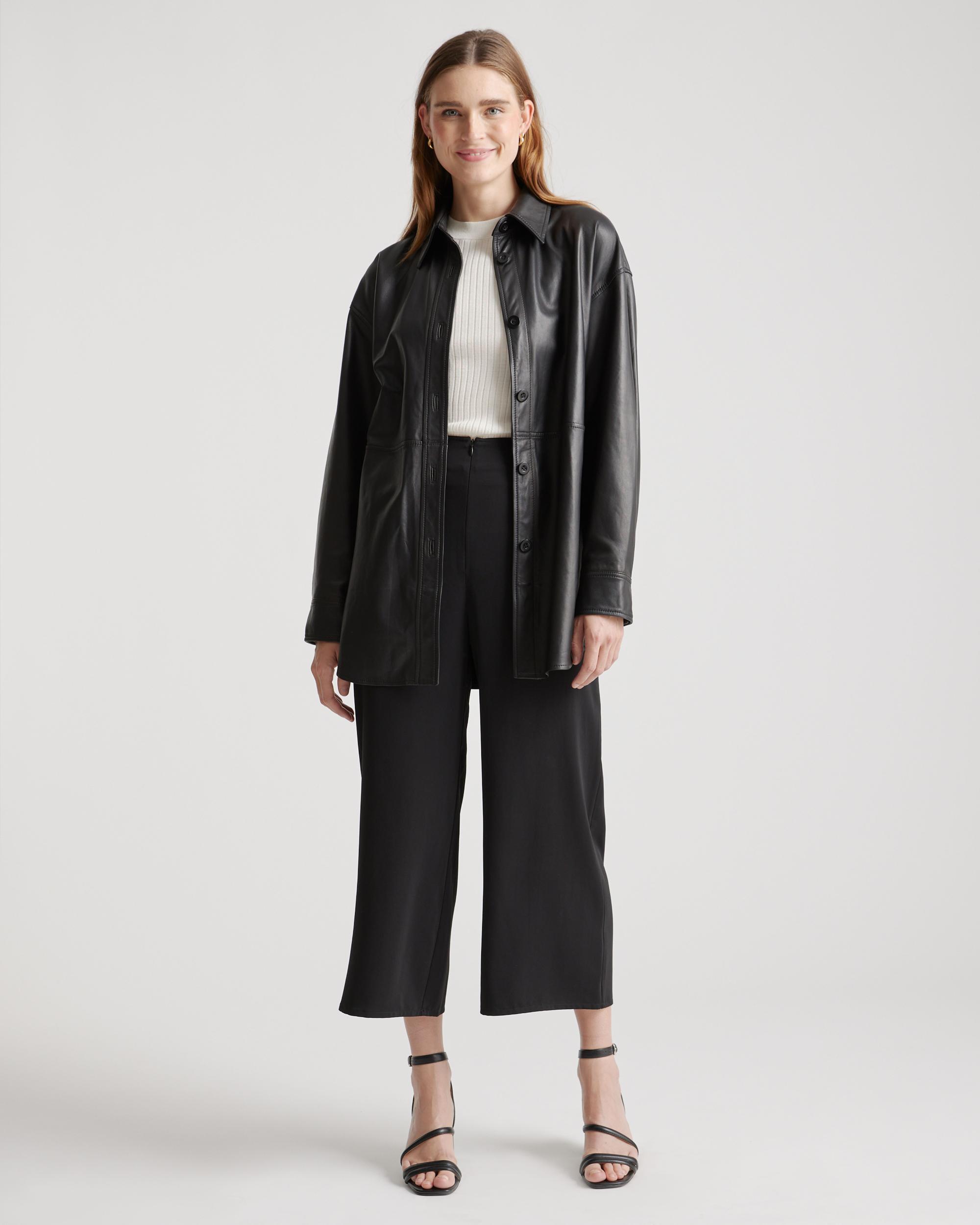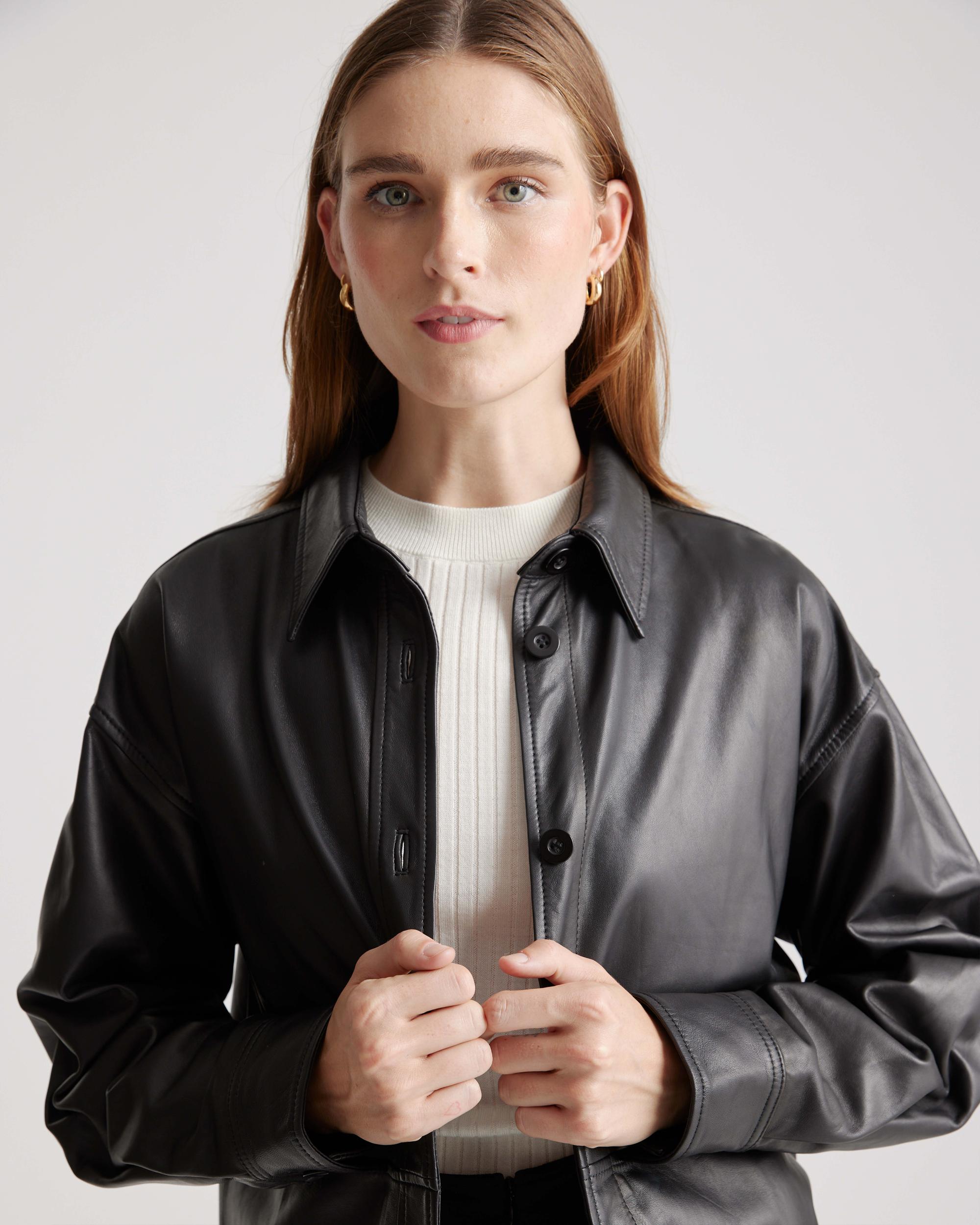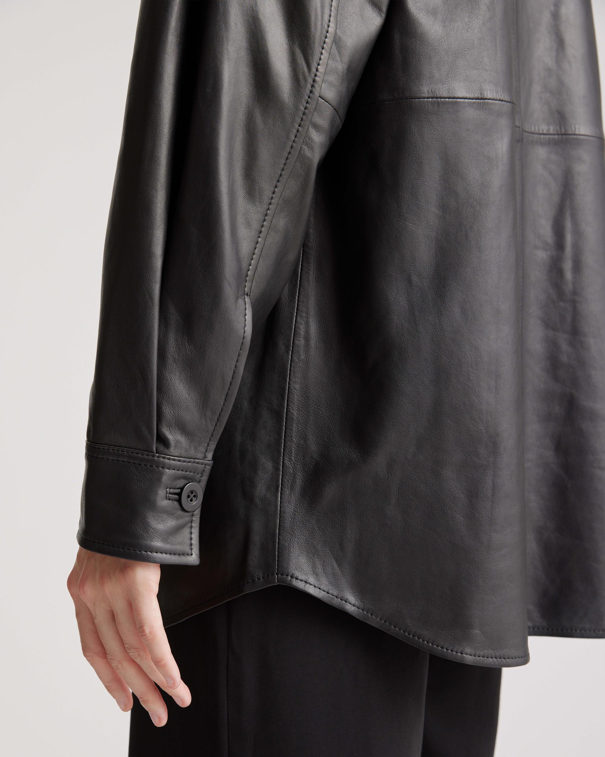 Part shirt, part jacket, 100% top grain leather. This oversized, relaxed-fitting shacket is your perfect go-to style as the temperature starts to drop. With dropped shoulders, adjustable button closure cuffs, and a rounded hem, this jacket is made for layering and goes with just about everything. Buttery-soft and incredibly stylish, you'll be happy wearing it again and again. Read more about what makes our leather special in our Leather 101 guide. | Quince | Women's Shirt Jacket in Black, Size XS, Leather