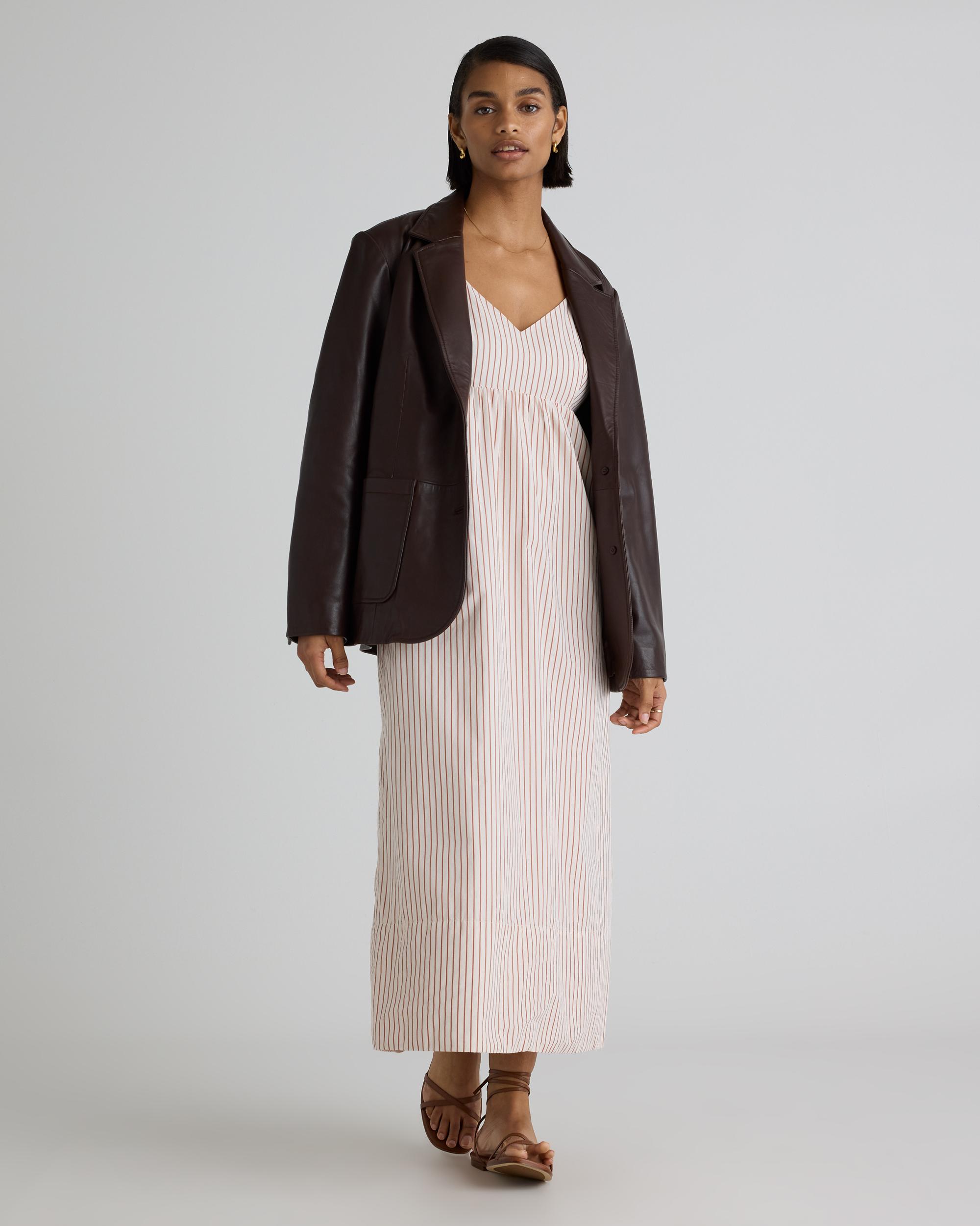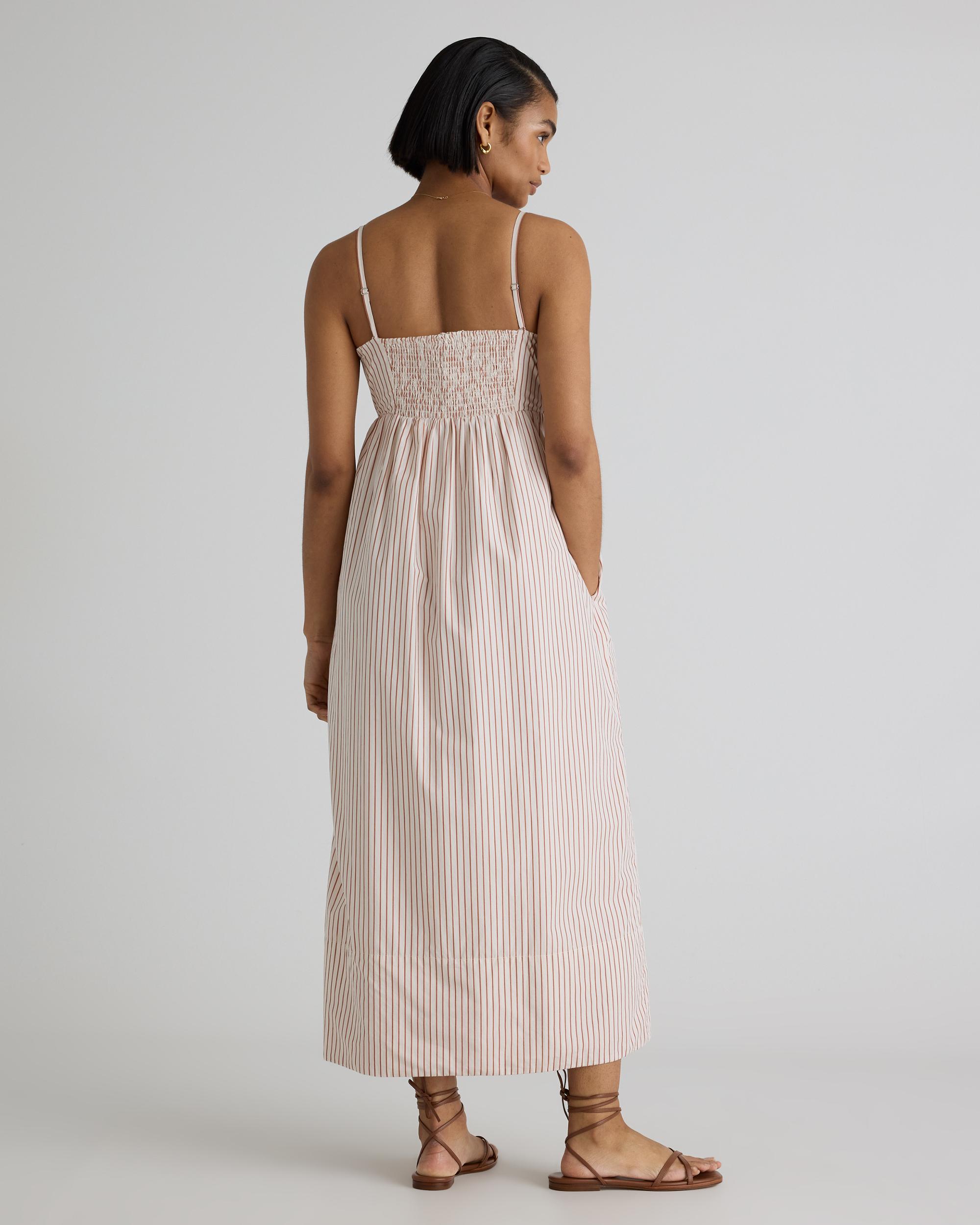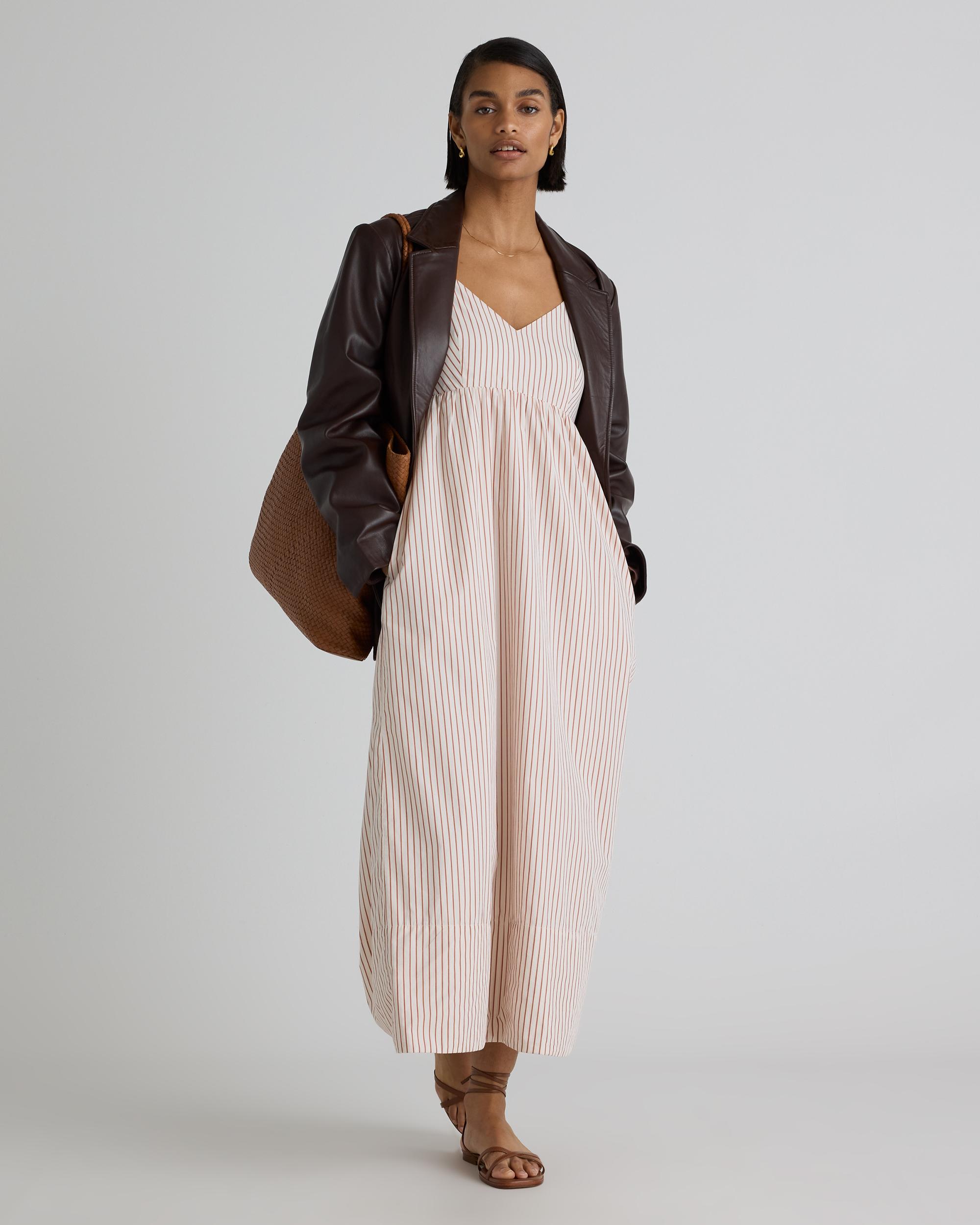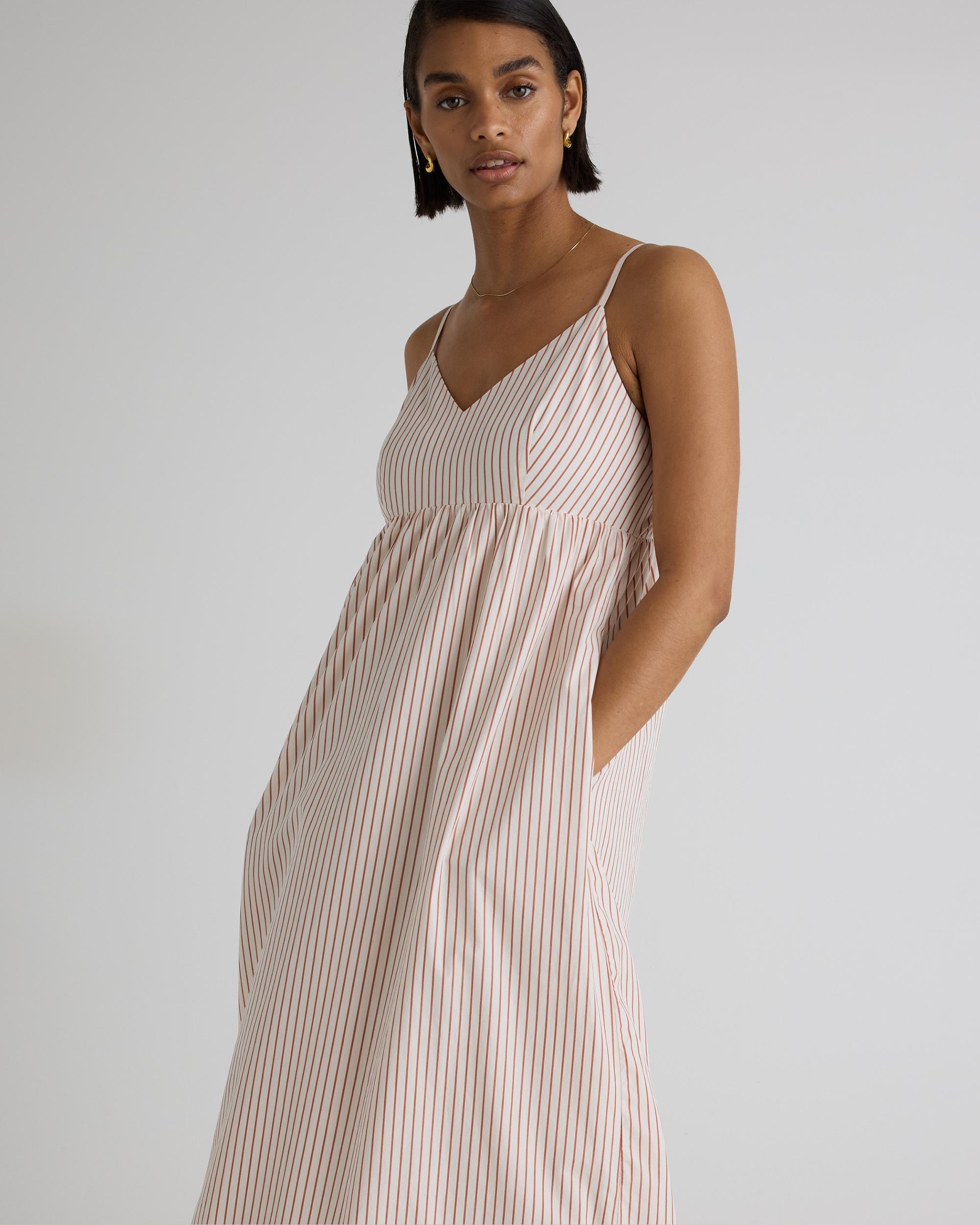Elevate your wardrobe with our 100% Organic Cotton Sleeveless Maxi Dress - the perfect combination of style and sustainability. Made from high-quality, organic cotton poplin, this dress is not only beautiful, but also environmentally friendly. Featuring a flattering empire waist that skims the body and a flowy maxi length, this dress exudes a feminine and elegant look. The breathable fabric provides comfort and versatility, making it perfect for any occasion - from a summer wedding to a day out with friends. | Quince | Women's Sleeveless Maxi Dress in Terracotta Stripe, Size XS, Organic Cotton