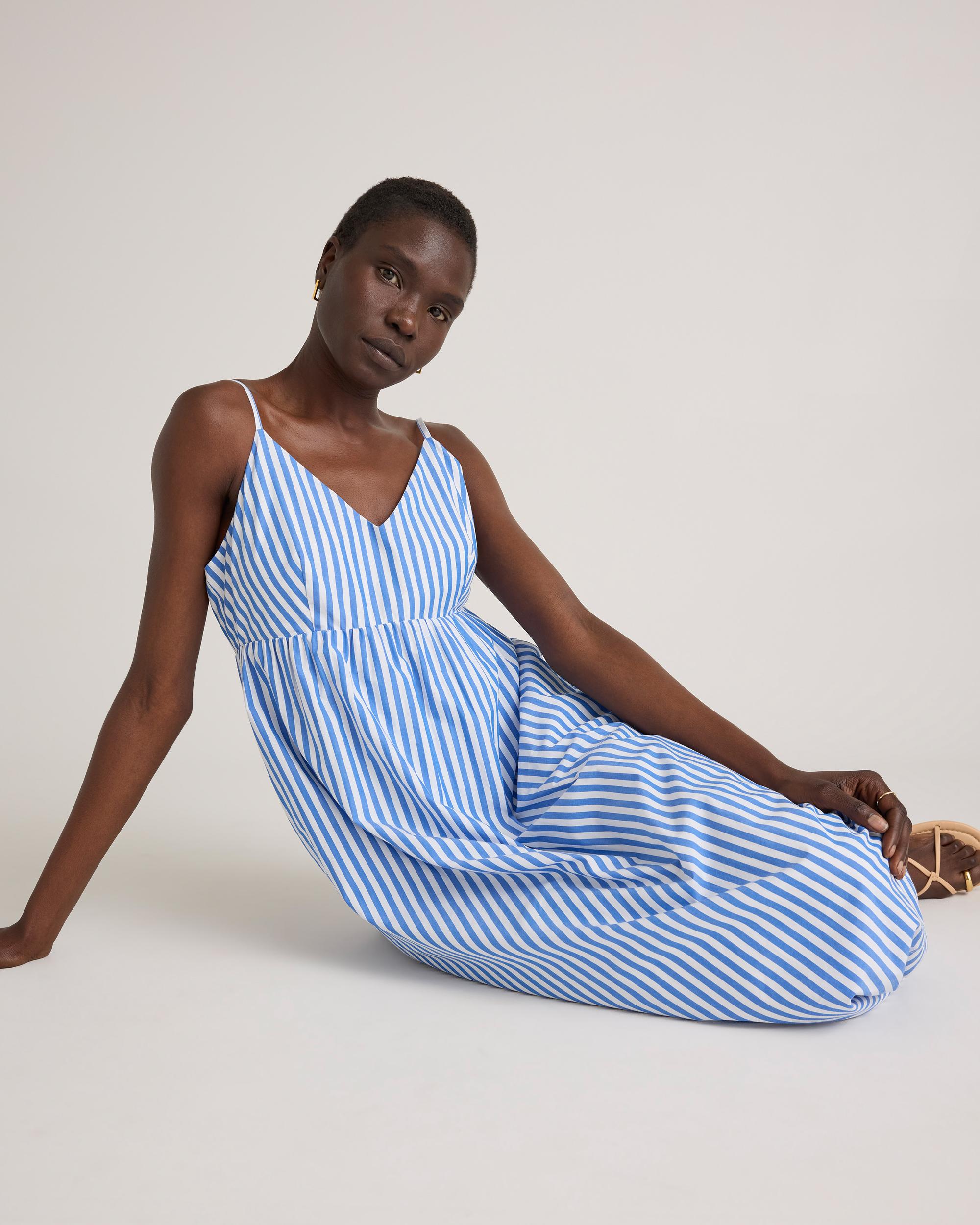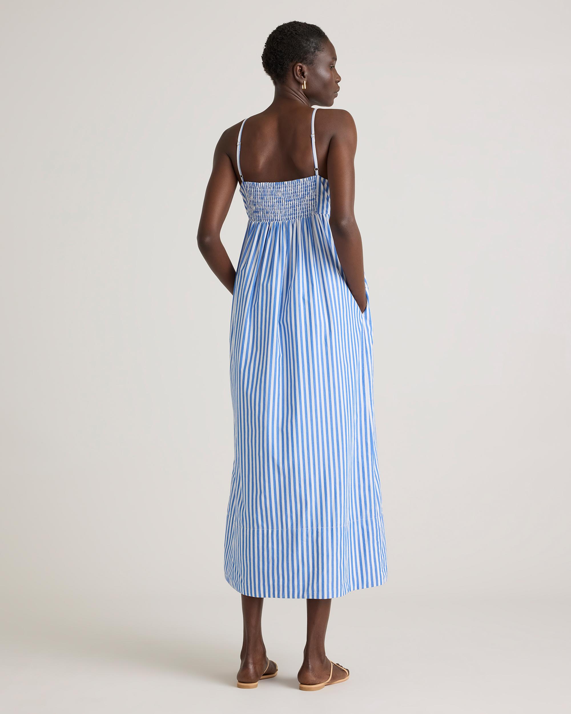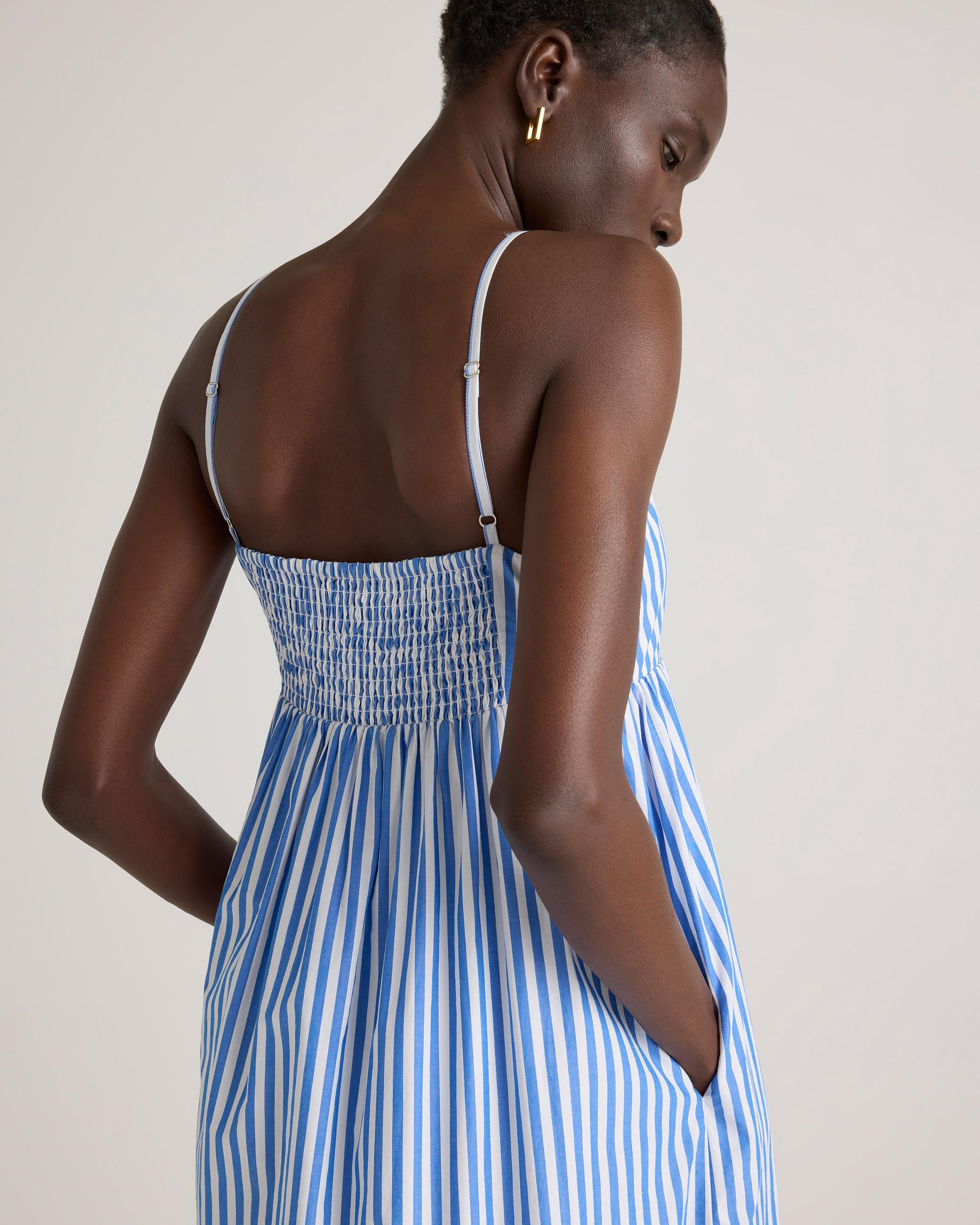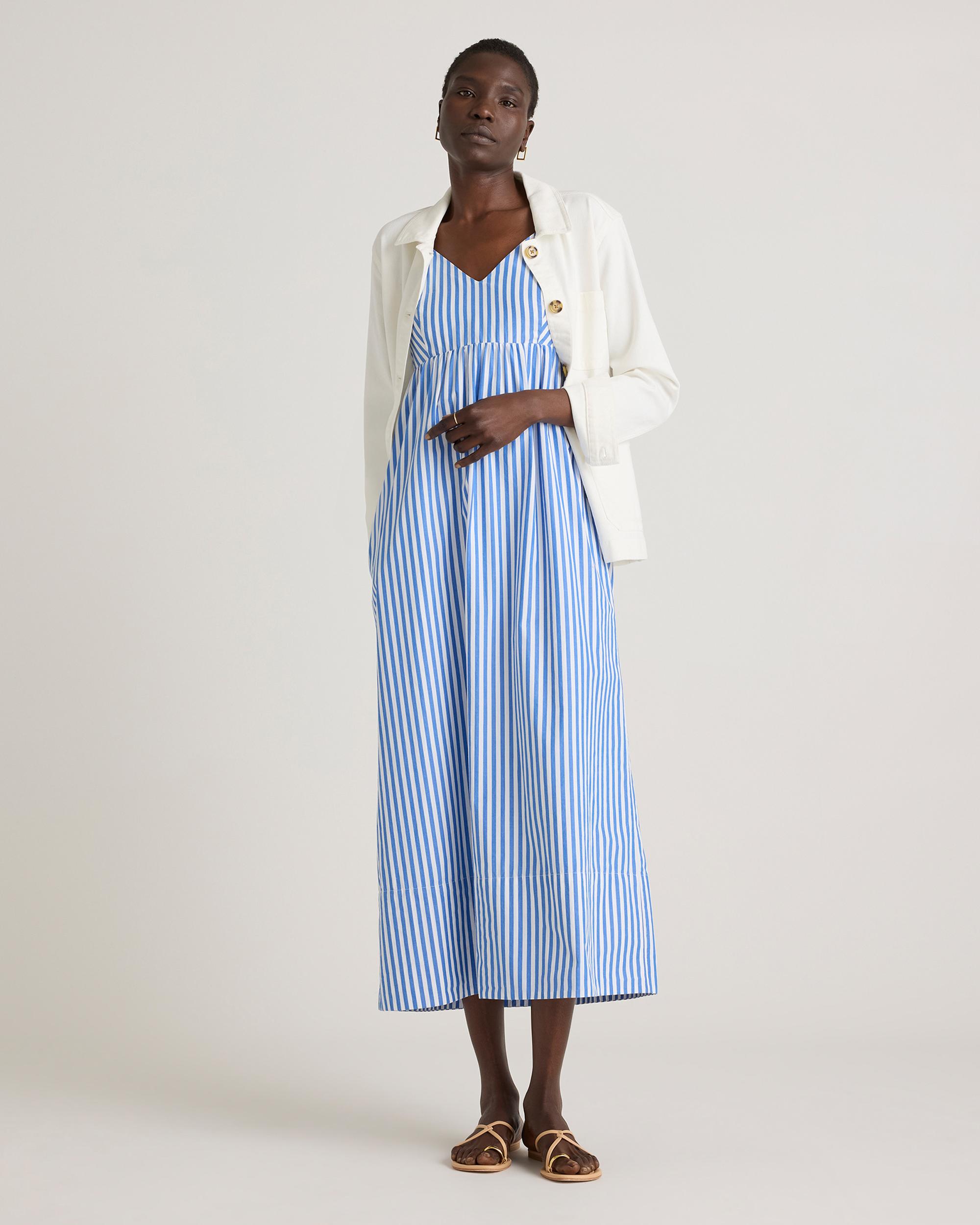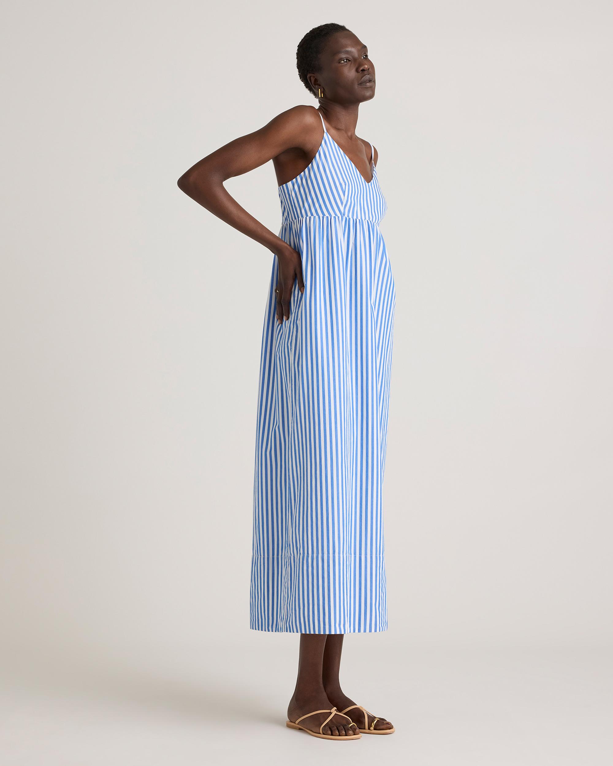Elevate your wardrobe with our 100% Organic Cotton Sleeveless Maxi Dress - the perfect combination of style and sustainability. Made from high-quality, organic cotton poplin, this dress is not only beautiful, but also environmentally friendly. Featuring a flattering empire waist that skims the body and a flowy maxi length, this dress exudes a feminine and elegant look. The breathable fabric provides comfort and versatility, making it perfect for any occasion - from a summer wedding to a day out with friends. | Quince | Women's Sleeveless Maxi Dress in Azure Stripe, Size XS, Organic Cotton