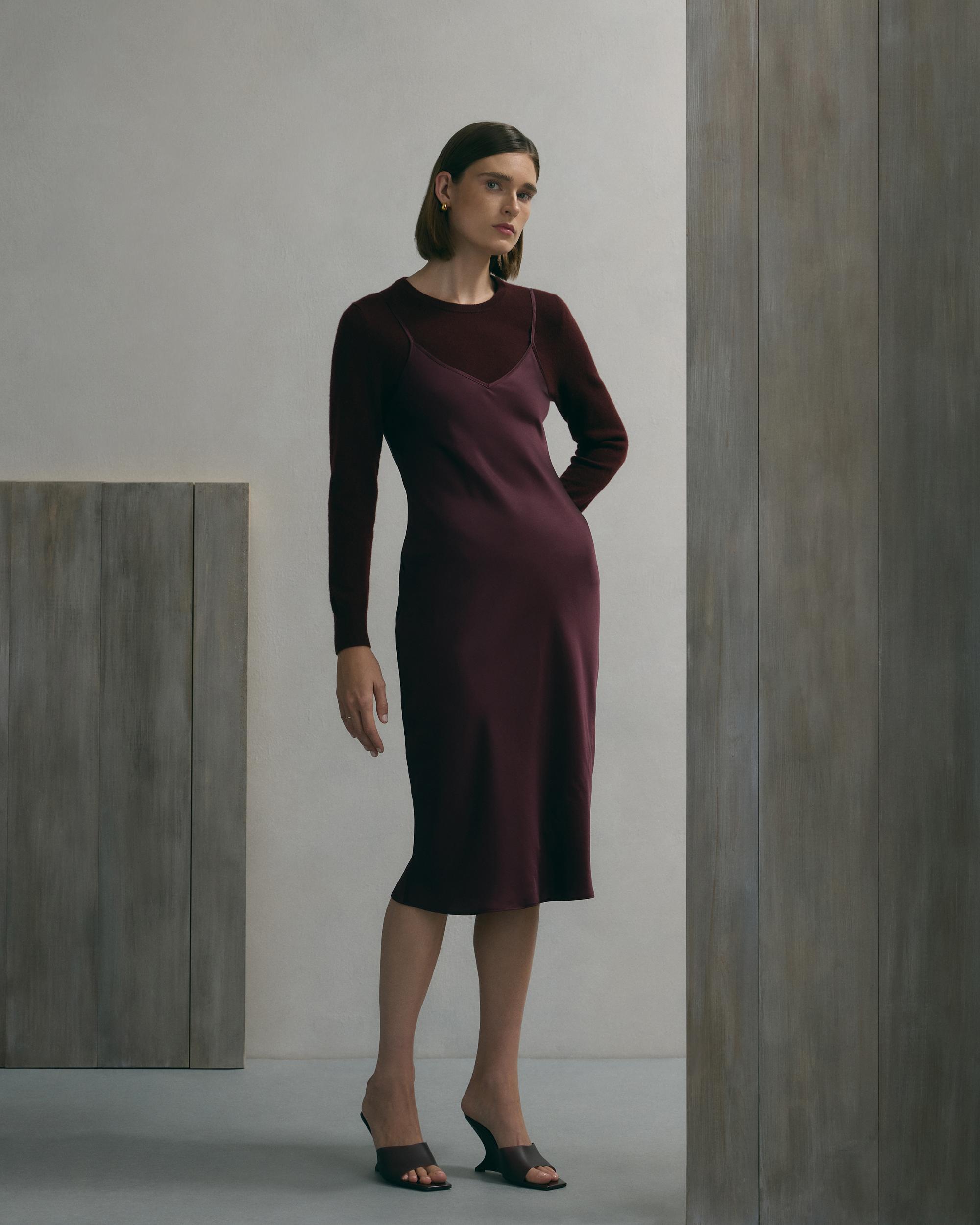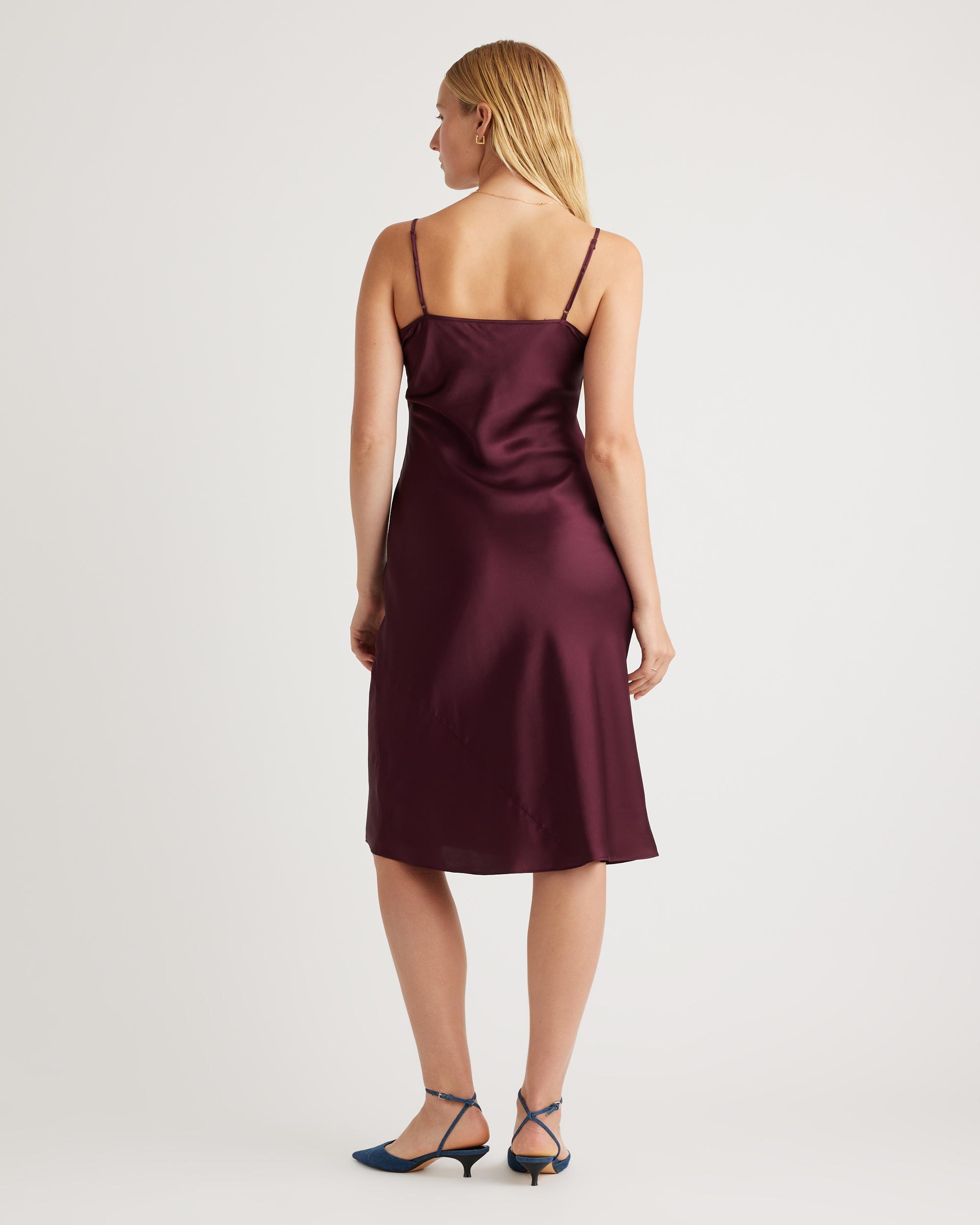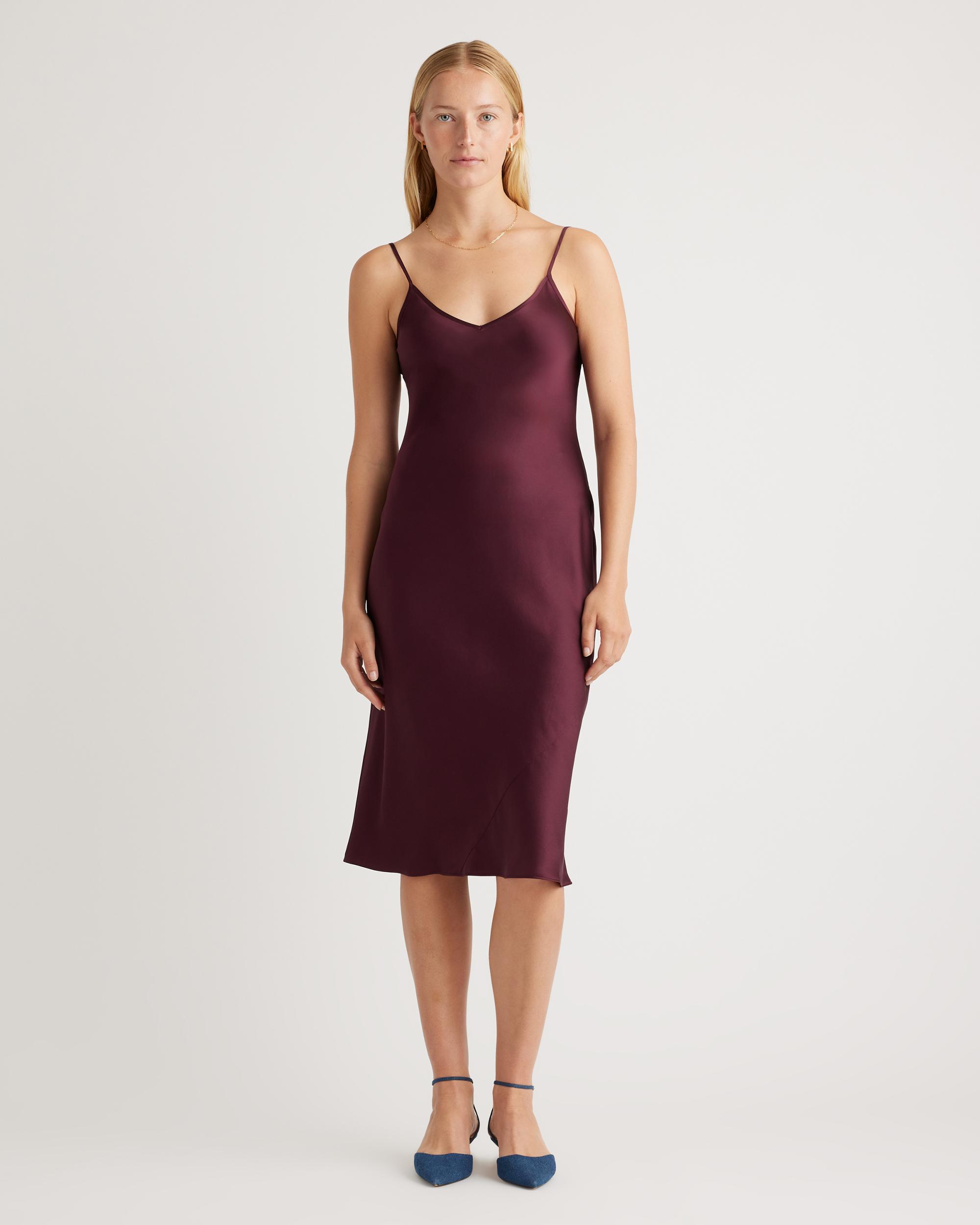 We love the midi length and bias cut of this dress! This super flattering fit is made from 100% mulberry silk, in a satin finish. The kicker? Our silk is washable. Easy to style, easy to wash for low-maintenance luxe. Plus, silk fiber contains 18 kinds of amino acids that make it amazing for skin nourishment, hypo-allergenic, and naturally thermoregulating to help maintain body temperature. Also offered in sizes 1X-3X. | Quince | Women's Slip Dress in Wine Tasting Red, Size XS, Silk