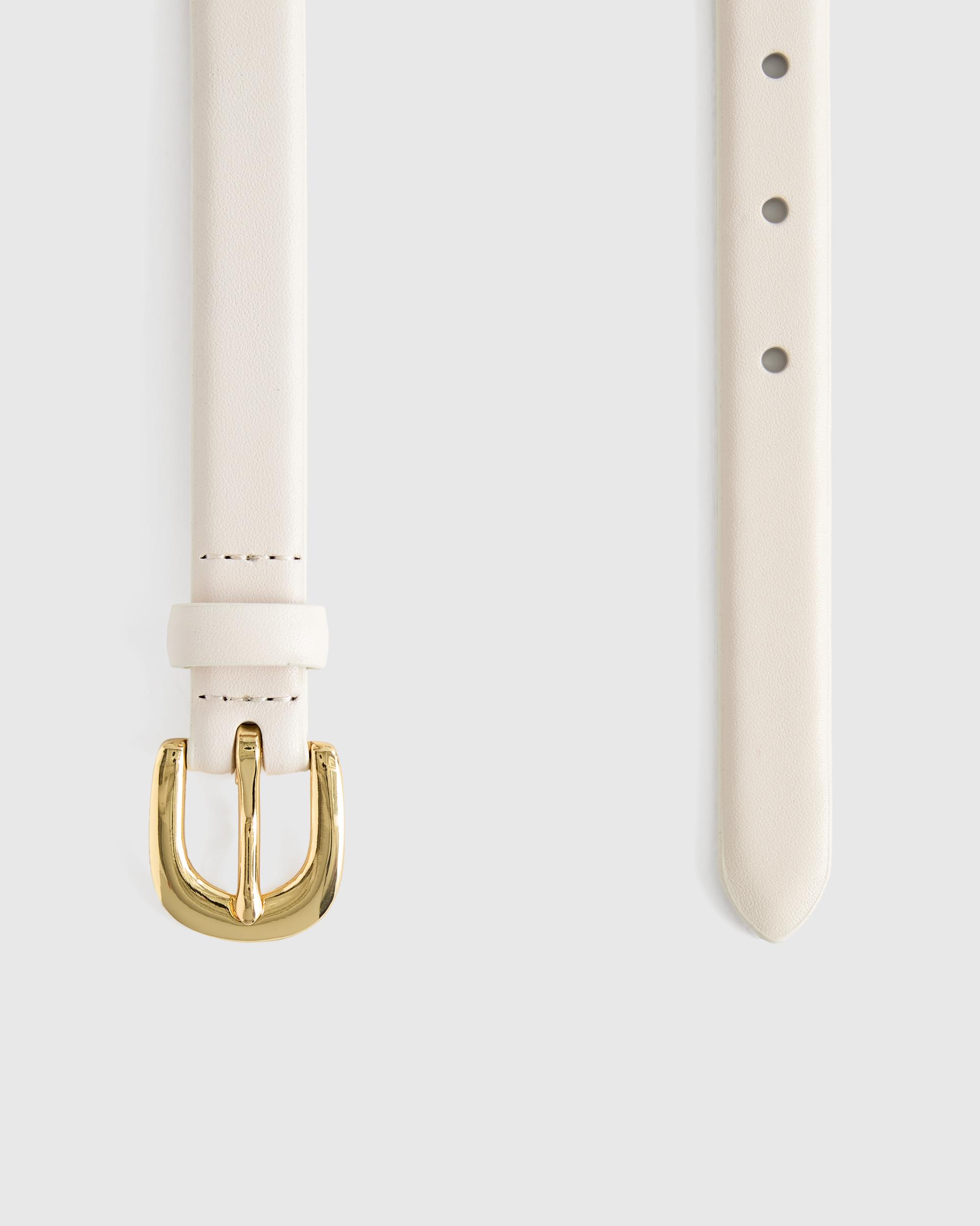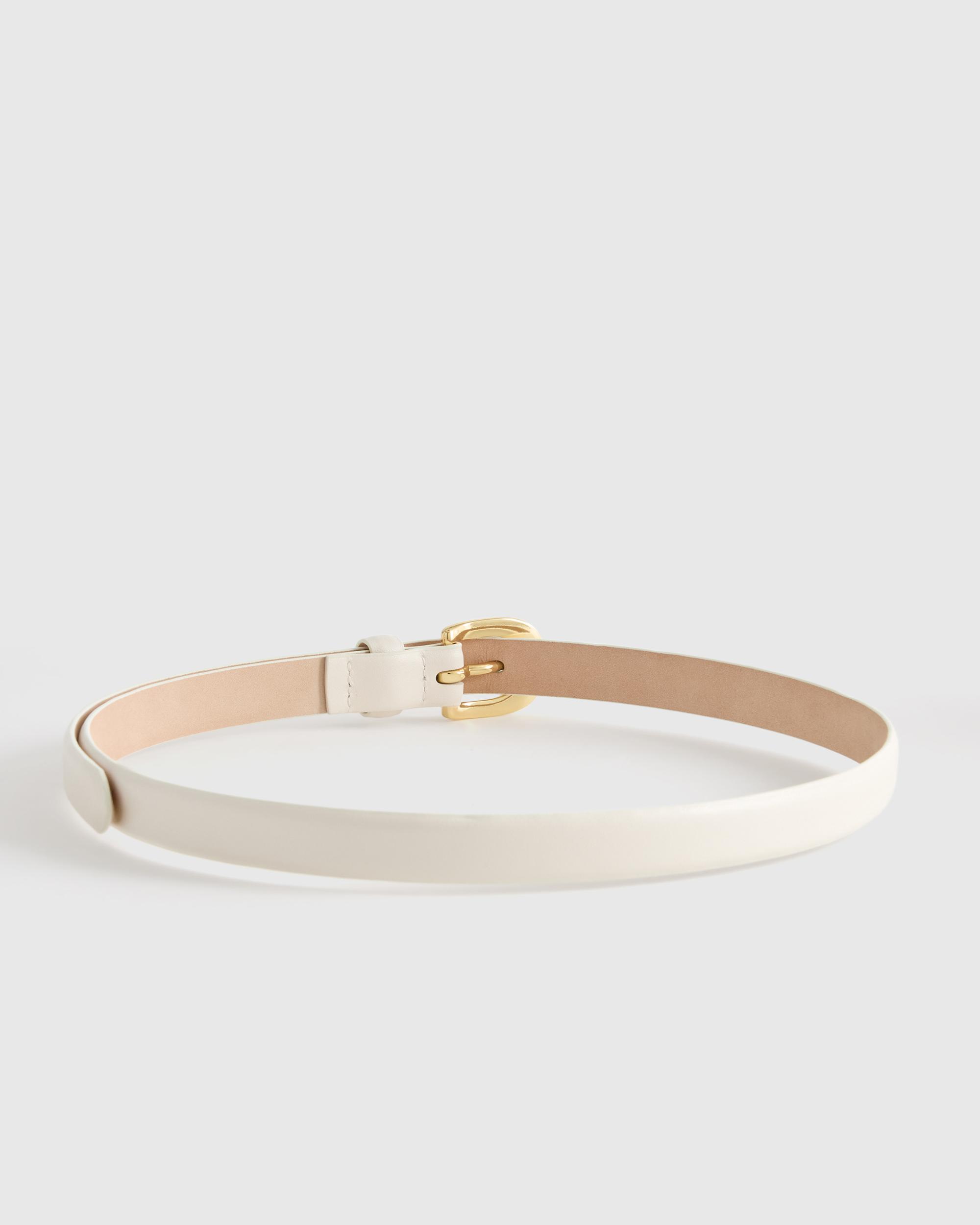 Introducing our Sofia European Leather Skinny Belt, a must-have wardrobe staple. Crafted from high-quality European leather and featuring a solid metal buckle, this belt is the perfect finishing touch to any look. Designed to be worn at either your waist or hips, this is the ultimate styling piece. | Quince | Women's Sofia European Leather Skinny Belt in Bone, Size XL