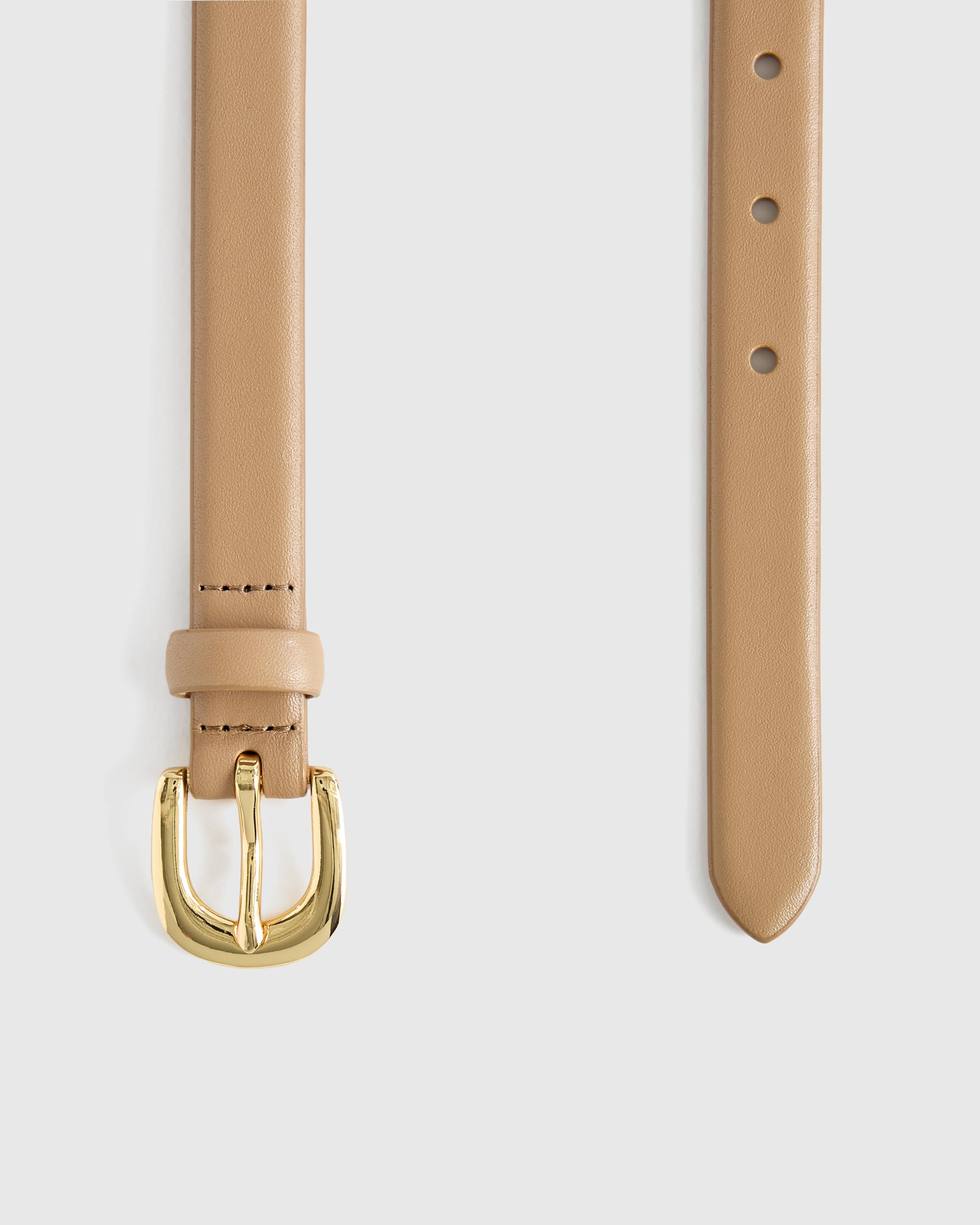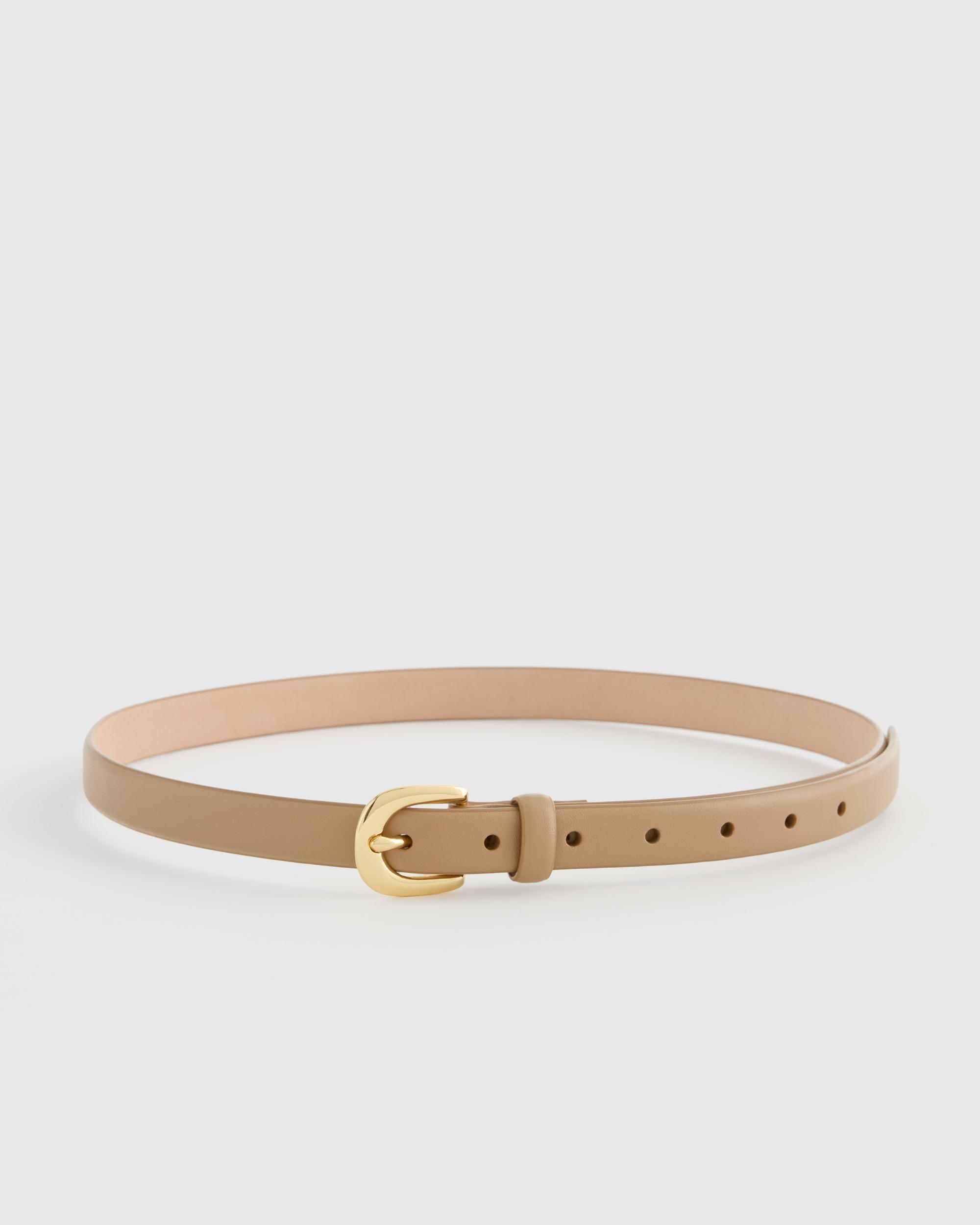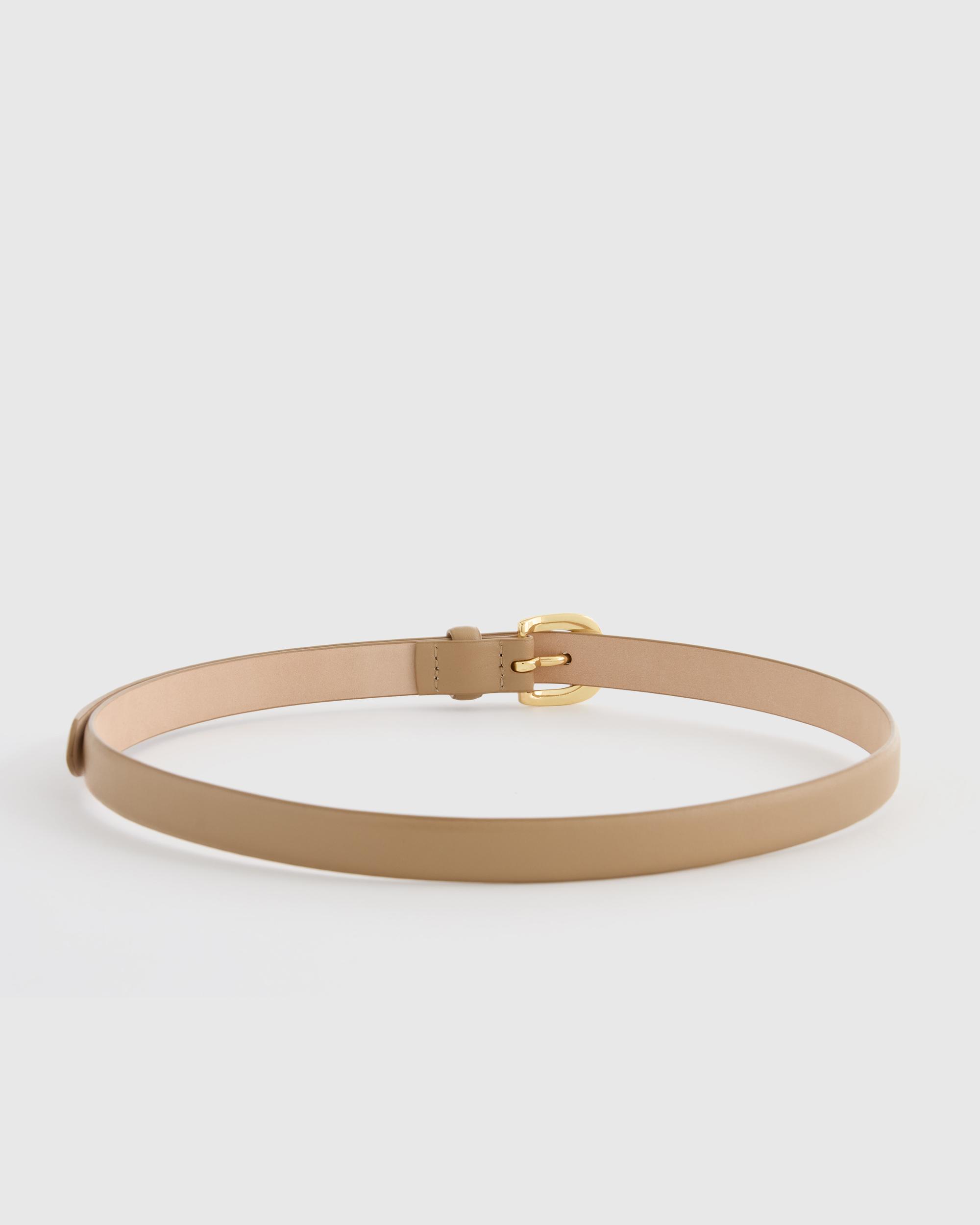 Introducing our Sofia European Leather Skinny Belt, a must-have wardrobe staple. Crafted from high-quality European leather and featuring a solid metal buckle, this belt is the perfect finishing touch to any look. Designed to be worn at either your waist or hips, this is the ultimate styling piece. | Quince | Women's Sofia European Leather Skinny Belt in Mushroom, Size Large