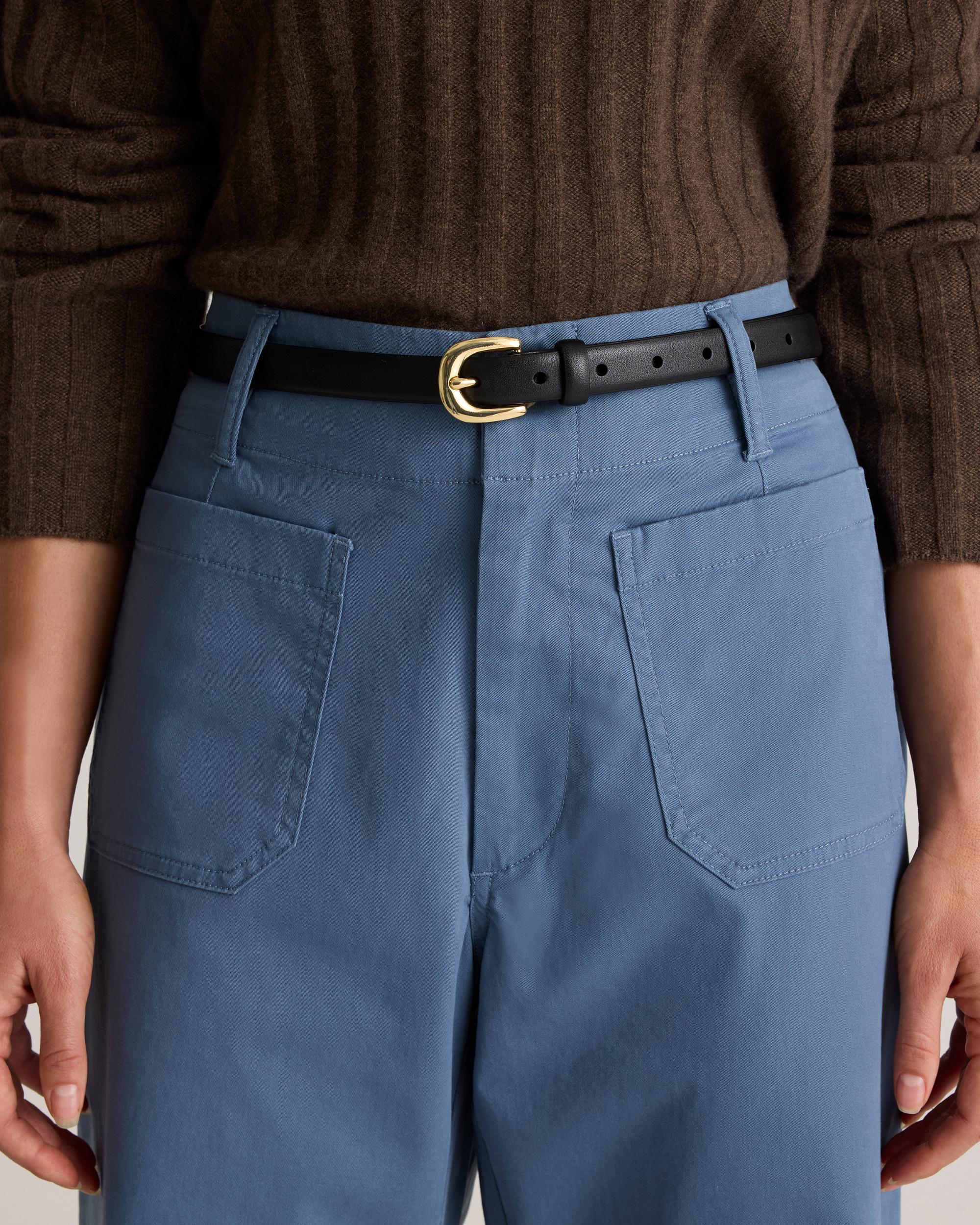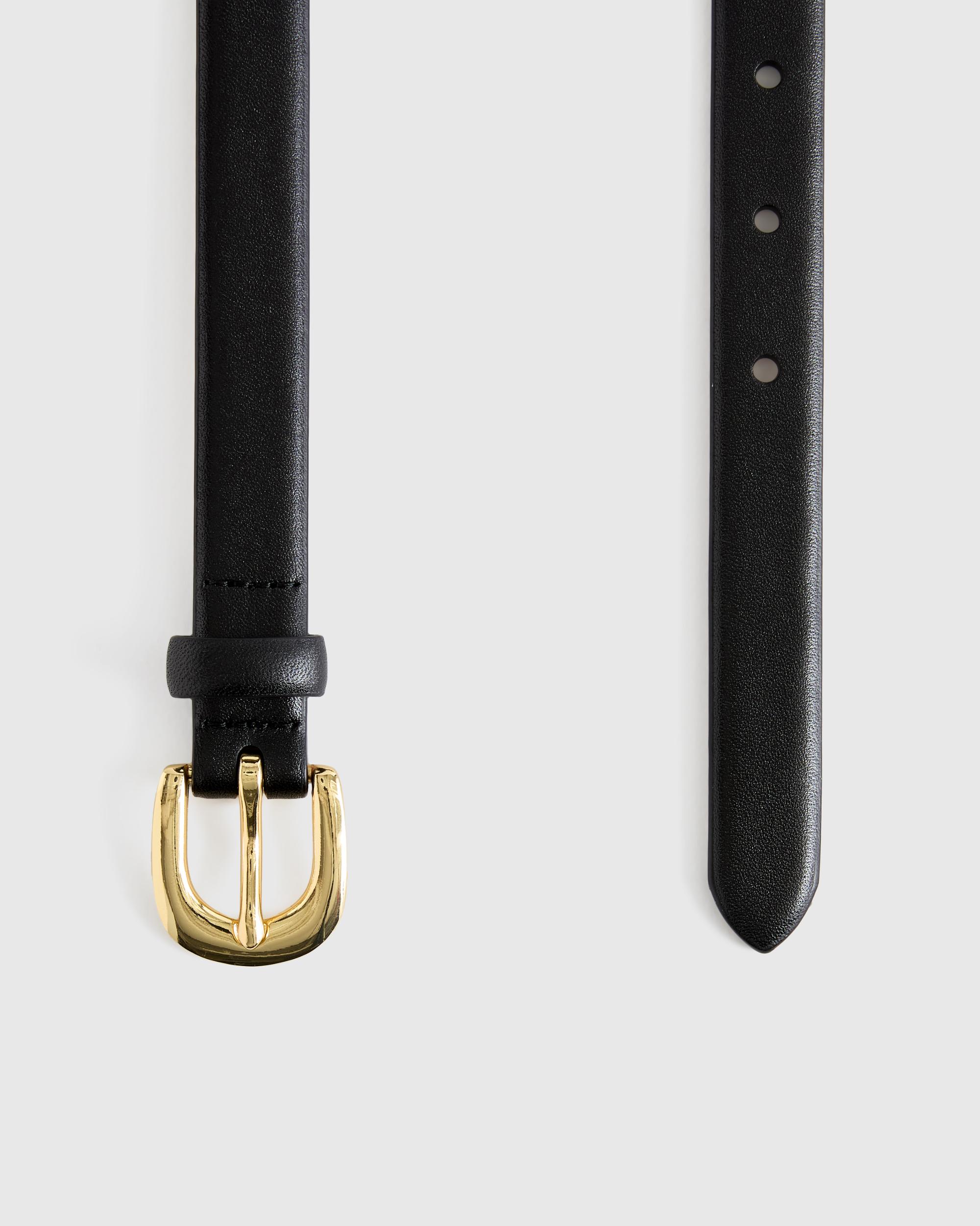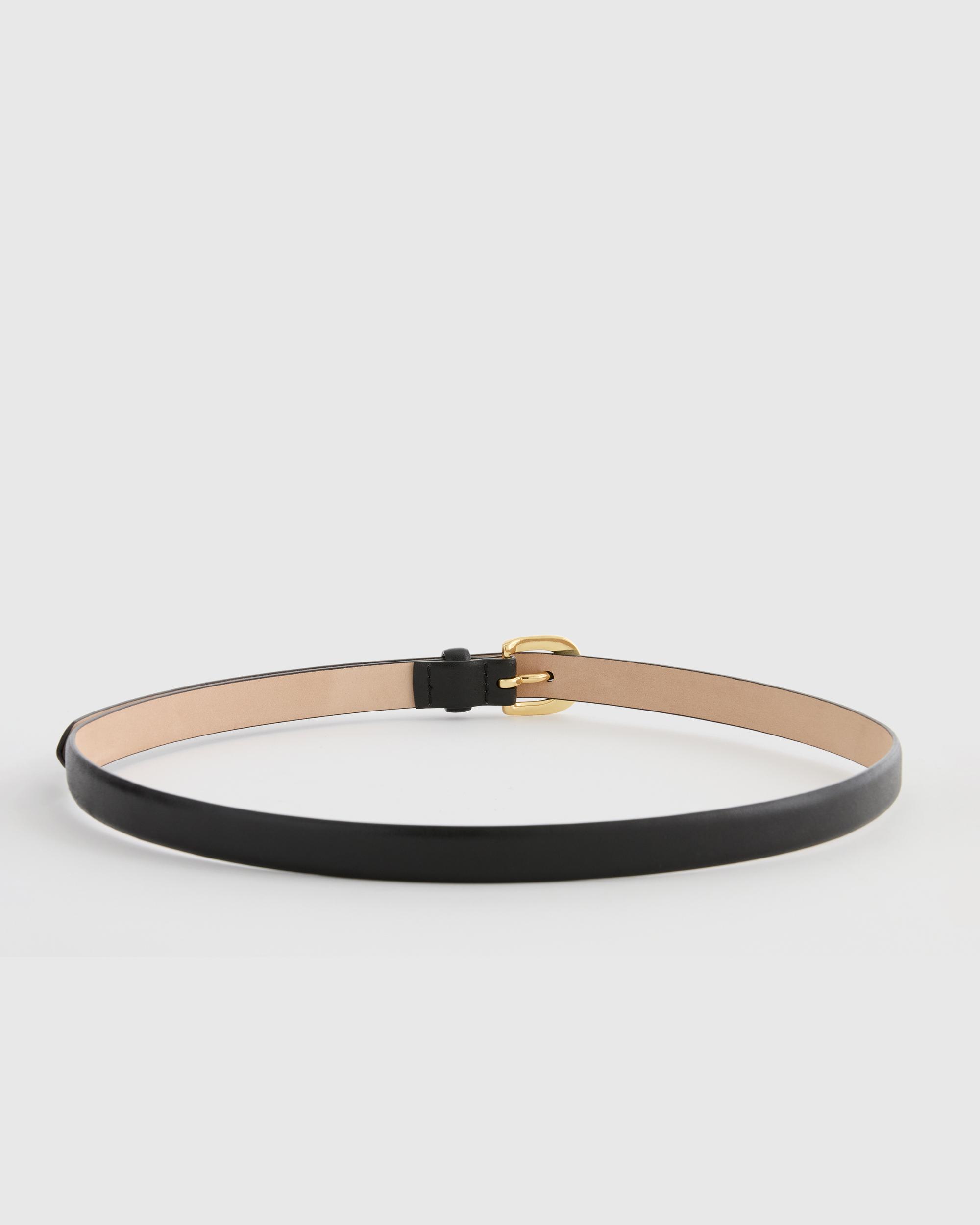Introducing our Sofia European Leather Skinny Belt, a must-have wardrobe staple. Crafted from high-quality European leather and featuring a solid metal buckle, this belt is the perfect finishing touch to any look. Designed to be worn at either your waist or hips, this is the ultimate styling piece. | Quince | Women's Sofia European Leather Skinny Belt in Black, Size Large