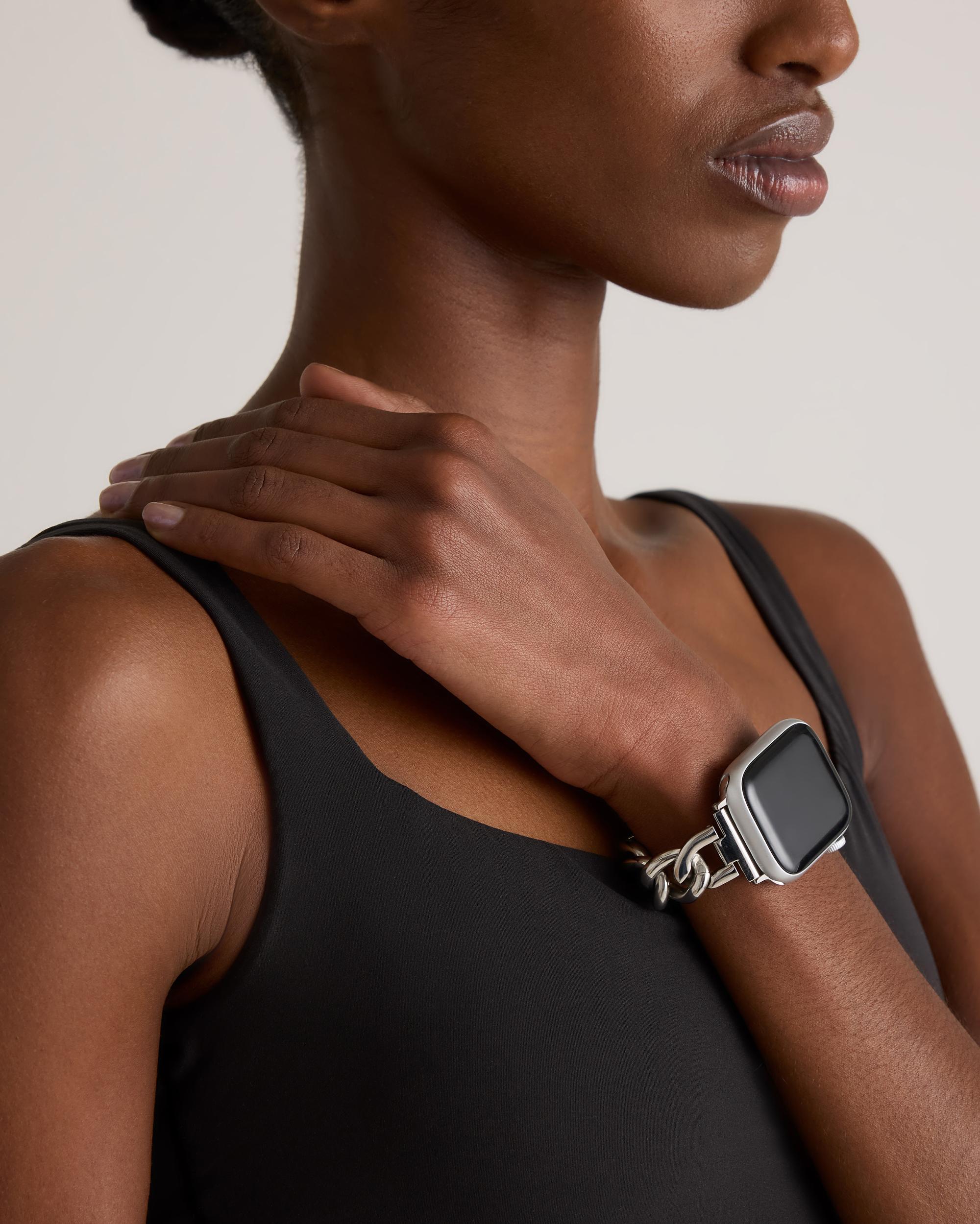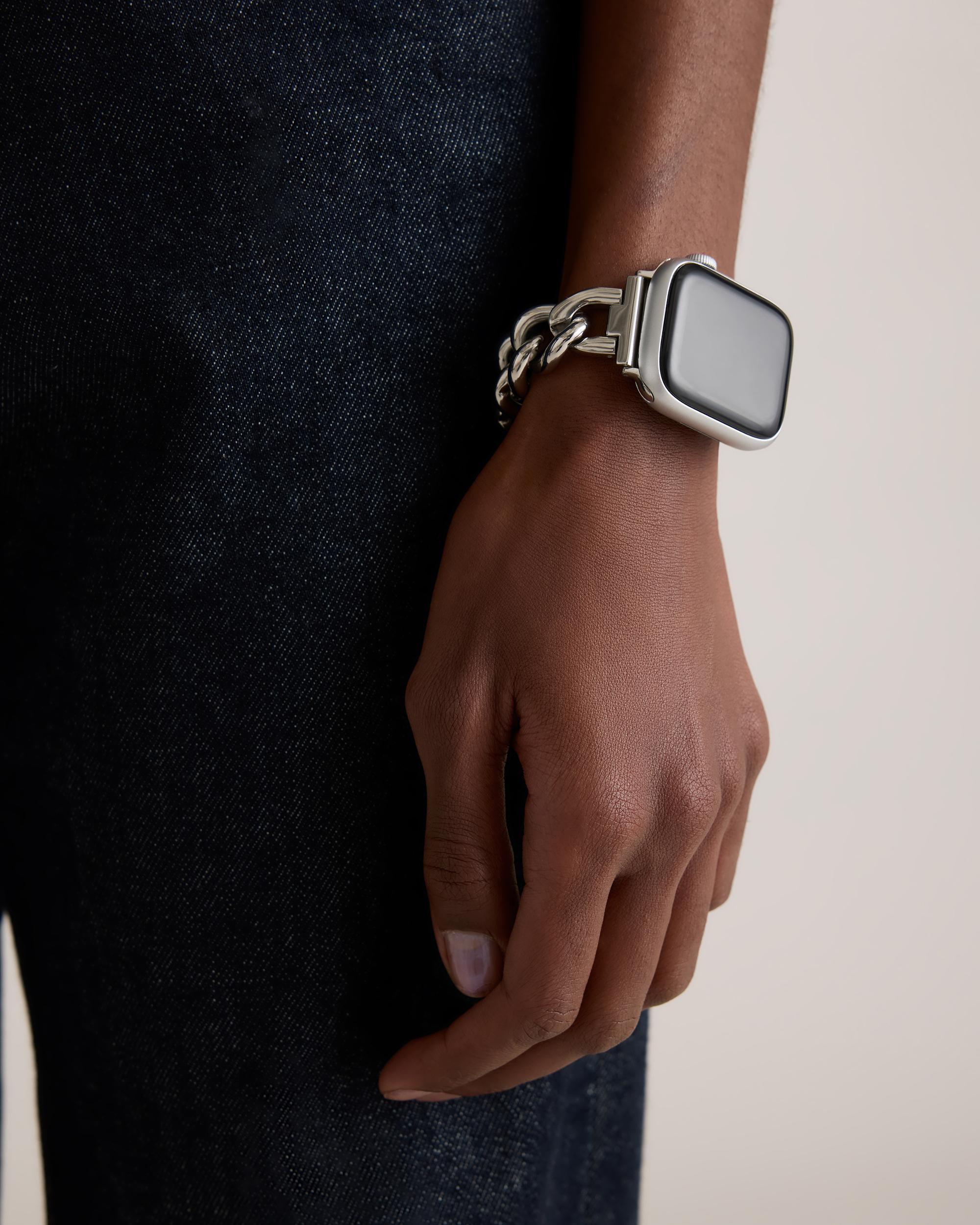 Give your smart watch a refresh with the Stainless Steel Bracelet Chain Apple Watch Band. Crafted from durable stainless steel for long-lasting wear, this band features four removable links that allow for an ideal fit with no extra tools required. This timeless watch band is a classic accessory, combining style and functionality for seamless all-day wear. | Quince | Women's Stainless Steel Bracelet Chain Apple Watch Band in Silver, Size 38mm 42mm, Size 38mm - 42mm