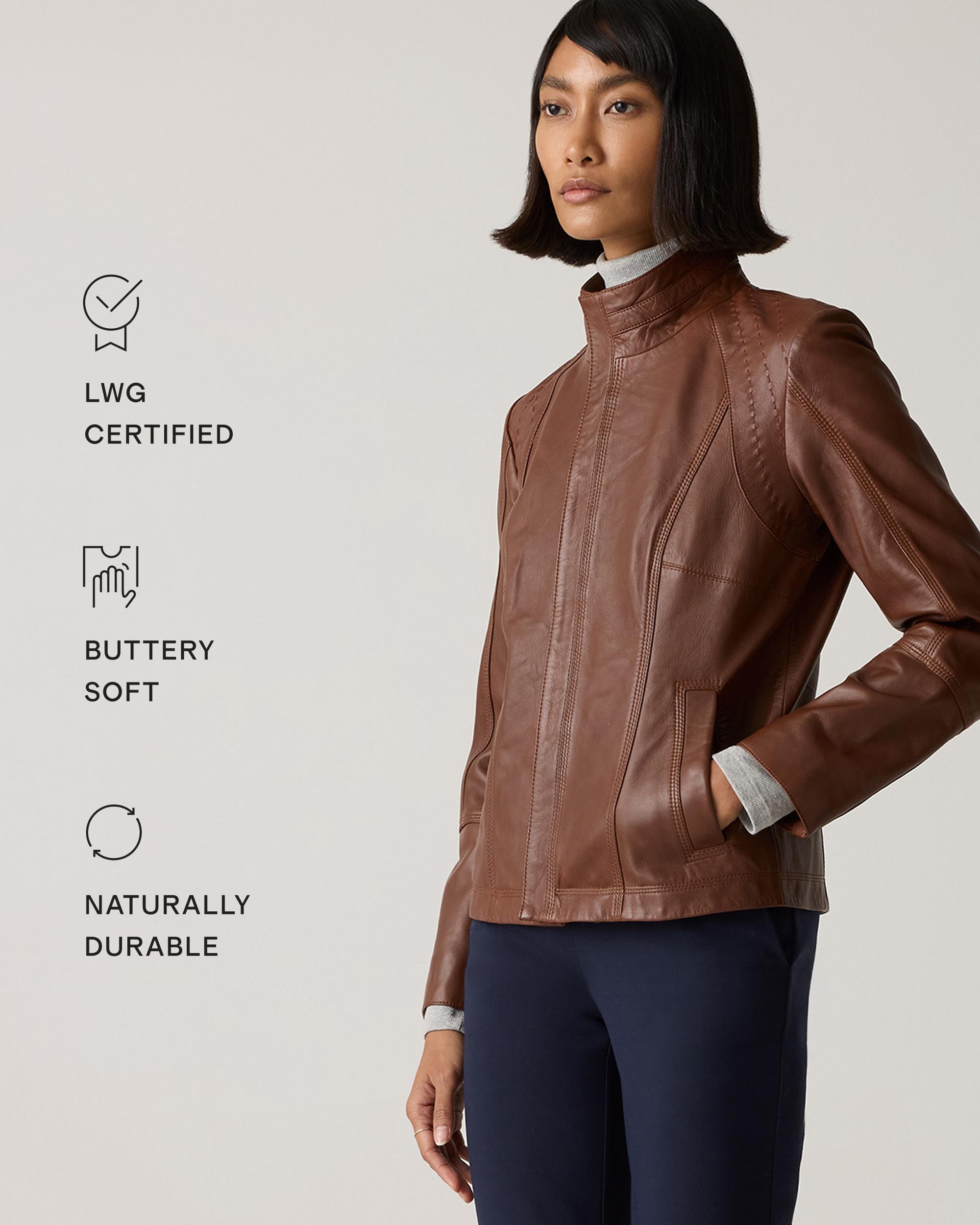 In a flattering fit and made from 100% top-grain leather, the Stand-Collar jacket is a timeless piece. With handy pockets and hidden front zip closure, this jacket is versatile and stylish for any type of event. Read more about what makes our leather special in our Leather 101 guide. | Quince | Women's Stand-Collar Jacket in Burnt Umber, Size XL, Leather
