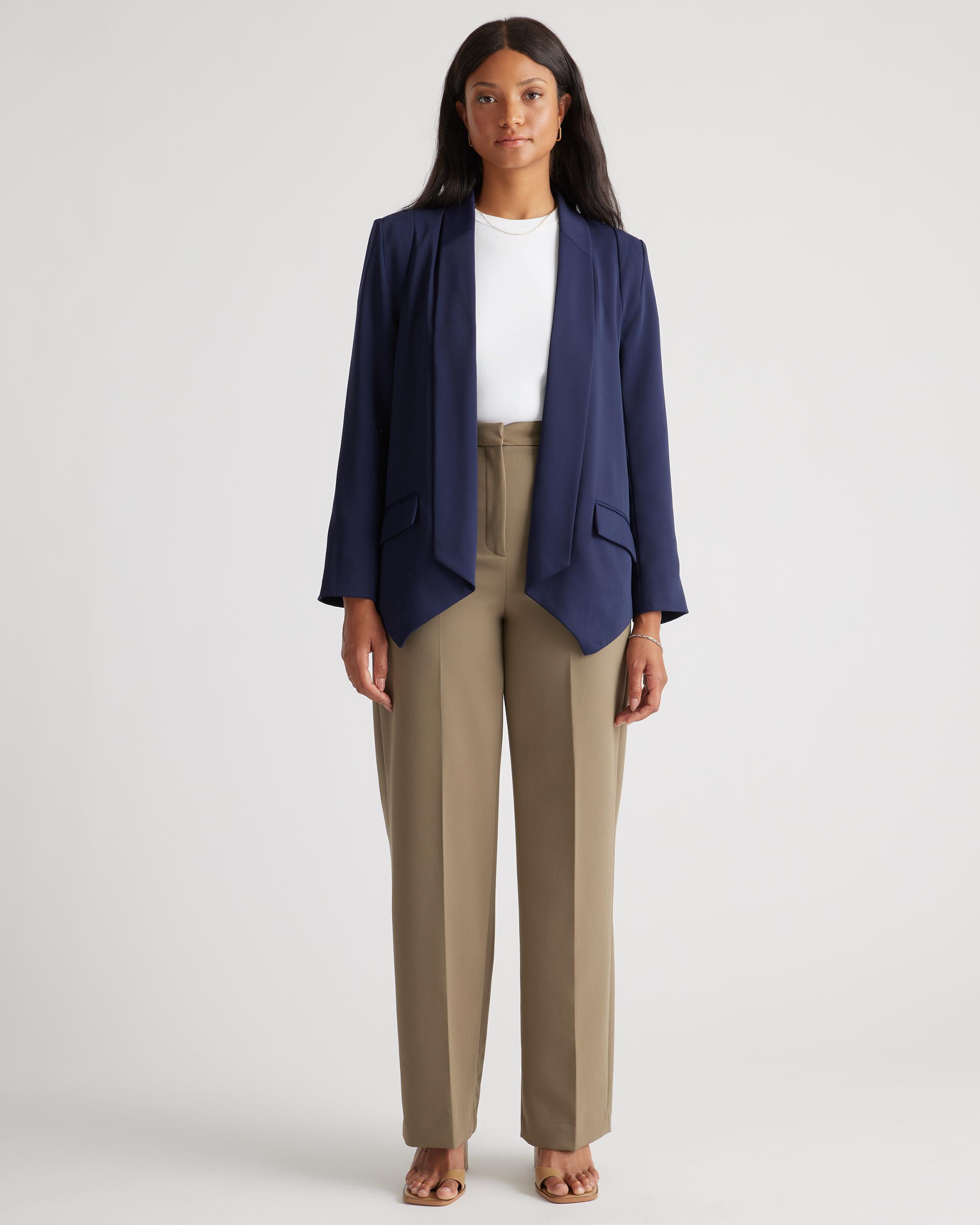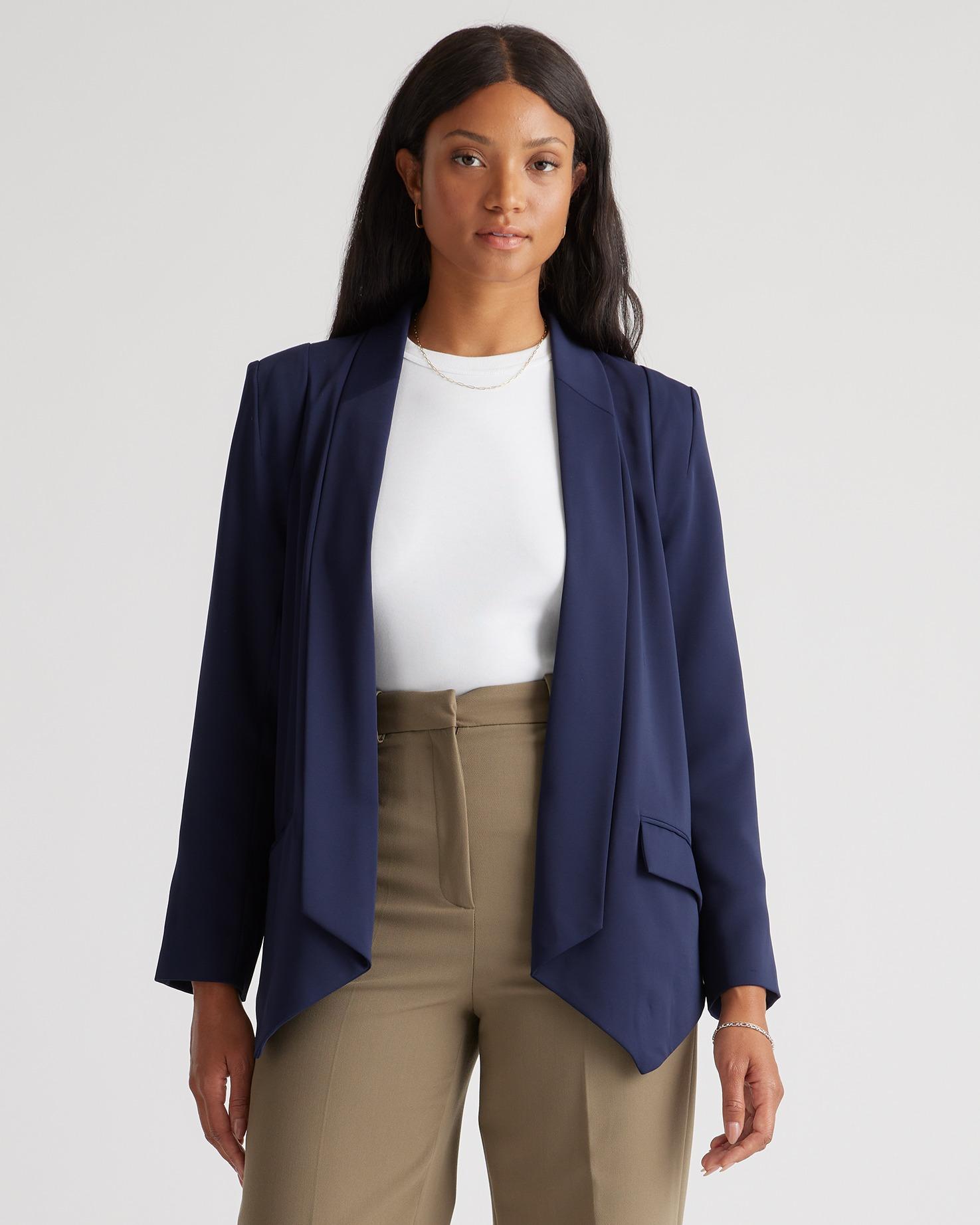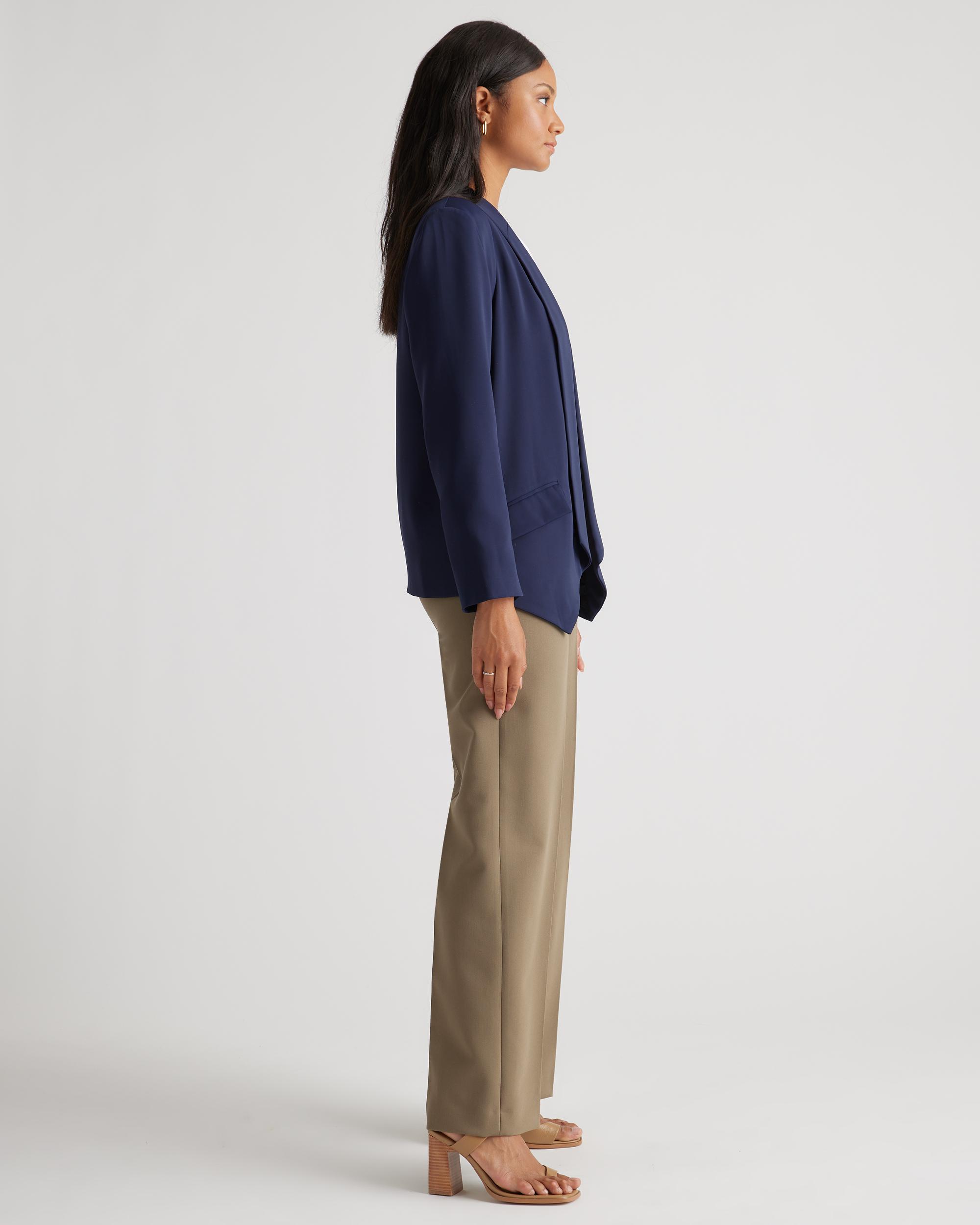 Layer up and level up in our open-front blazer. This drapey yet tailored blazer is a great way to add a little polish to any look and, best part, it won't wrinkle. Plus, it's made from recycled yarn, so you can feel and look good wearing it. | Quince | Women's Stretch Crepe Open Blazer in Navy, Size XS, Recycled Polyester