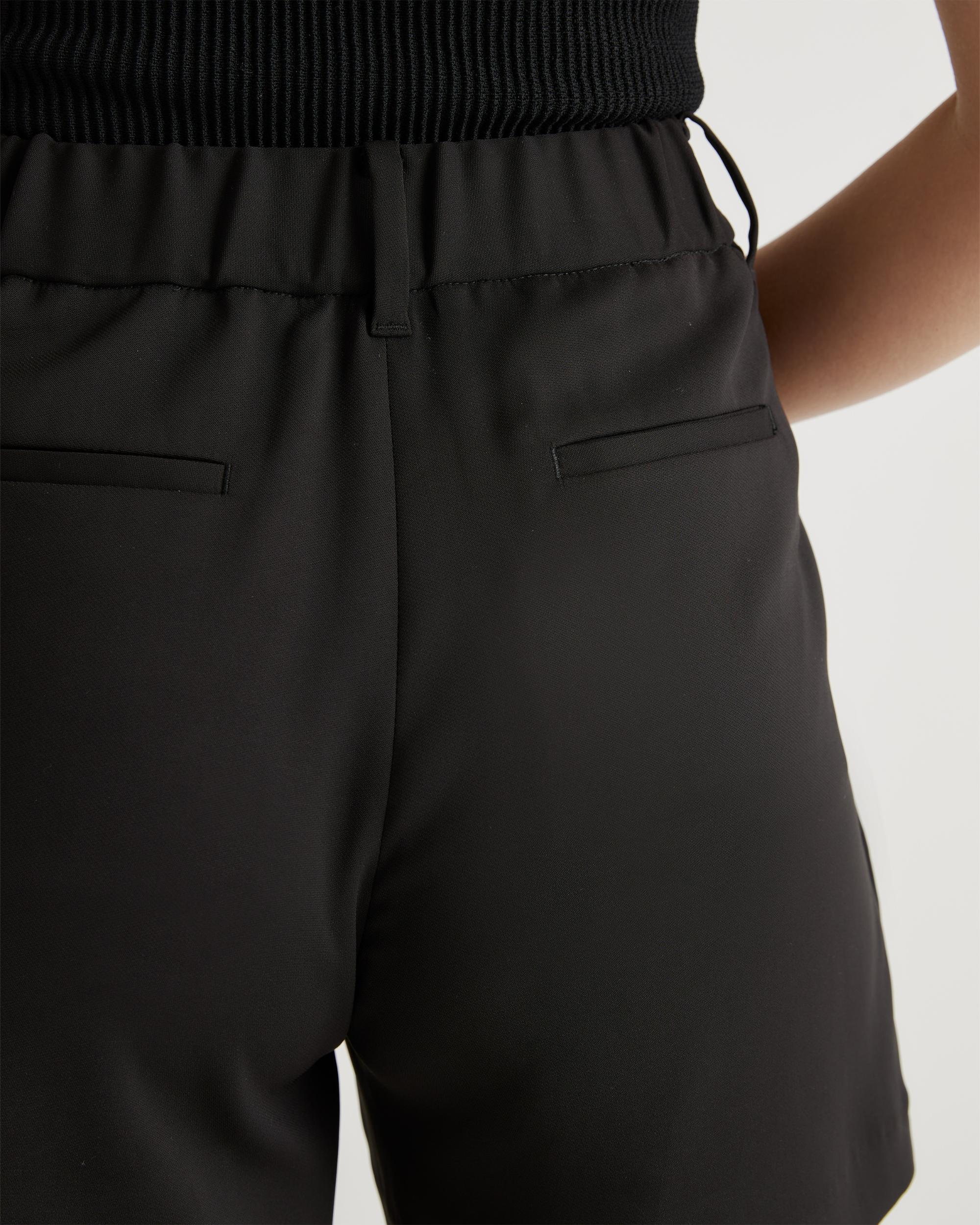Elevate your style with our eco-friendly Stretch Crepe Pleated Short. Made with recycled stretch crepe fabric, these shorts offer a comfortable and flattering fit. The elegant pleated design adds sophistication and the wrinkle resistant fabric ensures you always look your best. Perfect for any occasion, these versatile shorts can be dressed up or down, making them a timeless addition to your wardrobe. | Quince | Women's Stretch Crepe Pleated Shorts in Black, Size 6, Recycled Polyester