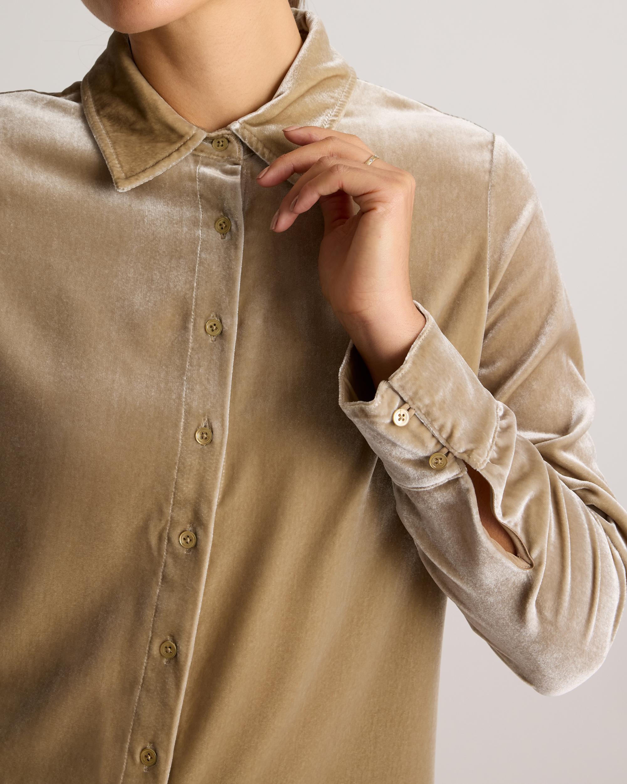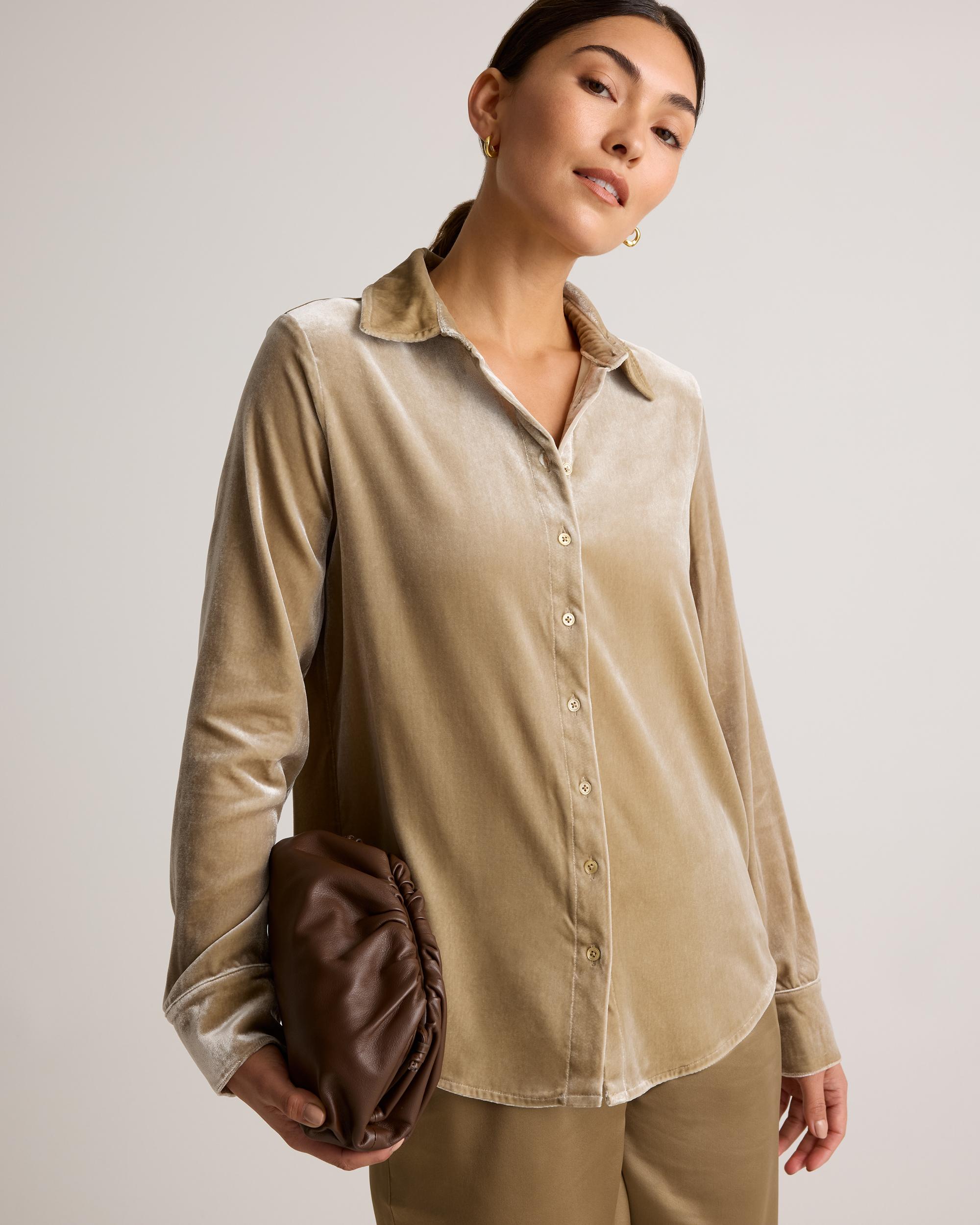 Our Stretch Silk Velvet Long Sleeve Shirt is perfect for special occasions or a polished everyday look. Crafted from a blend of rich silk and soft velvet with a hint of stretch, this shirt drapes beautifully and moves with you for all-day wearability. The lustrous velvet finish gives luxury, while the classic button-down design offers versatility for dressing up or down. | Quince | Women's Stretch Silk Velvet Long Sleeve Shirt in Dogwood, Size Large