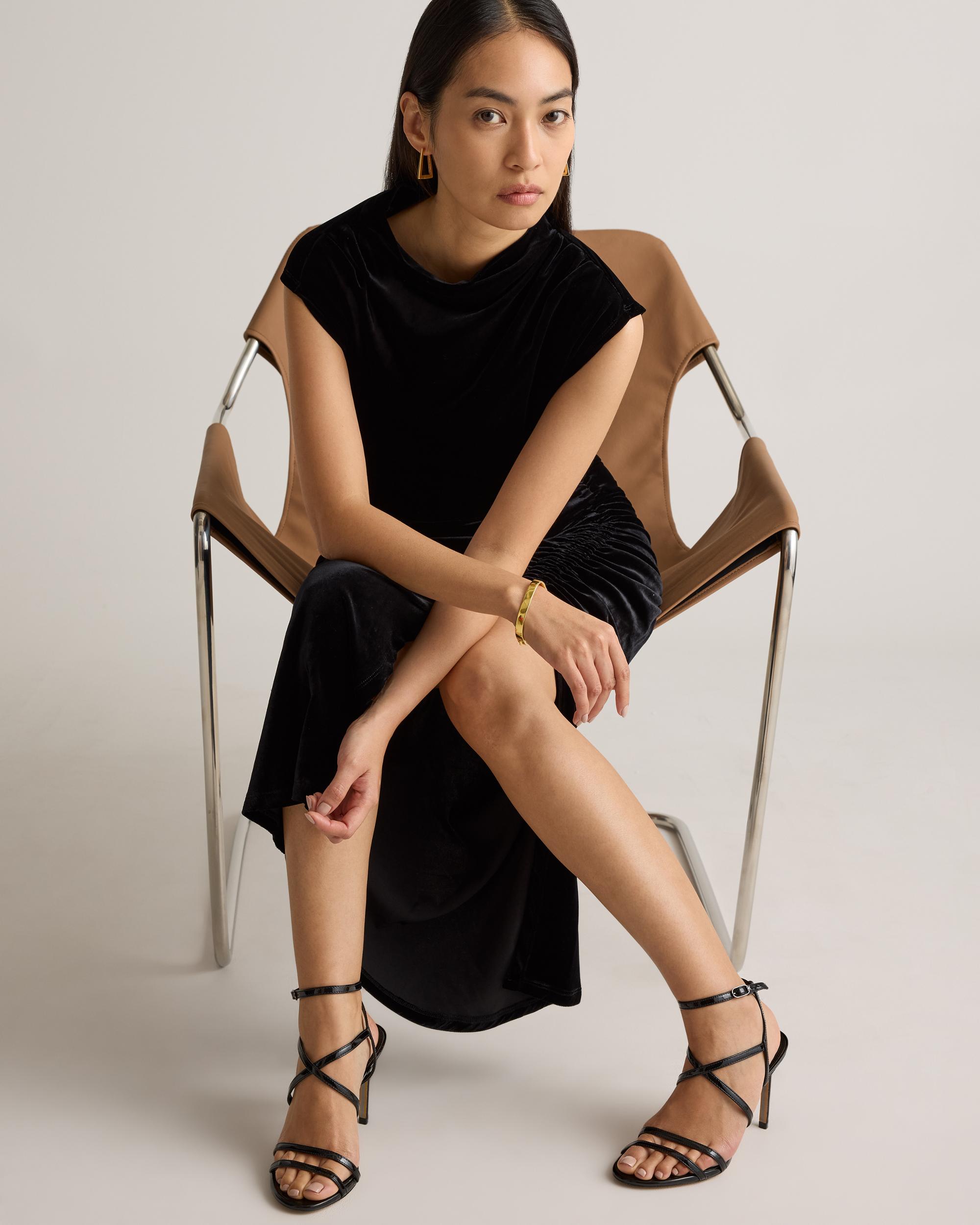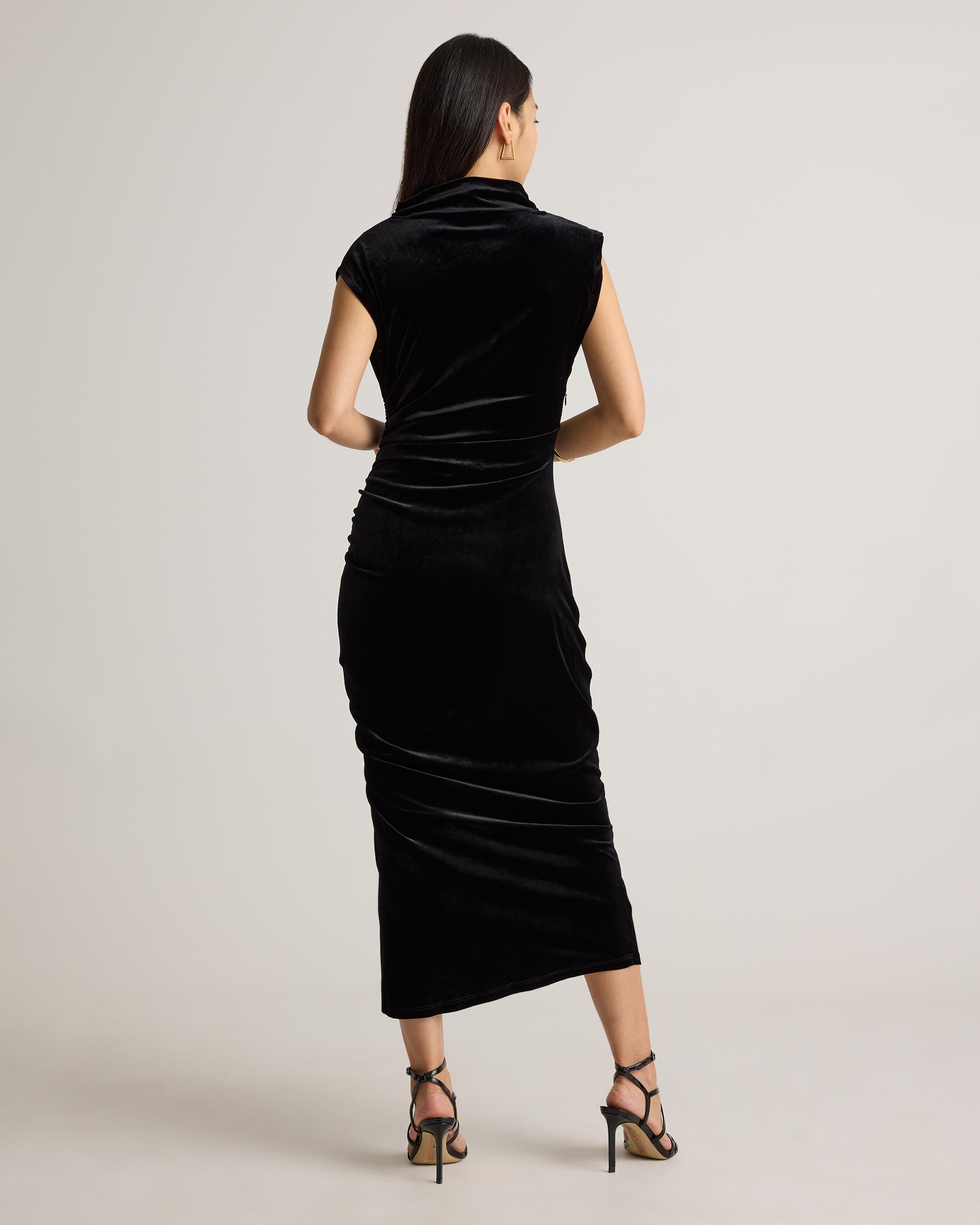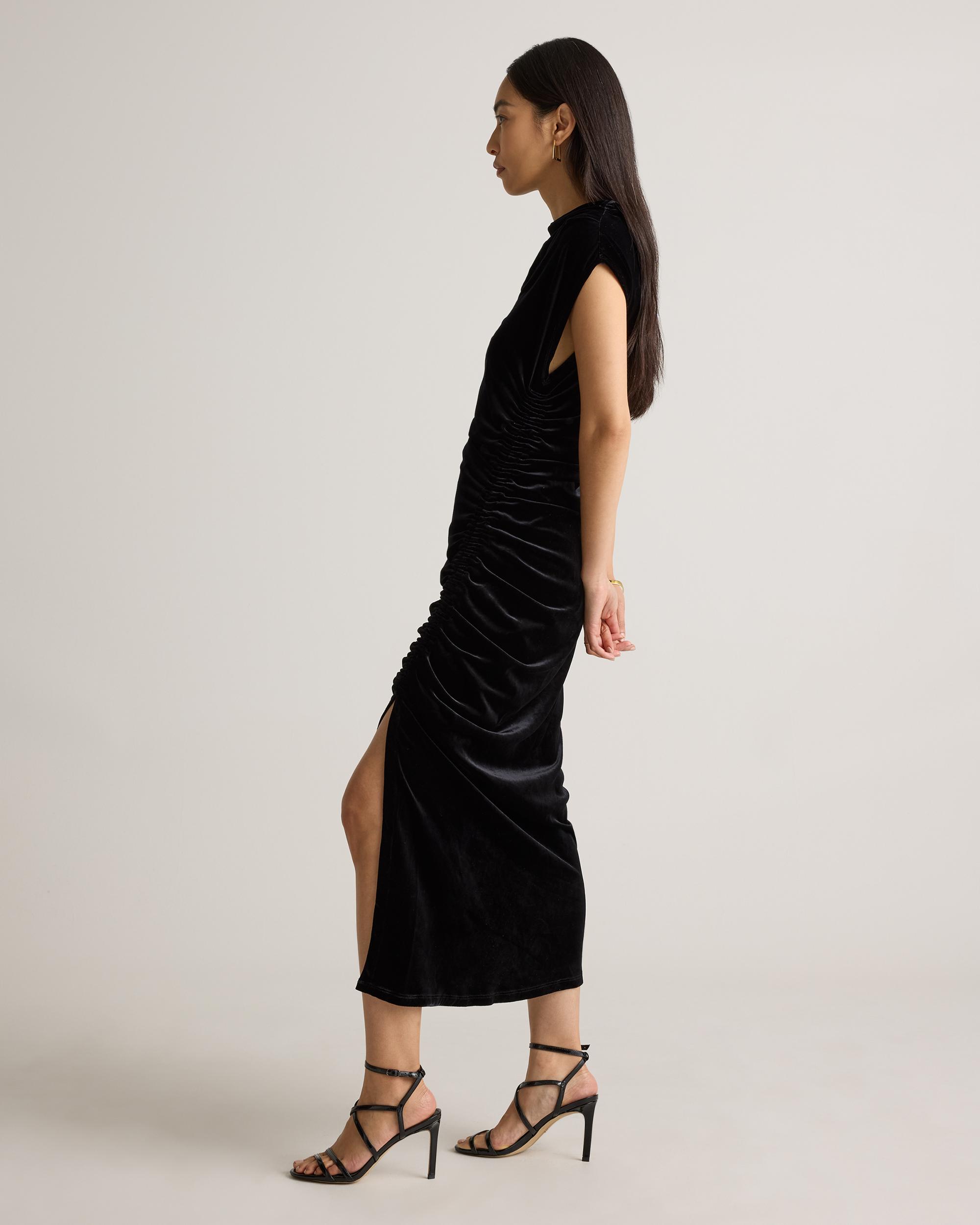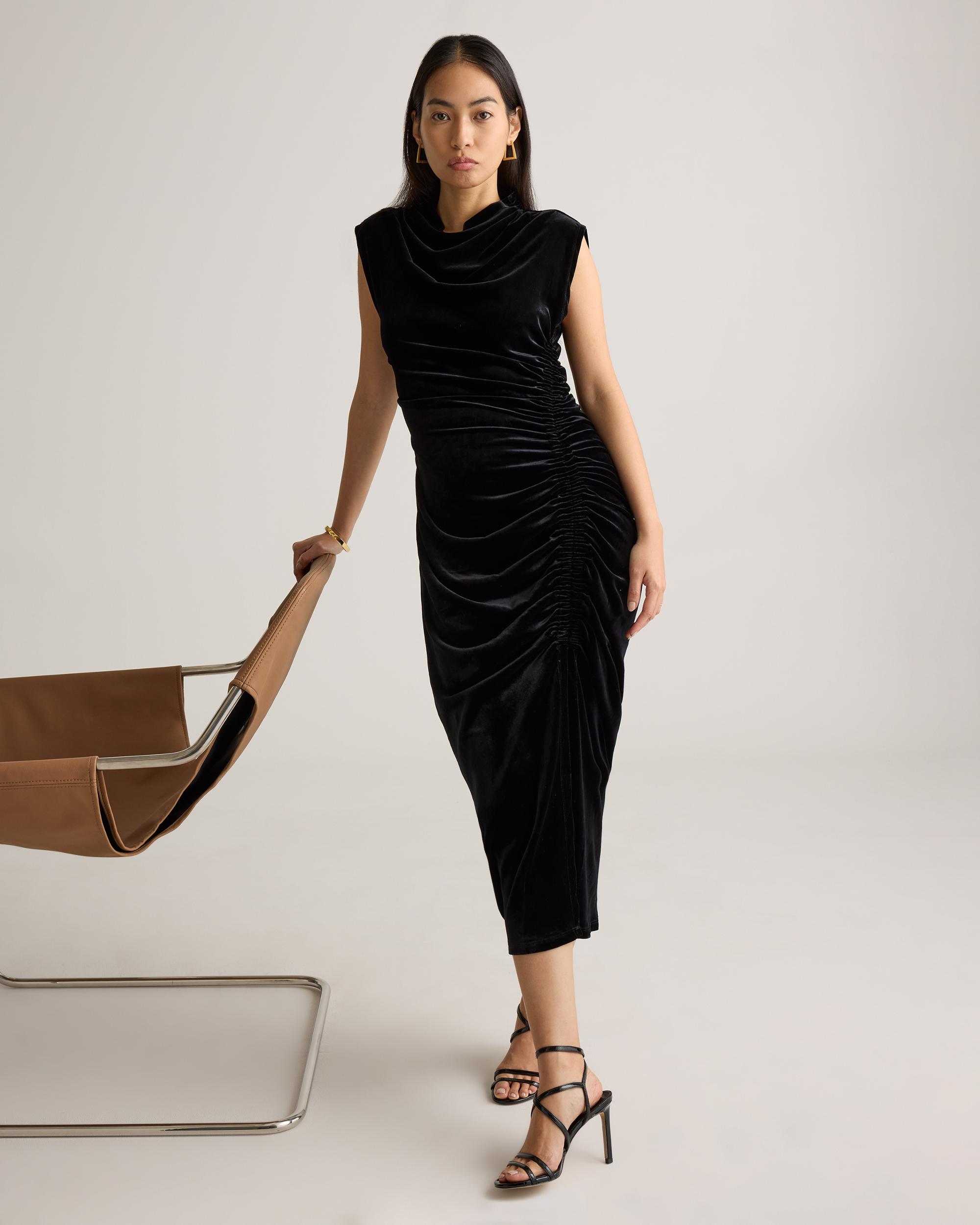 Celebrate in style with our Stretch Silk Velvet Ruched Midi Dress. This luxe piece features our super soft silk velvet fabric with a hint of stretch for the perfect blend of chic comfort. Designed with a cowl neckline and ruched detailing, this dress is giving classic glamour. Wear it to your next holiday party or night on the town. | Quince | Women's Stretch Silk Velvet Ruched Midi Dress in Black, Size XL