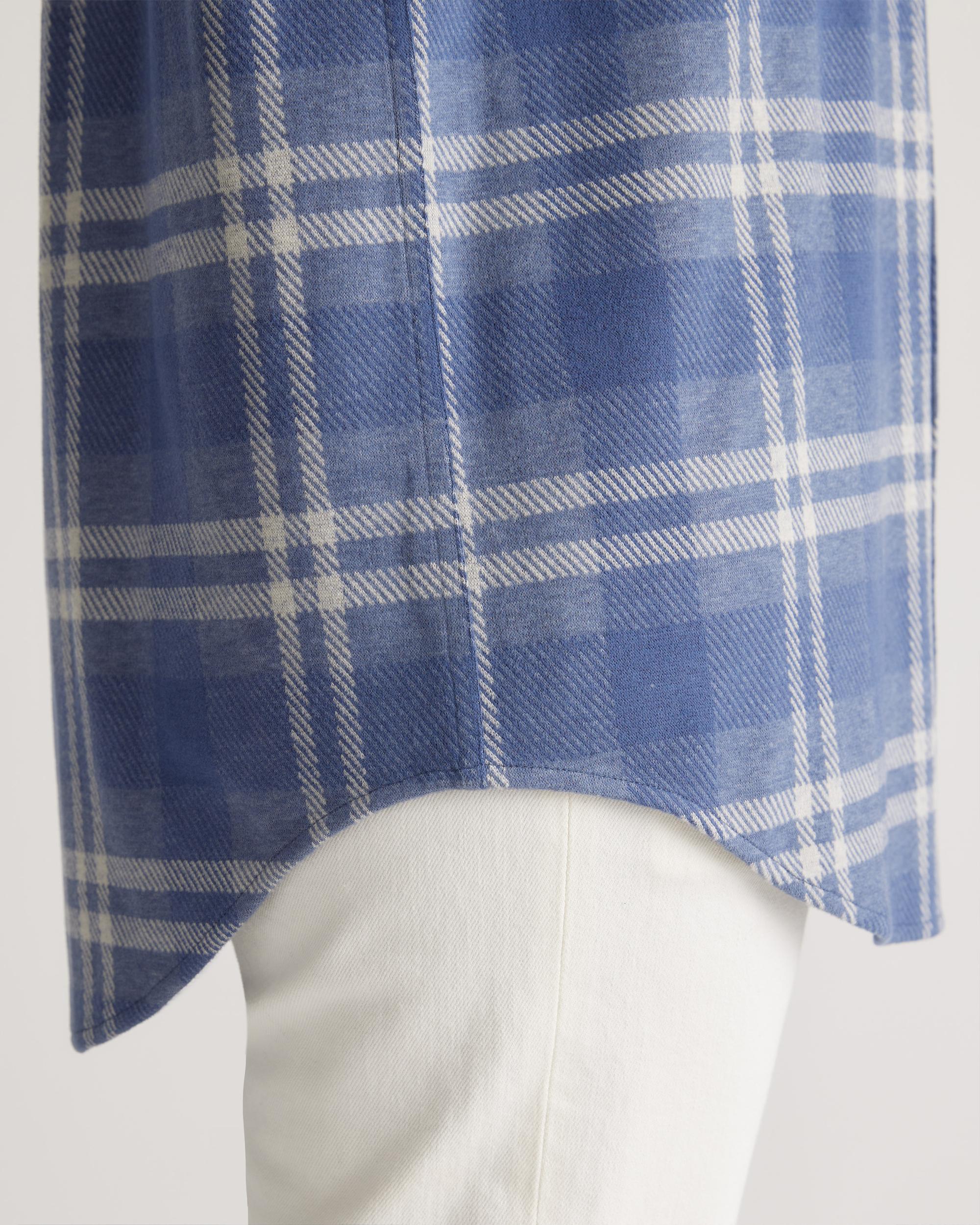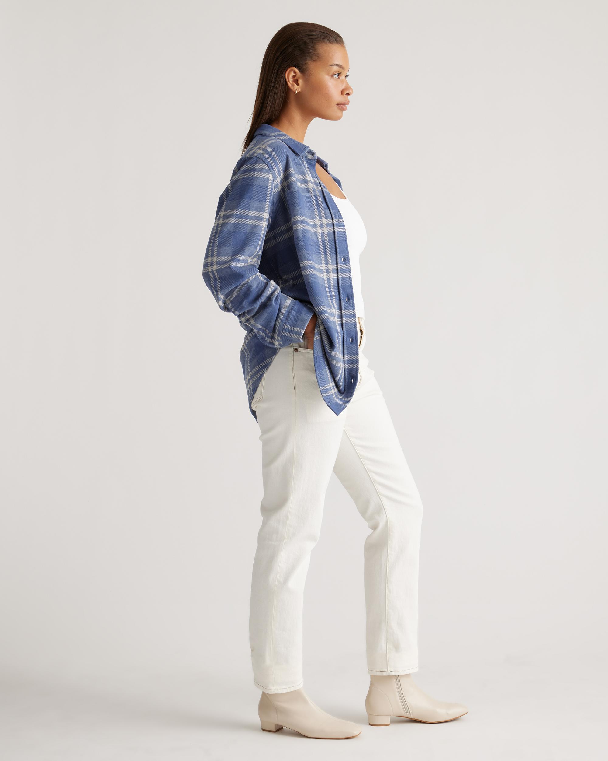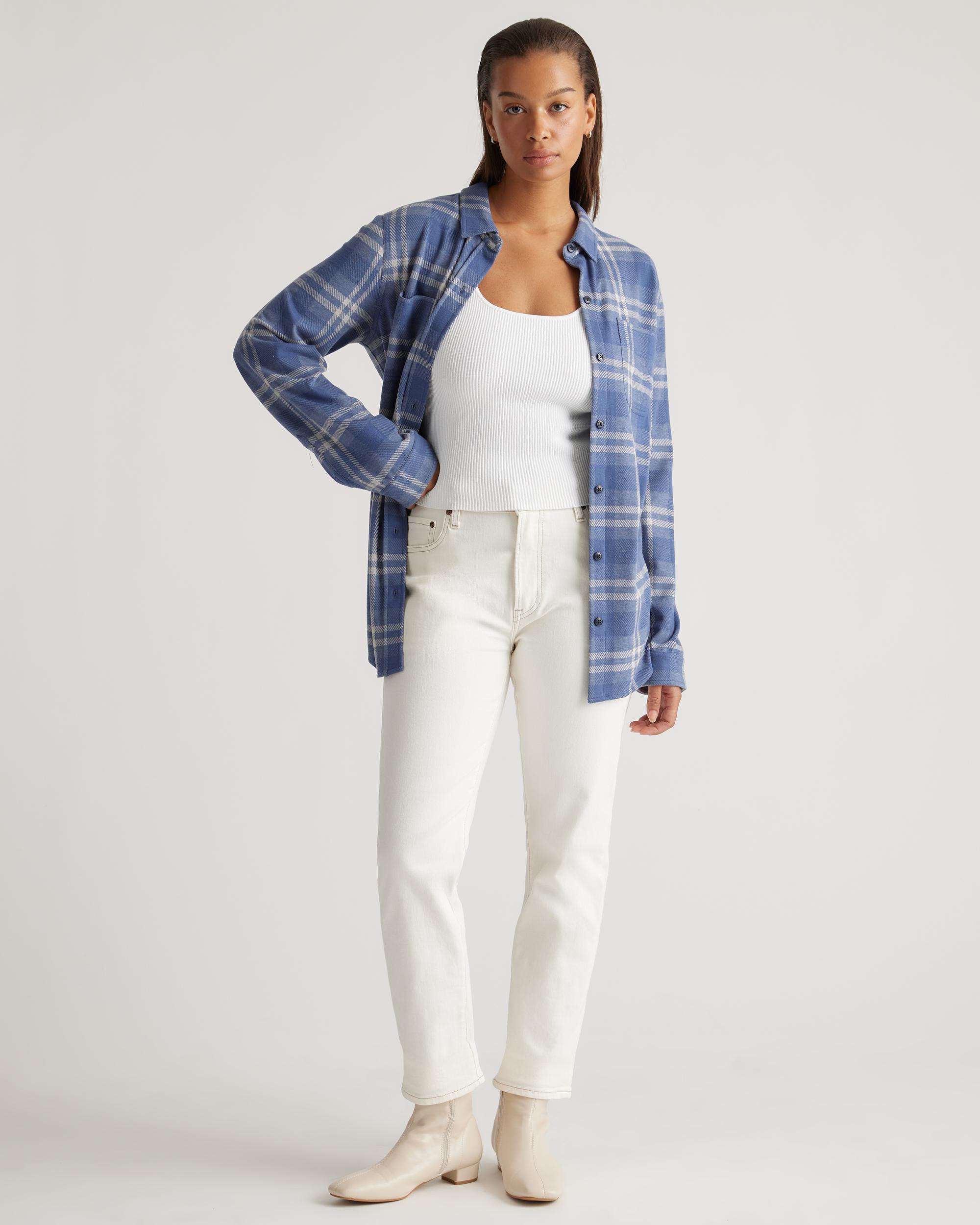 In neutrals or plaids, this shirt has a classic, versatile knit look. It's the perfect layering shirt and we can't get enough of it. Made with super soft and stretchy fabric for comfort in the relaxed fit, you can throw this on with anything for a casual-chic style. | Quince | Women's Stretch Sweater Fleece Shirt in Indigo Check, Size Medium, Recycled Polyester