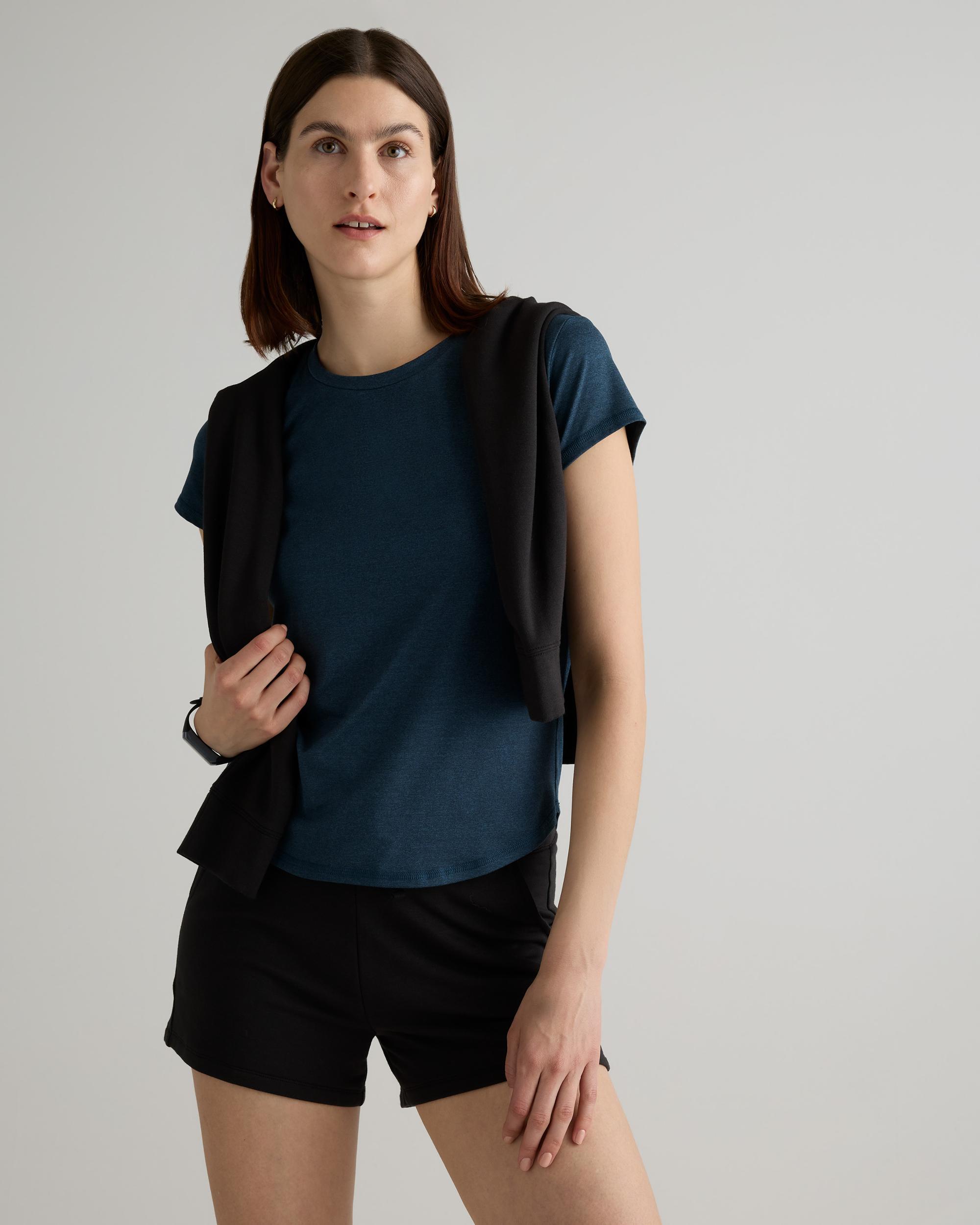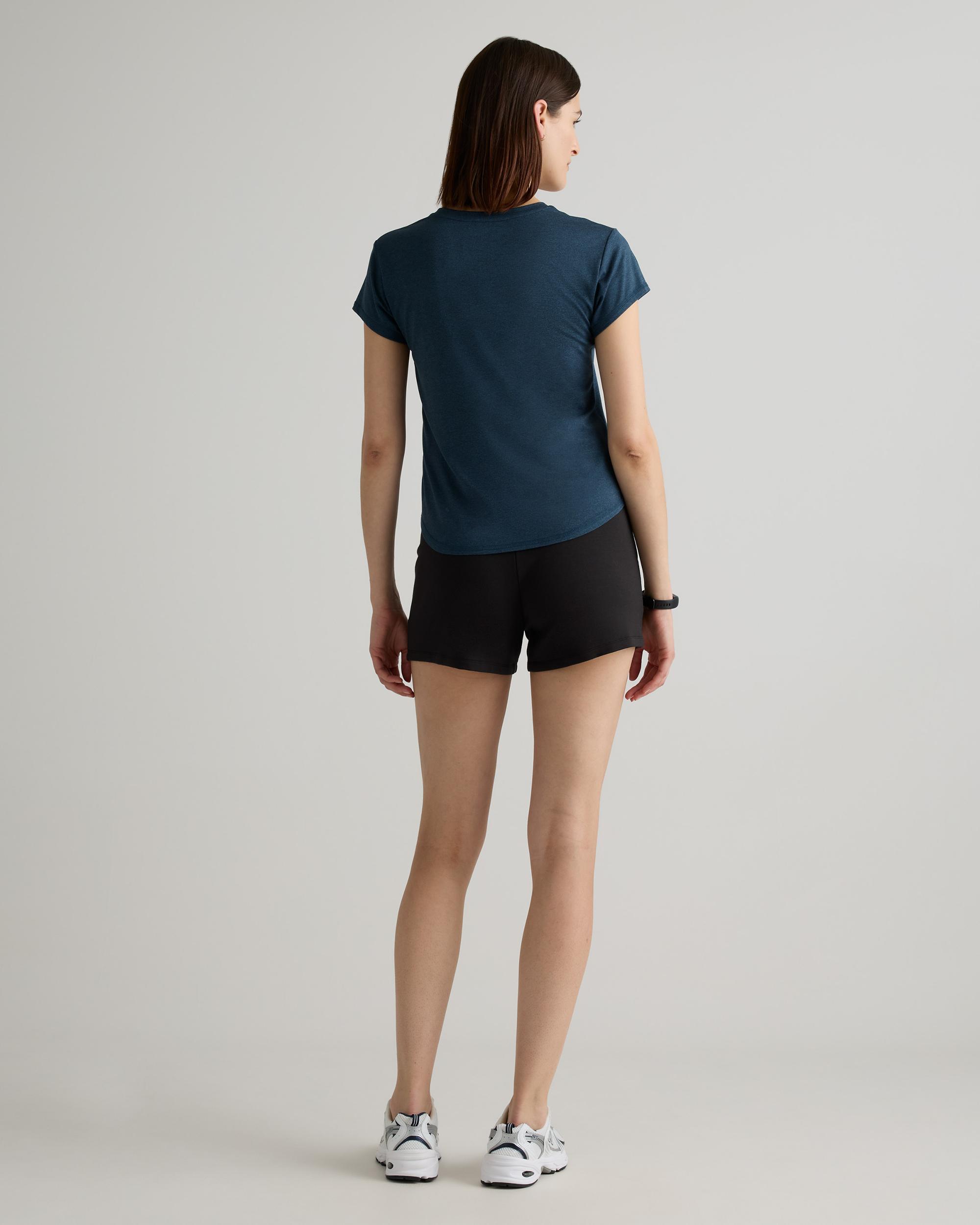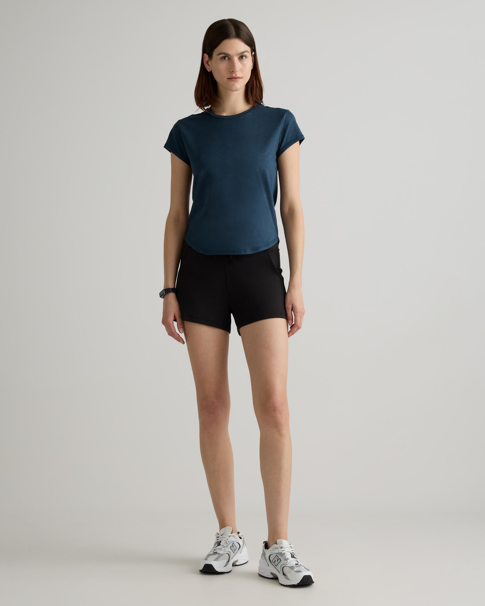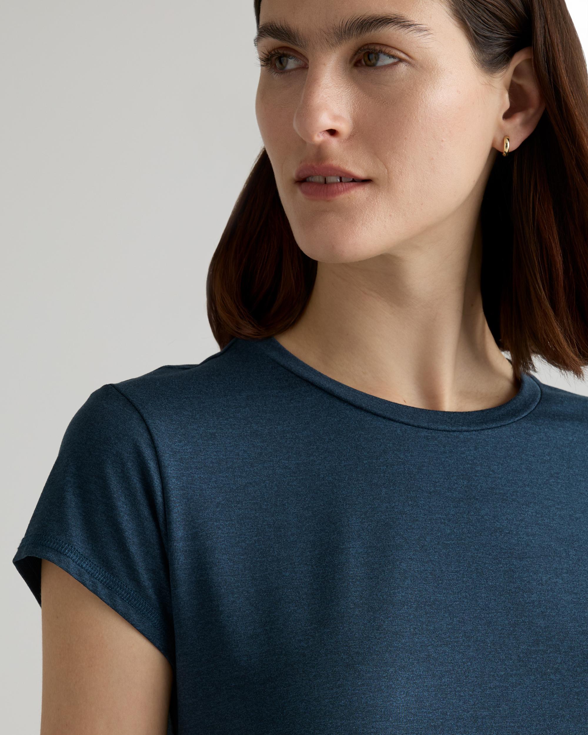 The ultimate do-everything tee, in a crew neck. Perfect for running, yoga, travel, or lounging, our lightweight Flowknit Breeze fabric is jam-packed with performance features like moisture wicking and anti-odor. Built for next-level comfort, even for everyday wear. Our Flowknit Breeze is made from Global Recycle Standard poly yarn, which diverts and recycles plastics destined for landfill or the ocean, so you can feel and look good in what you wear. | Quince | Women's Super Soft Performance T-Shirt in Navy, Flowknit Activewear, Size XS, 100% Polyester
