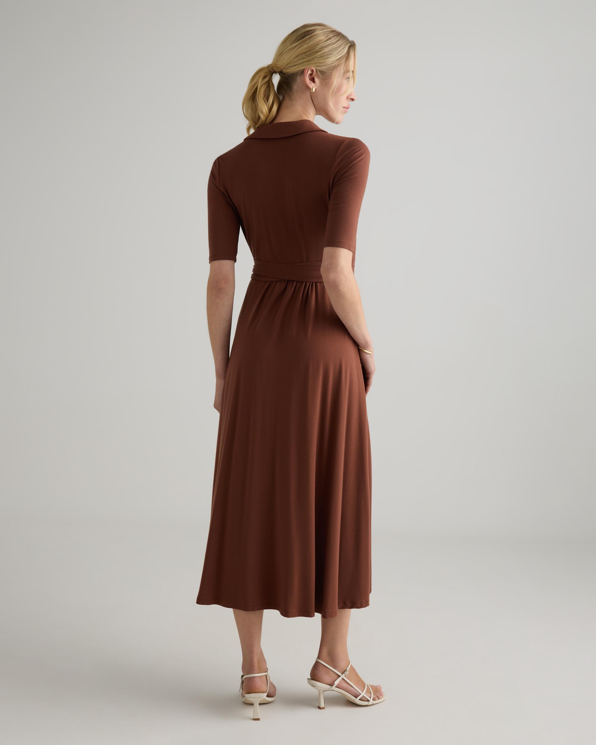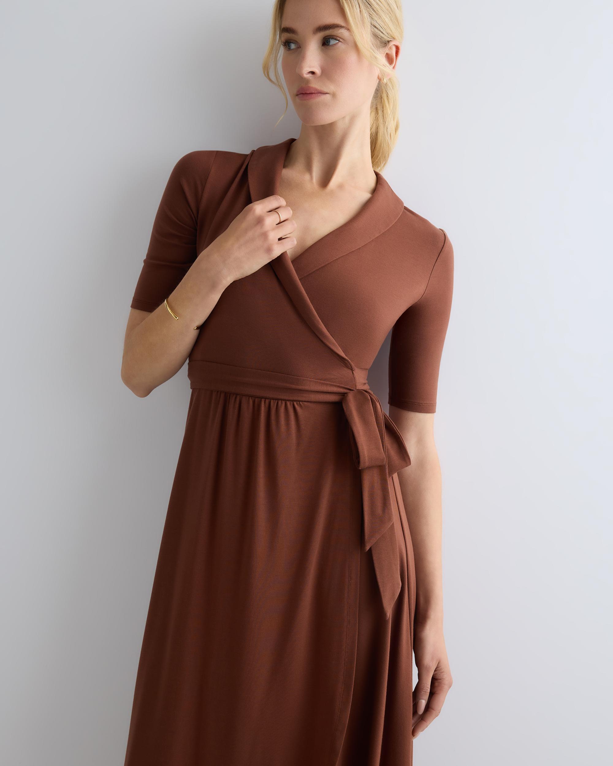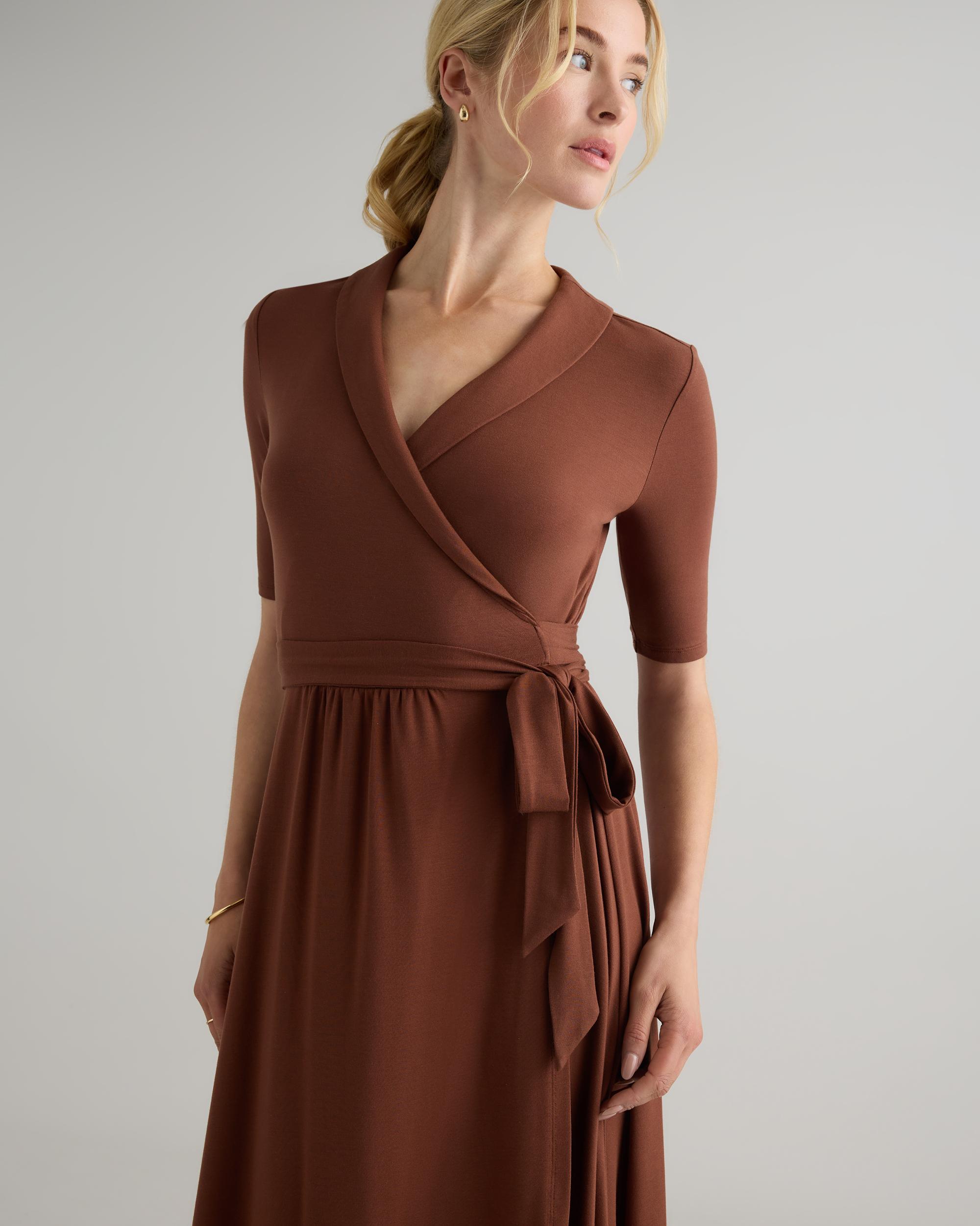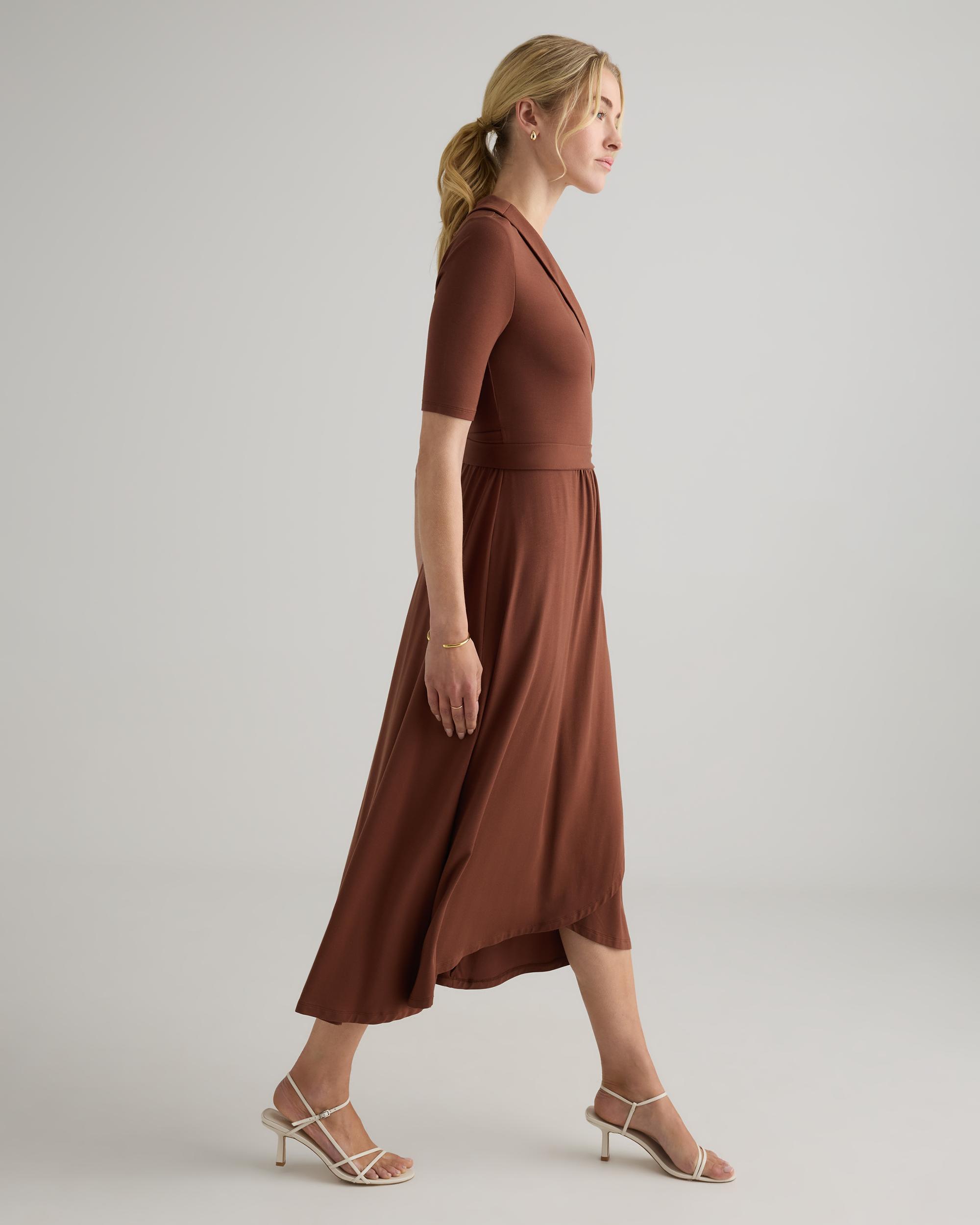 Fitted where you want it, flowy where it feels good. Our Tencel Jersey Midi Wrap Dress is the timeless classic everyone needs in their lineup. Eco-cool and all-day comfy with a rounded collar and modern midi length, it’s as soft as it is sustainable, and it’s part of our growing knit-dress collection. Also offered in sizes 1X-3X. | Quince | Women's Tencel Jersey Midi Wrap Dress in Brown, Size Medium