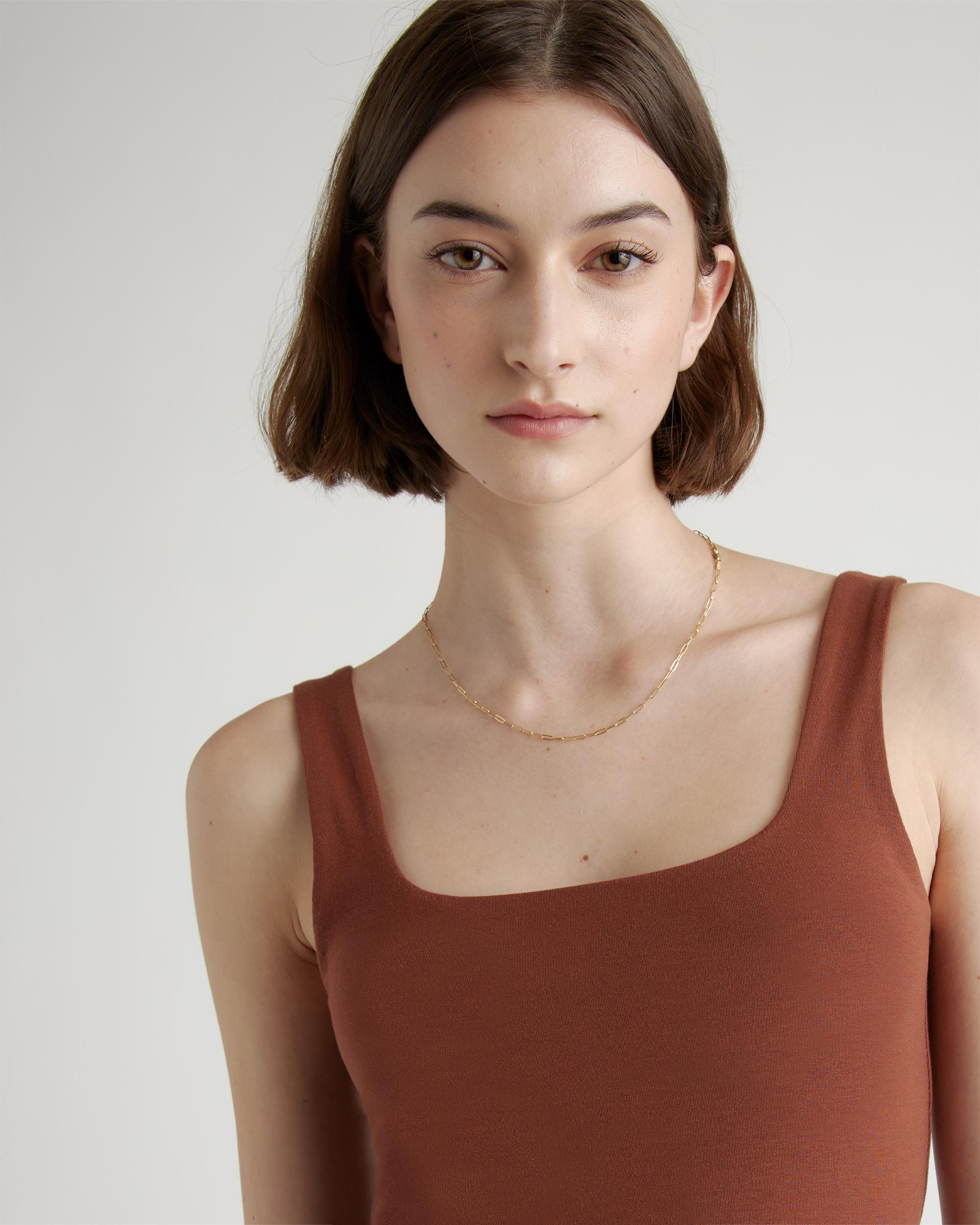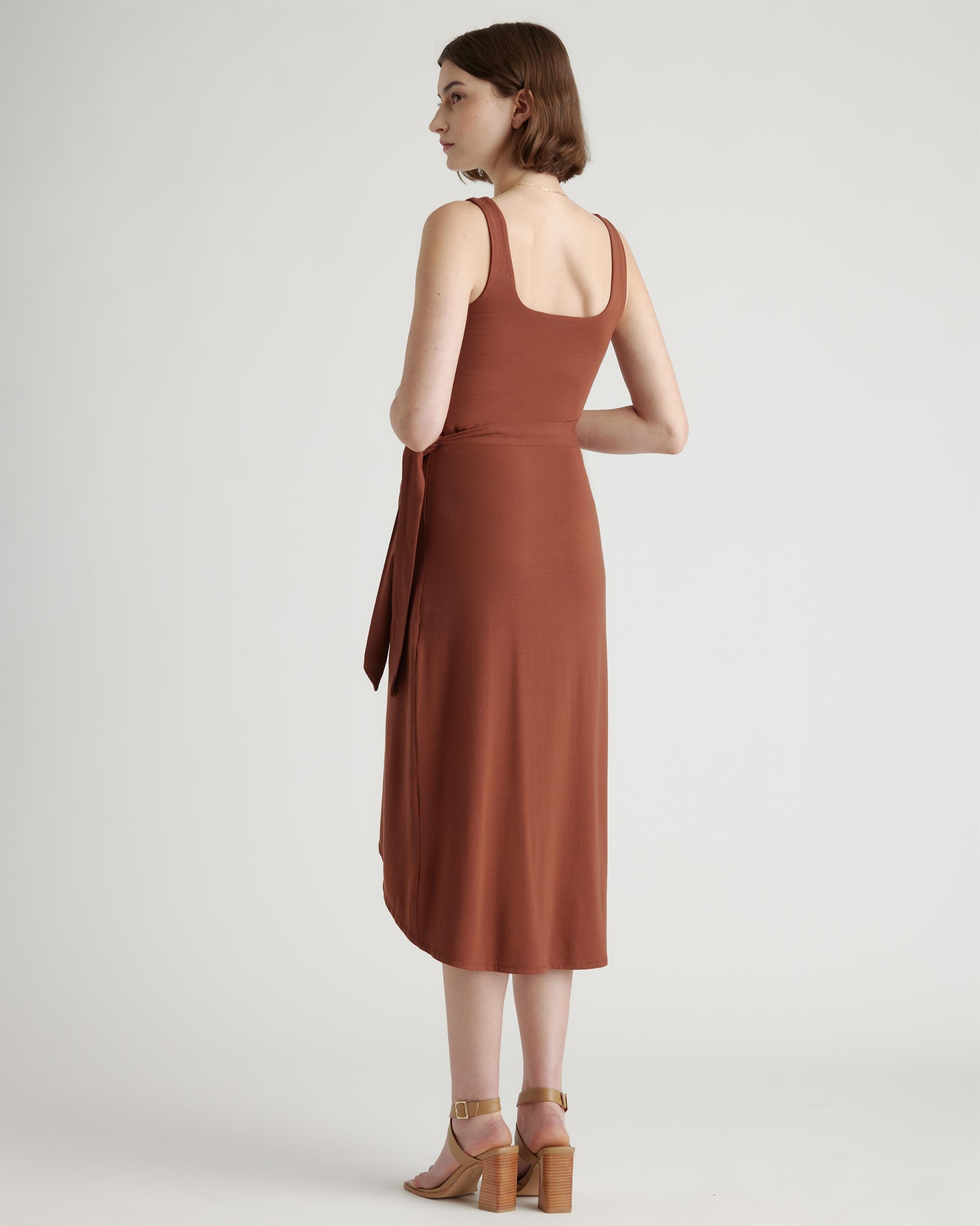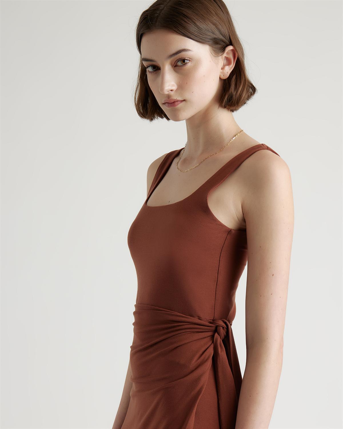 Upgrade your wardrobe with the Tencel Jersey Side Tie Dress, a luxurious and versatile piece that will make you feel confident and elegant for any occasion. Made from premium Tencel fabric, this dress offers a silky smooth texture that drapes beautifully over your curves. Simply pair it with your favorite sandals or heels and accessories for a complete look that's both comfortable and chic. | Quince | Women's Tencel Jersey Side Tie Midi Dress in Brown, Size Small