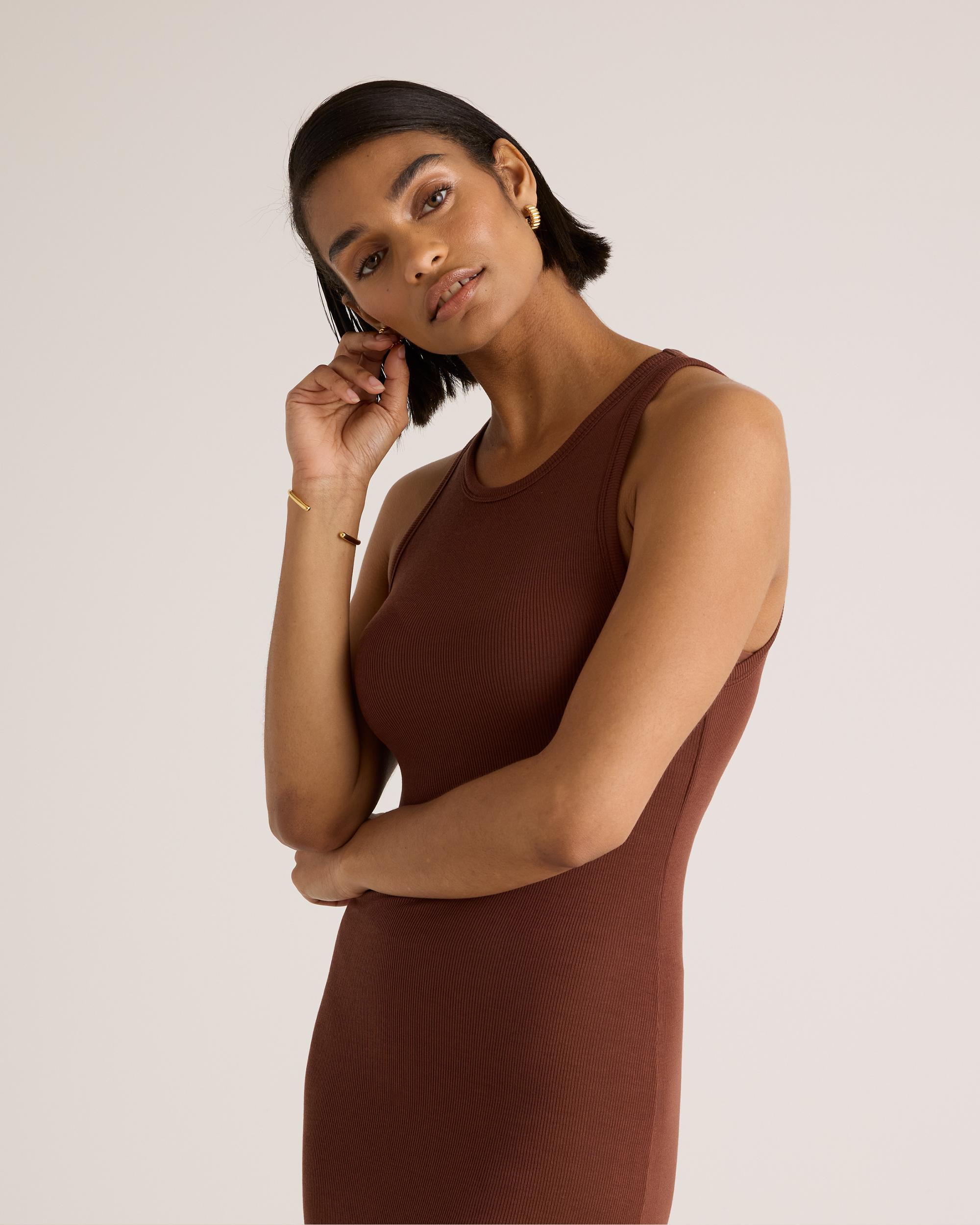 Crafted from the softest Tencel fabric, the Rib Knit Sleeveless Mini Dress is a versatile addition to your wardrobe. This dress features a flattering tank silhouette and a ribbed knit fabric that hugs your curves in all the right places. The mini length adds a touch of flirty charm while making it easy to dress up or down. Whether you're running errands or heading out for a night on the town, this dress is the perfect choice for any occasion. Looking for a longer length? Check out our Tencel Rib Knit Sleeveless Dress. | Quince | Women's Tencel Rib Knit Sleeveless Mini Dress in Brown, Size Large