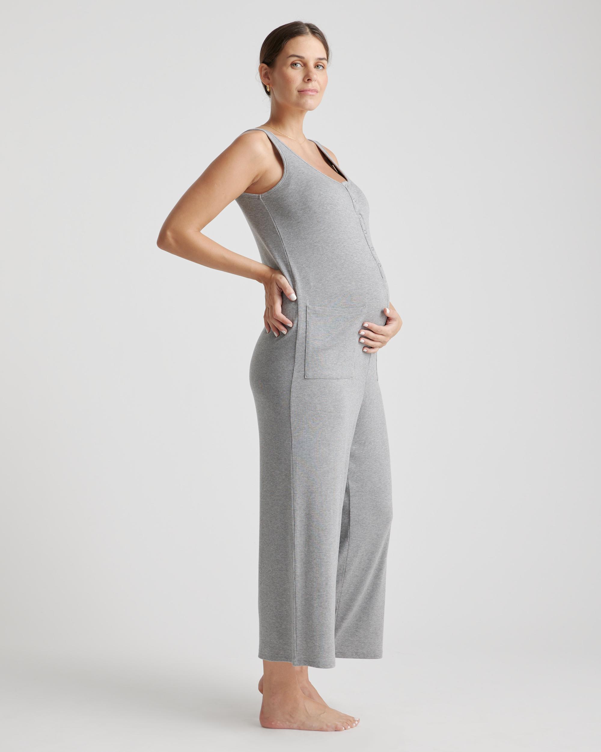 This Tencel™ jumpsuit is perfection. Not only is it lightweight, stretchy and super-soft, it is also nursing and pumping friendly. With patch pockets you can easily store all of life’s necessities. This versatile jumpsuit can carry you through all stages of pregnancy and beyond. Tencel™ lyocell is a biodegradable fabric made from cellulose found in wood pulp. It is softer, more breathable, and uses 10-20 times less water in production compared to cotton. | Quince | Women's Tencel Rib Maternity & Nursing Jumpsuit in Heather Grey, Size XS