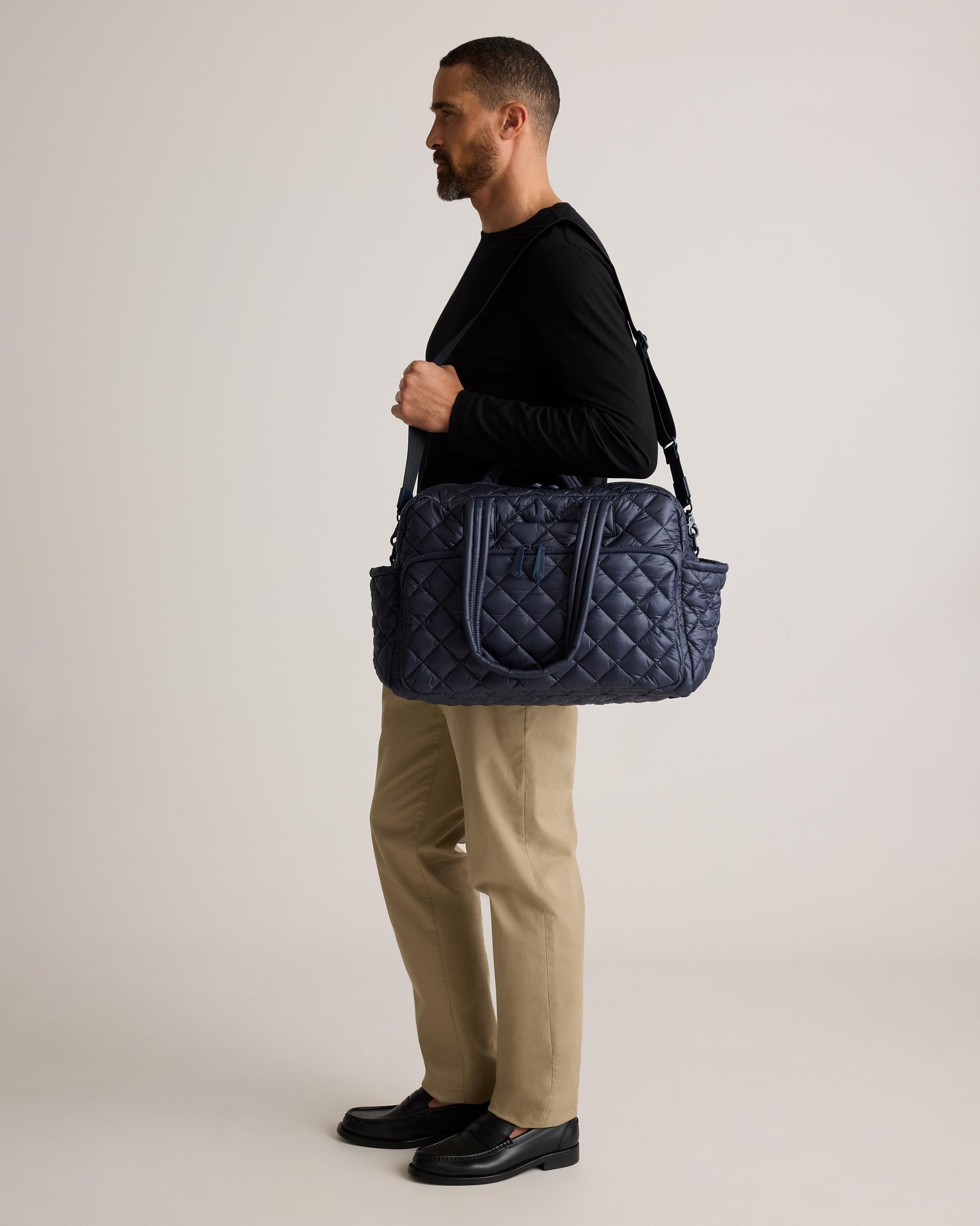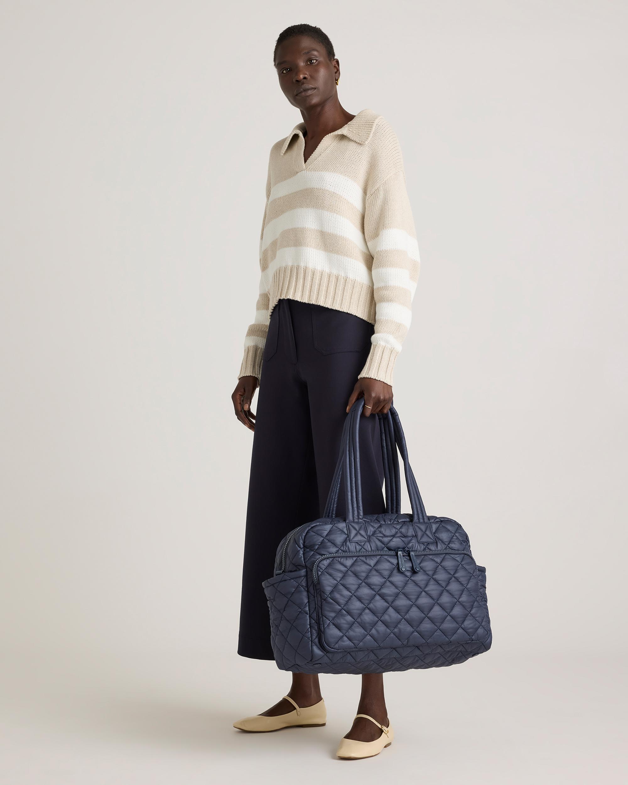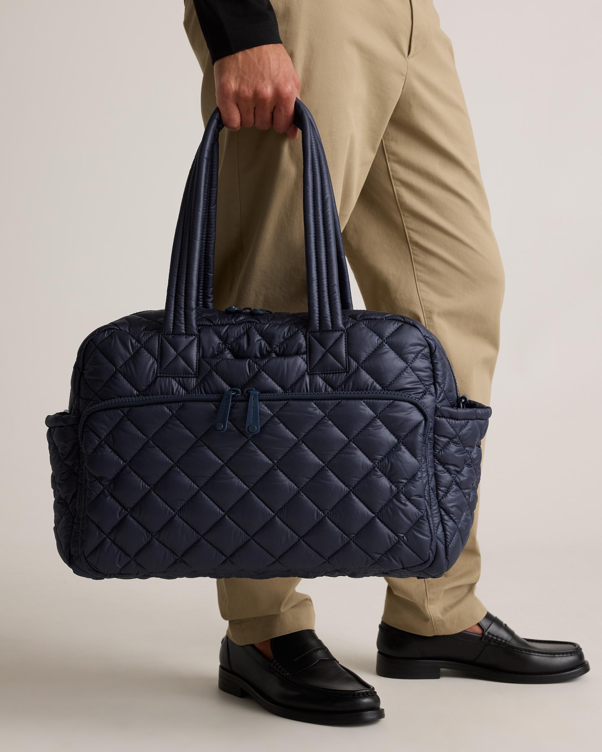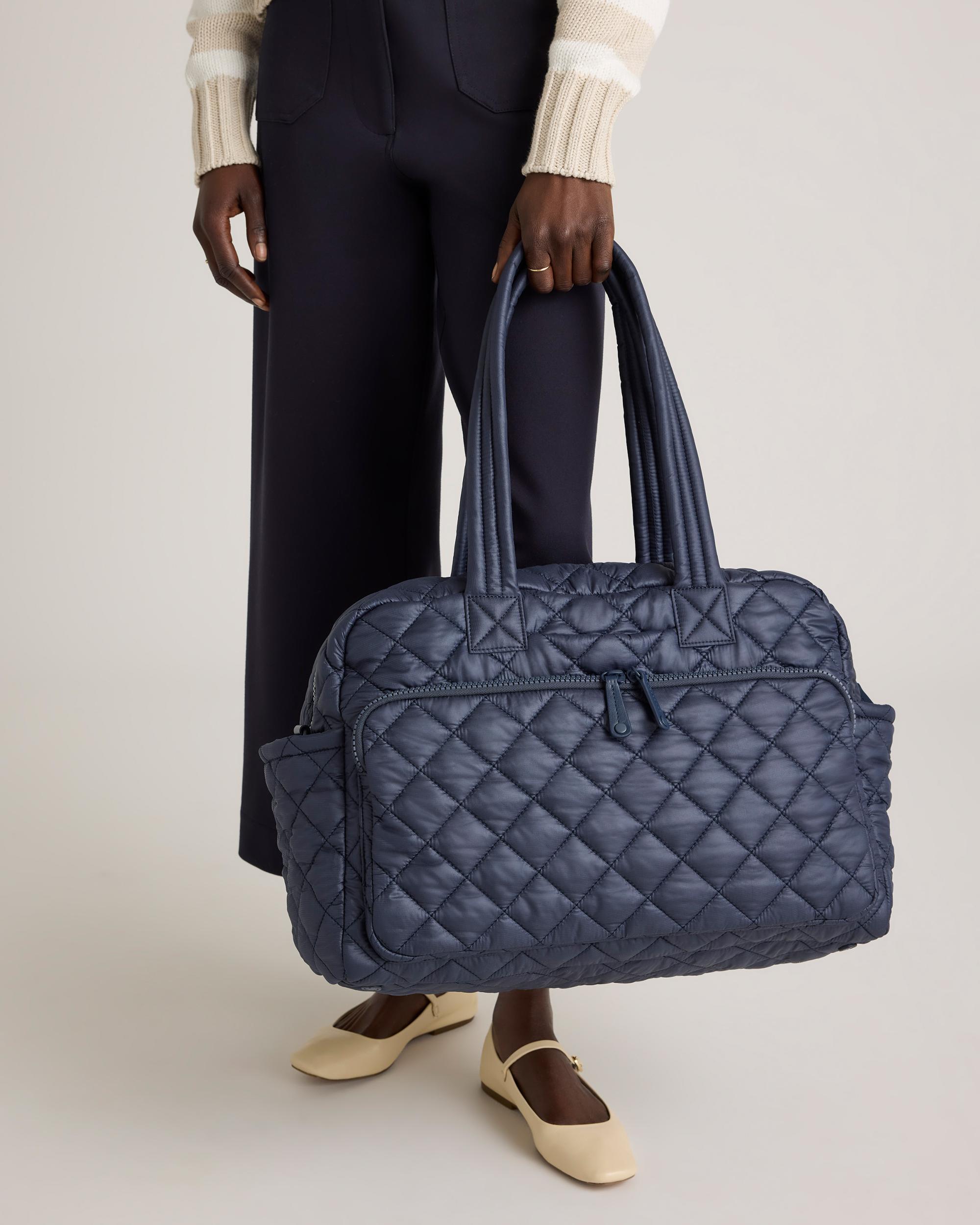 Meet your go-anywhere, carry-anything duffle. Our Transit Quilted Duffle Bag has the texture of your favorite puffer but with way more functionality: with multiple pockets, an adjustable shoulder strap, and dual top handles for an easy carry. Plus its water-resistant material is made from 16 recycled materials and keeps plastic bottles out of oceans and landfills. | Quince | Women's Transit Quilted Duffle Bag in Navy, Nylon