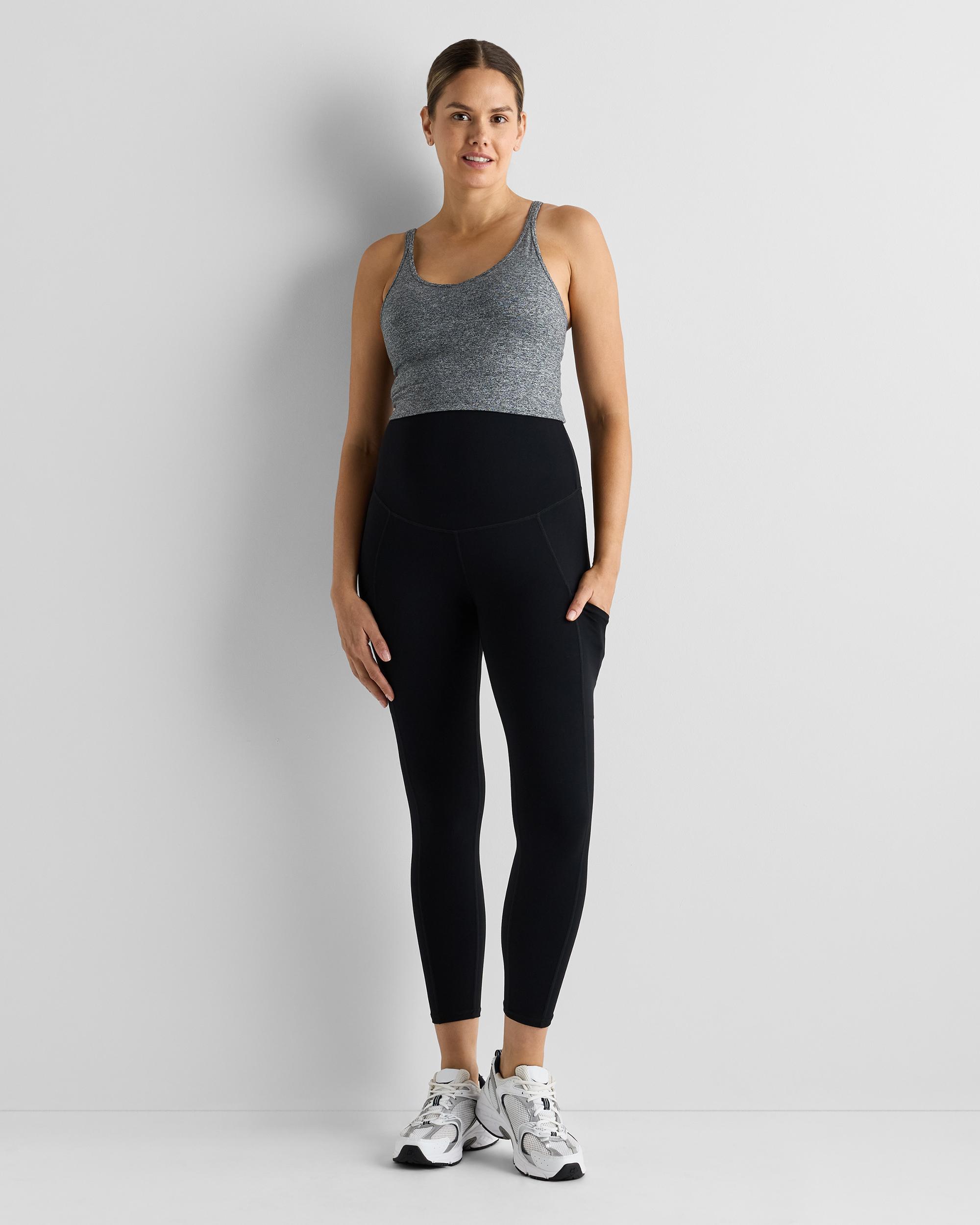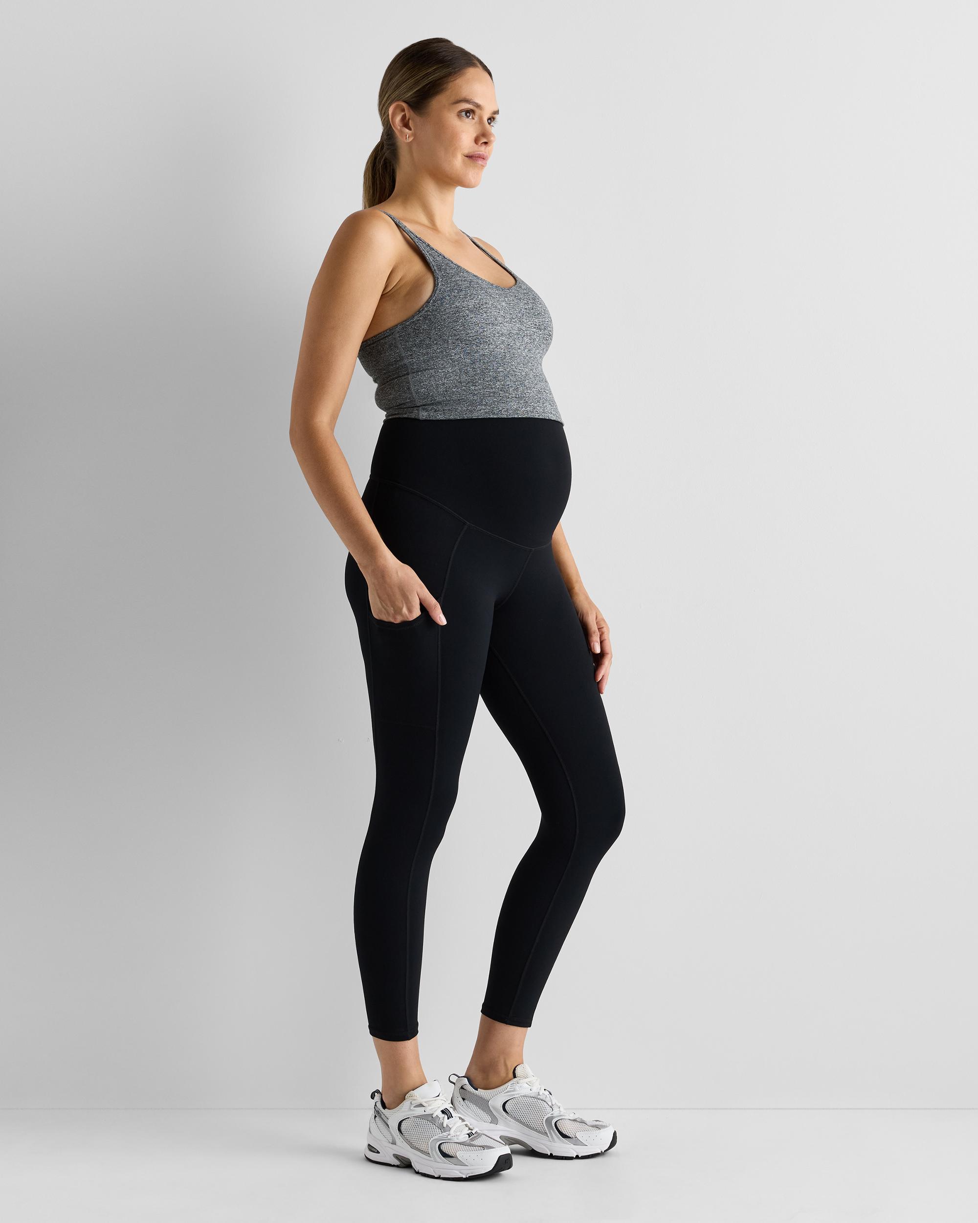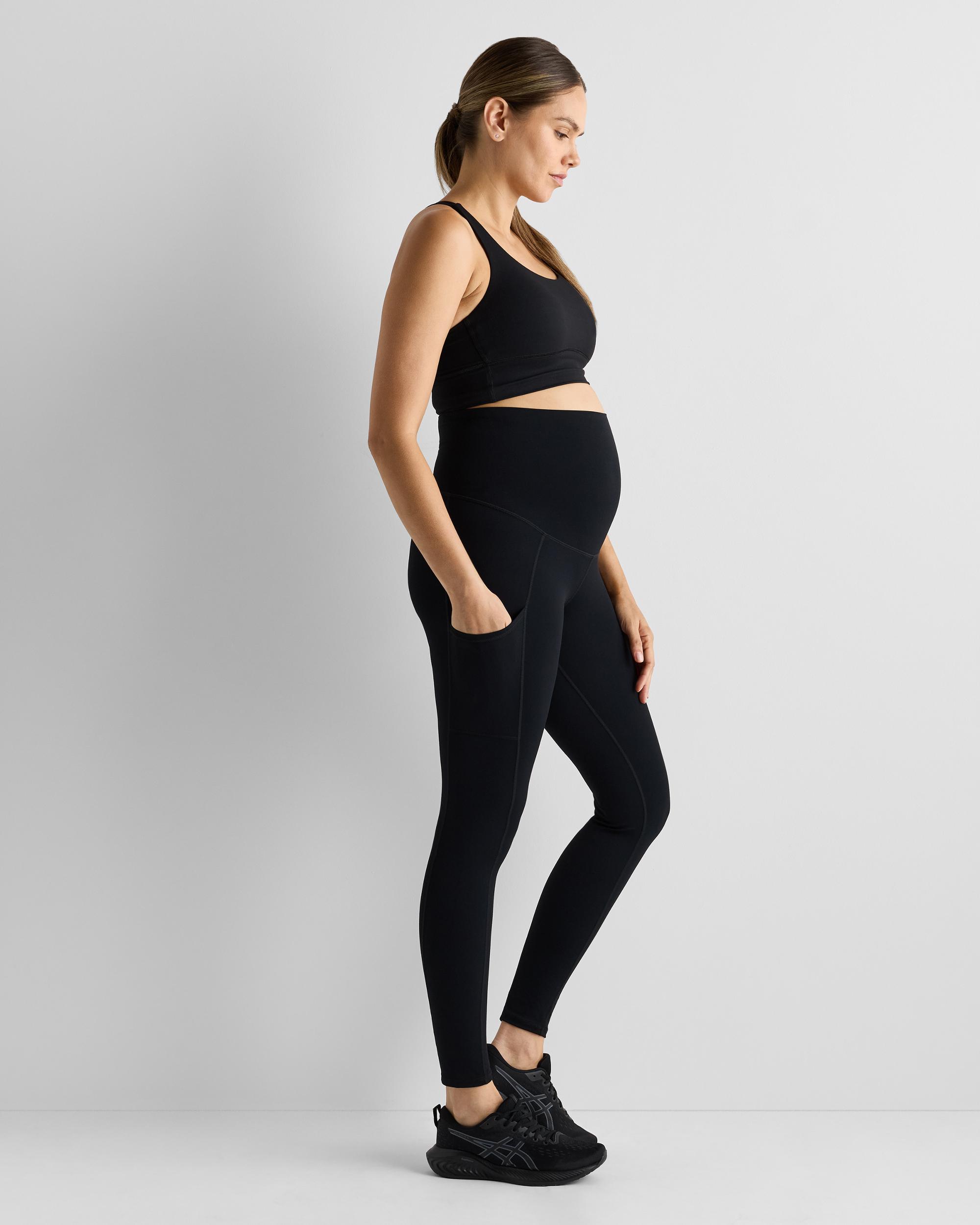Perfect for prenatal yoga, walks with the dog or all-day wear, these are the maternity leggings you need in your life. Our Ultra-Form fabric is buttery soft with 4-way stretch and features quick-dry, moisture-wicking, and anti-microbial technology. Designed with an over-the-belly waistband that’s easy to fold up or down and pockets at each side to help you keep your essentials close, you will want to reach for these every day of your pregnancy. | Quince | Women's Ultra-Form Maternity Pocket Leggings in Black, Size Medium, Nylon/Spandex