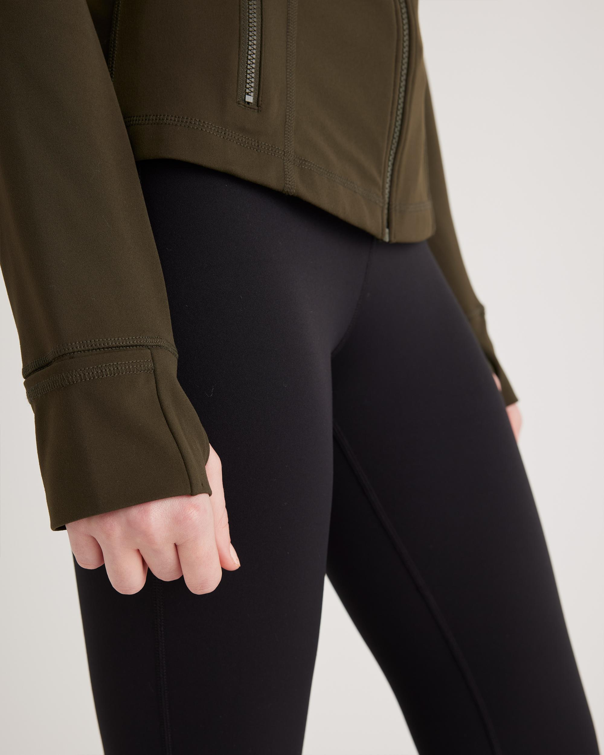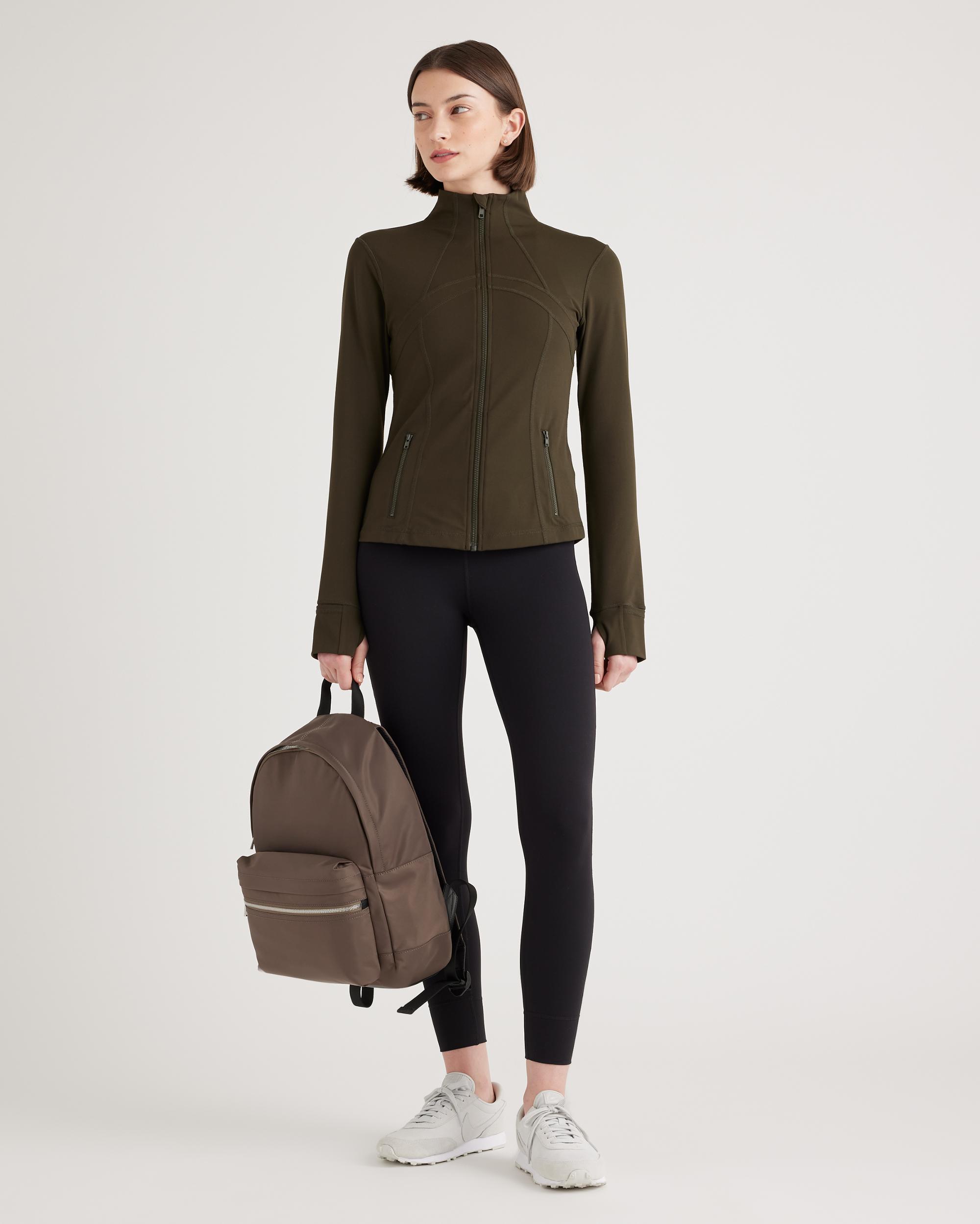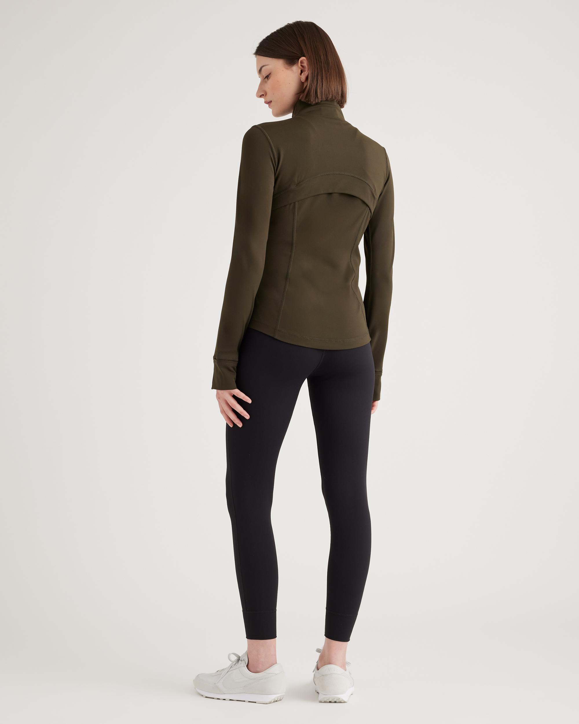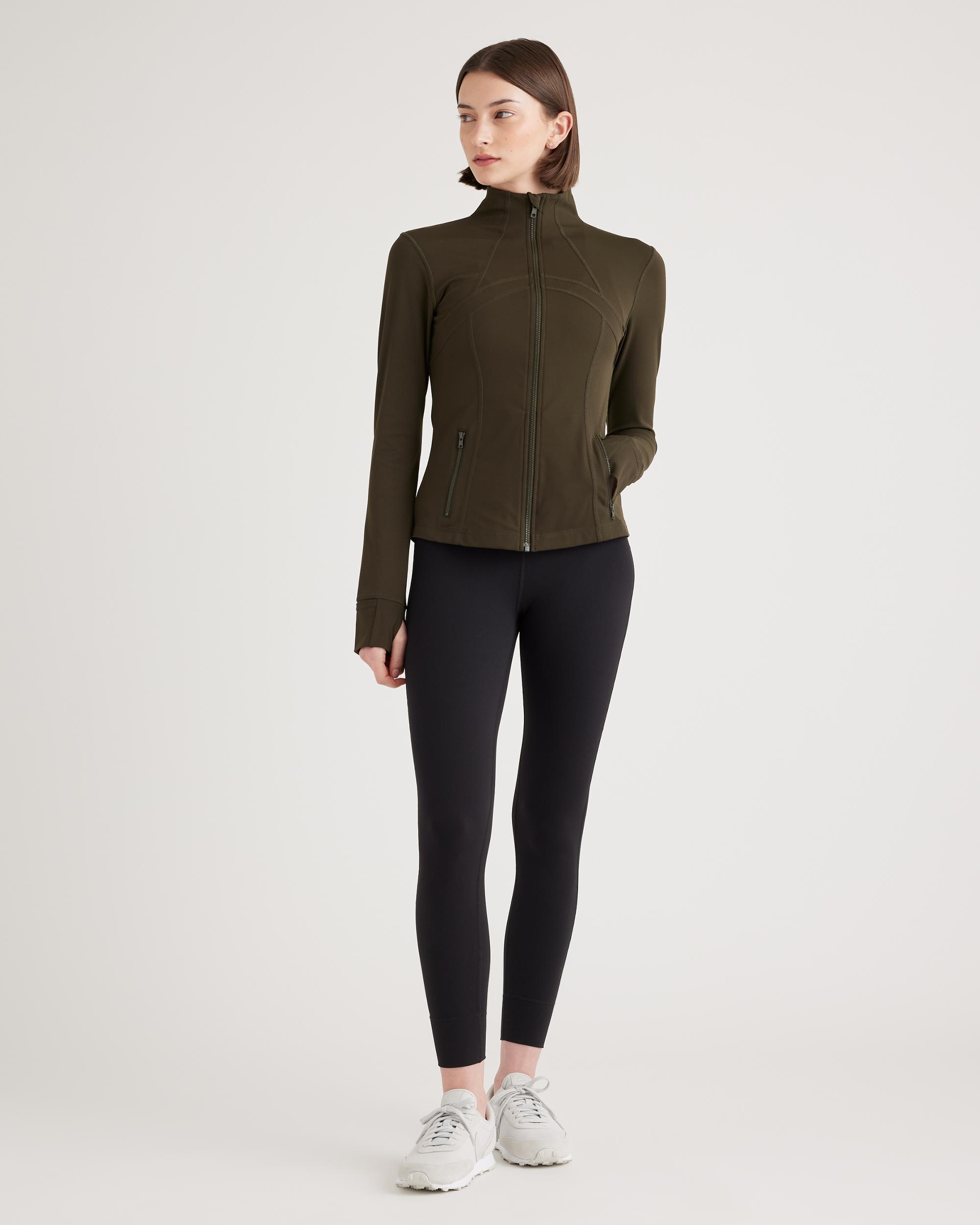 Whatever you're up to, our Ultra-Form Jacket is here for it. With a slim fit and athletic-minded thumbholes, its super soft fabric will keep you comfy whether you're hiking or heading into town. Designed to hit at the hip, this jacket's buttery soft fabric features 4-way stretch and quick-dry, moisture-wicking, and anti-microbial technology. | Quince | Women's Ultra-Form Slim Fit Jacket in Smokey Olive, Size XS, Nylon/Spandex
