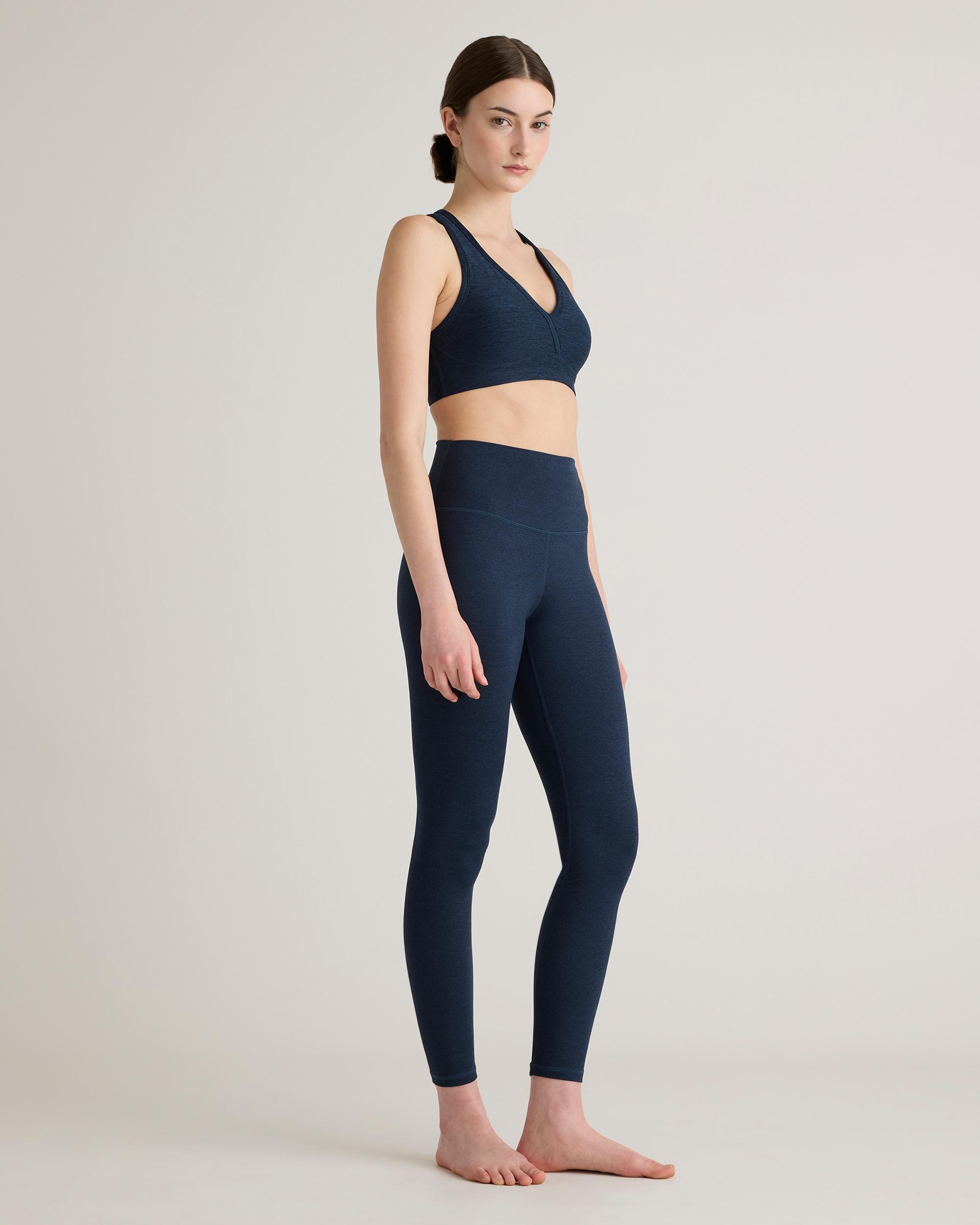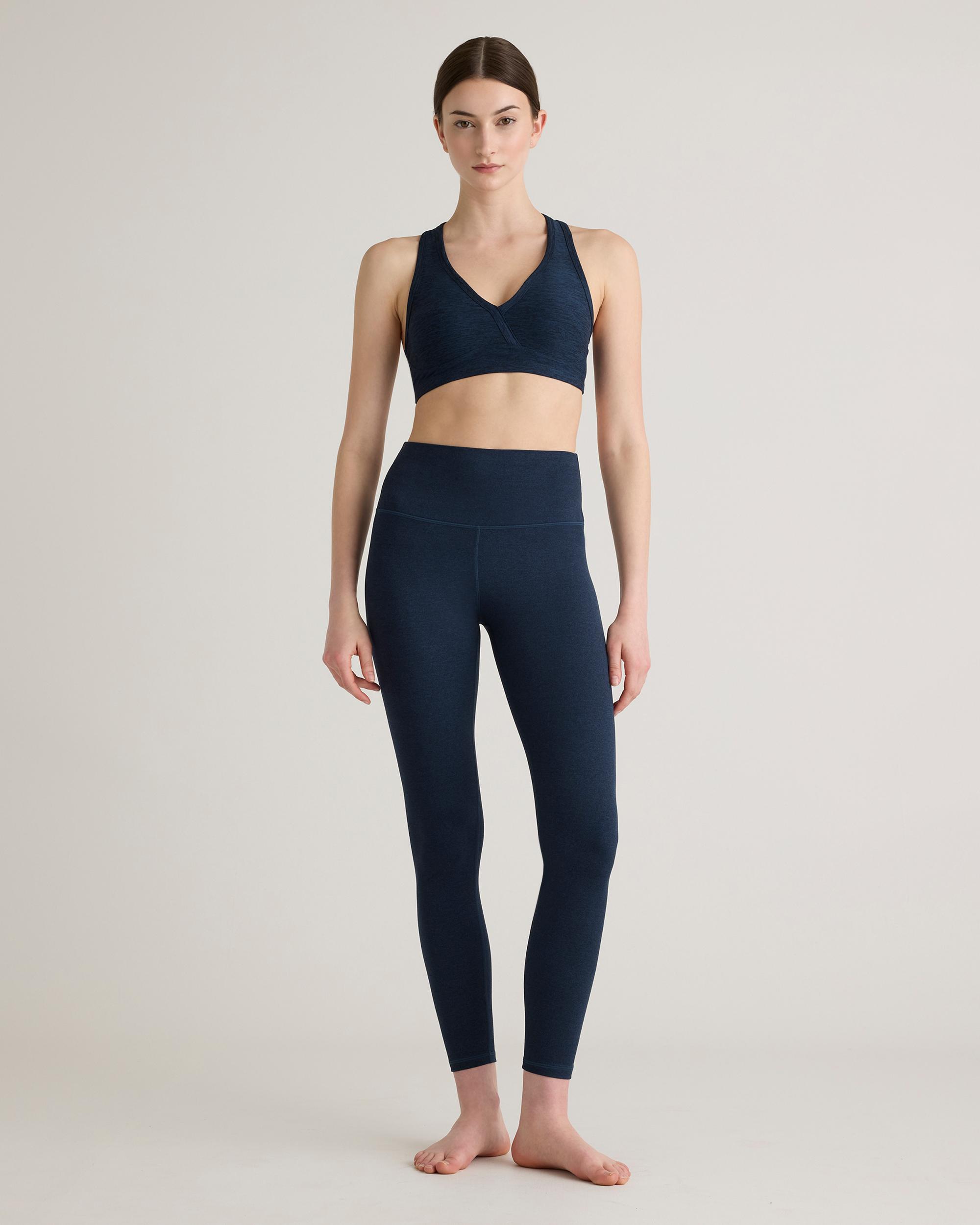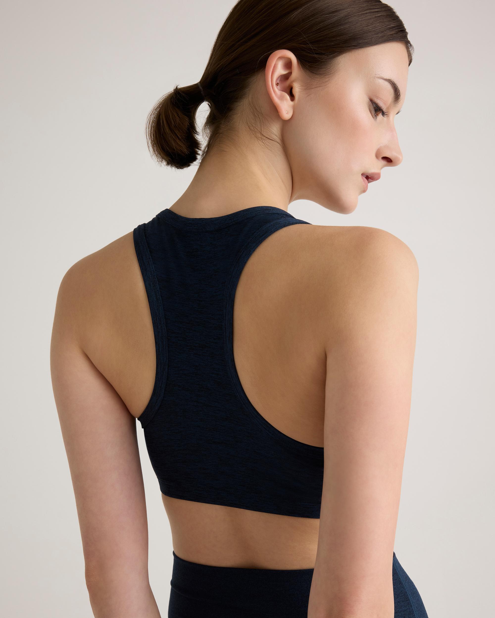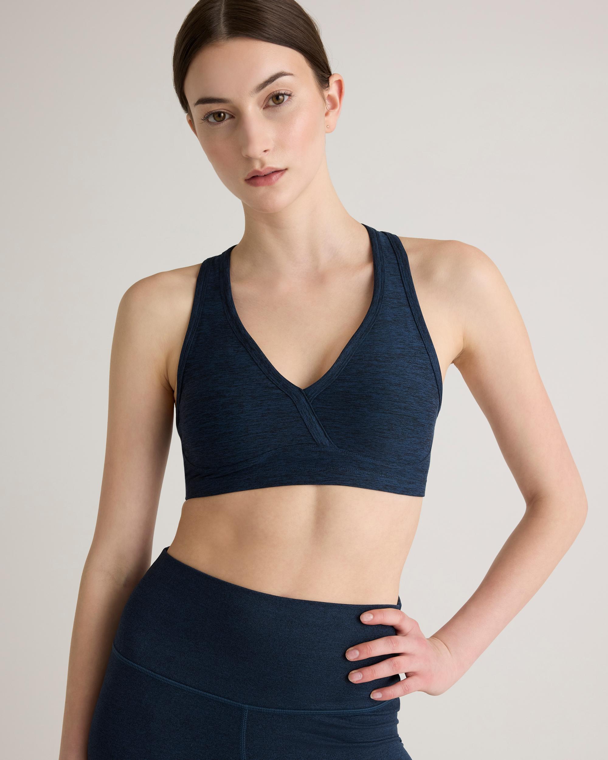 Moisture-wicking, anti-microbial, and with a comfy-yet-supportive 4-way stretch, our Ultra-Soft V-Neck Racerback Bra checks all the boxes. Plus, it has a buttery-soft fabric you won’t want to take off. It’s sure to become your new go-to bra for any low impact workout. | Quince | Women's Ultra-Soft V-Neck Racerback Bra in Heather Navy, Size Small, Polyester