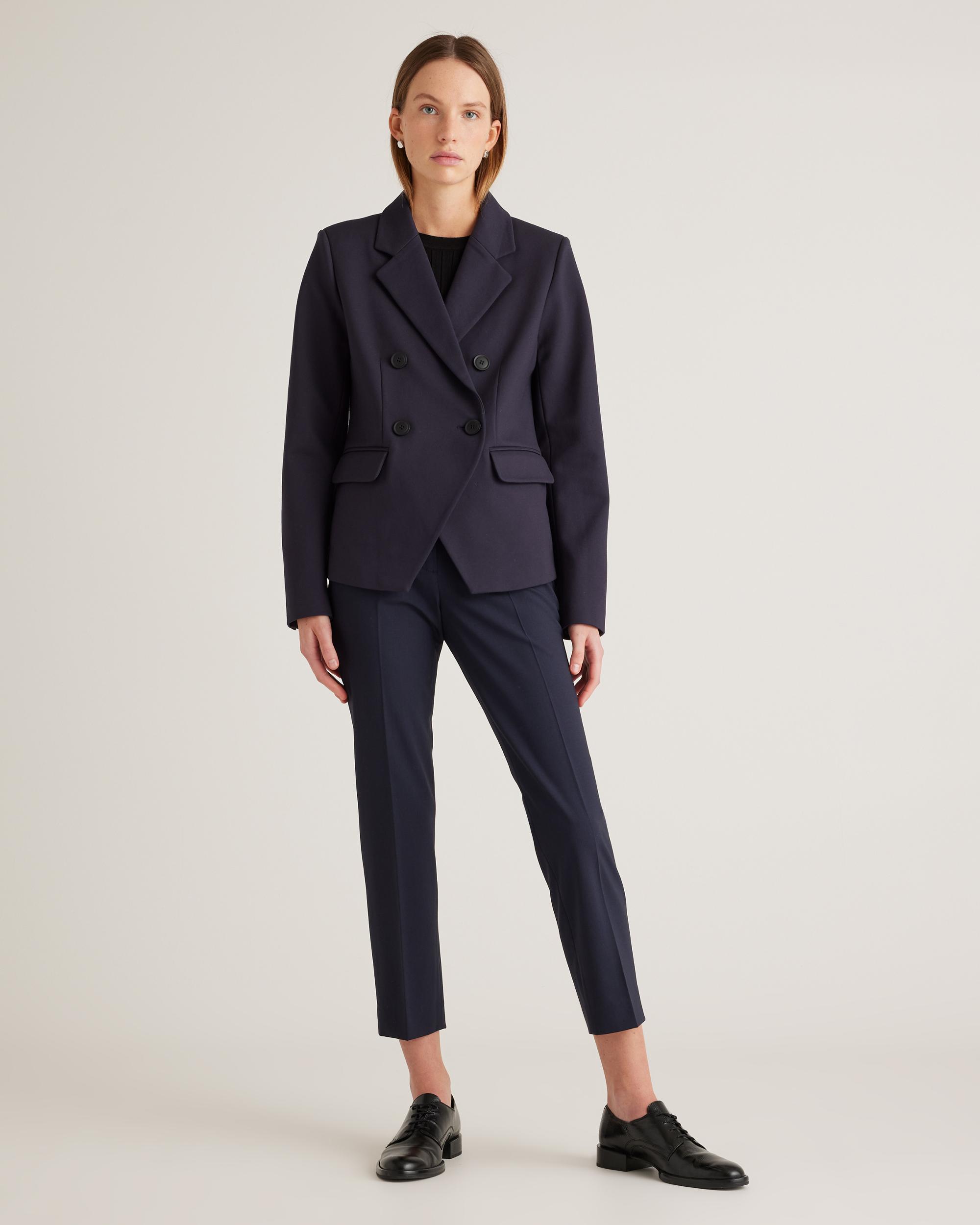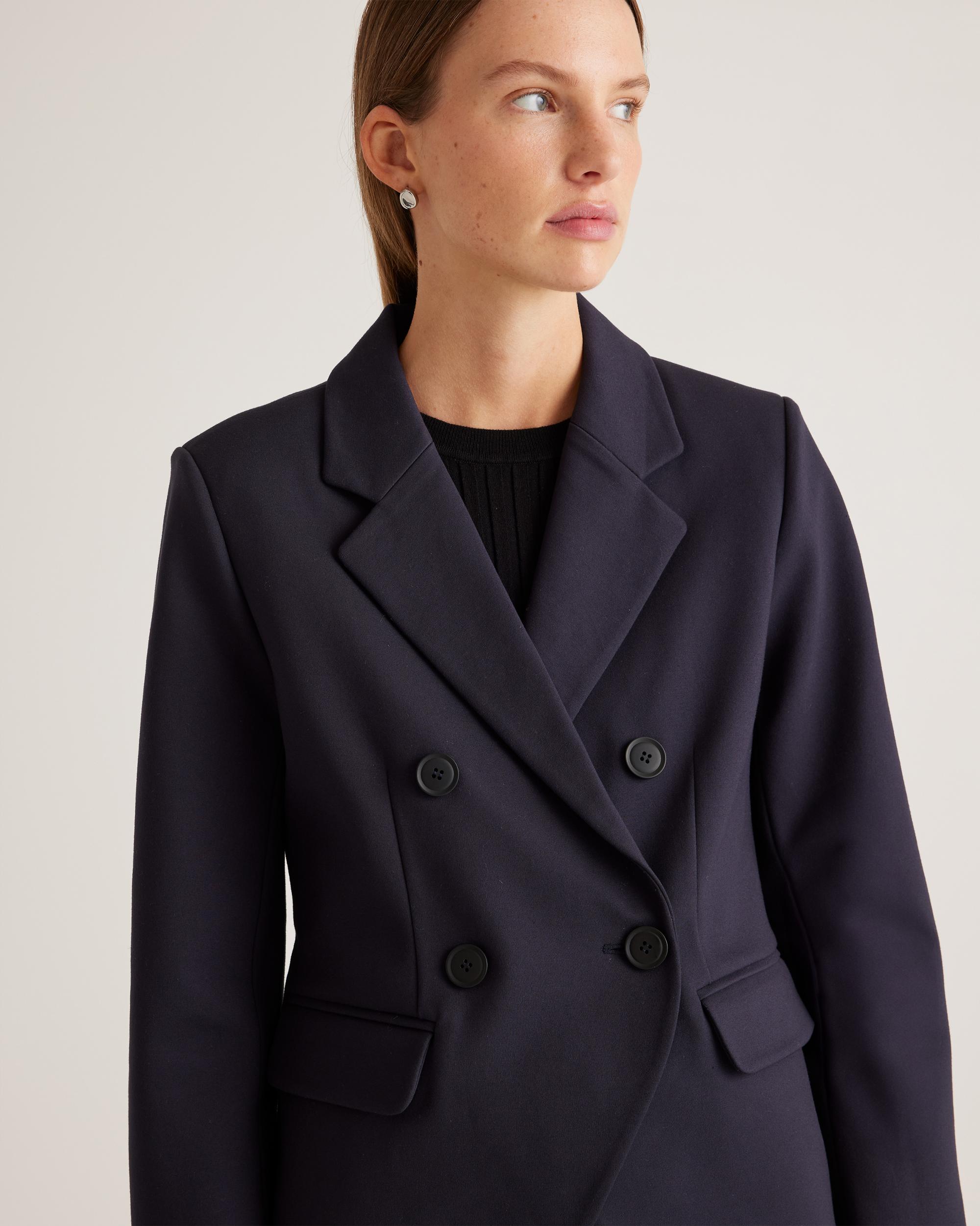 The perfect blend of polished and comfy. Our Ultra-Stretch Ponte Double Breasted Blazer is crafted with a double-knit for structure and 4-way stretch in a flattering fit. Wrinkle-resistant and effortlessly chic, this blazer will be your go-to, whatever's on your busy schedule. Complete your outfit with our Ultra-Stretch Ponte Pencil Skirt or our Ultra-Stretch Ponte Trouser for a coordinated look. | Quince | Women's Ultra-Stretch Ponte Double Breasted Blazer in Navy, Size XL, Rayon