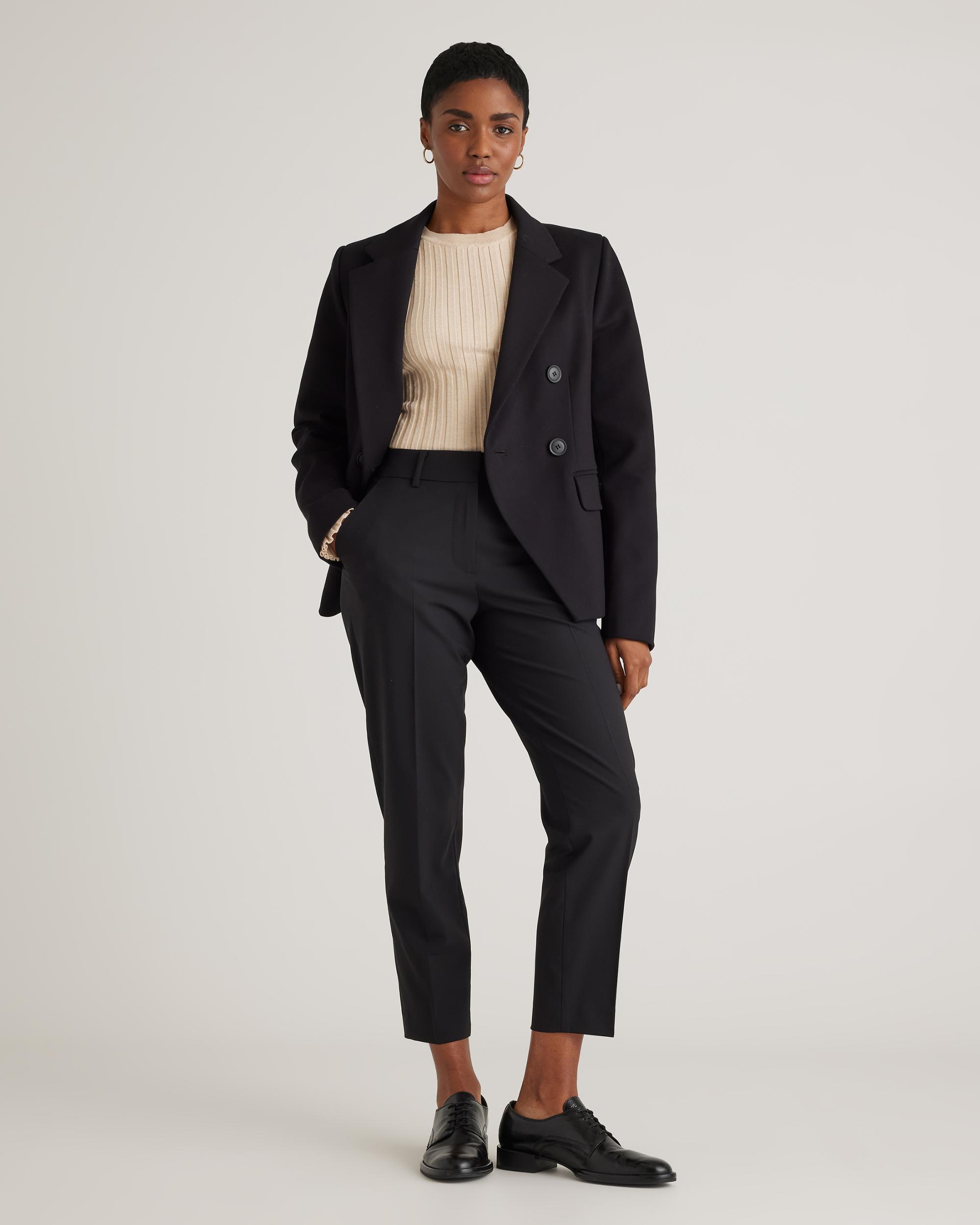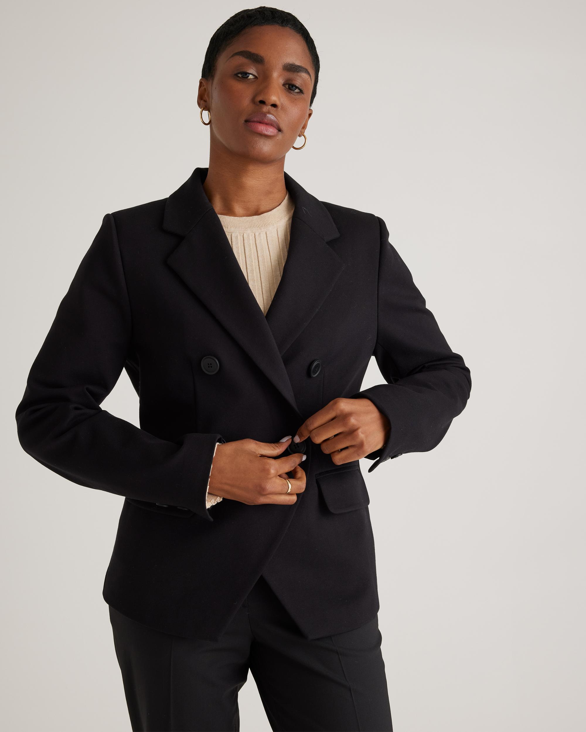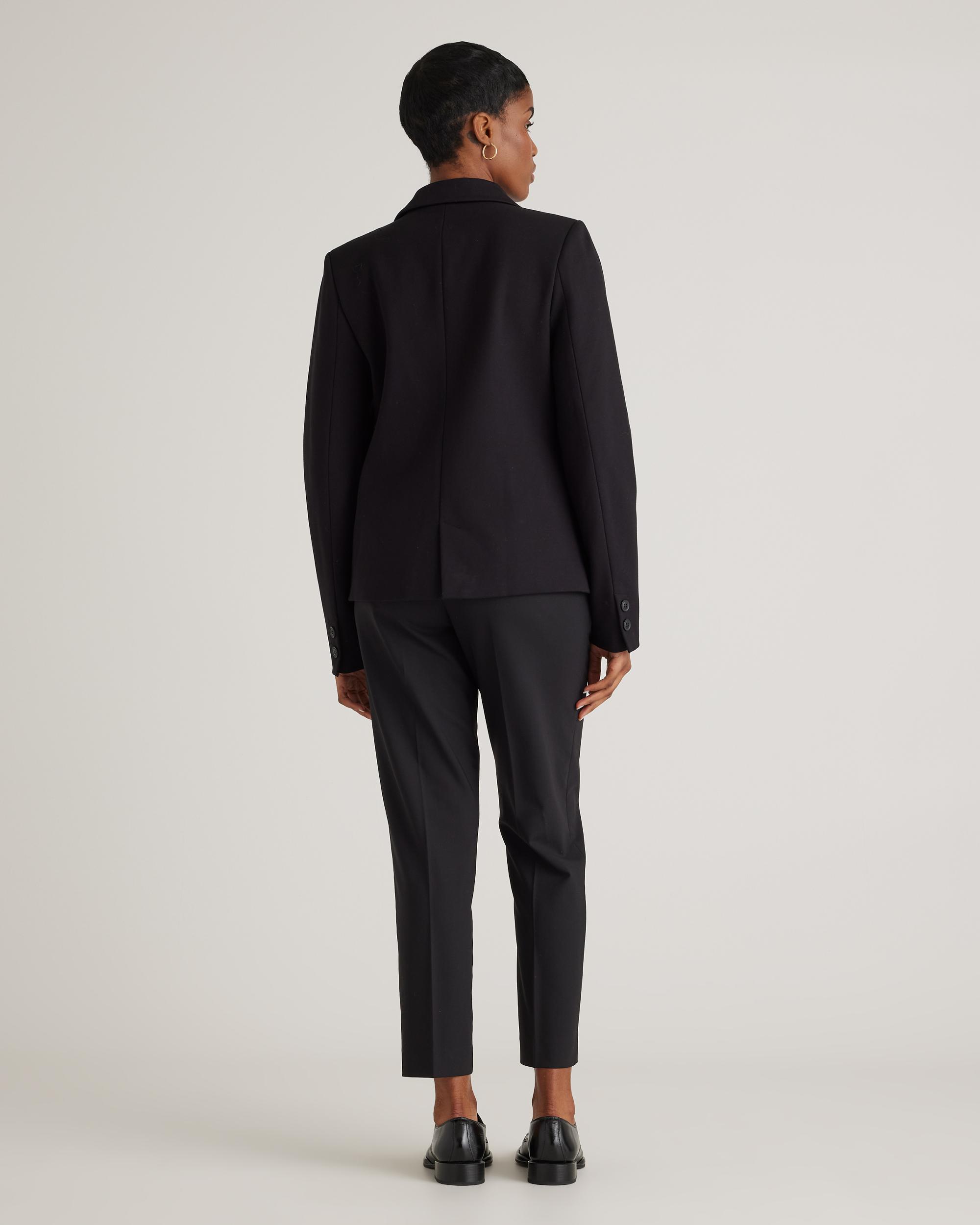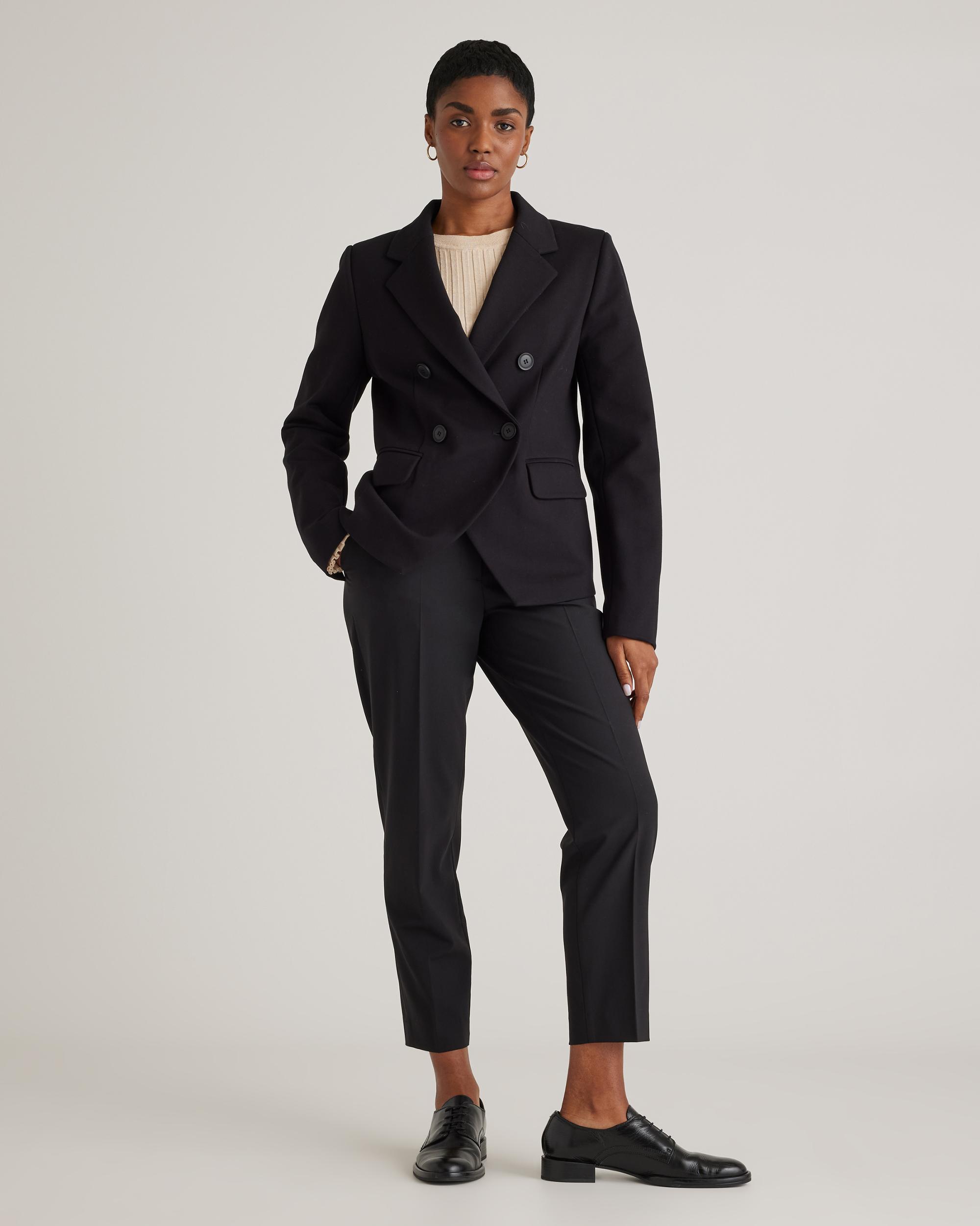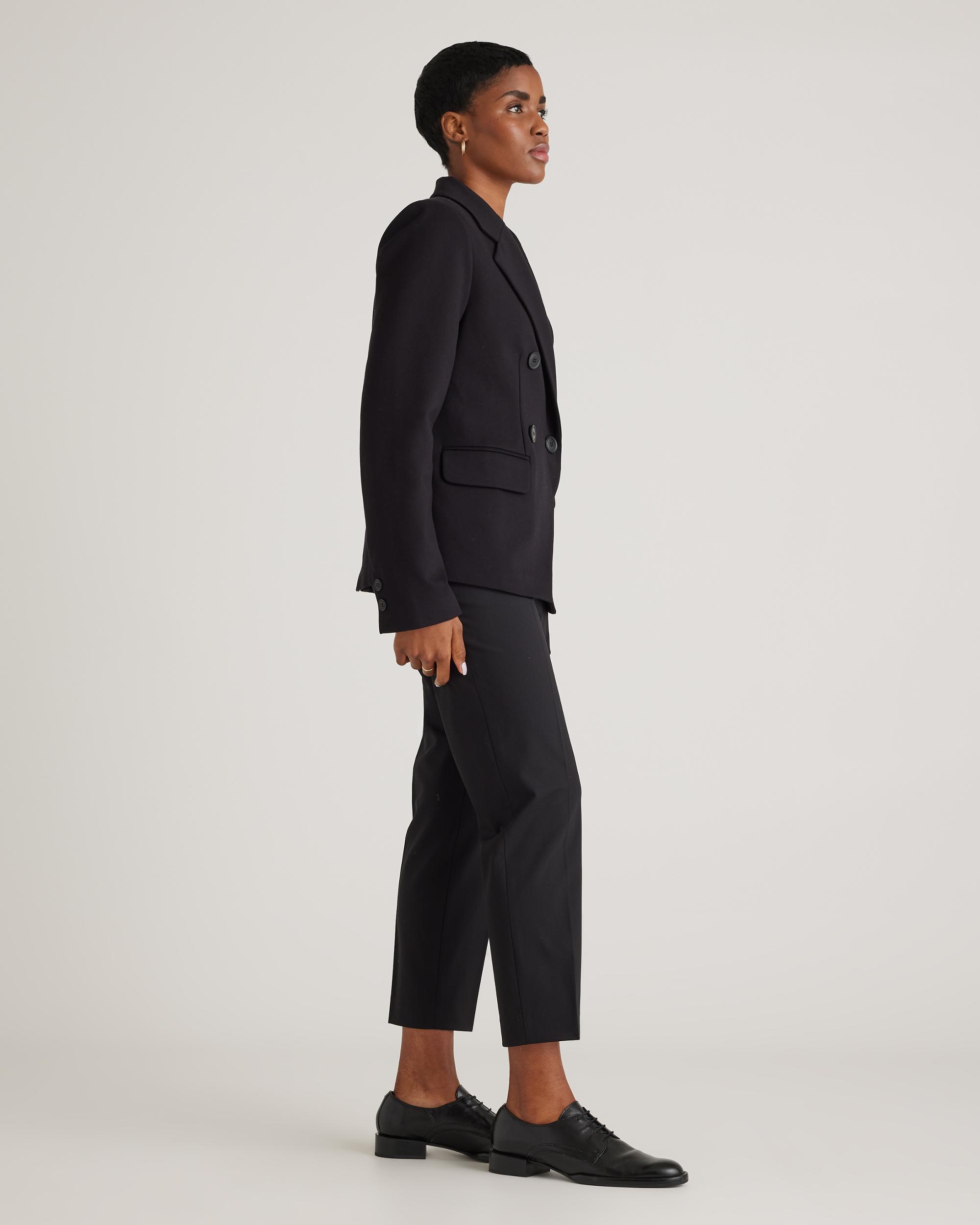The perfect blend of polished and comfy. Our Ultra-Stretch Ponte Double Breasted Blazer is crafted with a double-knit for structure and 4-way stretch in a flattering fit. Wrinkle-resistant and effortlessly chic, this blazer will be your go-to, whatever's on your busy schedule. Complete your outfit with our Ultra-Stretch Ponte Pencil Skirt or our Ultra-Stretch Ponte Trouser for a coordinated look. | Quince | Women's Ultra-Stretch Ponte Double Breasted Blazer in Black, Size Large, Rayon