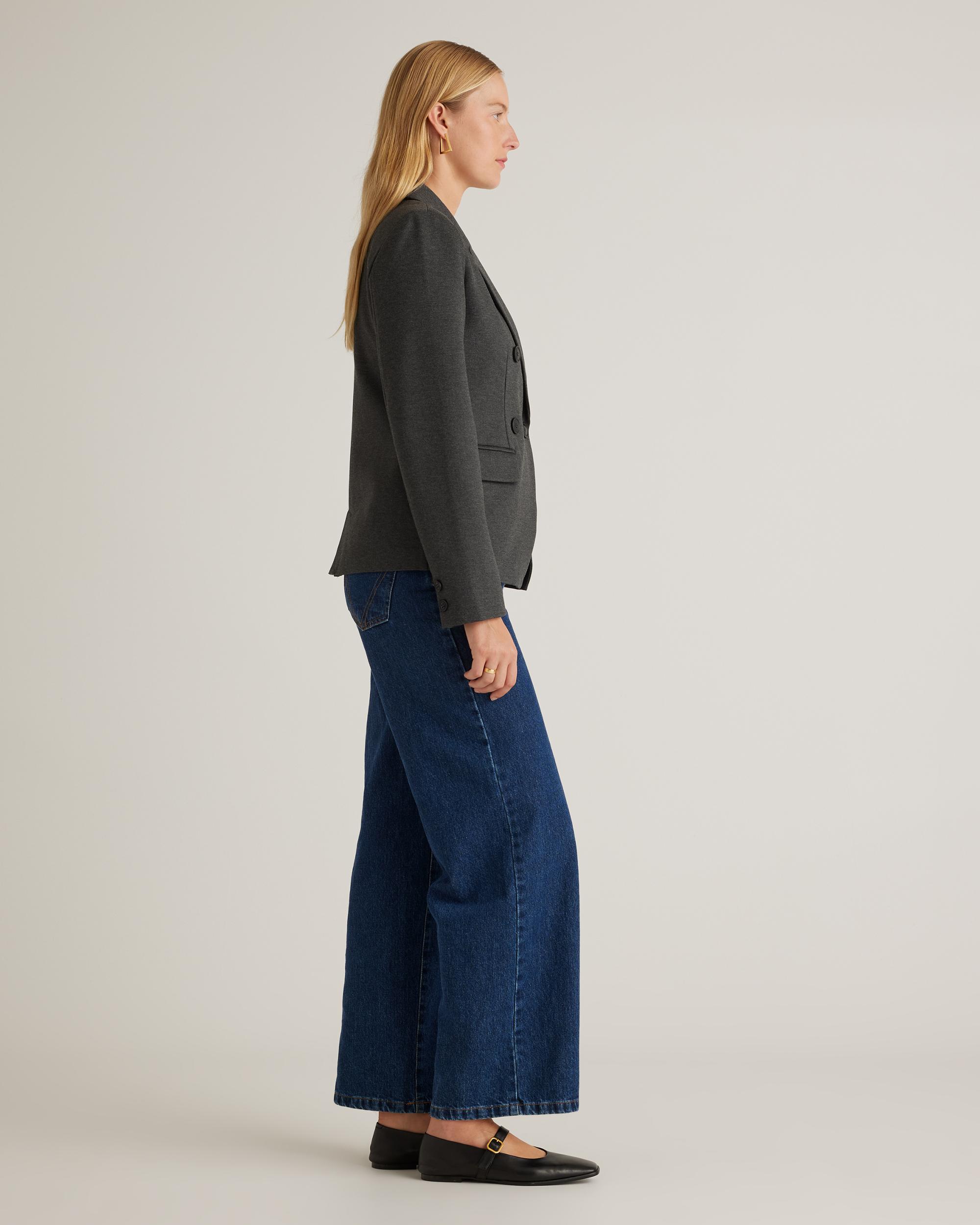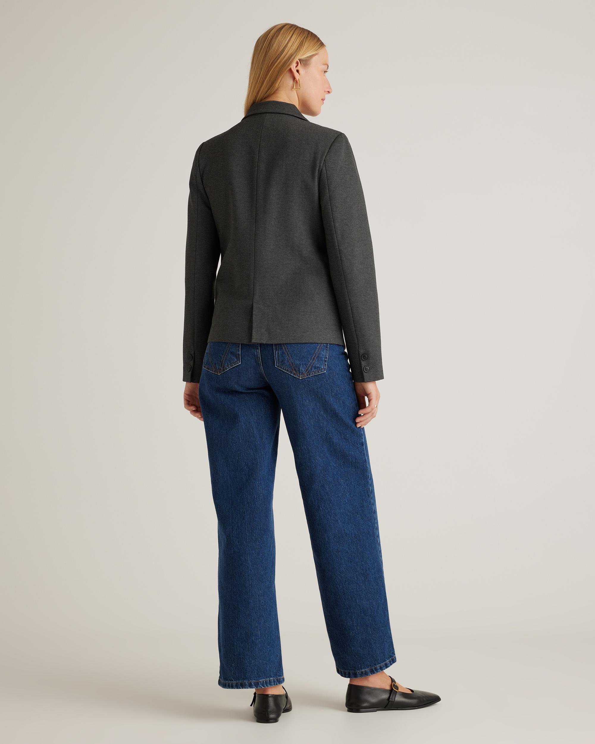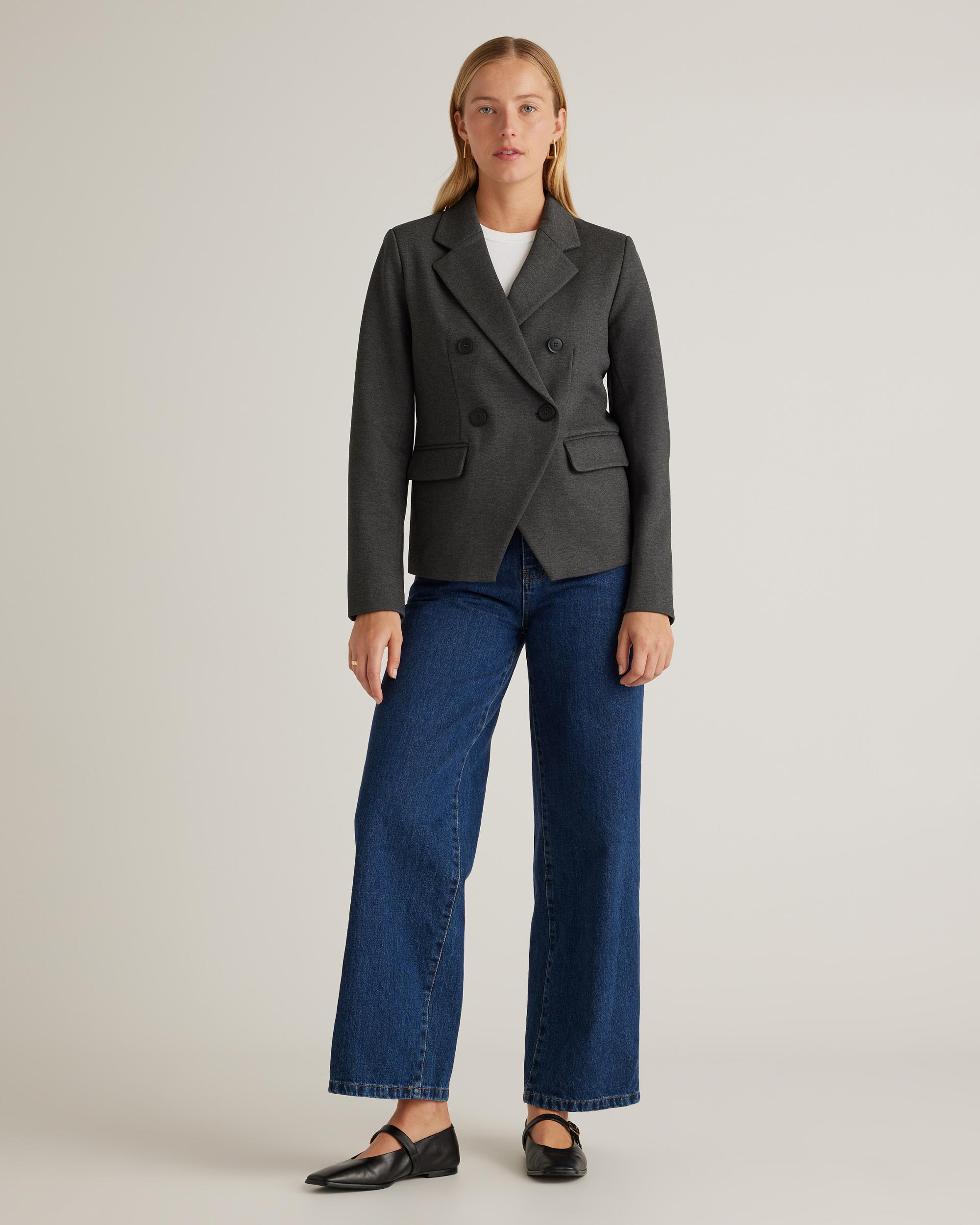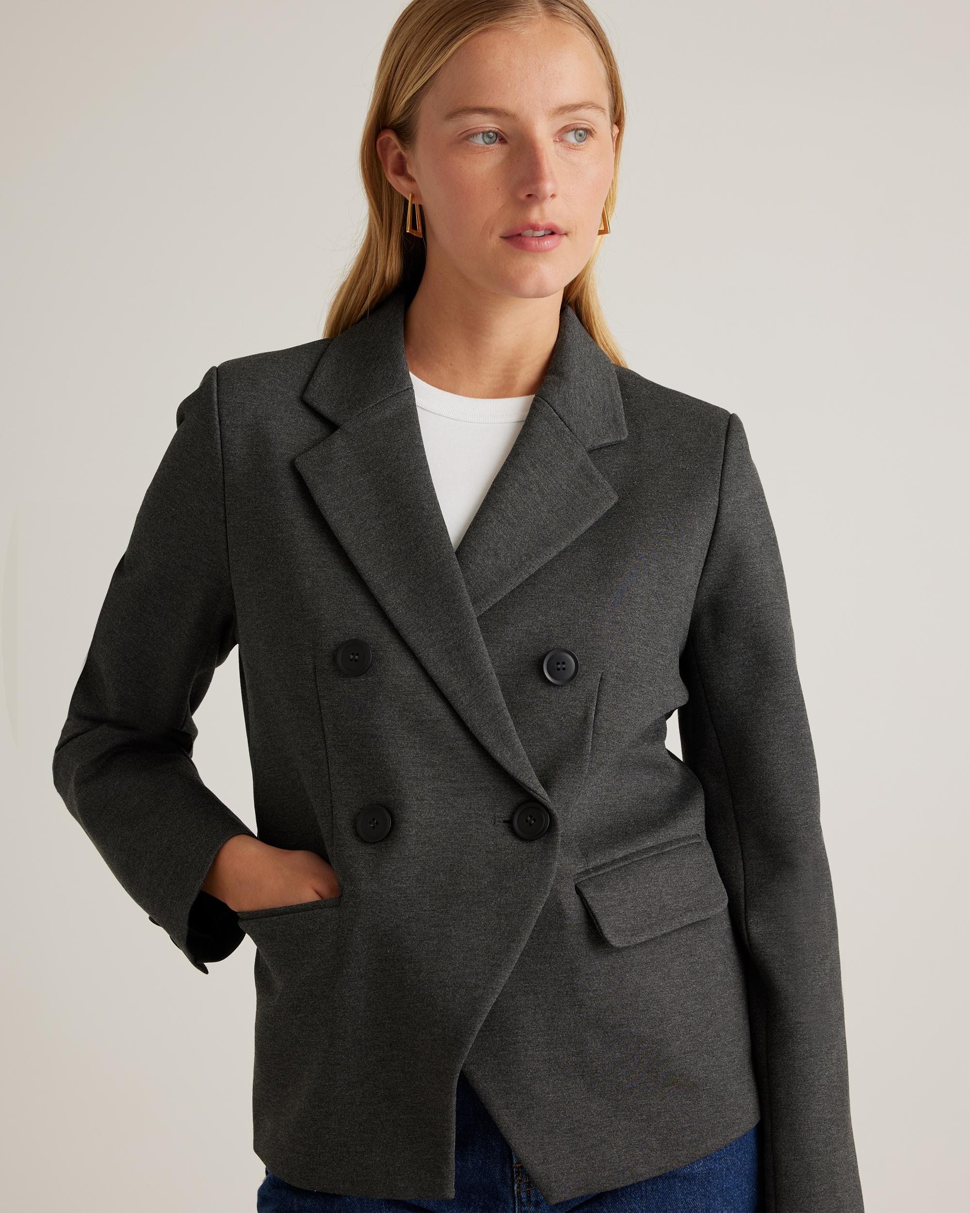 The perfect blend of polished and comfy. Our Ultra-Stretch Ponte Double Breasted Blazer is crafted with a double-knit for structure and 4-way stretch in a flattering fit. Wrinkle-resistant and effortlessly chic, this blazer will be your go-to, whatever's on your busy schedule. Complete your outfit with our Ultra-Stretch Ponte Pencil Skirt or our Ultra-Stretch Ponte Trouser for a coordinated look. | Quince | Women's Ultra-Stretch Ponte Double Breasted Blazer in Charcoal, Size XL, Rayon
