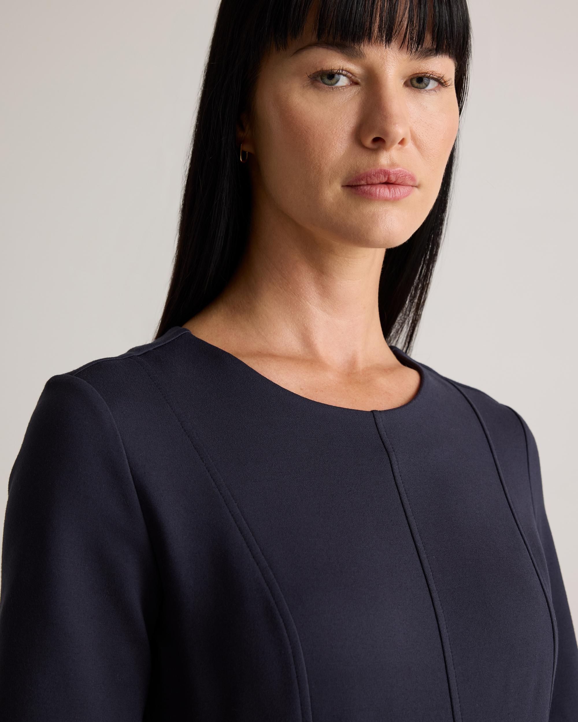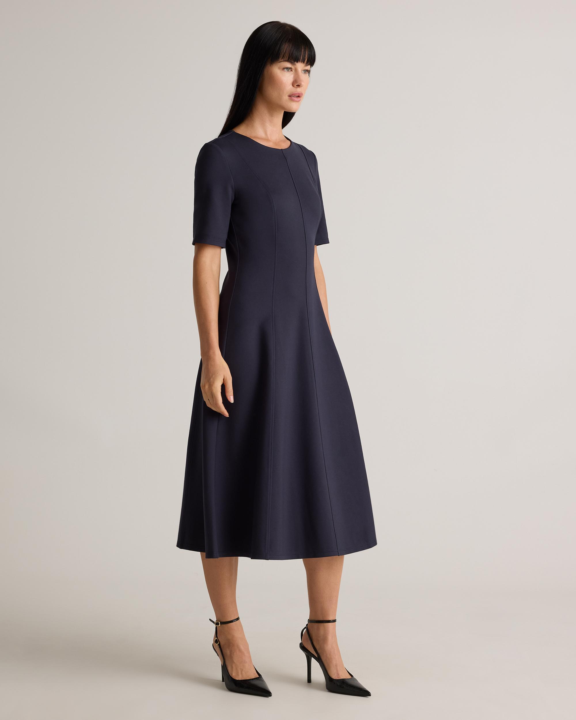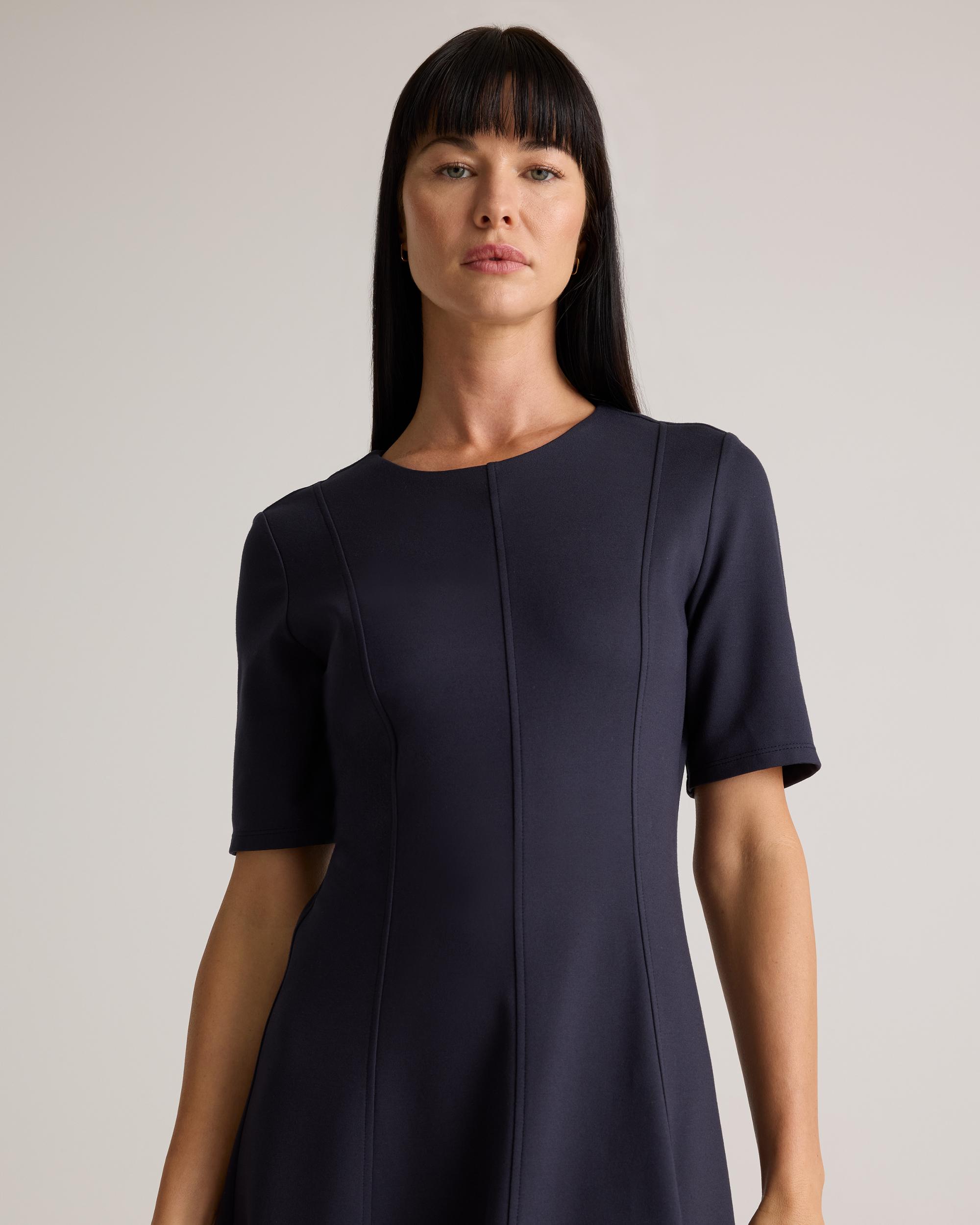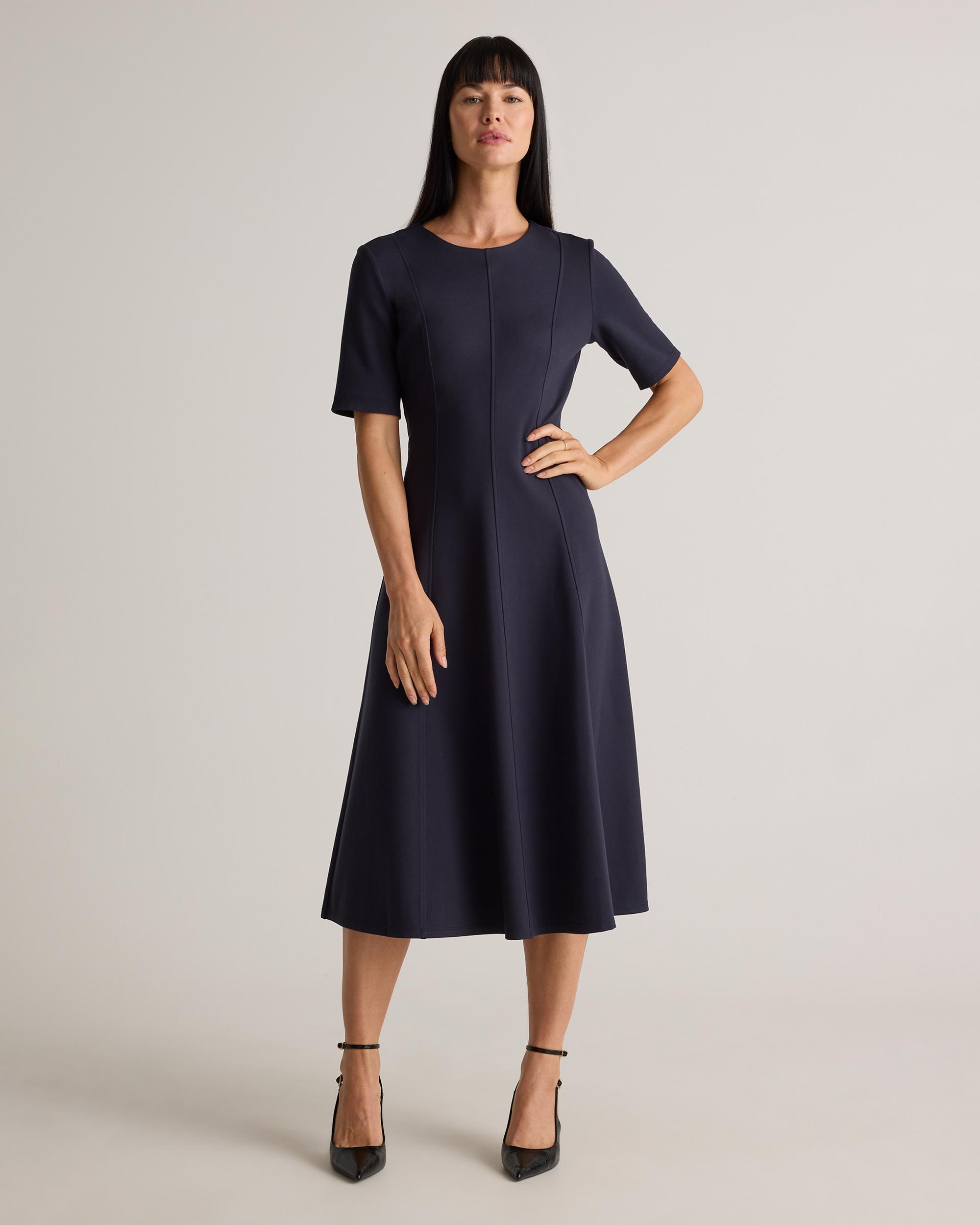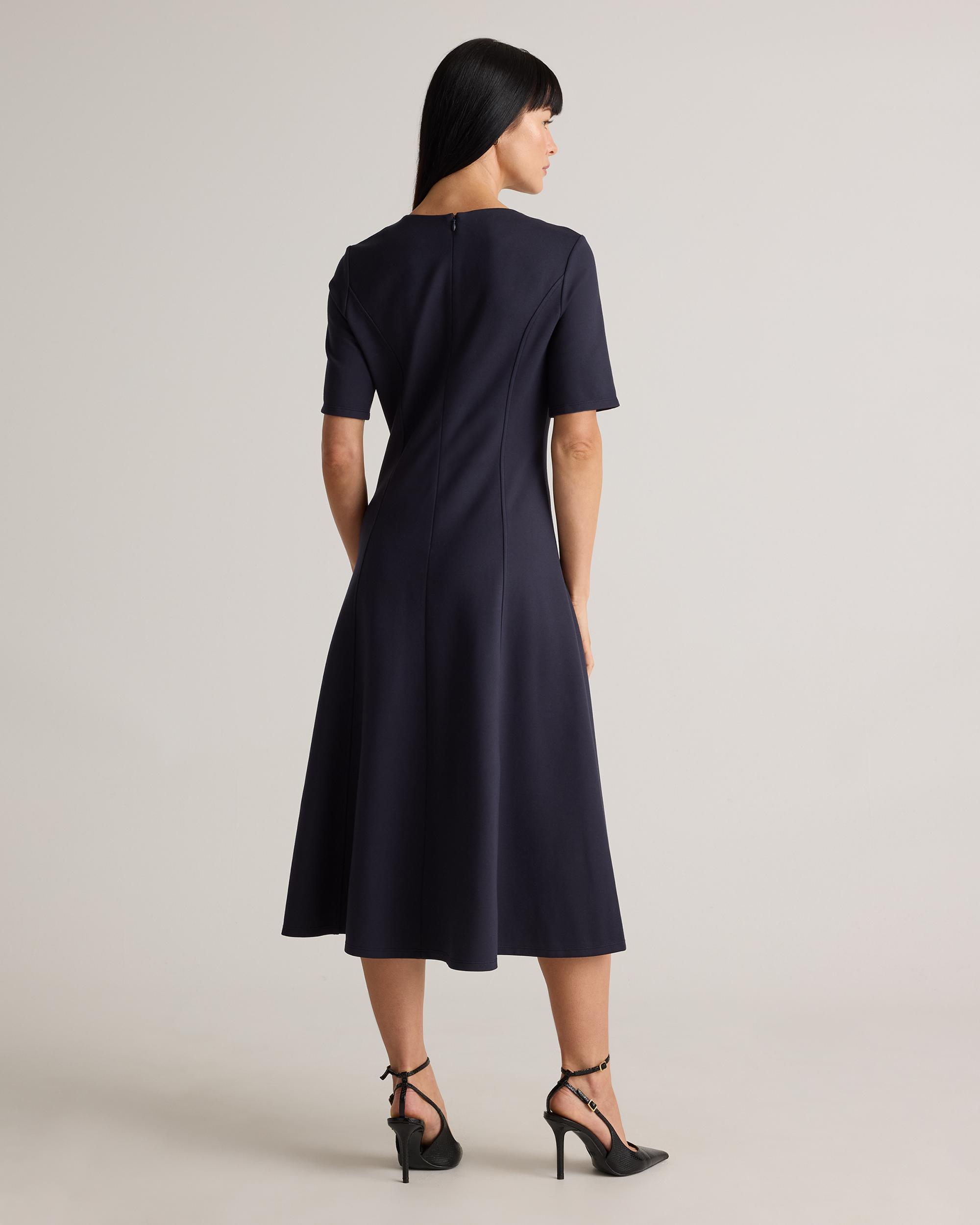 Designed with short sleeves and a clean, minimalist aesthetic, this Ultra-Stretch Ponte Short Sleeve Midi Dress is versatile enough to be worn from office to evening. Made from high-quality double knit ponte fabric, it's stretchy but still polished. Pair it with your favorite heels for a professional look or style it with casual flats for a more relaxed vibe. | Quince | Women's Ultra-Stretch Ponte Short Sleeve Midi Dress in Navy, Size XL, Rayon