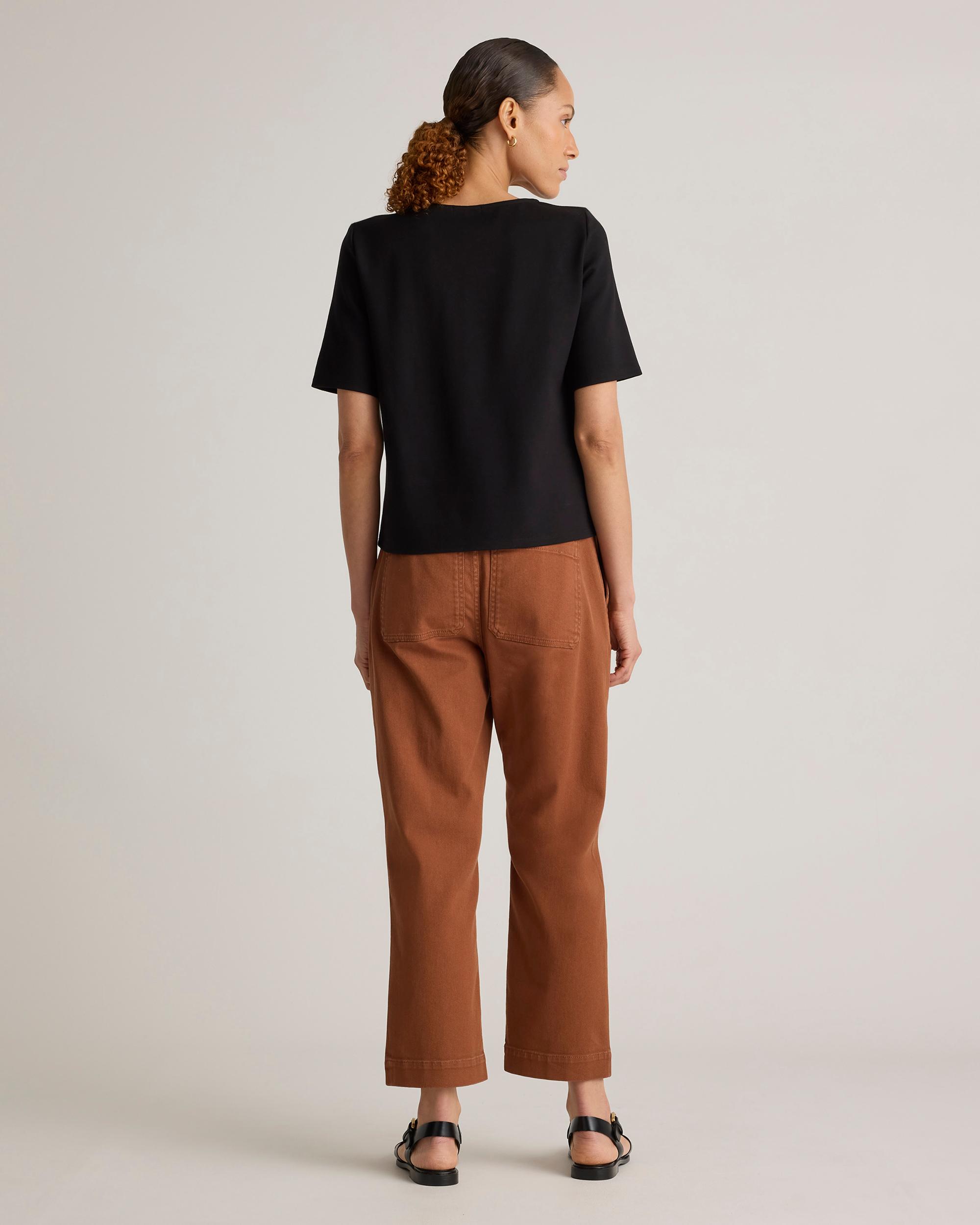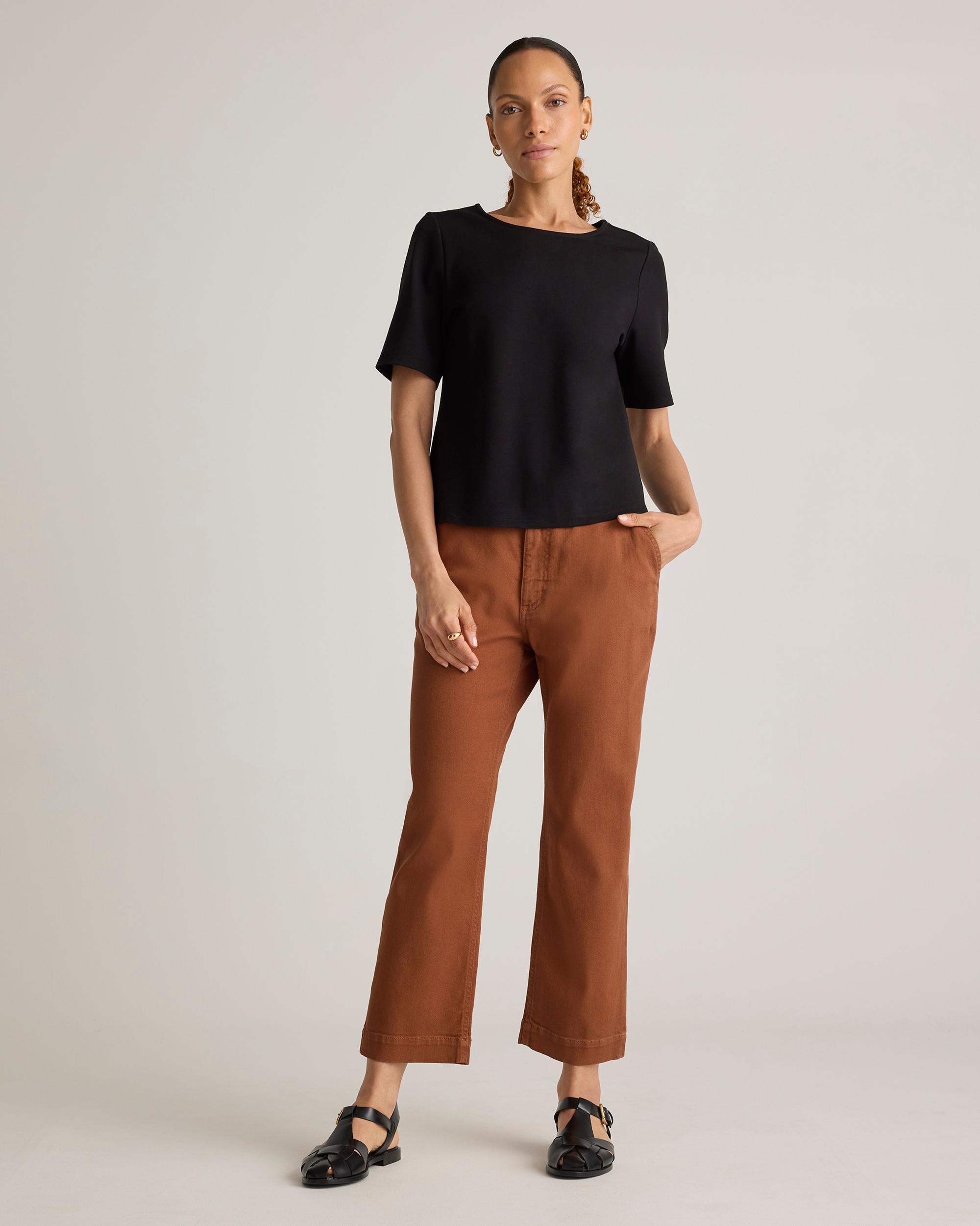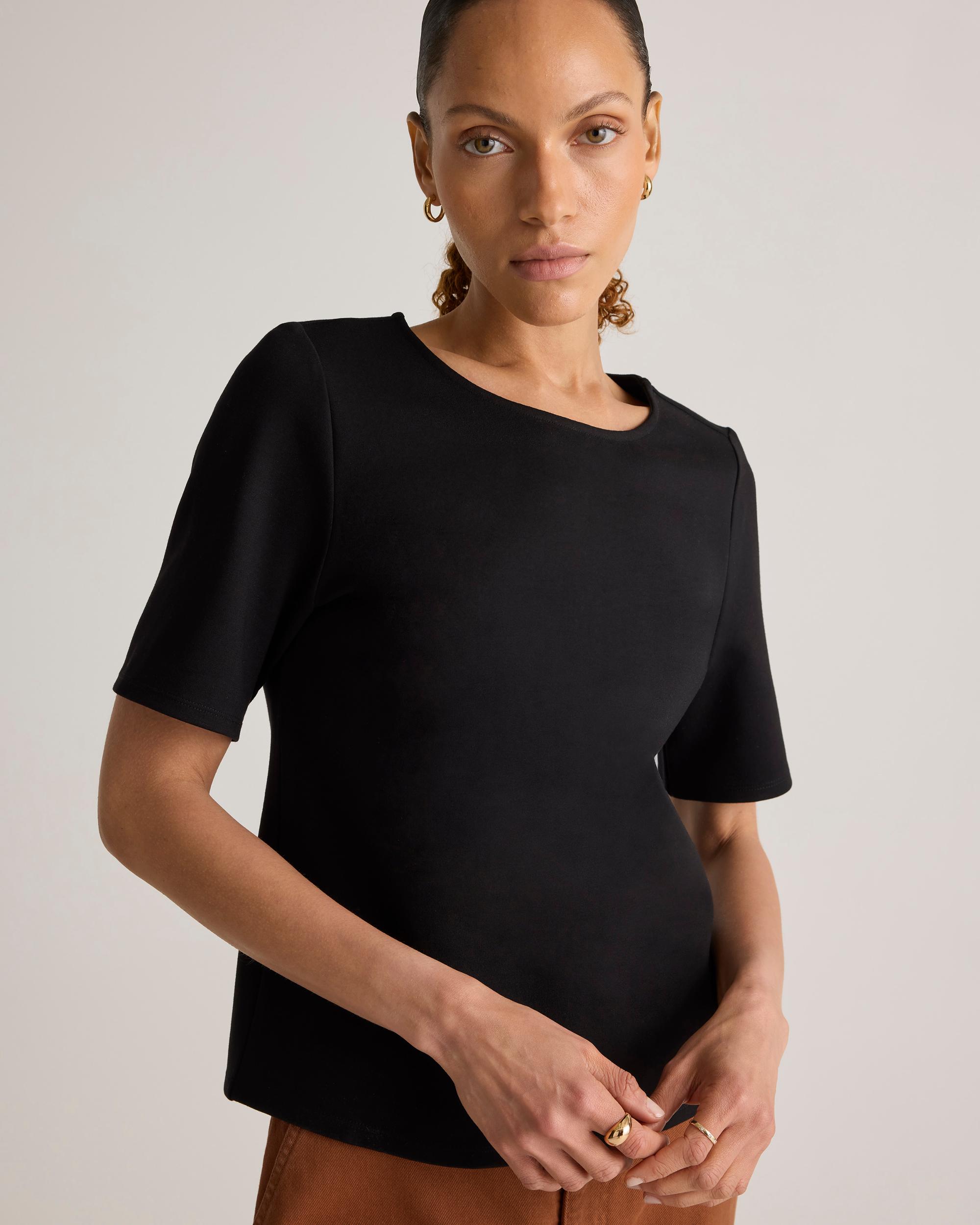 We know you’re going to love this one. Structured look. Stretchy feel. Wrinkle- and pill-resistant. All in our fan-fave double knit ponte fabric with a just-right weight. Dress it up or down, or pair with our best-selling Ponte Pant collection for the complete look. | Quince | Women's Ultra-Stretch Ponte Short Sleeve Top in Black, Size Large, Rayon