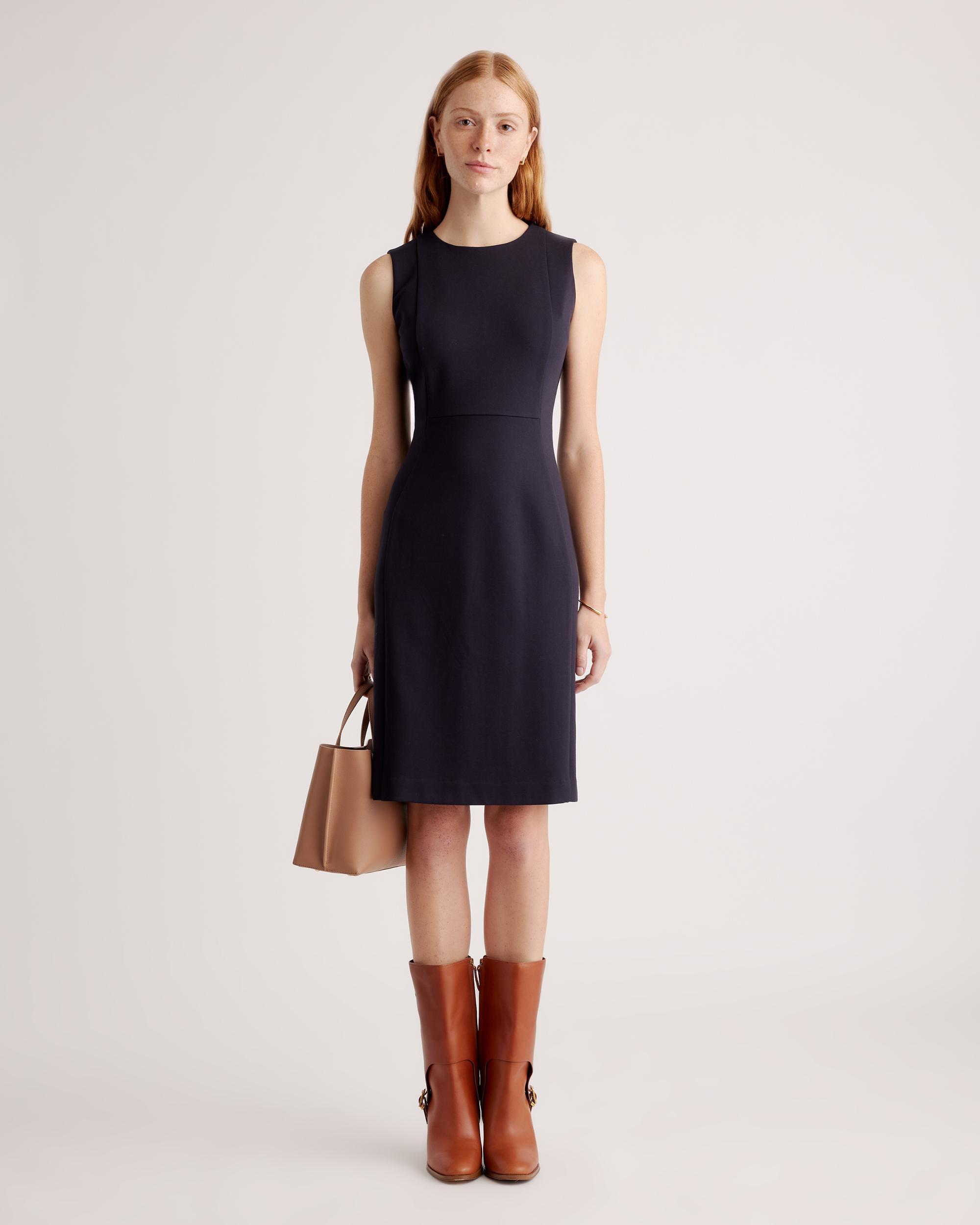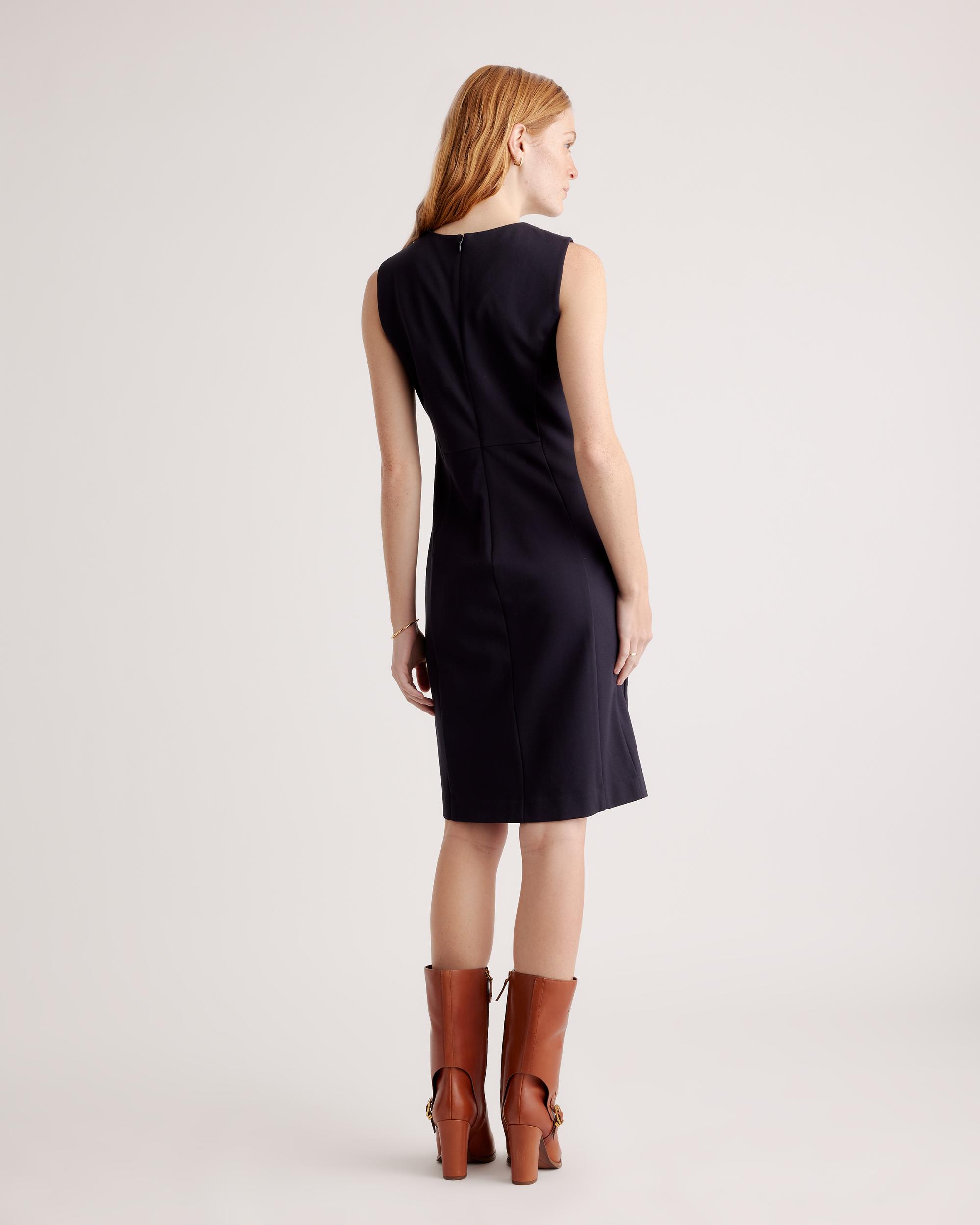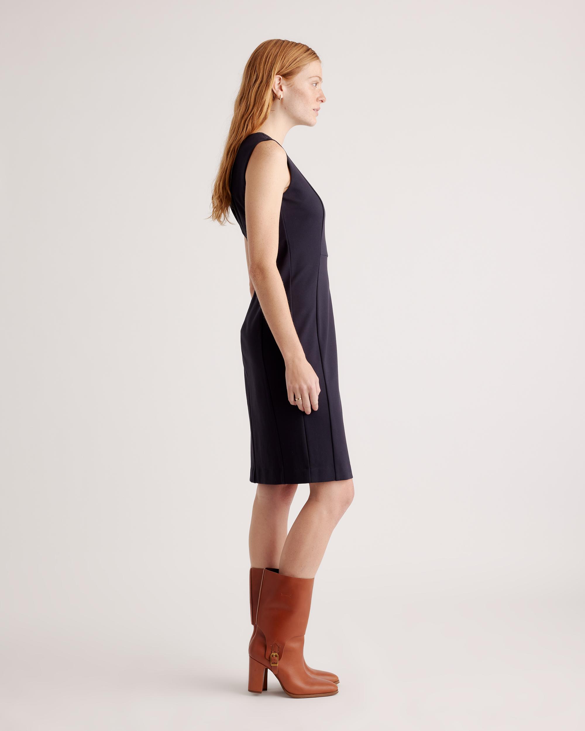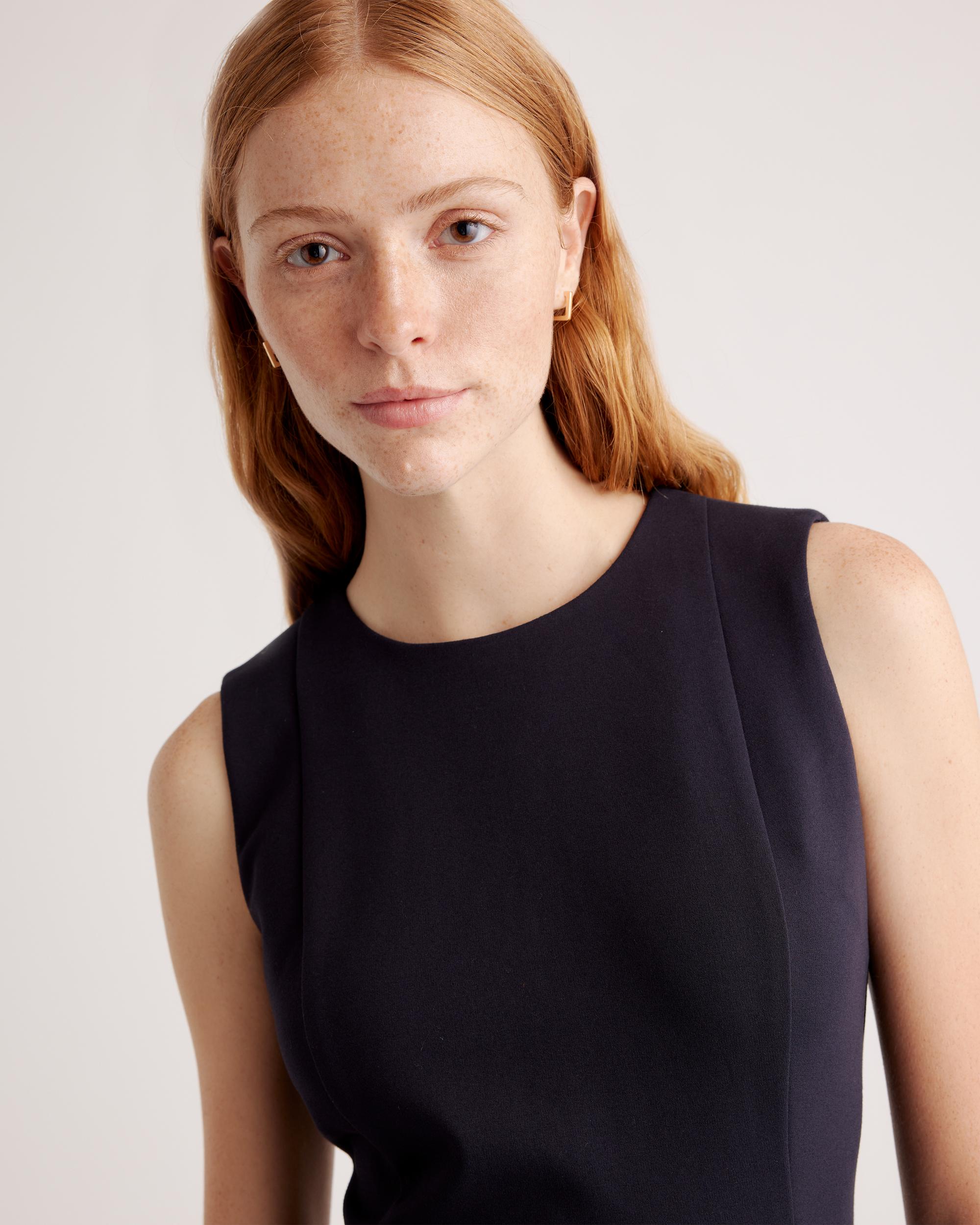 This dress, though. When it comes to something that's super versatile and never going to go out of style, it's all about our Ultra-Stretch Ponte Sleeveless Dress. Made from high-quality double knit ponte fabric, it's stretchy but still polished. We're thinking a day at the office and then a few hours out on the town...because we never want to take it off. If you love this one, you'll also want to check out the Ultra-Stretch Ponte Cap Sleeve Dress version, too. | Quince | Women's Ultra-Stretch Ponte Sleeveless Dress in Navy, Size Medium, Rayon