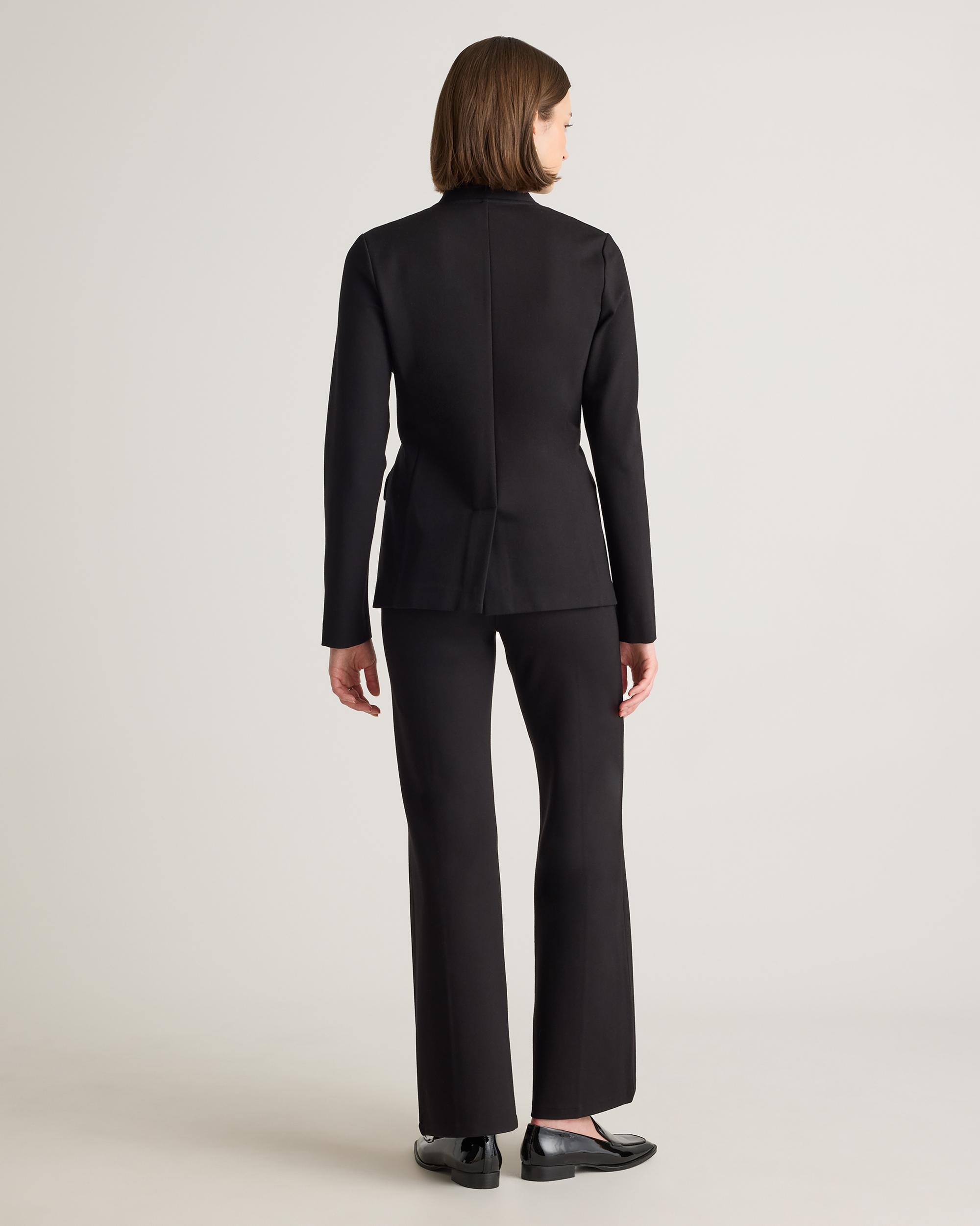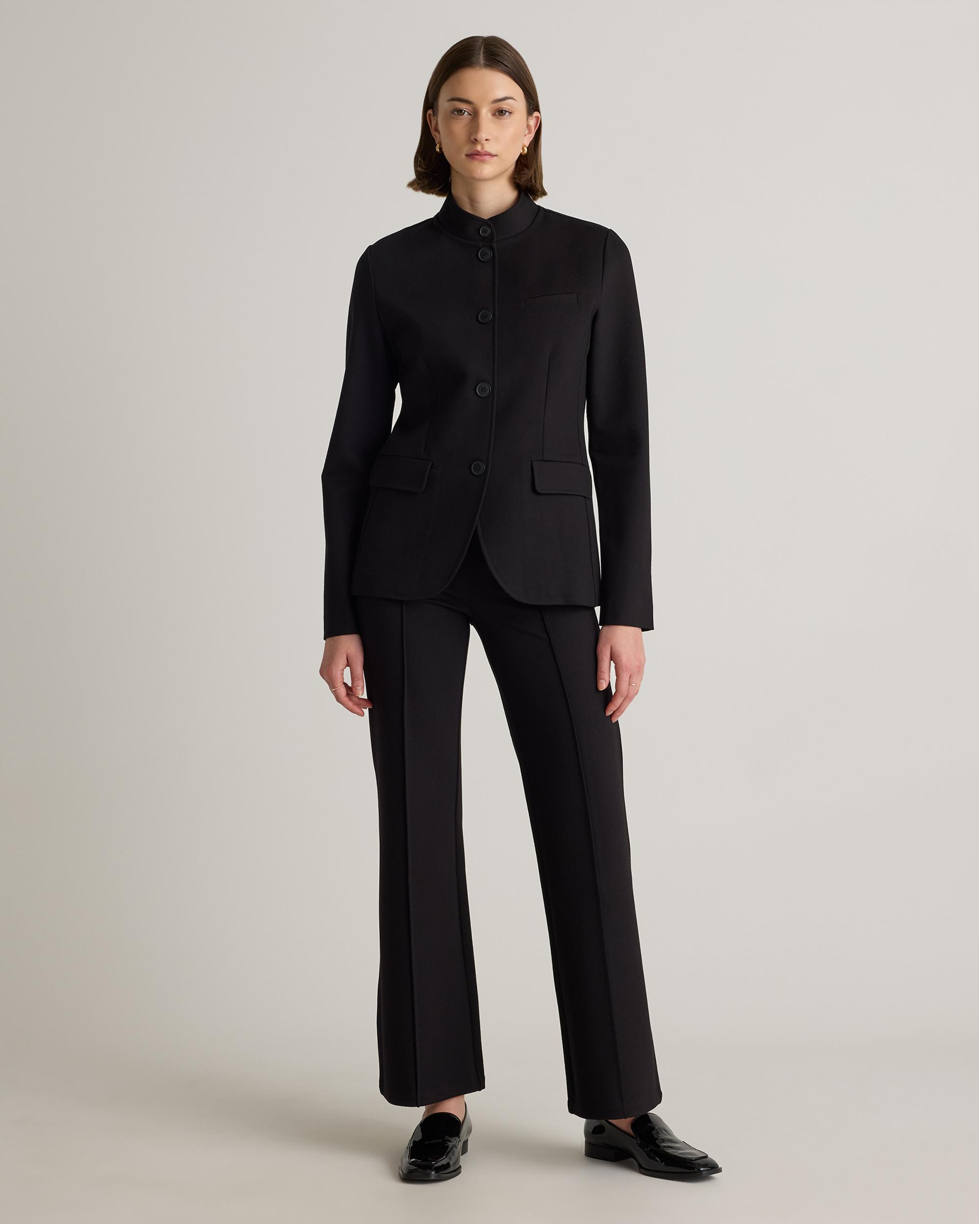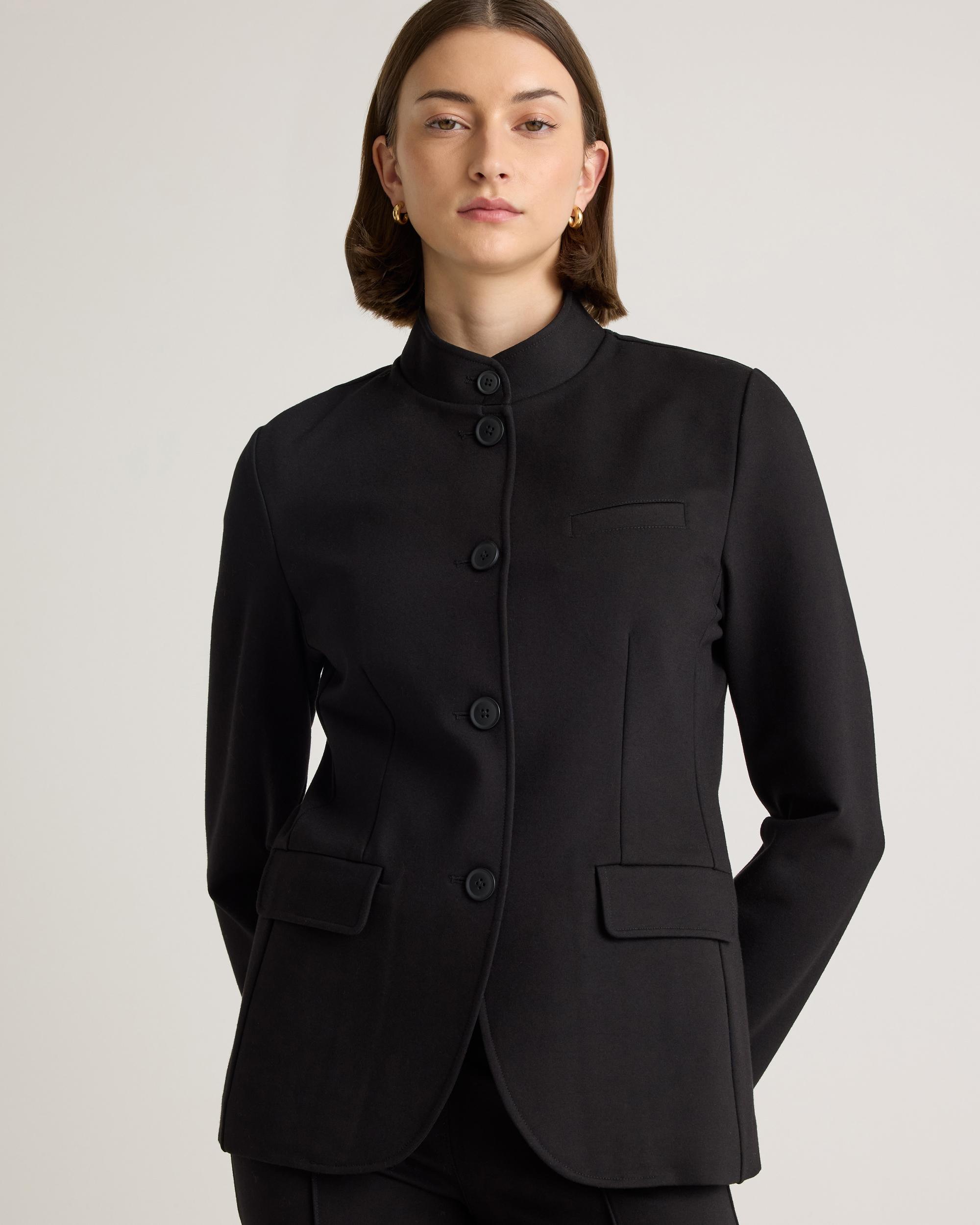 A spin on your classic blazer with our Ultra-Stretch Ponte Stand Collar Blazer. Made from high-quality double knit ponte fabric, it's stretchy but still polished. Featuring a single-breasted button-front closure, practical pockets, and a stand collar, this tailored fit complements both formal and smart-casual outfits. Pair it with any of our ponte bottoms for a complete look. | Quince | Women's Ultra-Stretch Ponte Stand Collar Blazer in Black, Size Medium, Rayon