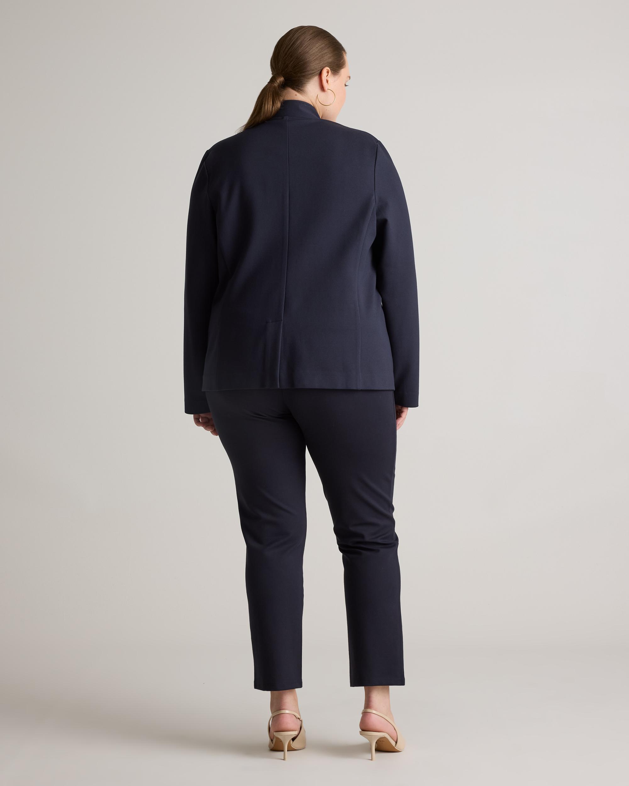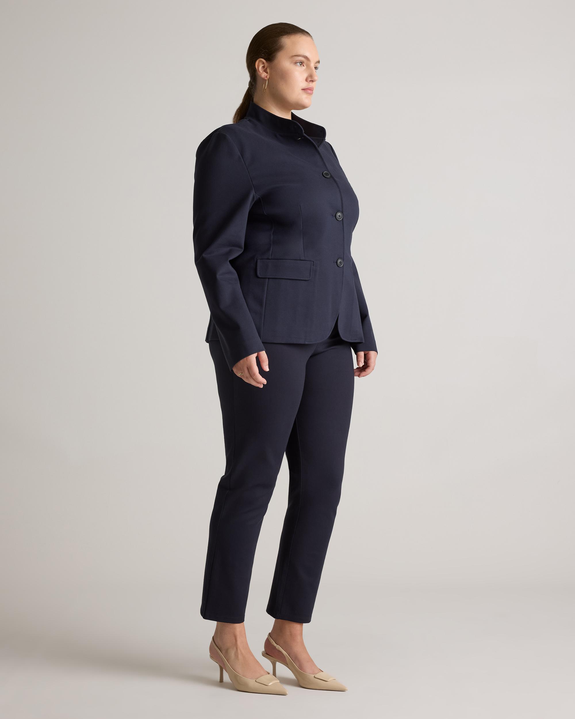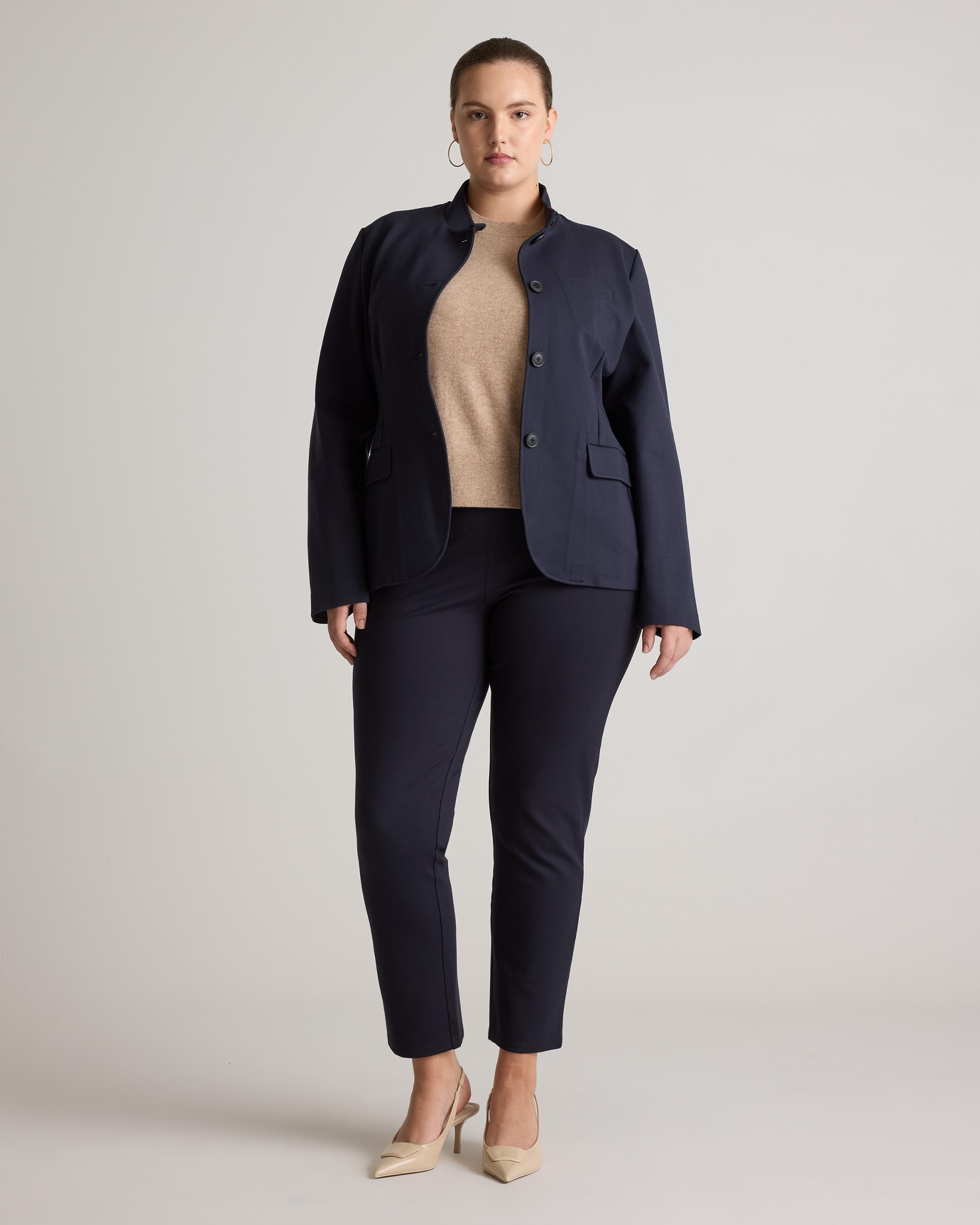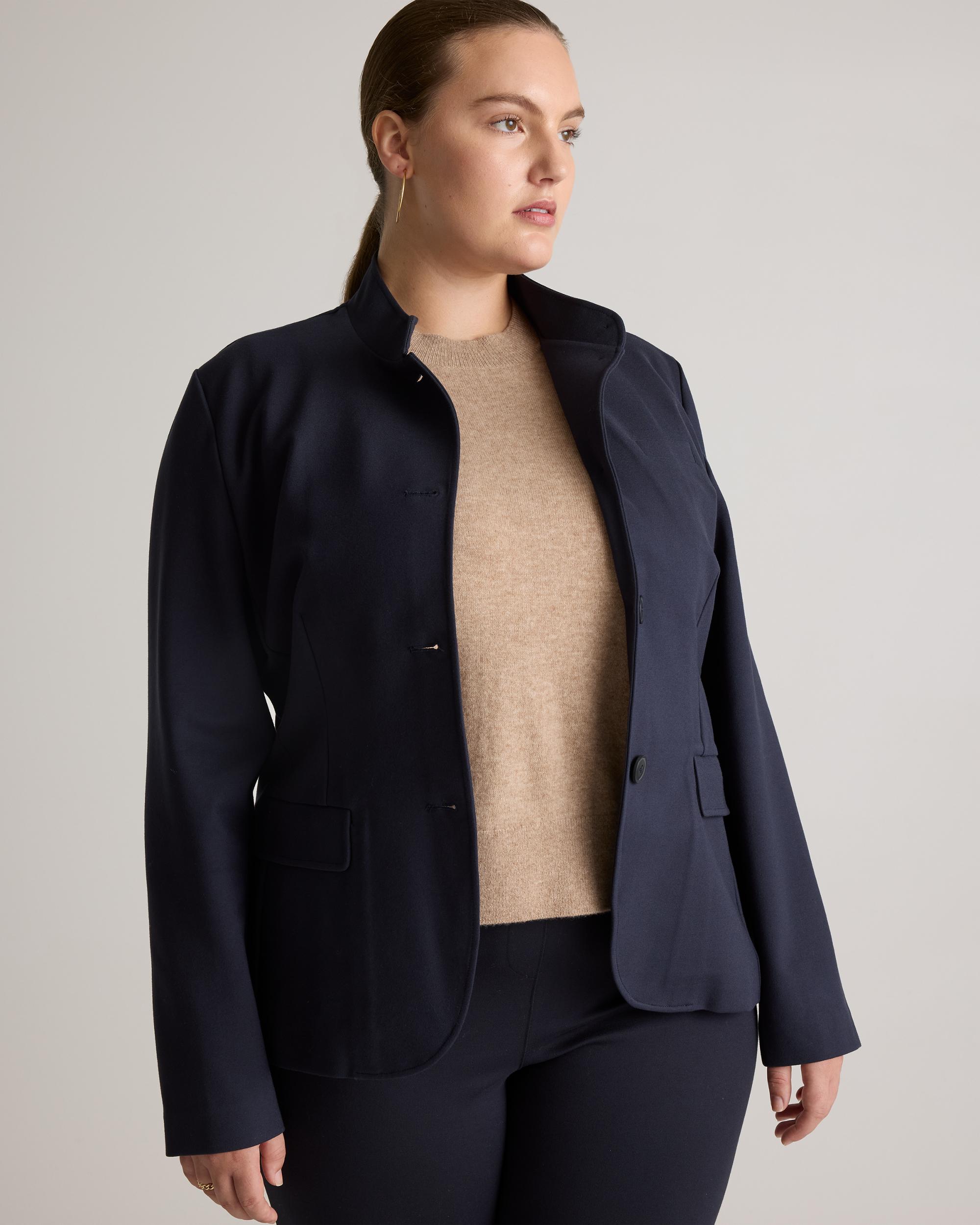 A spin on your classic blazer with our Ultra-Stretch Ponte Stand Collar Blazer. Made from high-quality double knit ponte fabric, it's stretchy but still polished. Featuring a single-breasted button-front closure, practical pockets, and a stand collar, this tailored fit complements both formal and smart-casual outfits. Pair it with any of our ponte bottoms for a complete look. | Quince | Women's Ultra-Stretch Ponte Stand Collar Blazer in Navy, Size Large, Rayon