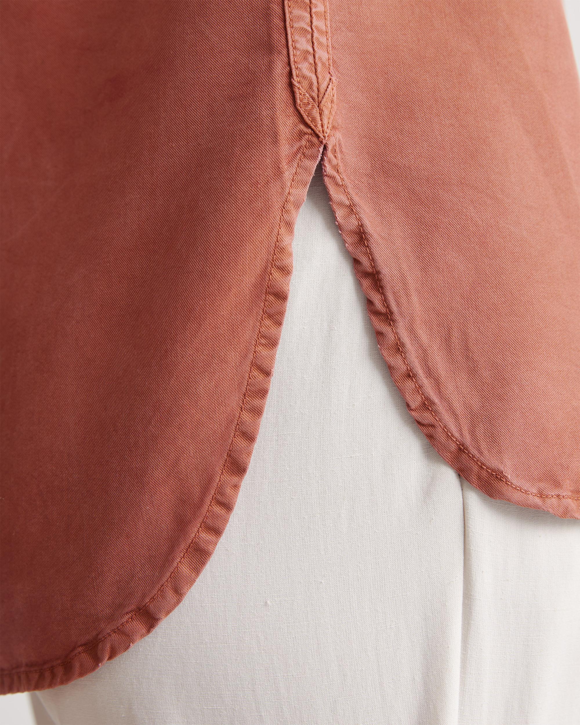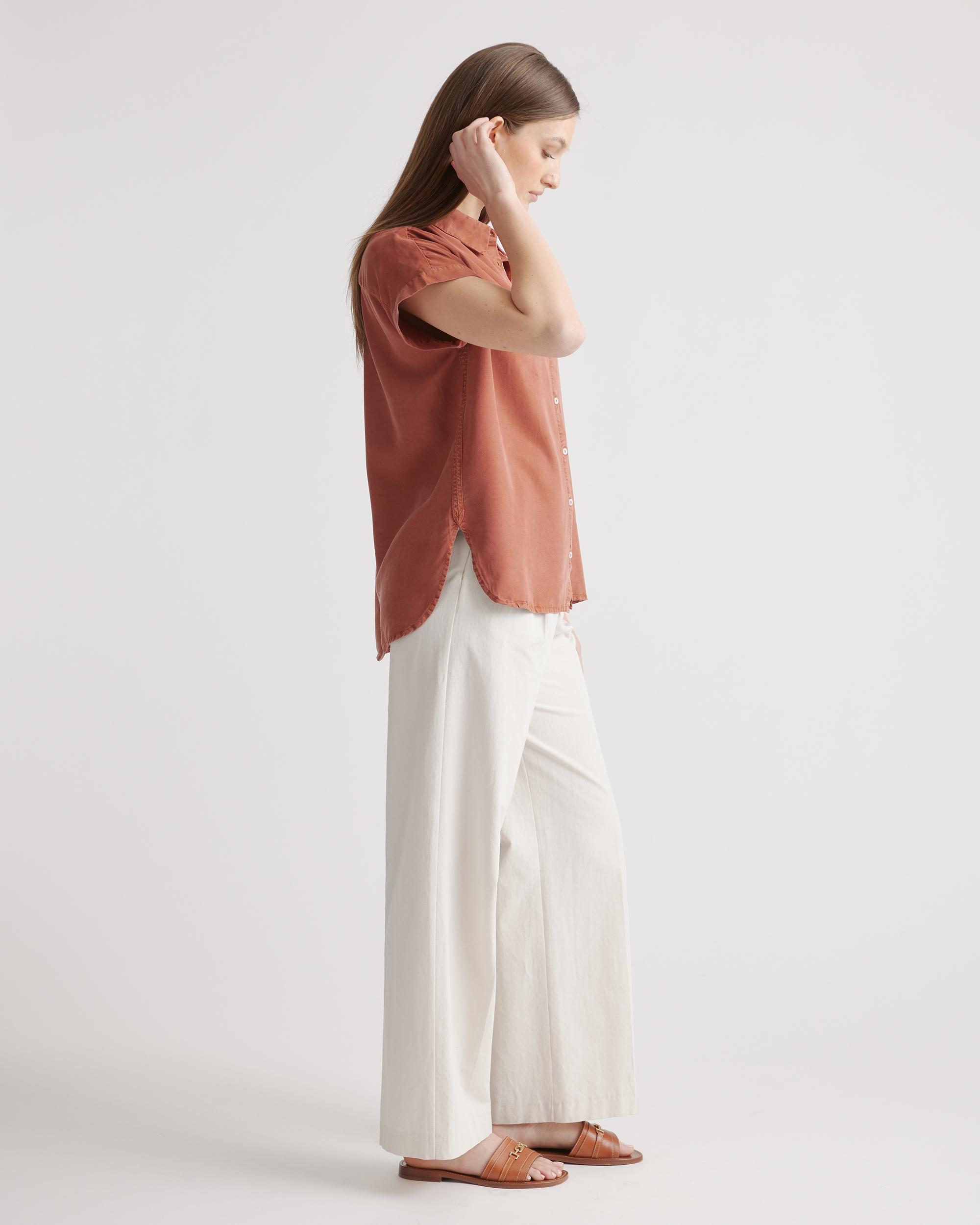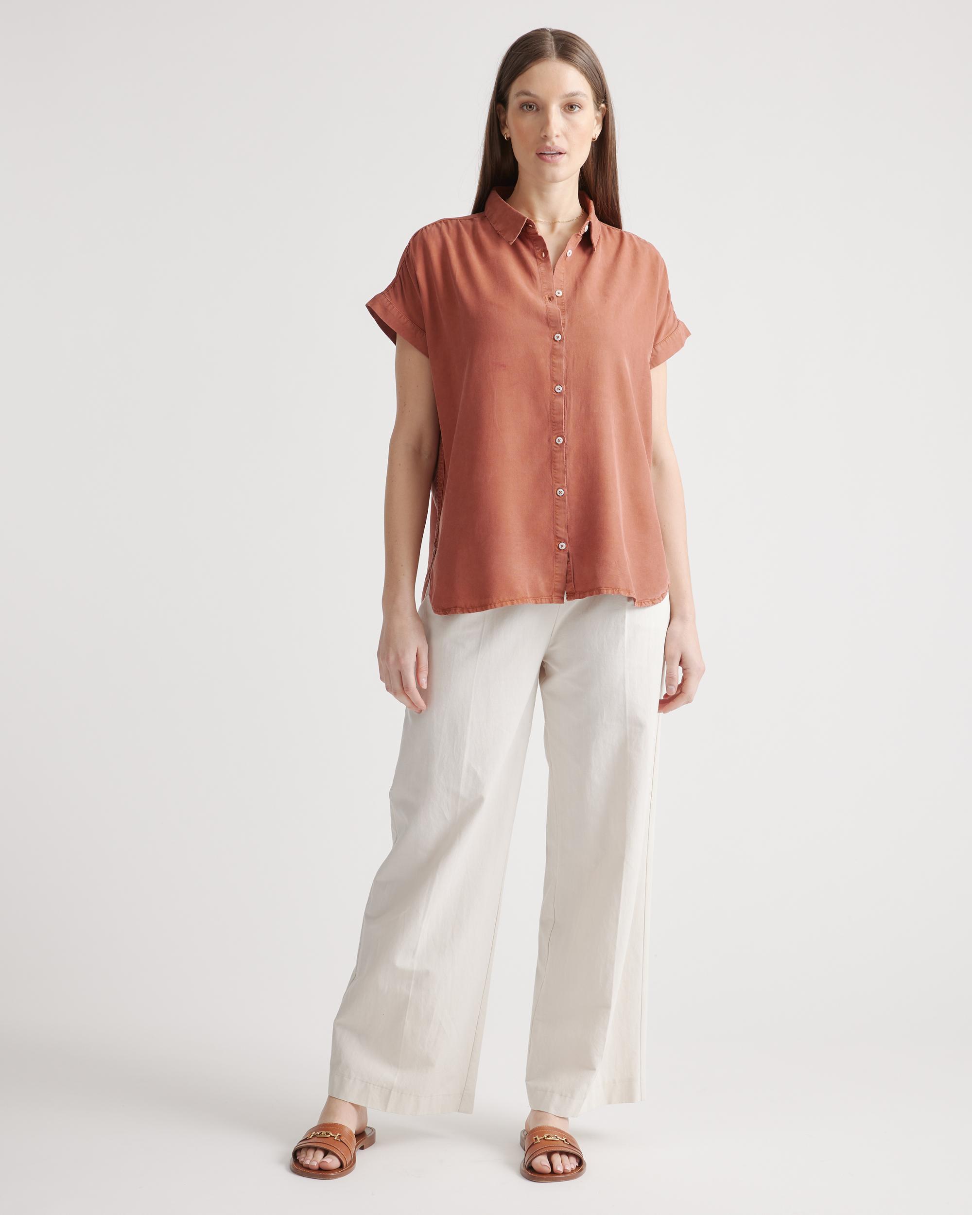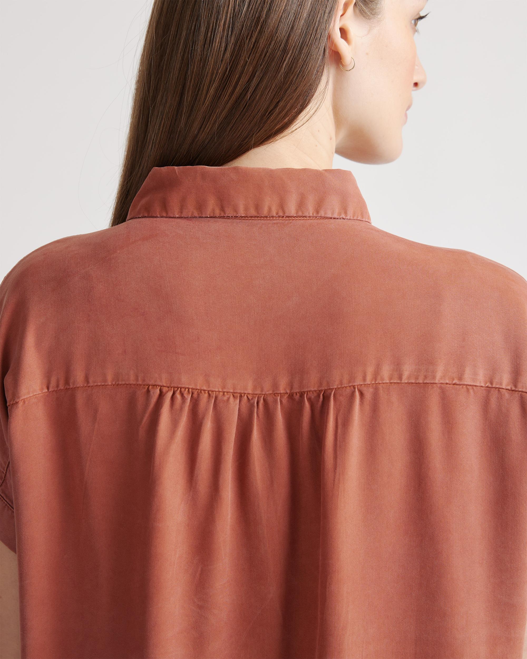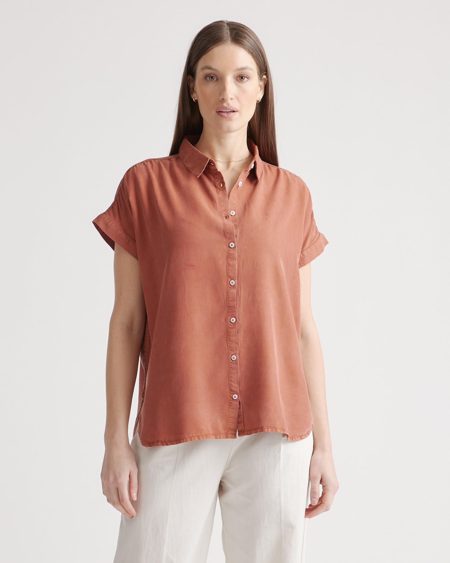 We're giving camp vibes in this slightly oversized shirt. With an effortless look and premium drape, the silhouette features a subtle collar and easy, open sleeves an extra comfy fit. Lyocell is a biodegradable fabric made from cellulose found in wood pulp. It is softer, more breathable, and uses 10-20 times less water in production compared to cotton. | Quince | Women's Vintage Wash Tencel Camp Shirt in Terracotta, Size Small
