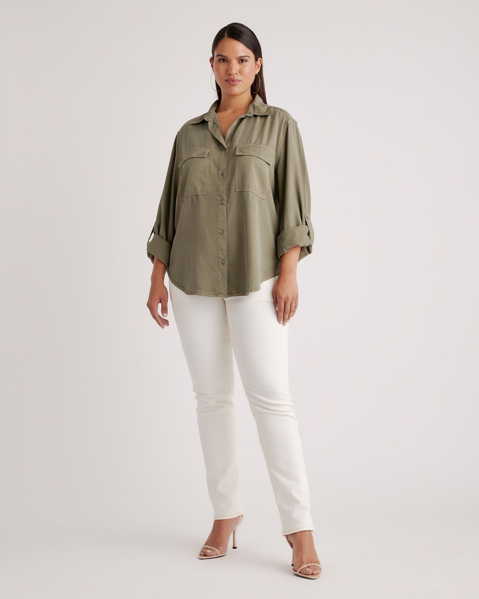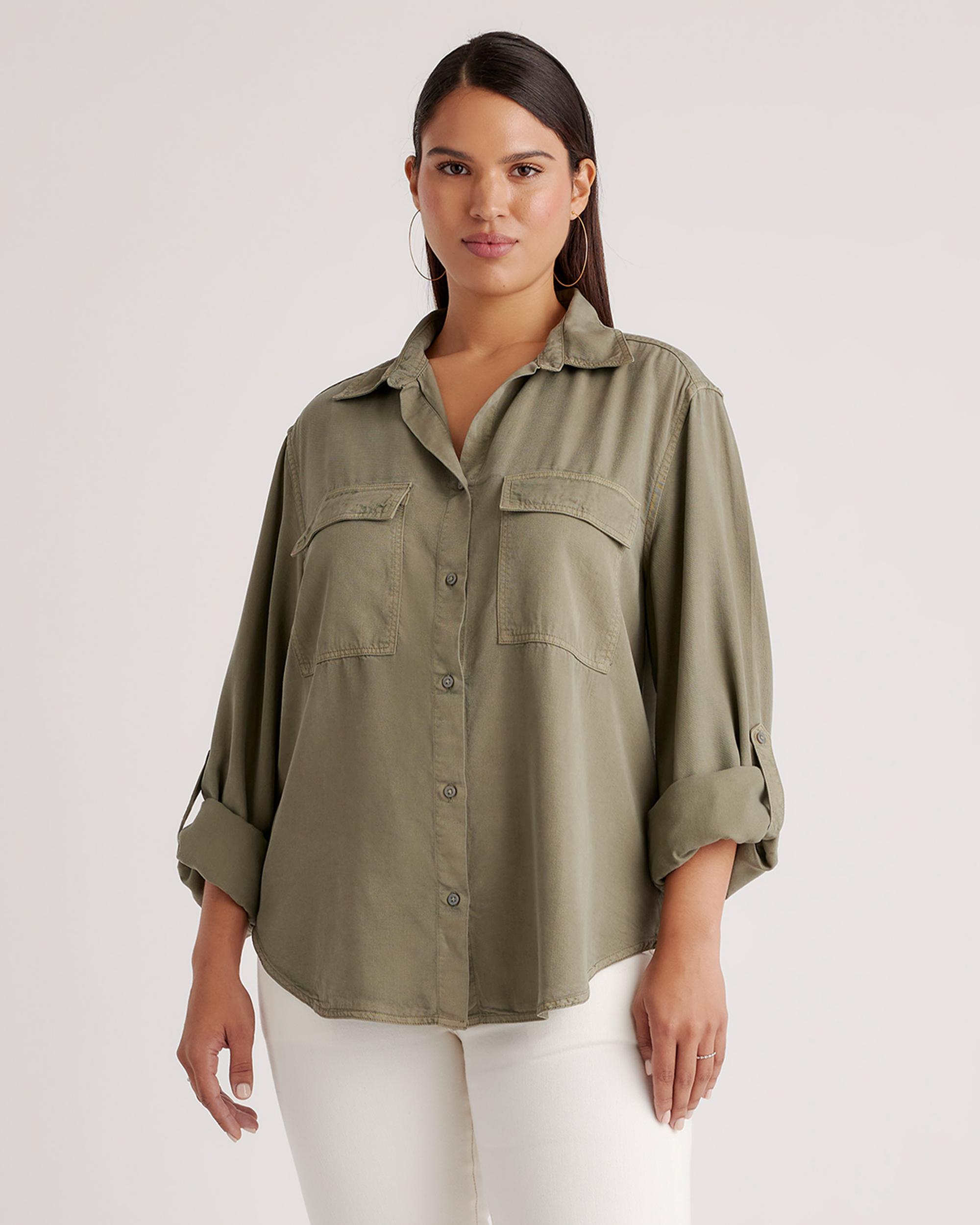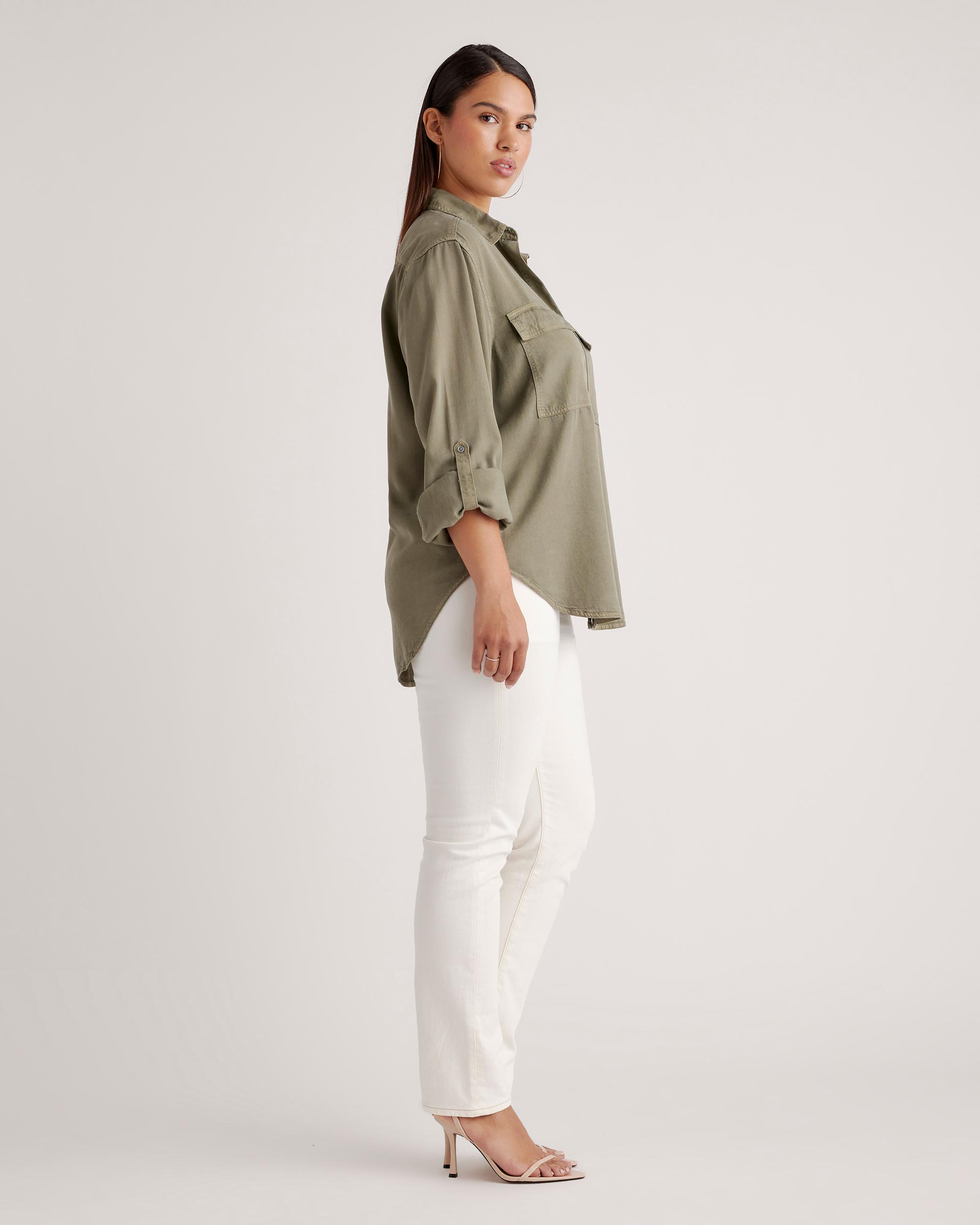 We made a classic even better in our soft, sustainably sourced Tencel™ fabric. Crafted with care, our Vintage Wash Tencel Utility Shirt combines fashion with function. Garment-dyed for a lived-in look, this comfy shirt has a fluid feel and an effortless look that works any day (or night) of the week—and with sleeves that can be rolled up and secured with a tab, you've got even more styling options. | Quince | Women's Vintage Wash Tencel Utility Shirt in Olive, Size XS