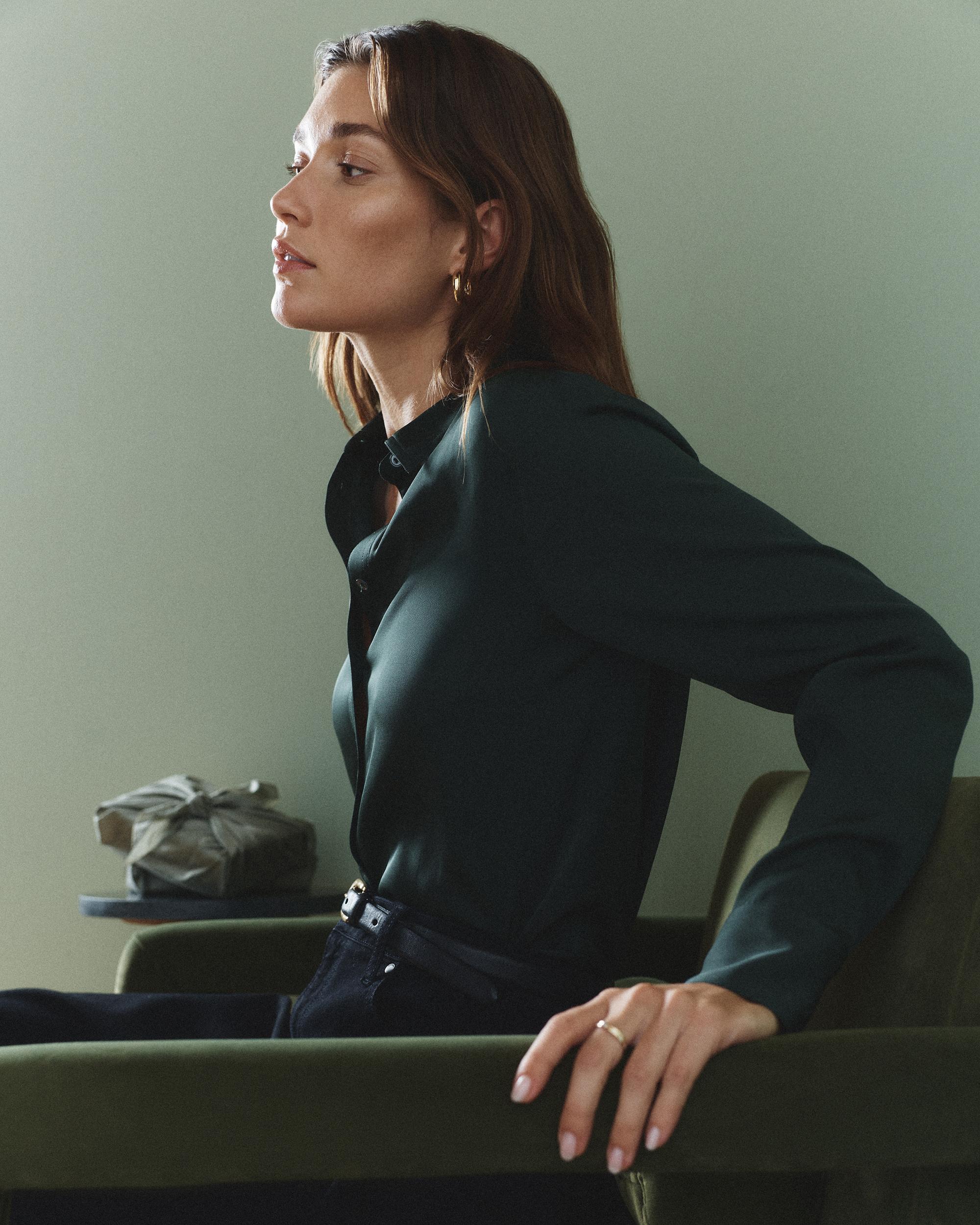 Stretch silk that you can wash? Just for you. This classic silk blouse has a bit of stretch for a more forgiving fit and additional versatility. Perfect for work meetings, or stepping out to brunch. Plus, silk fiber contains 18 kinds of amino acids that make it amazing for skin nourishment, hypo-allergenic, and naturally thermoregulating to help maintain body temperature. | Quince | Women's Washable Stretch Silk Blouse in Forest Green, Size Large