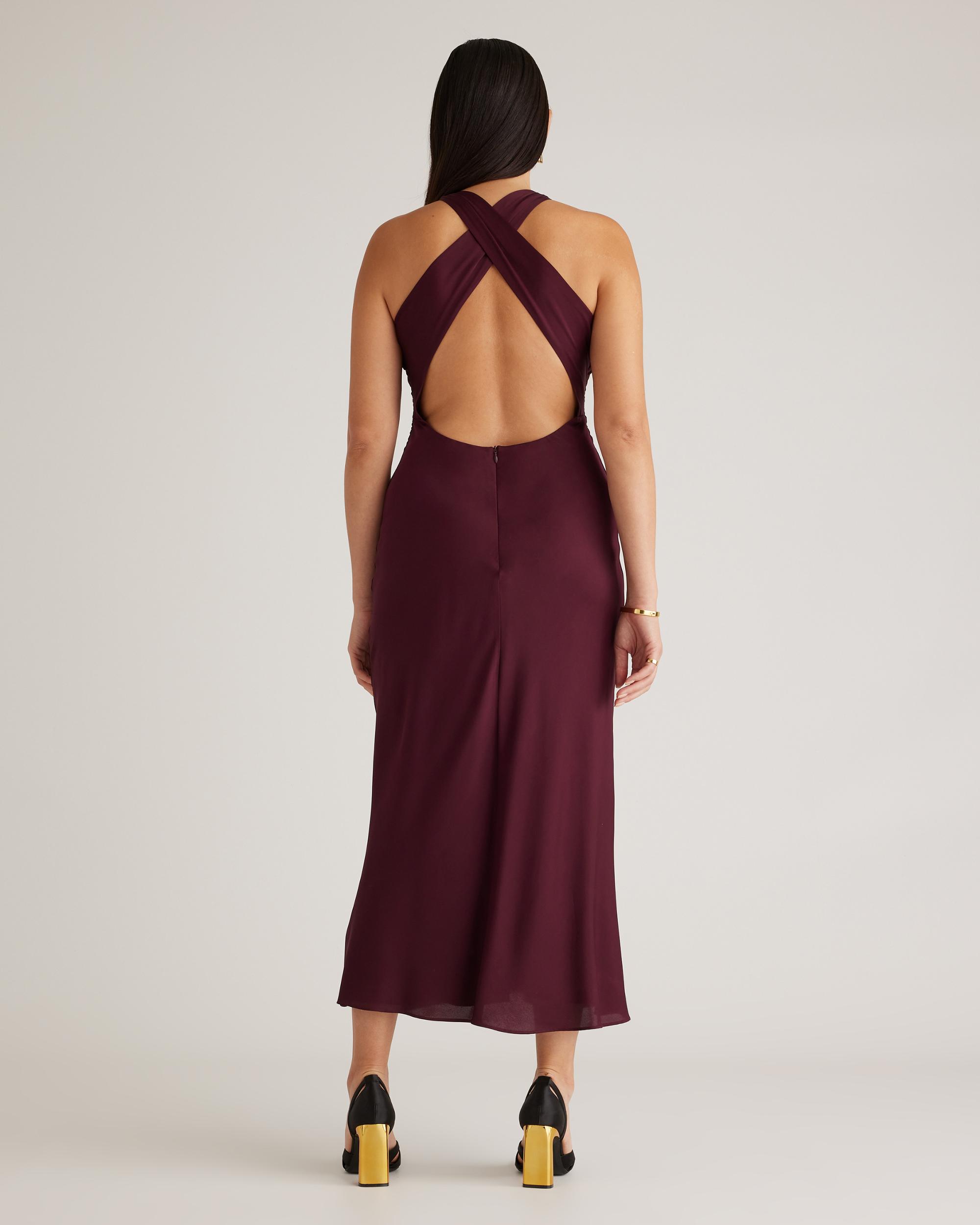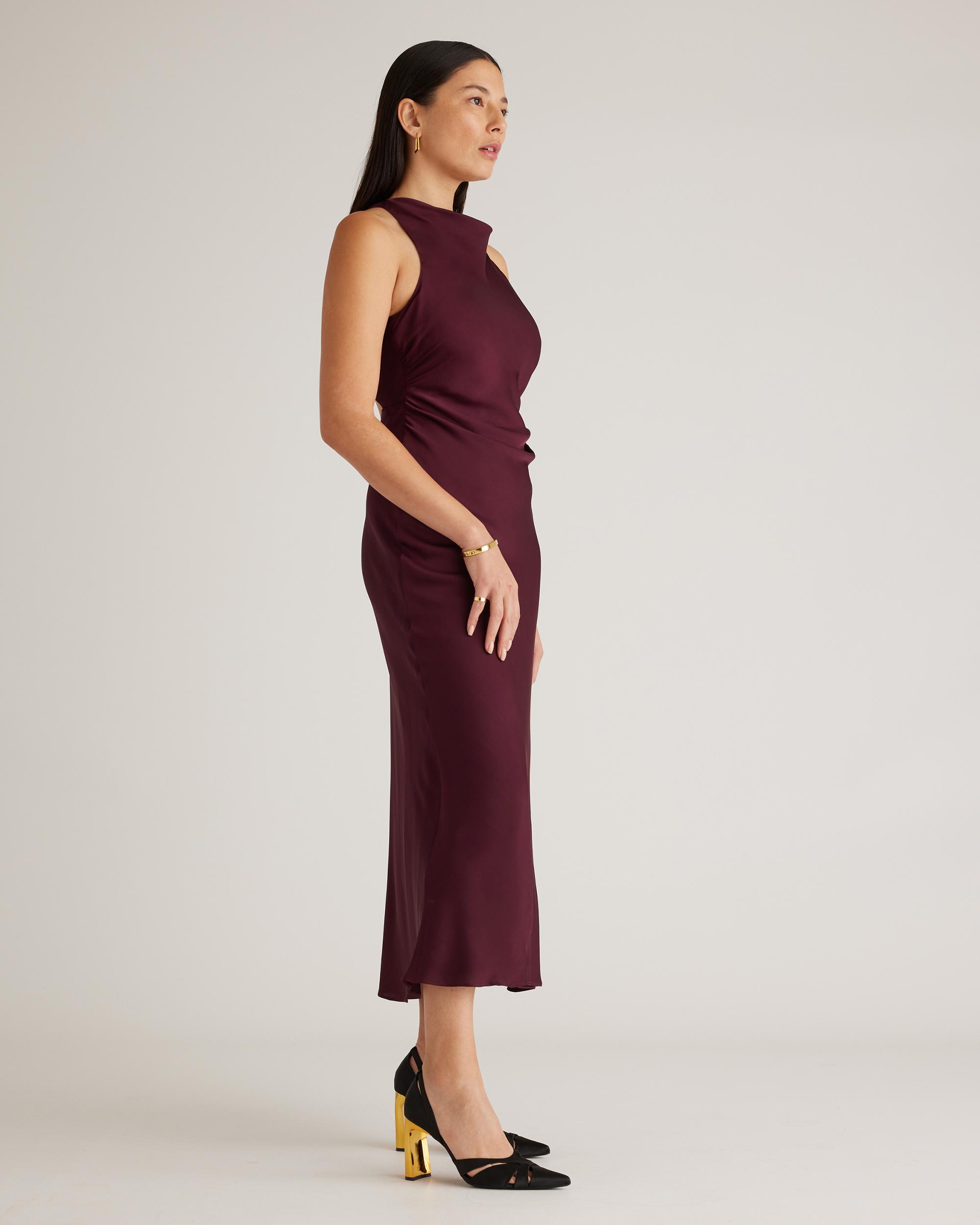 A new capsule must: our Washable Stretch Silk High Neck Midi Dress. Designed with a classic high neck and a flattering silhouette, this dress is cinched at the waist with crossed shoulder straps in the back. Like all of our silk, it’s washable, hypoallergenic, and thermoregulating to keep you comfortable. | Quince | Women's Washable Stretch Silk High Neck Midi Dress in Wine Tasting Red, Size Small, Mulberry Silk