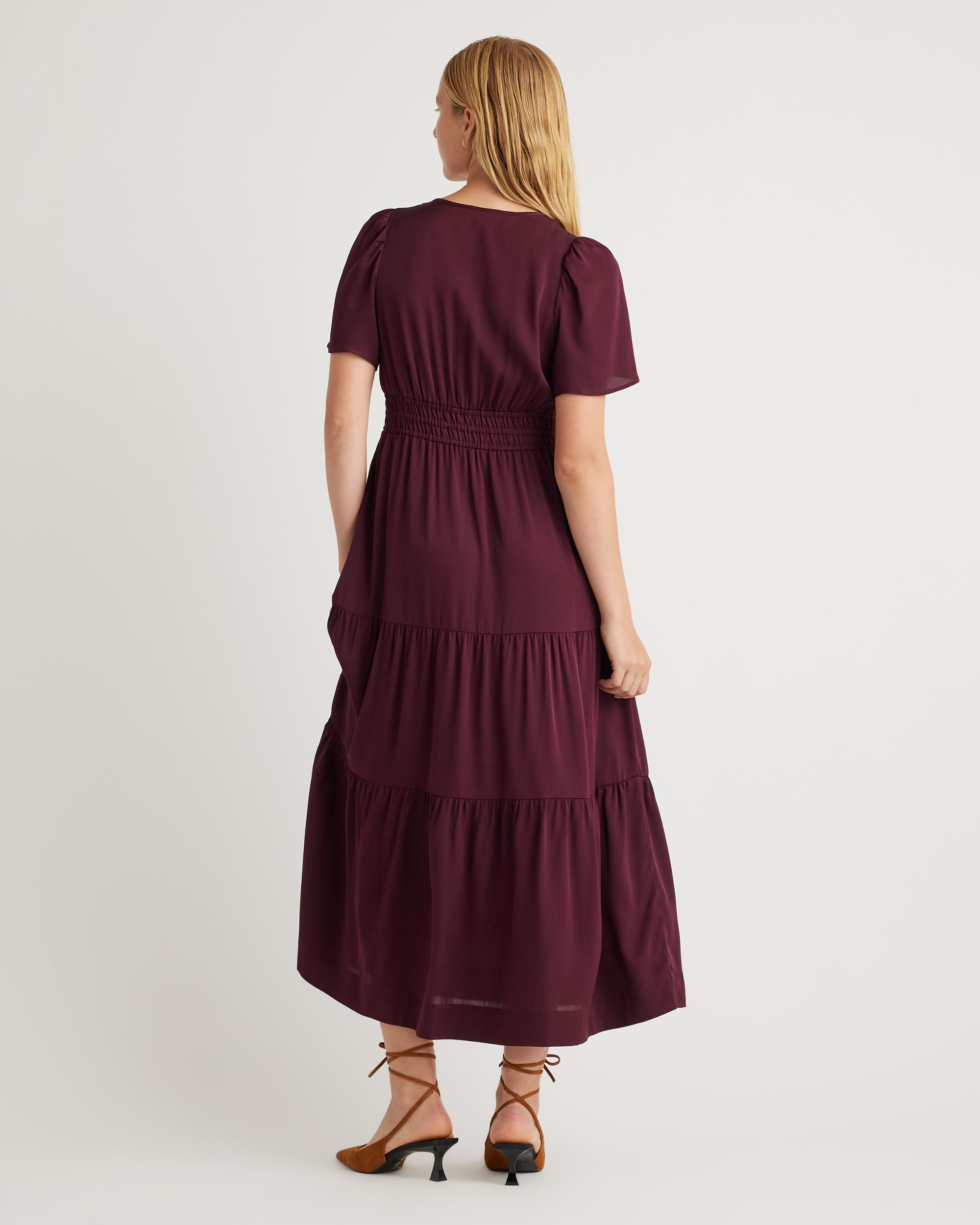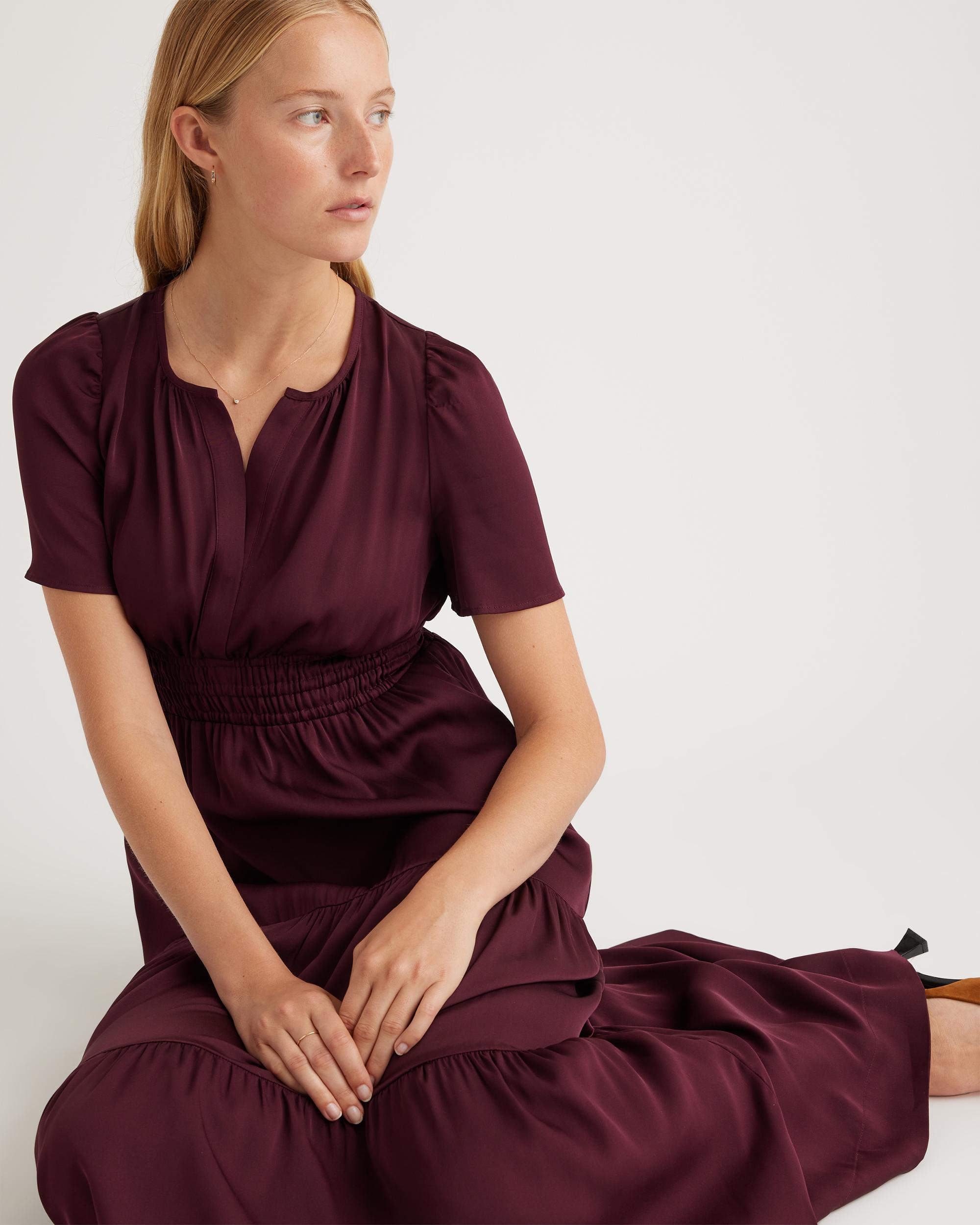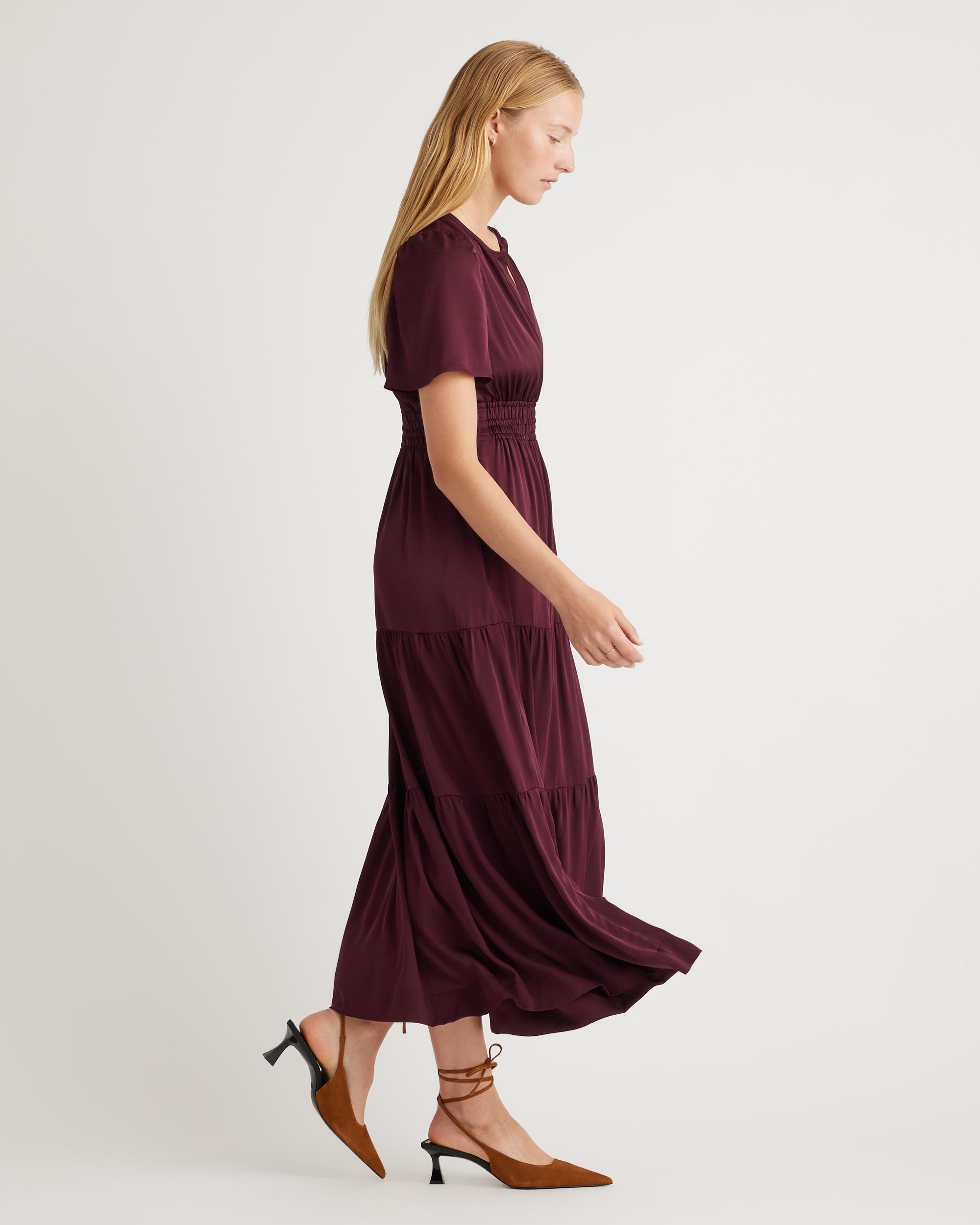 This tiered maxi goes with the flow thanks to its fluid tiered silhouette and flexibility to dress up or dress down. Short sleeves make it wearable year-round, and a smocked waistband gives it an extra-comfortable fit. Our bestselling premium mulberry silk with a hint of stretch is low-maintenance and washable. Plus, silk fiber contains 18 kinds of amino acids that make it amazing for skin nourishment, hypo-allergenic, and naturally thermoregulating to help maintain body temperature. | Quince | Women's Washable Stretch Silk Tiered Maxi Dress in Wine Tasting Red, Size Large