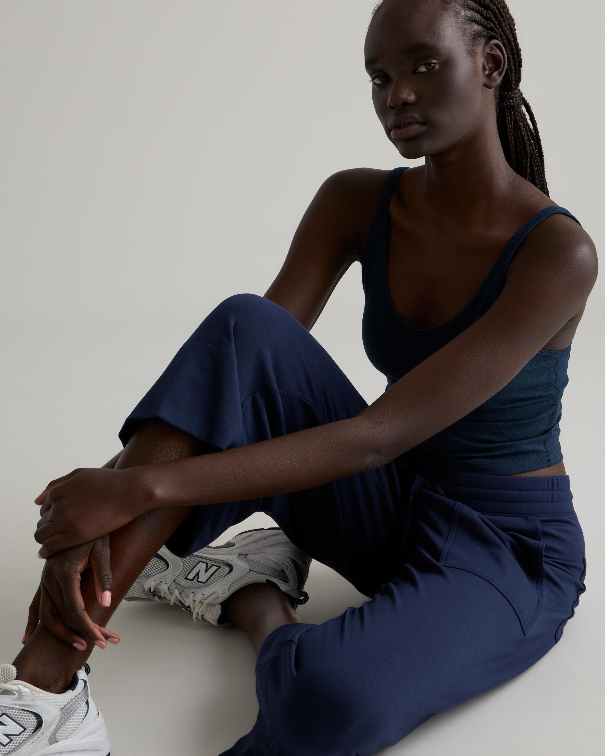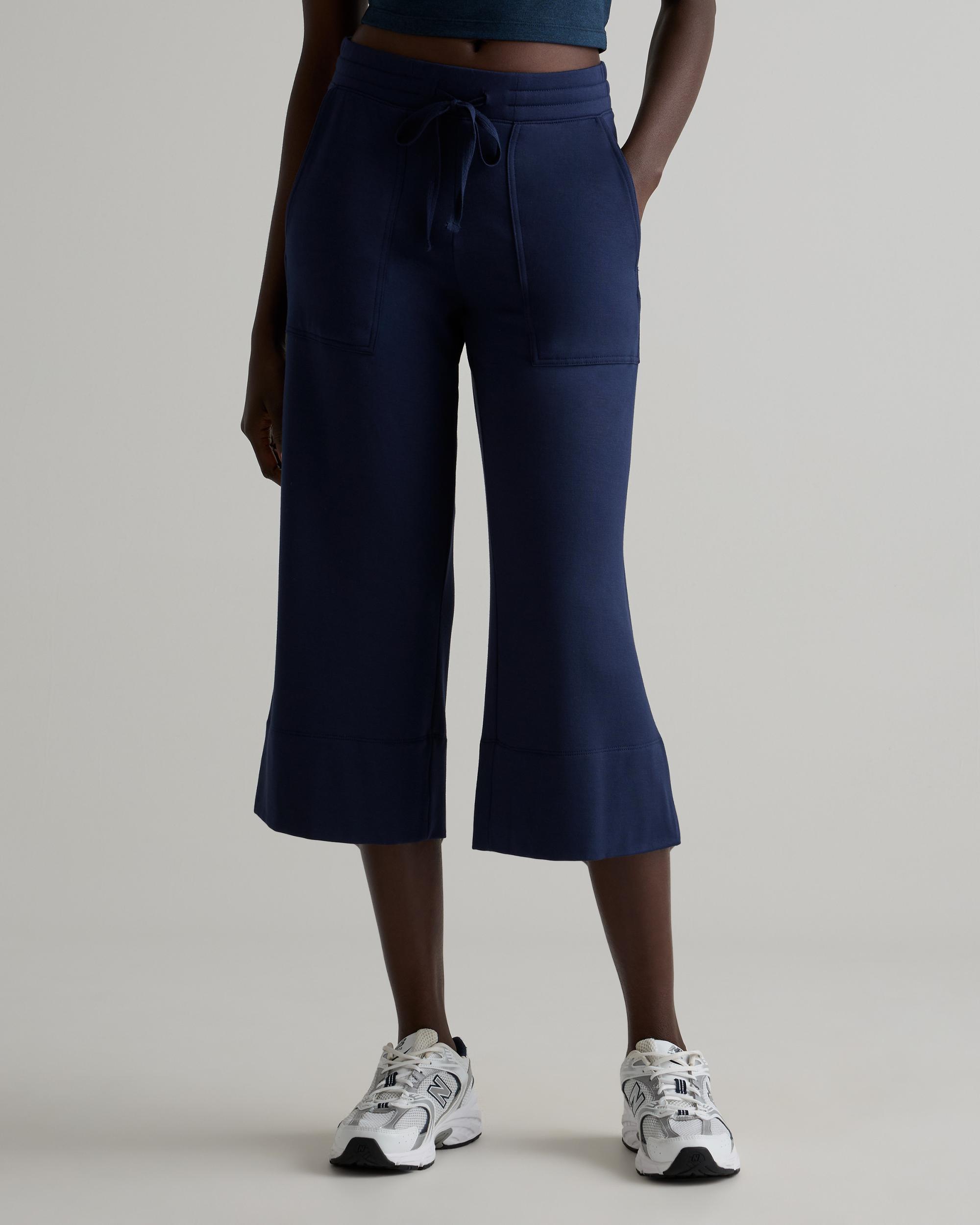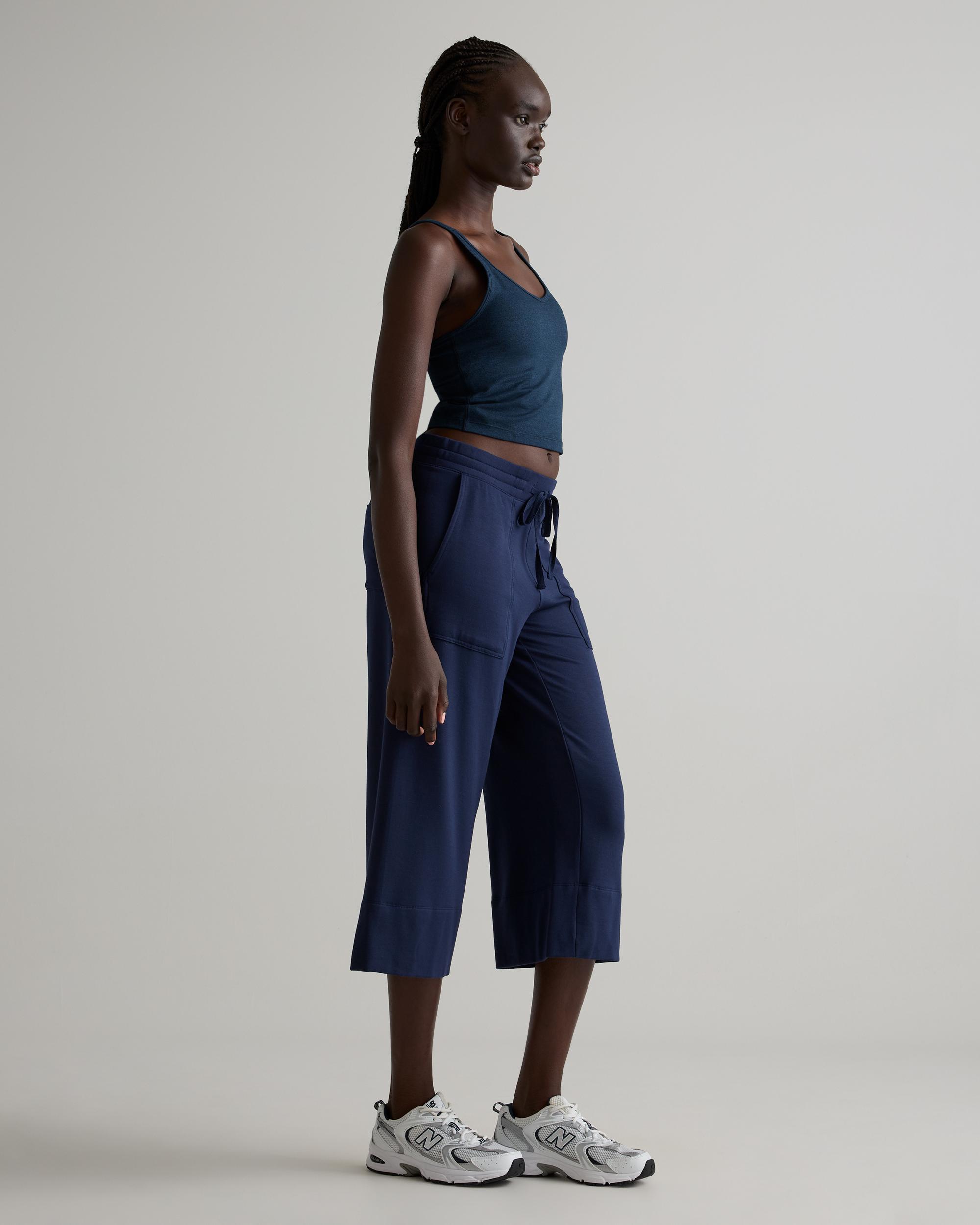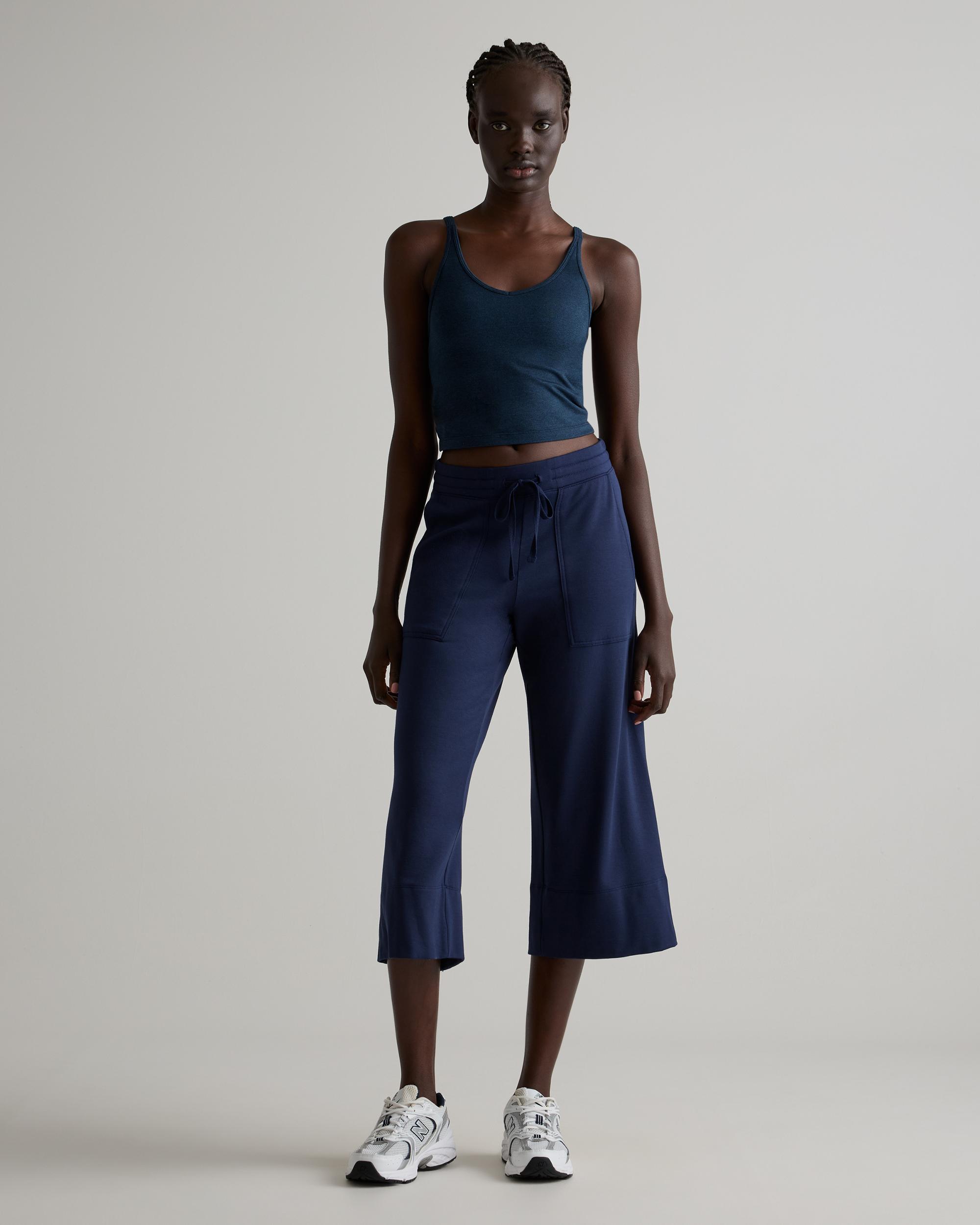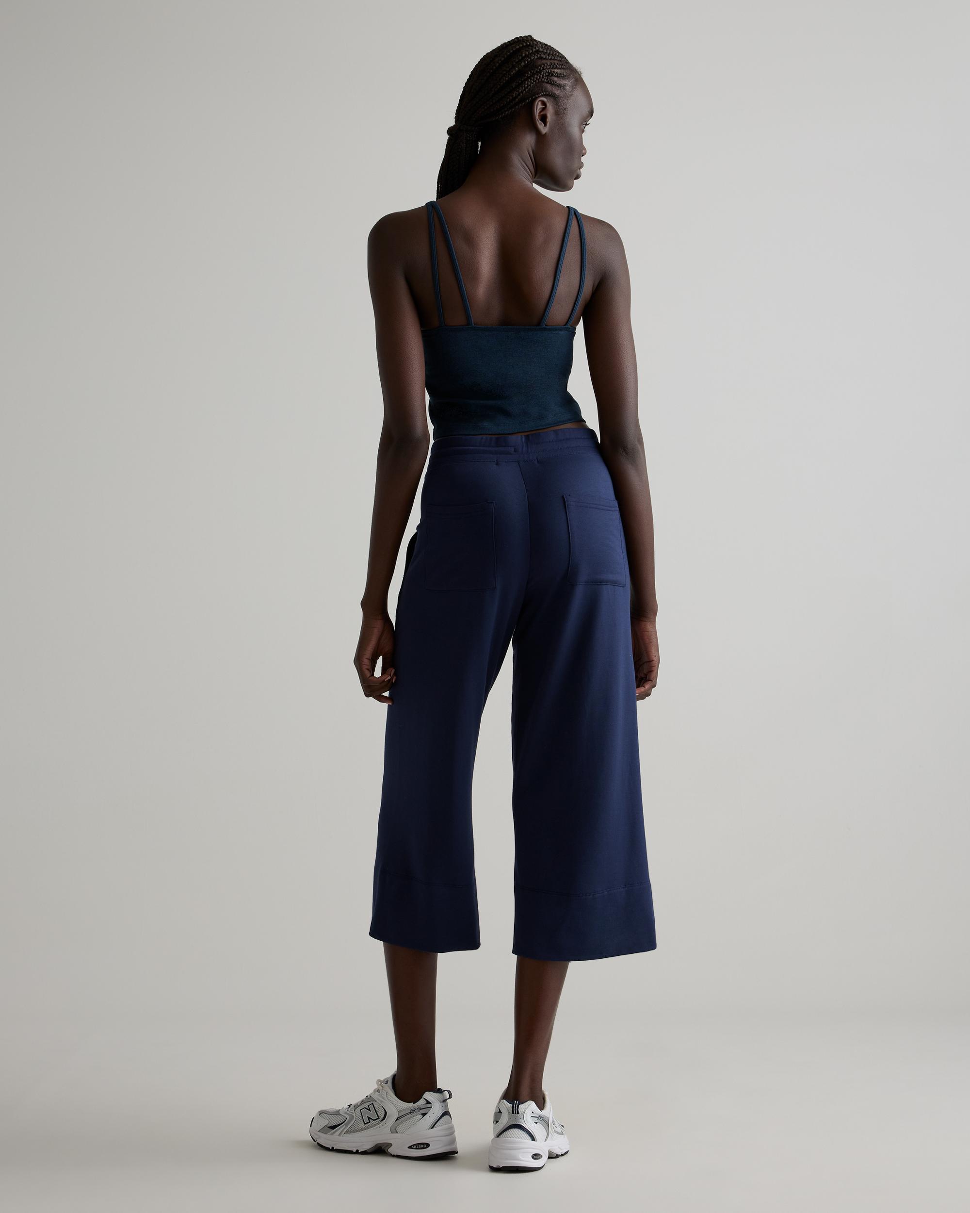Welcome to next-level comfort from our SuperSoft fleece. These women's wide leg pants have stretch and feature front and back pockets for extra versatility. Plus, we included our GRS-certified poly yarn in this blend, which diverts plastics from ocean and landfill. So you can look good and feel good in this piece. Also offered in sizes 1X-3X. | Quince | Women's Wide Leg Fleece SweatPants in Navy, Supersoft Fleece Lounge Pants Capri, Size XL, Lenzing Modal