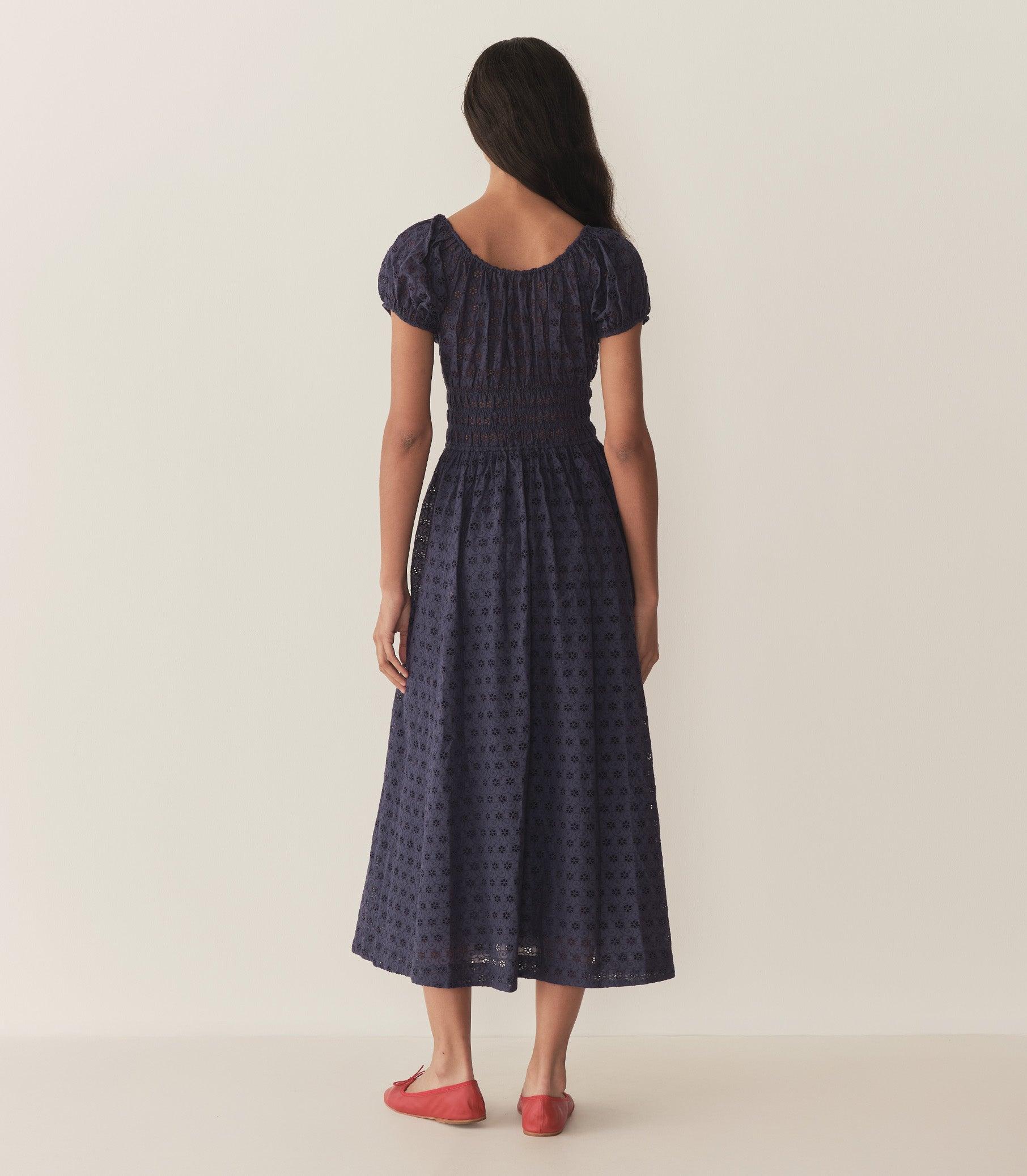 We’ve reimagined our forever-favorite Quinn Dress in a lightweight organic cotton voile with allover eyelet embroidery. The Quinn features a scoop neckline with an adjustable tie and playful keyhole detail, a gathered bust, and short puffed sleeves. A fitted bodice with elasticized smocking gives way to a fully lined, midi-length skirt.