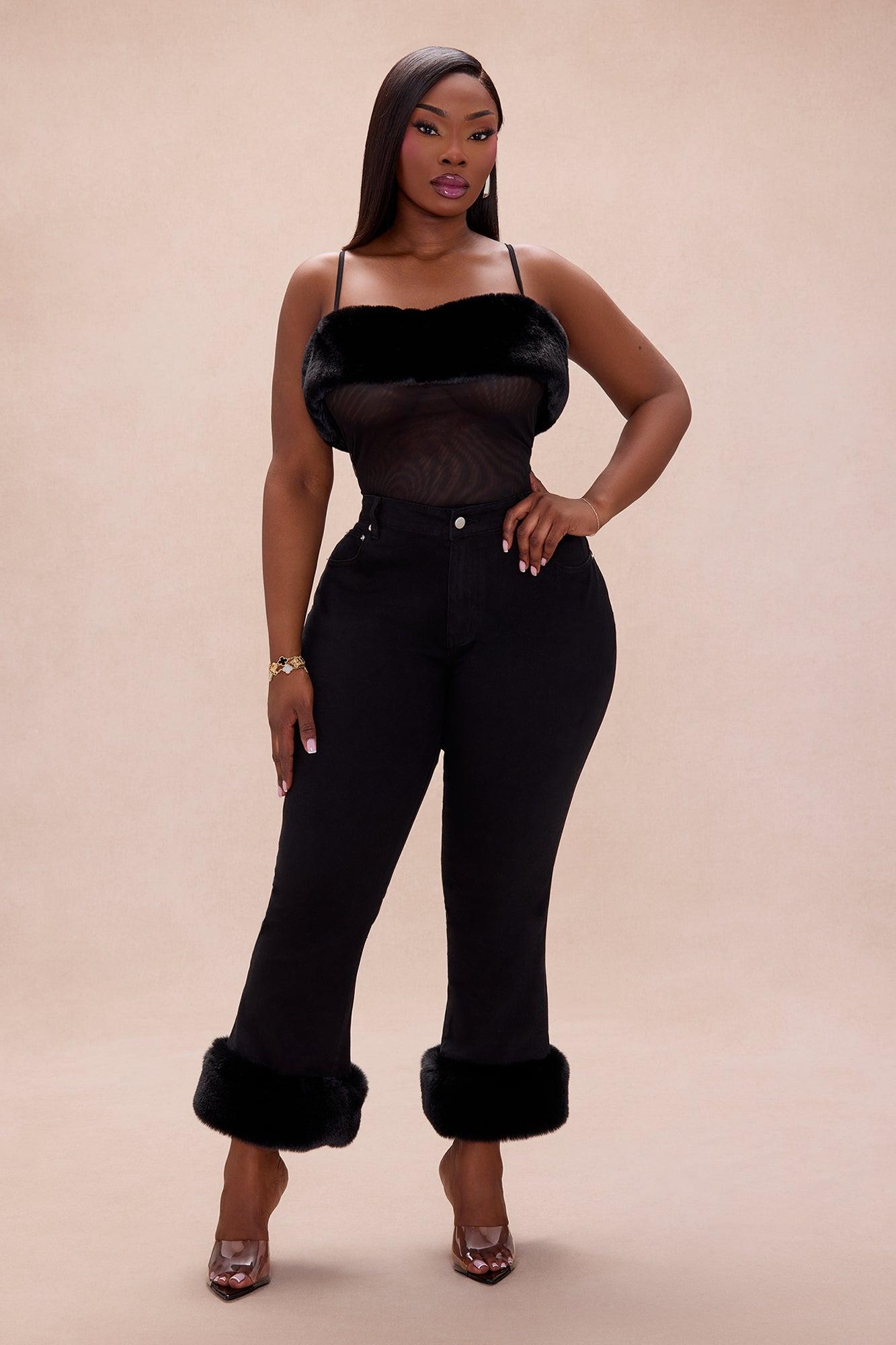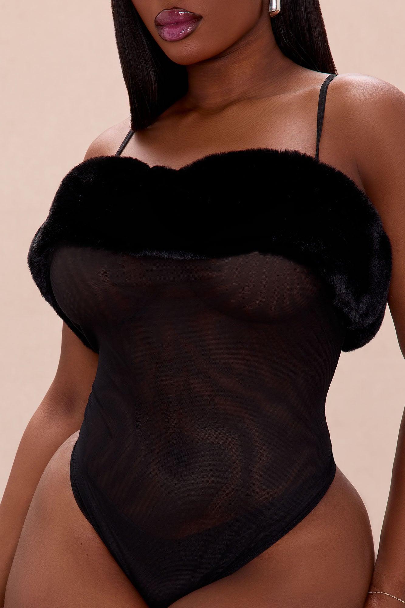 Available In Black. Mesh Bodysuit Adjustable Spaghetti Straps Square Neckline Grip Tape Fur Trim Hidden Back Zipper Closure Double Mesh Lined Sheer Stretch Final Sale Shell 1/Lining: 85% Polyester 15% Spandex Shell 2: 100% Polyester Imported