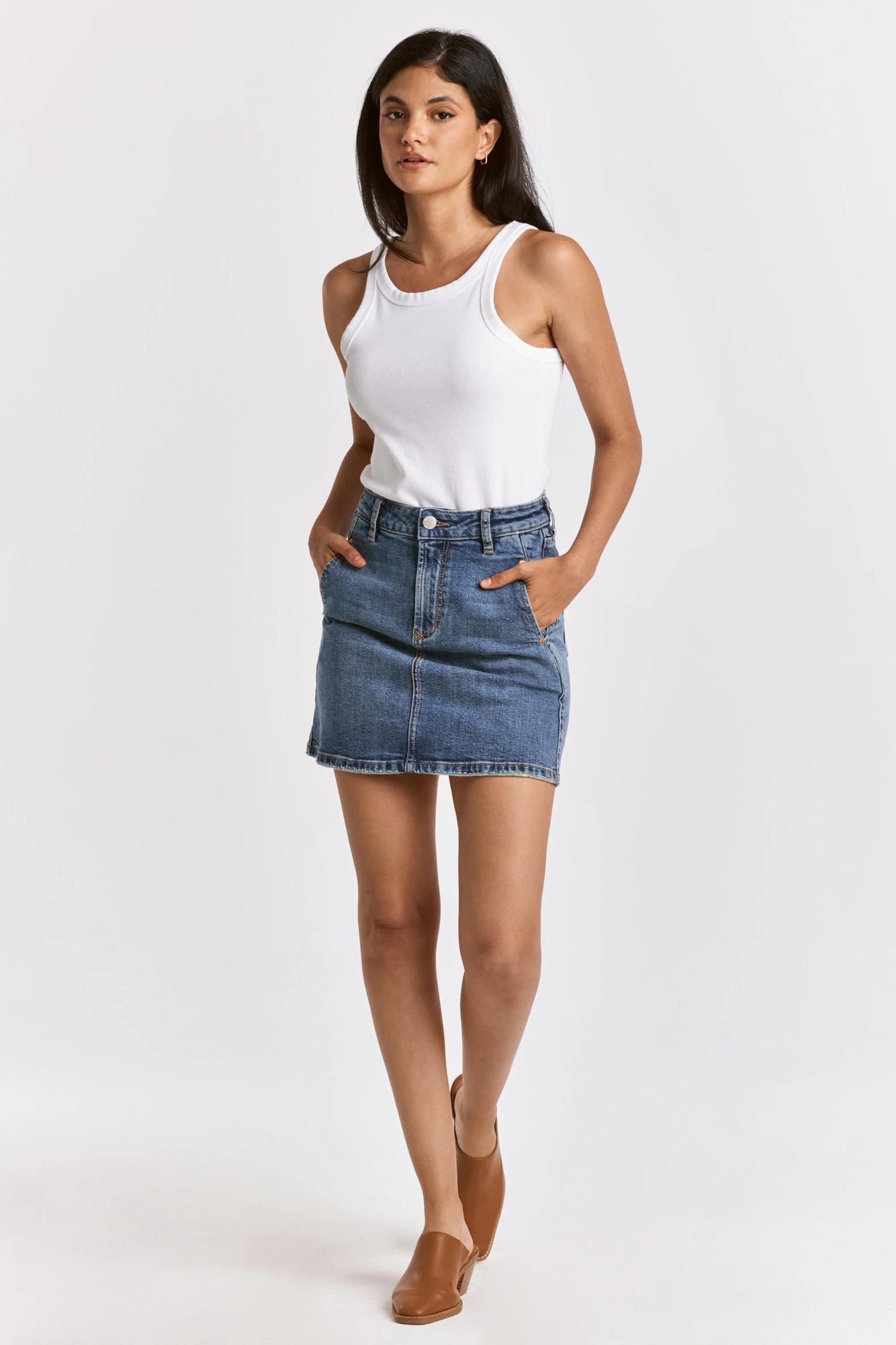 This high-rise skirt offers a timeless silhouette with a flattering fit that hugs the waist and contours the hips and thighs. Crafted from comfortable stretch denim, it combines elegance with casual charm. Thoughtful details like hand-sanded whiskering, subtle hem distressing, and side seam inserts add a touch of edge, while rivet-trimmed slant pockets complete the look with a hint of utility-inspired style. Perfect for elevating your everyday wardrobe.